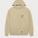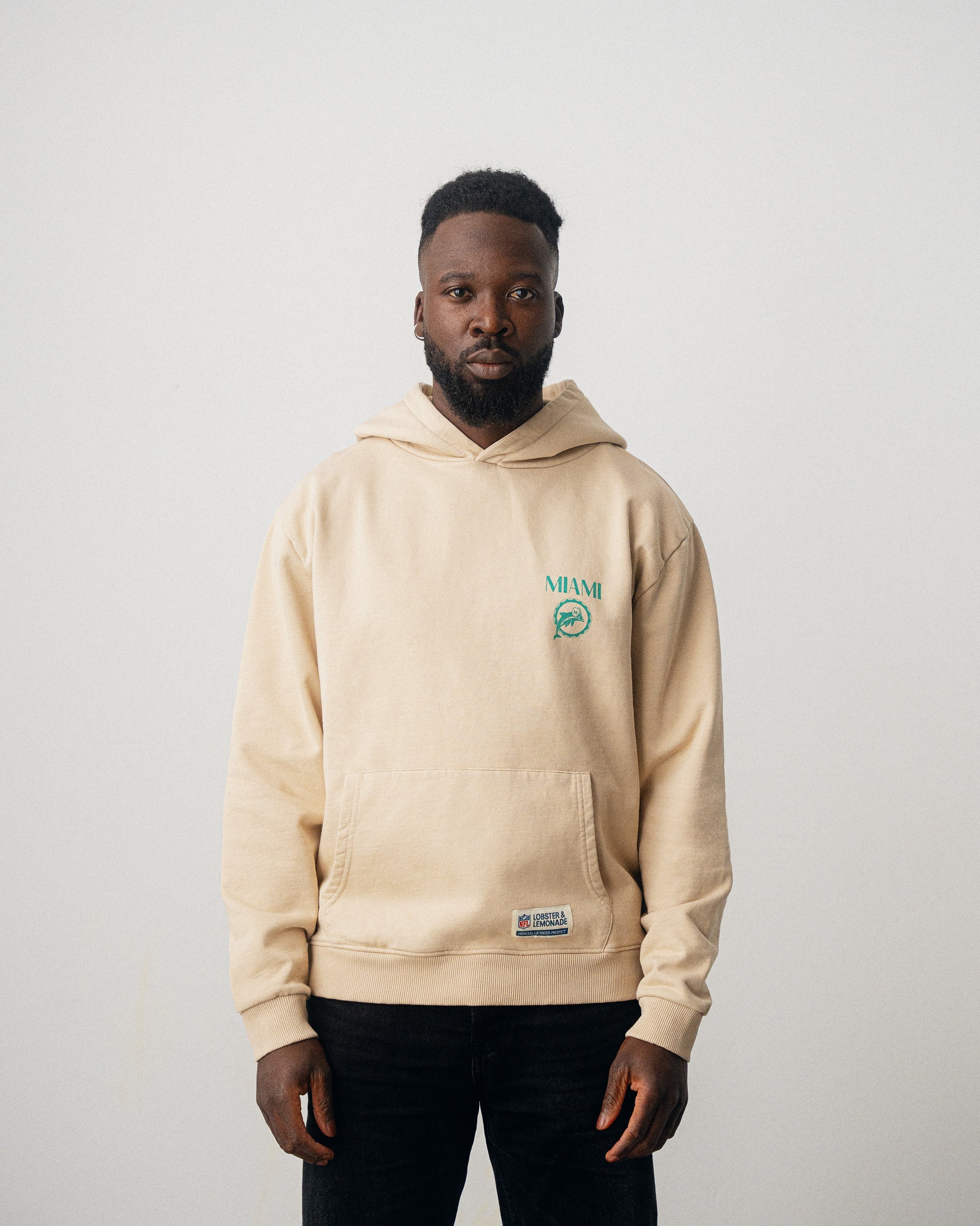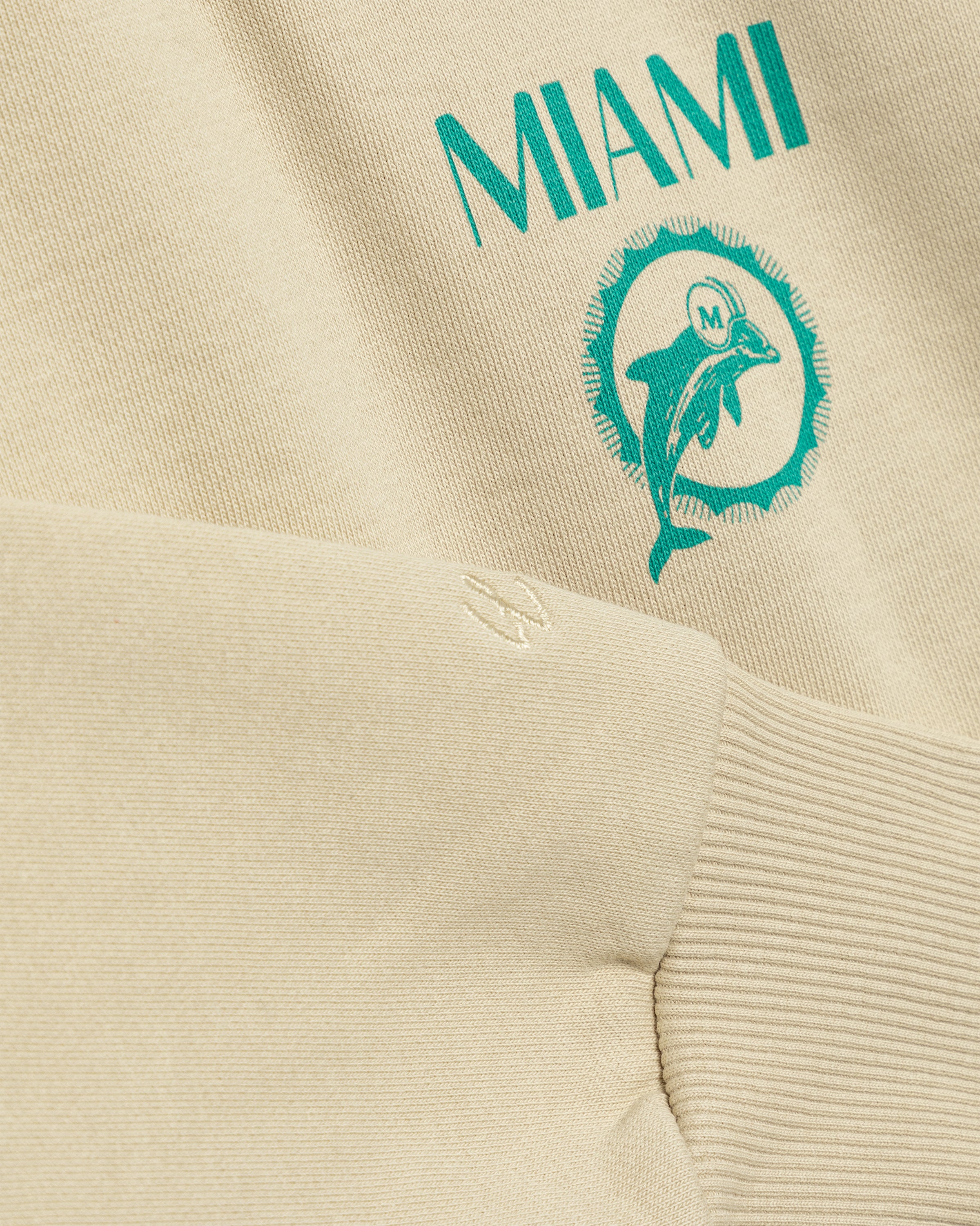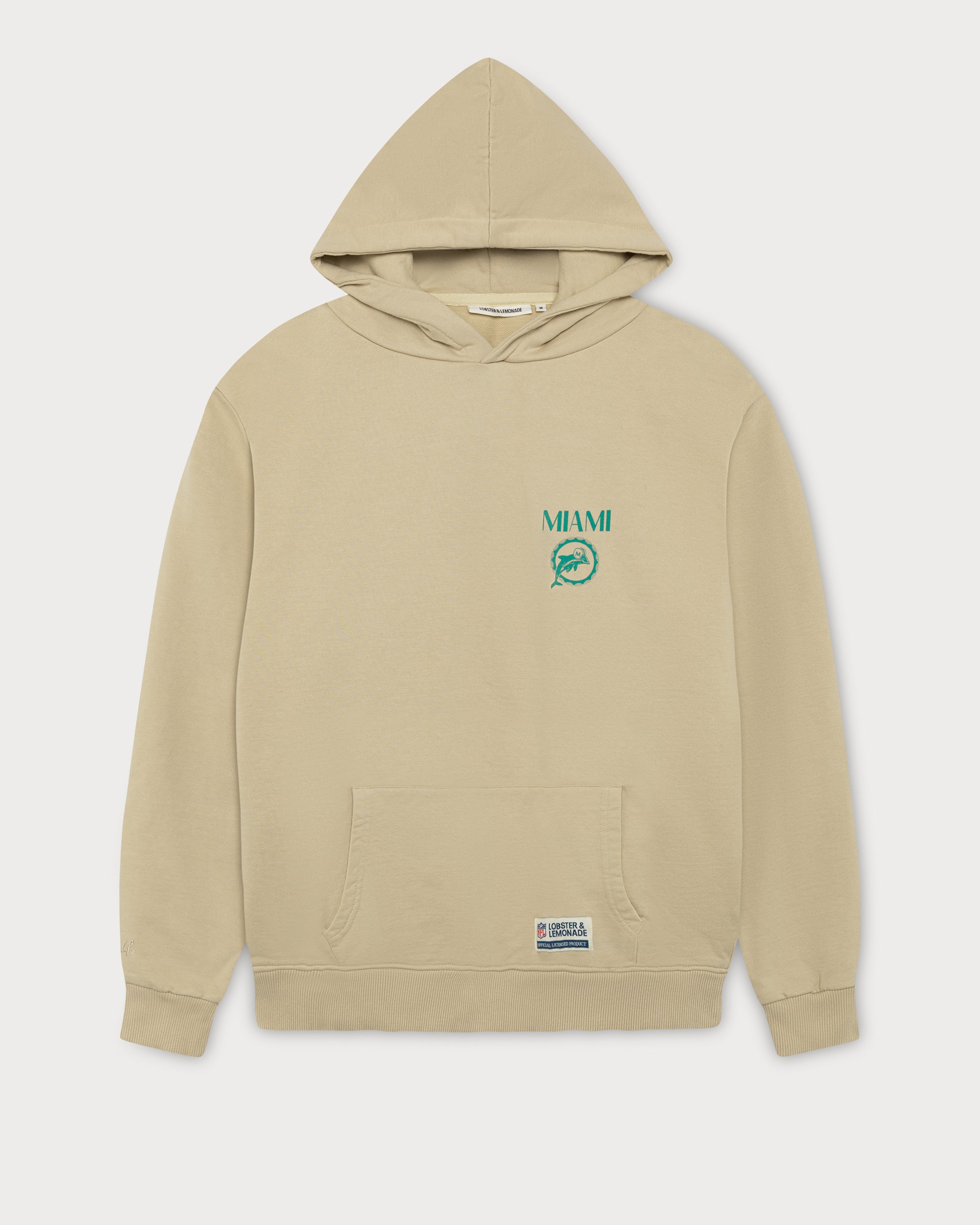 Ce sweat à capuche beige arbore le motif classique des Dolphins en vert au dos. Le logo minimaliste des Dolphins sur la poitrine gauche et l'étiquette tissée en toile à la taille complètent son look rétro.