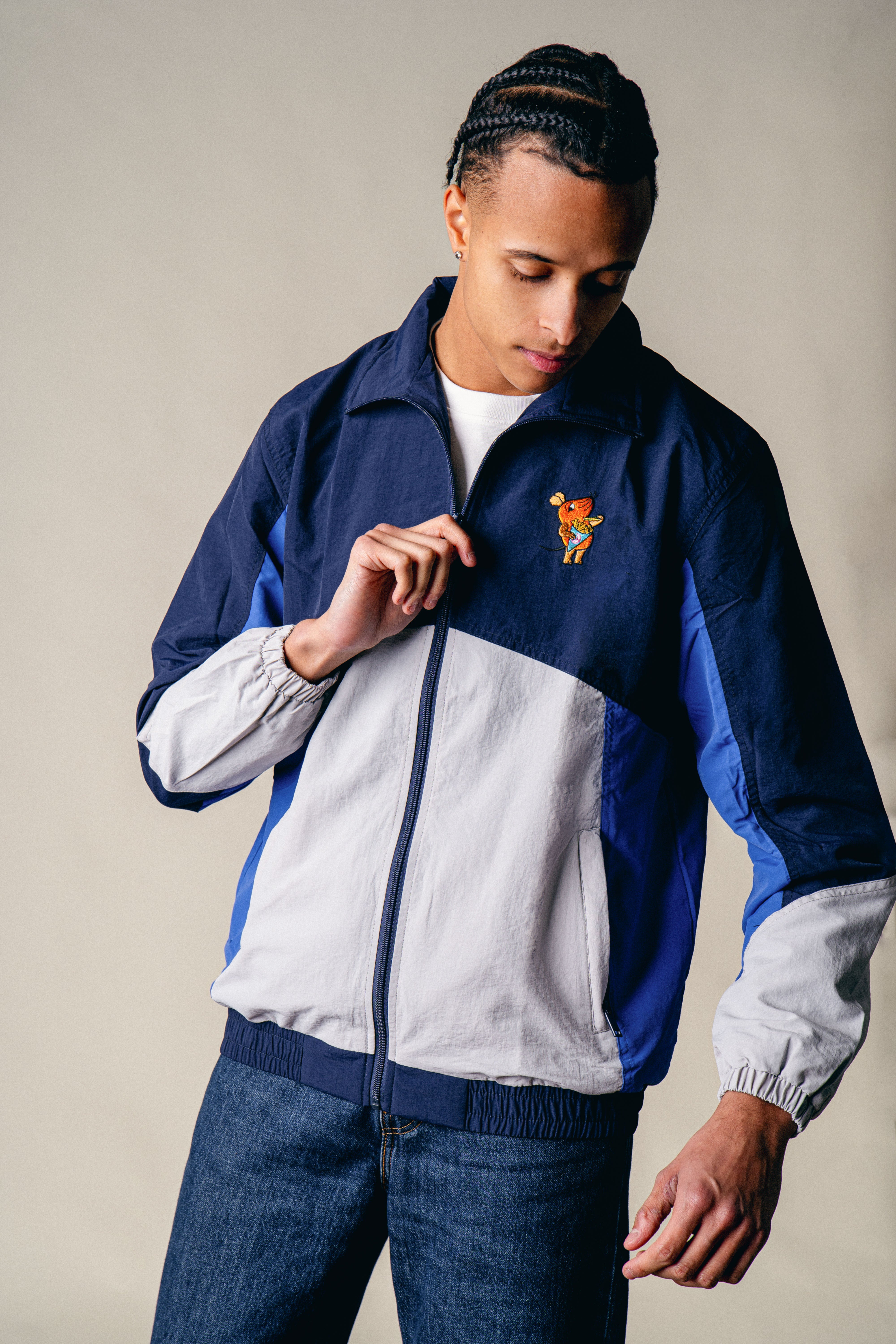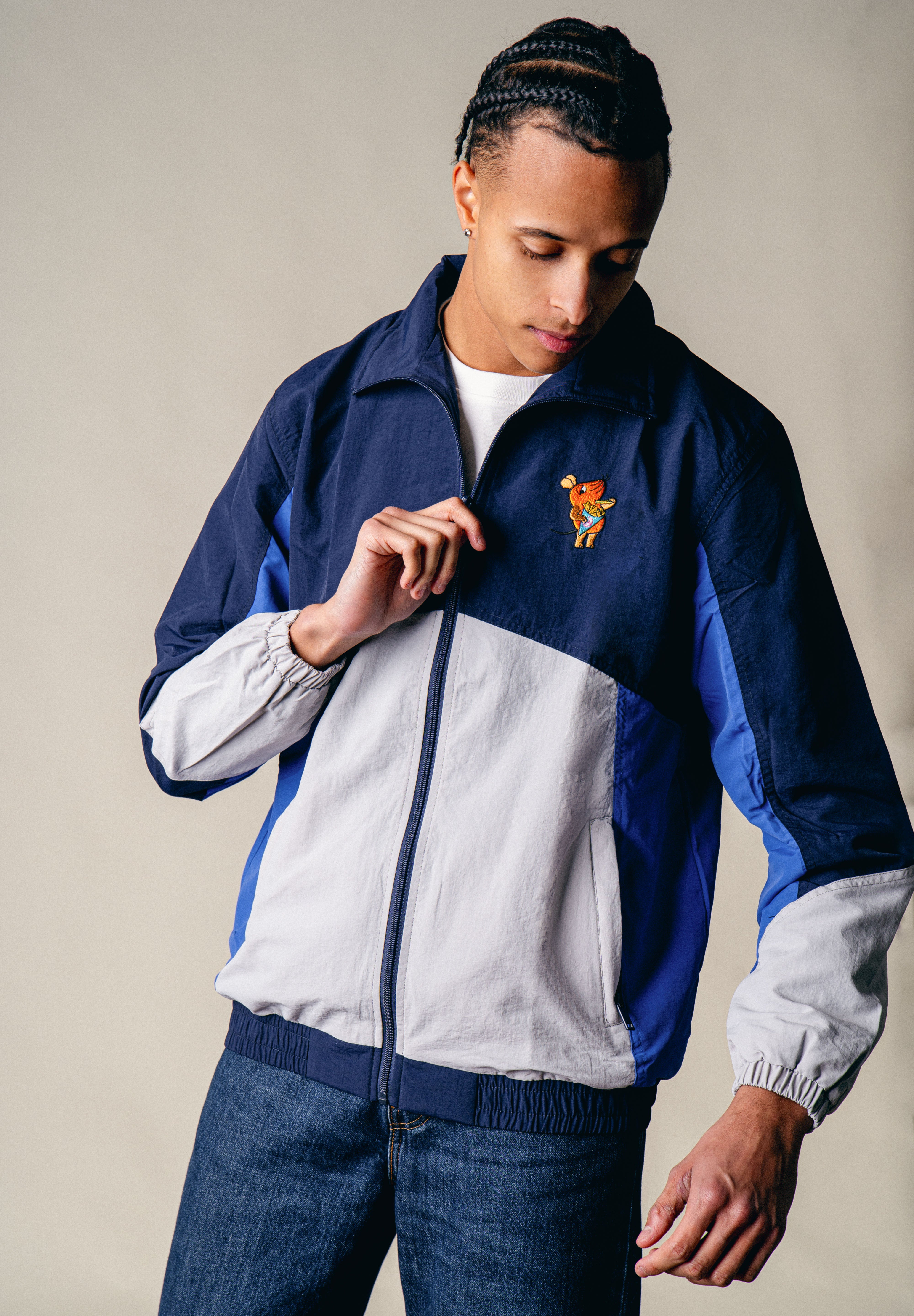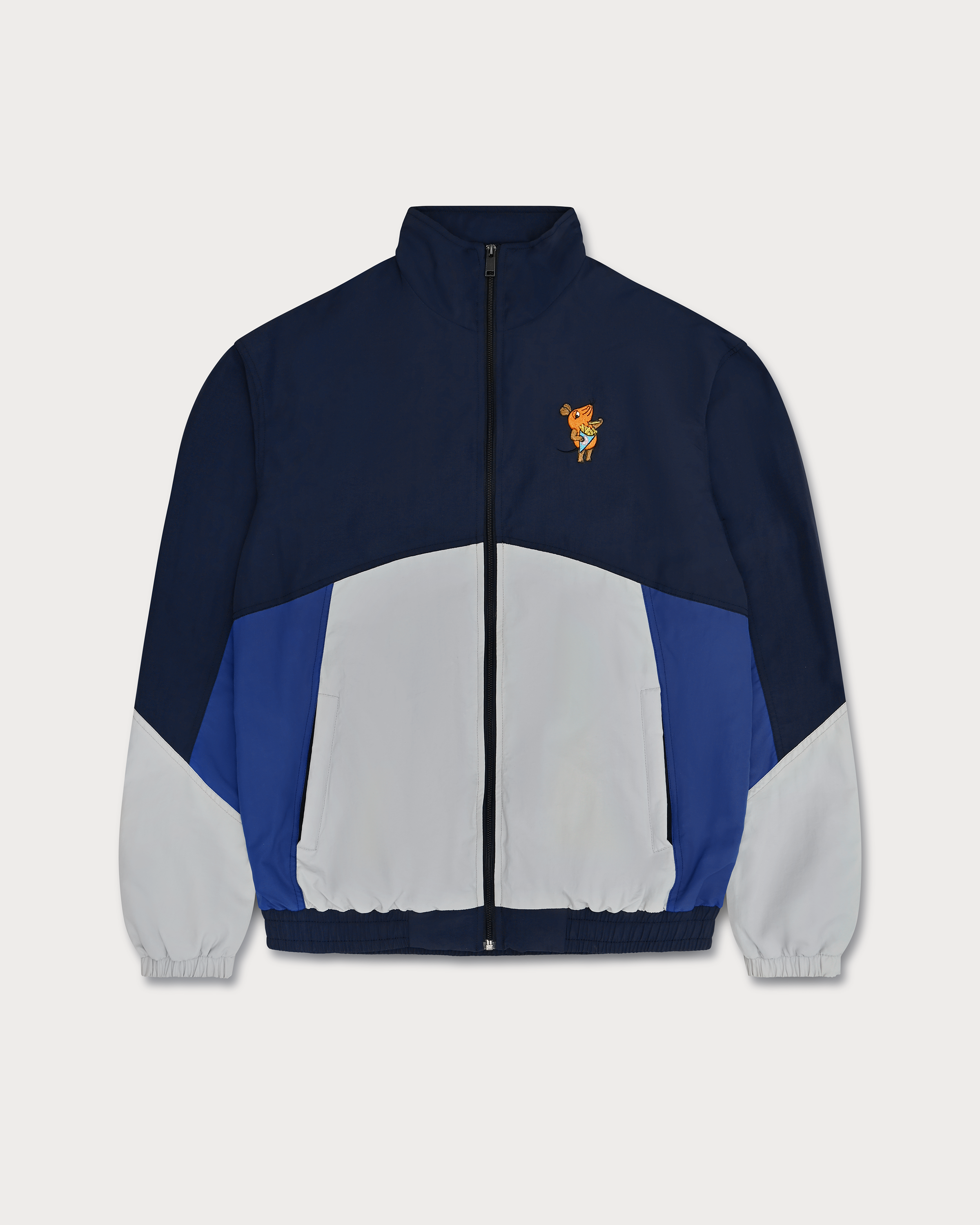 La veste tricolore arbore une broderie de haute qualité représentant une souris mangeant des frites. L'association astucieuse du noir, du gris et du bleu lui confère une allure sportive et attire tous les regards.