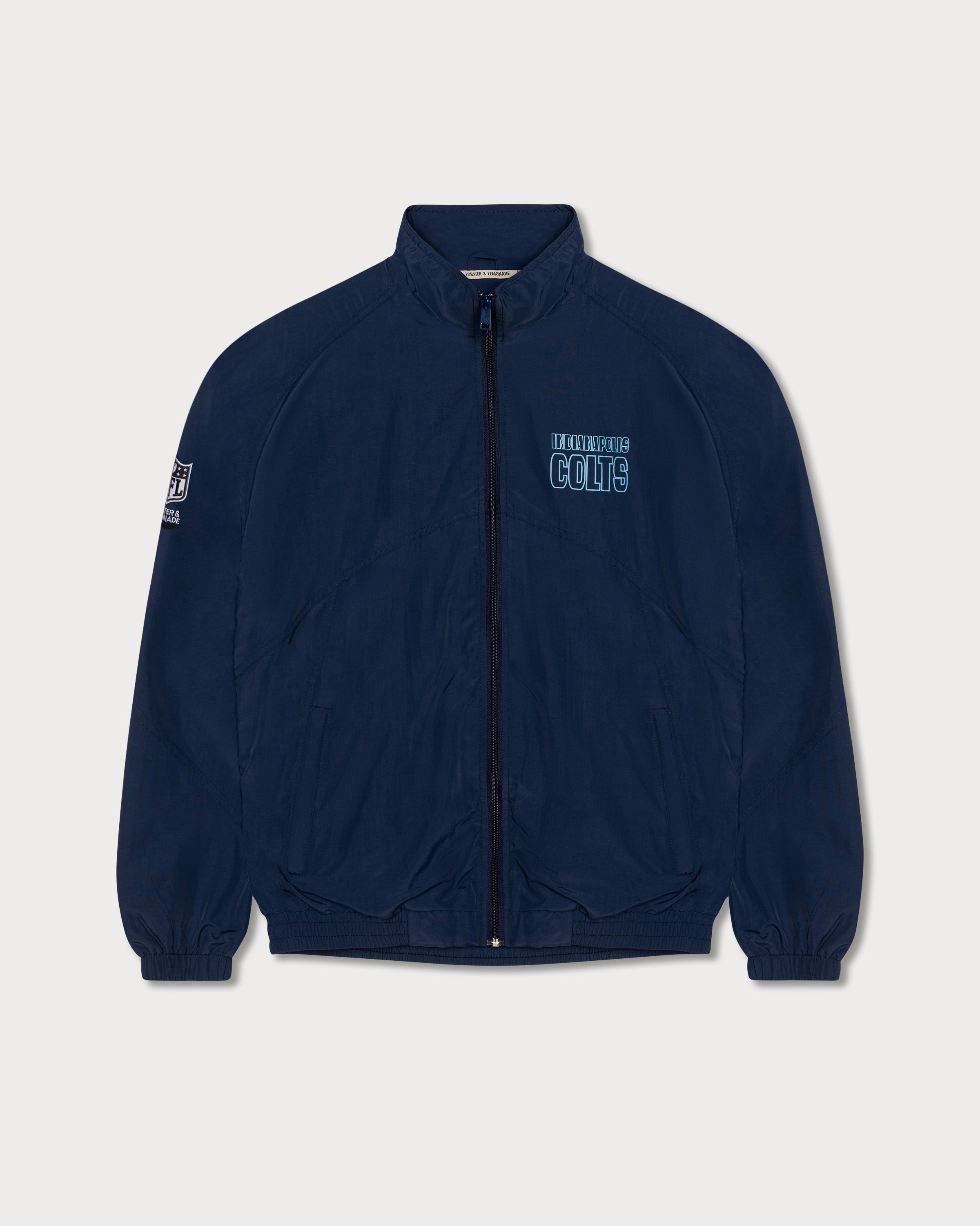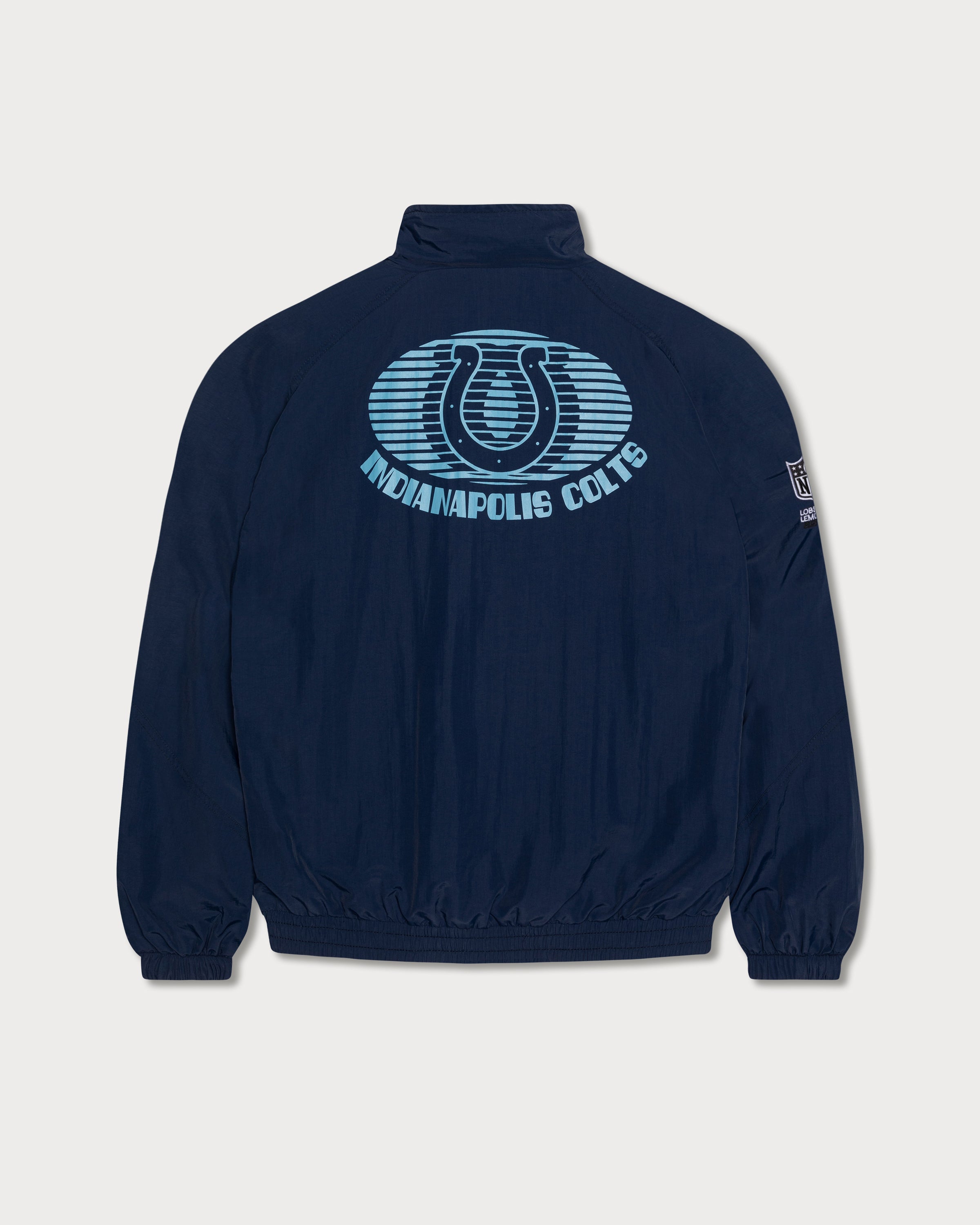 Cette veste de sport bleu foncé arbore une coupe rétro décontractée et est rehaussée d'un généreux imprimé bleu clair des Indianapolis Colts dans le dos. Le logo des Colts est imprimé sur la poitrine gauche, complétant ainsi le design avec brio.