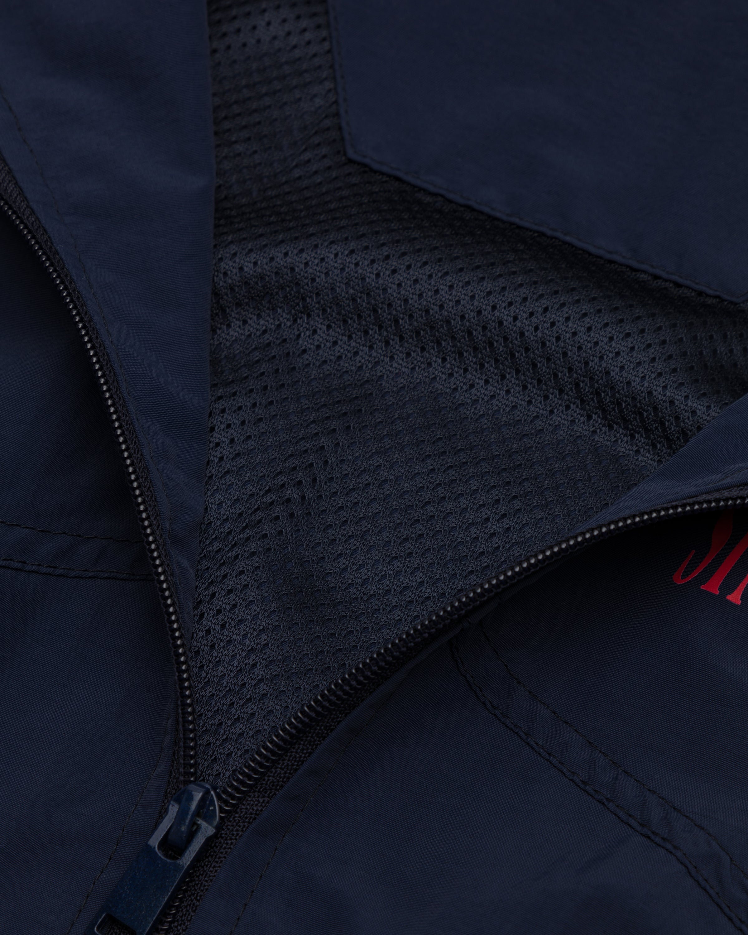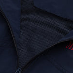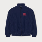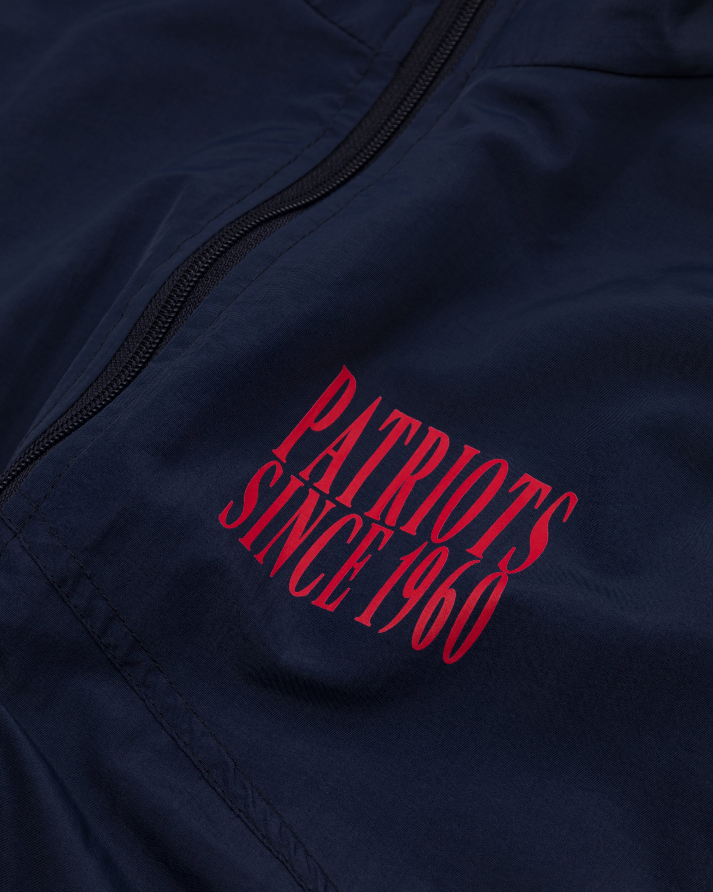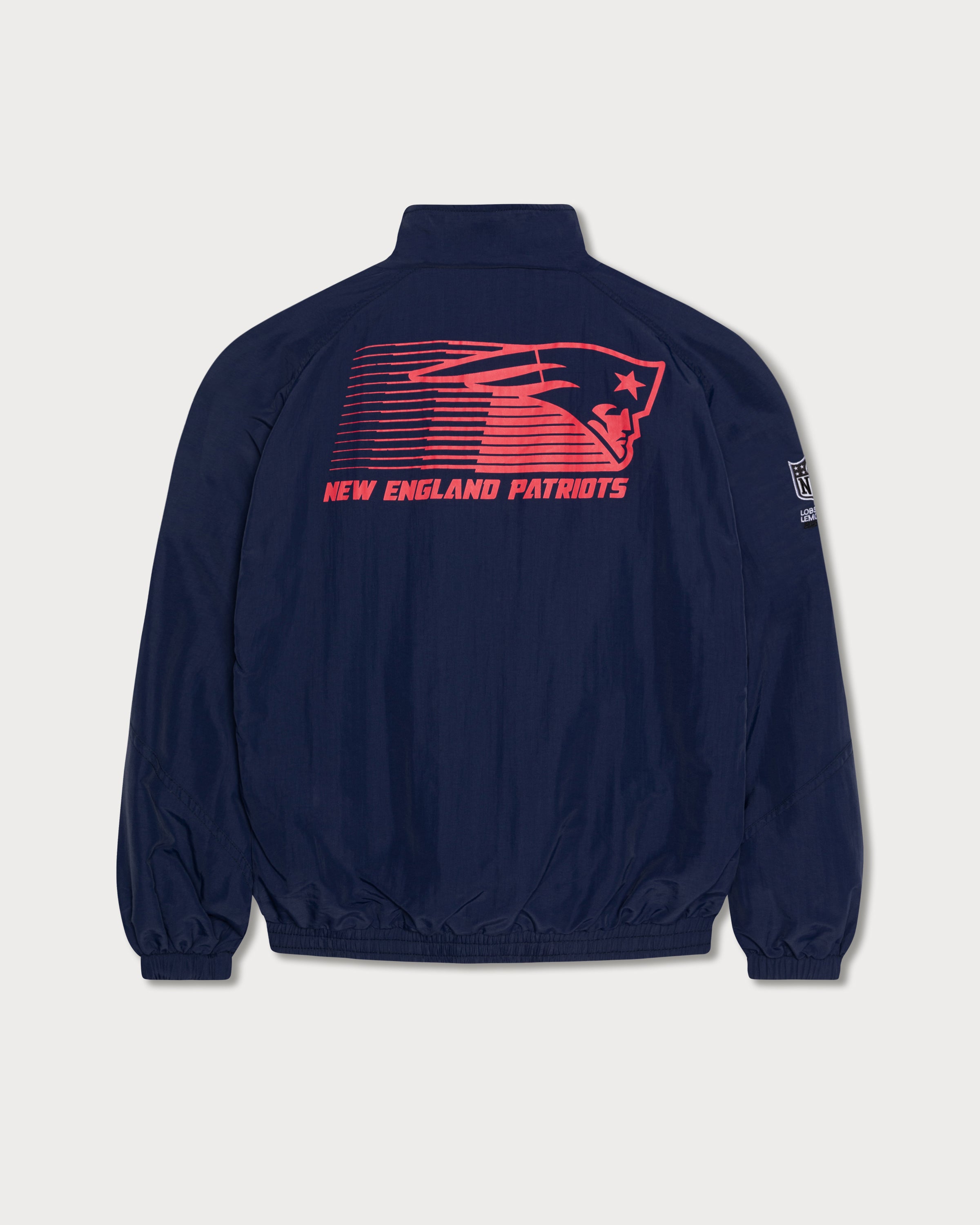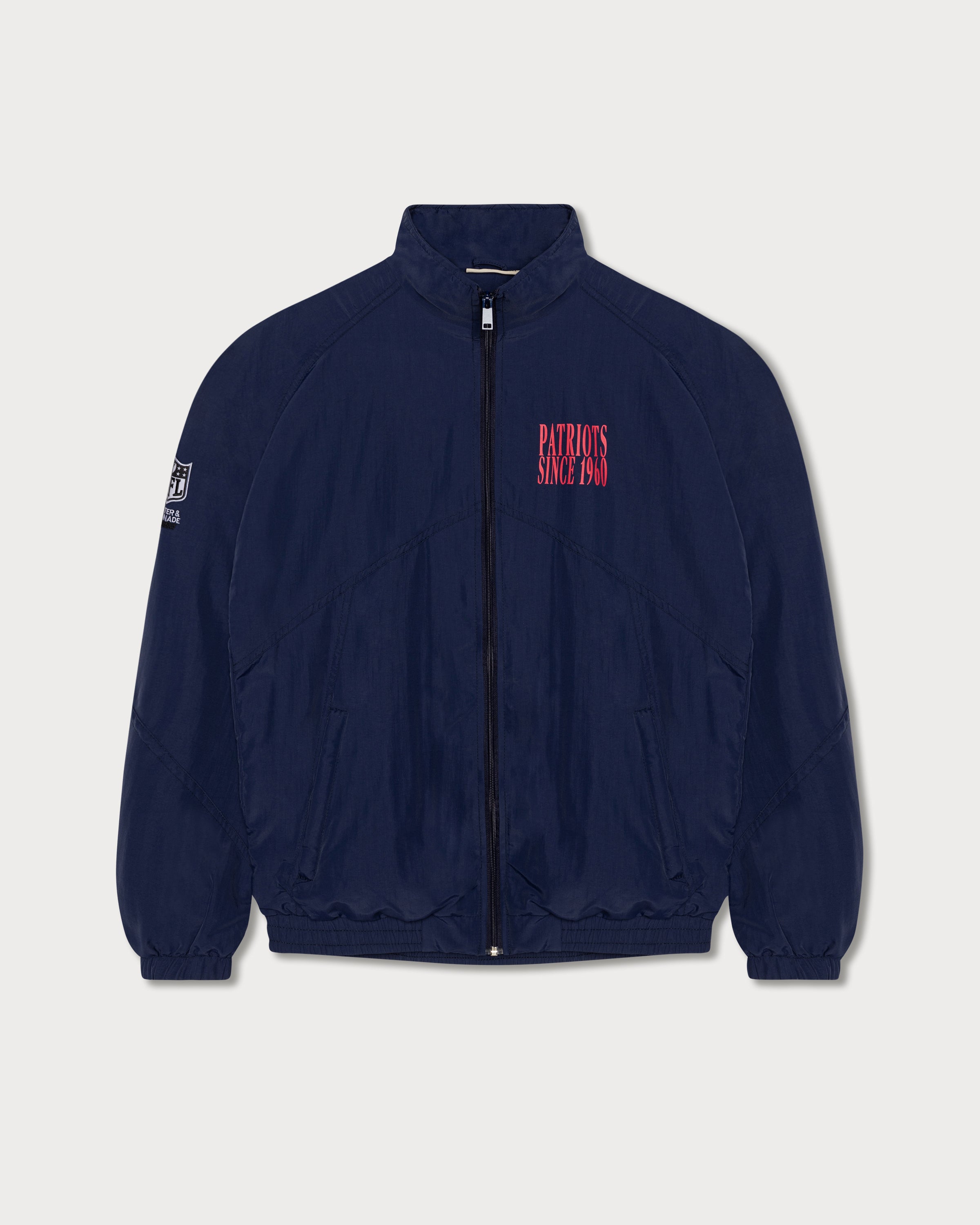Cette veste de sport bleu foncé arbore une coupe rétro décontractée et un imprimé magenta des New England Patriots au dos. Le logo des Patriots est imprimé sur la poitrine gauche, complétant ainsi le design avec brio.