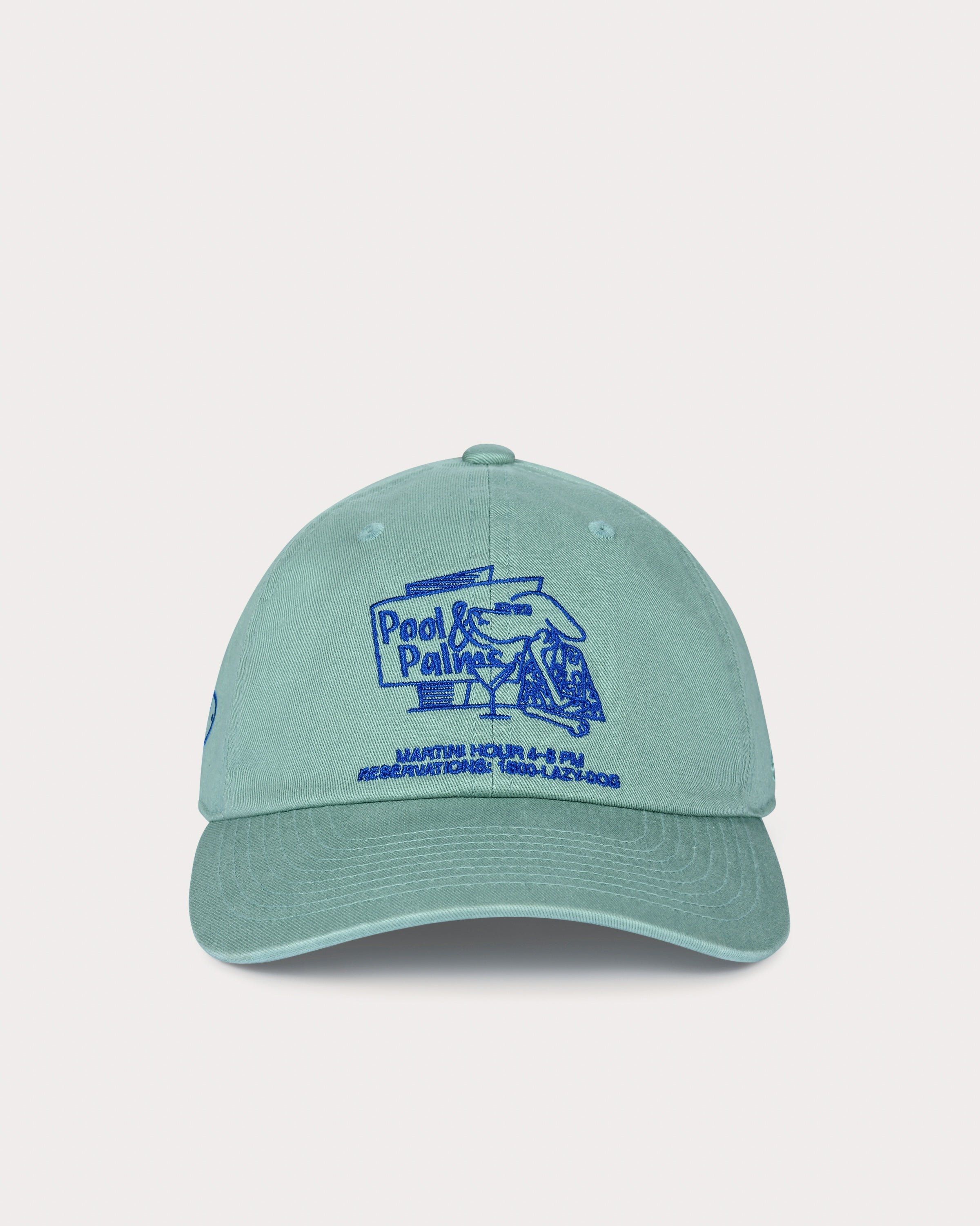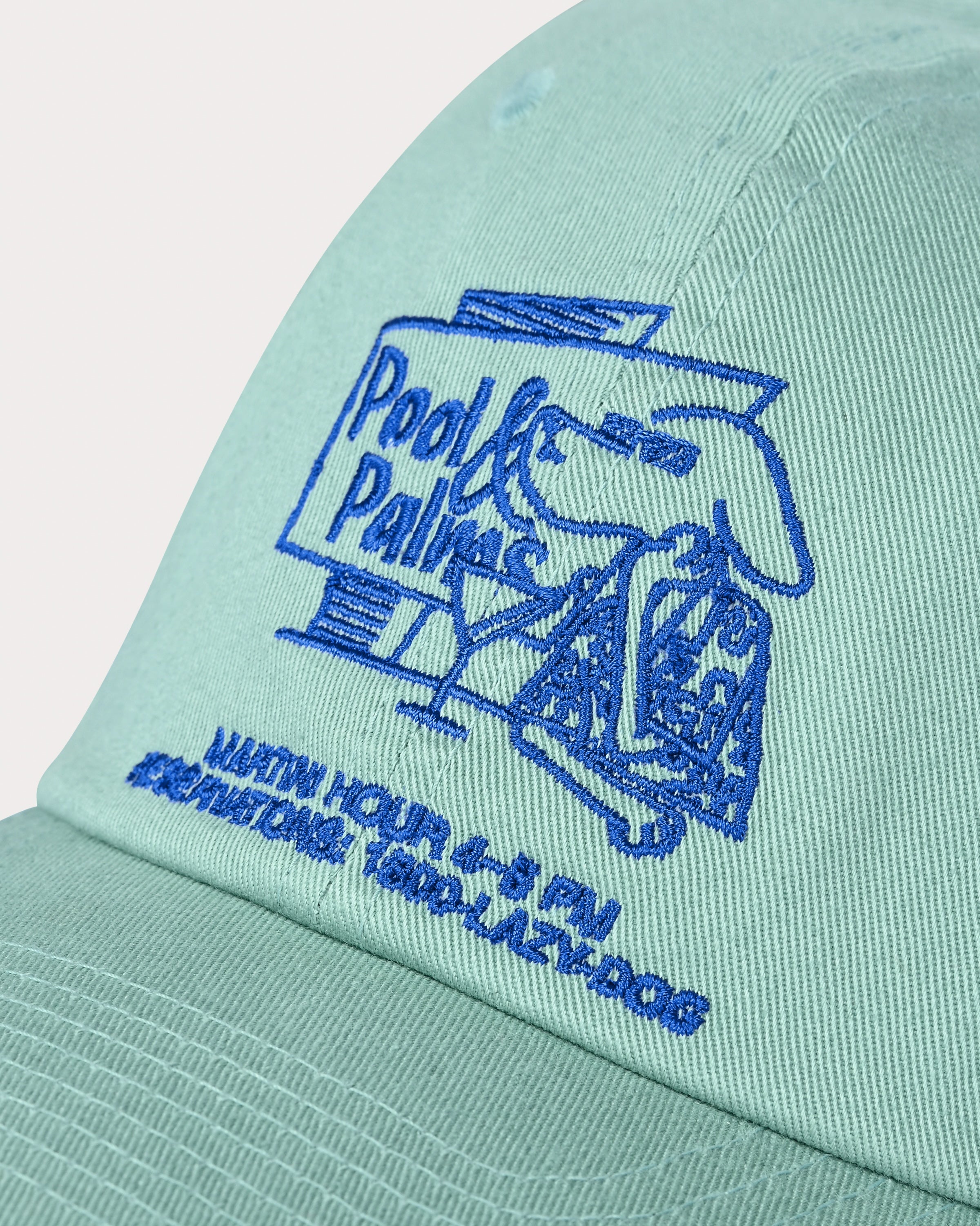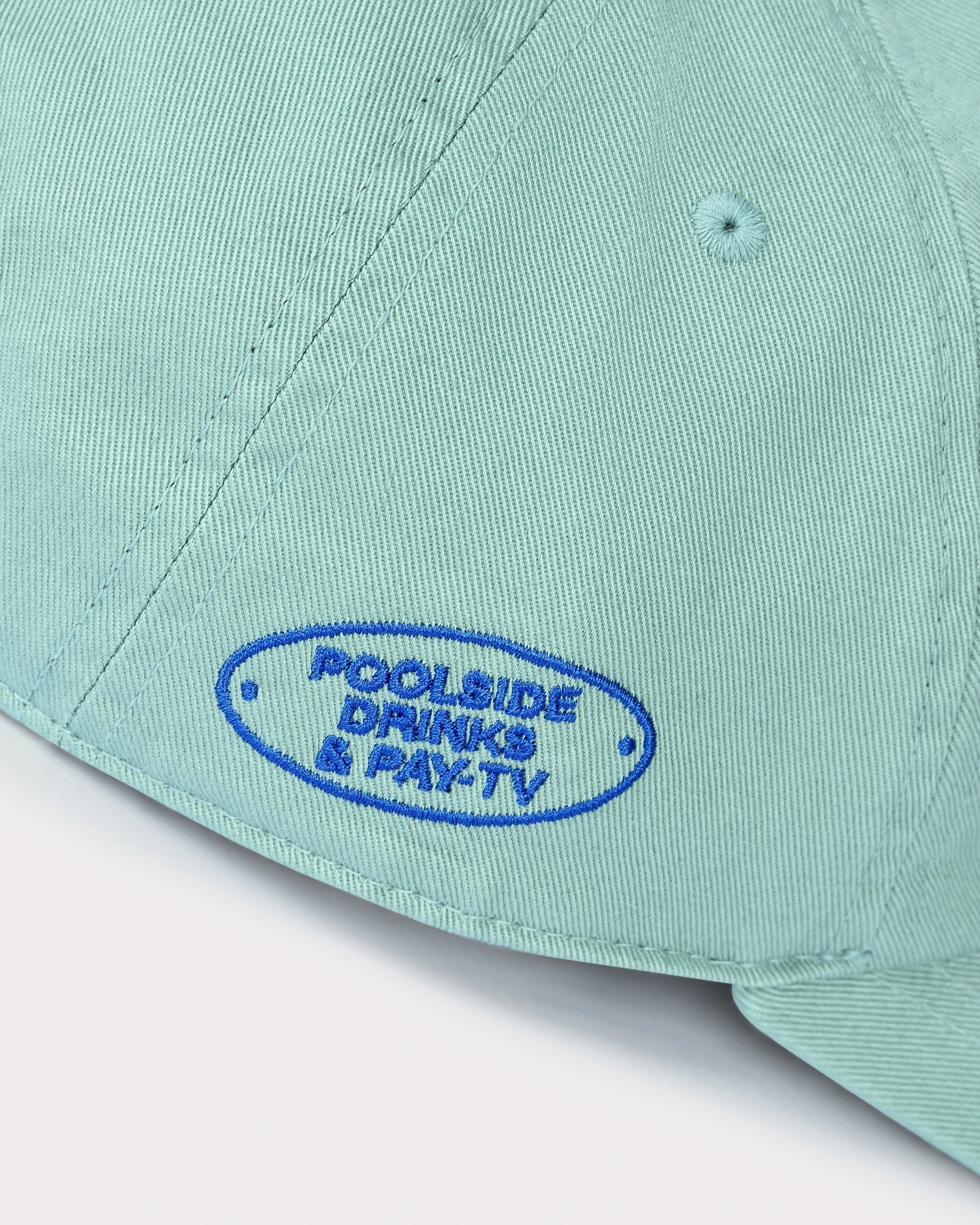 Le devant de cette casquette turquoise-verte arbore une broderie détaillée représentant un chien décontracté en chemise hawaïenne, savourant tranquillement un martini. Le badge « Poolside » sur le côté souligne l'ambiance estivale et complète le look vacances.