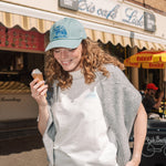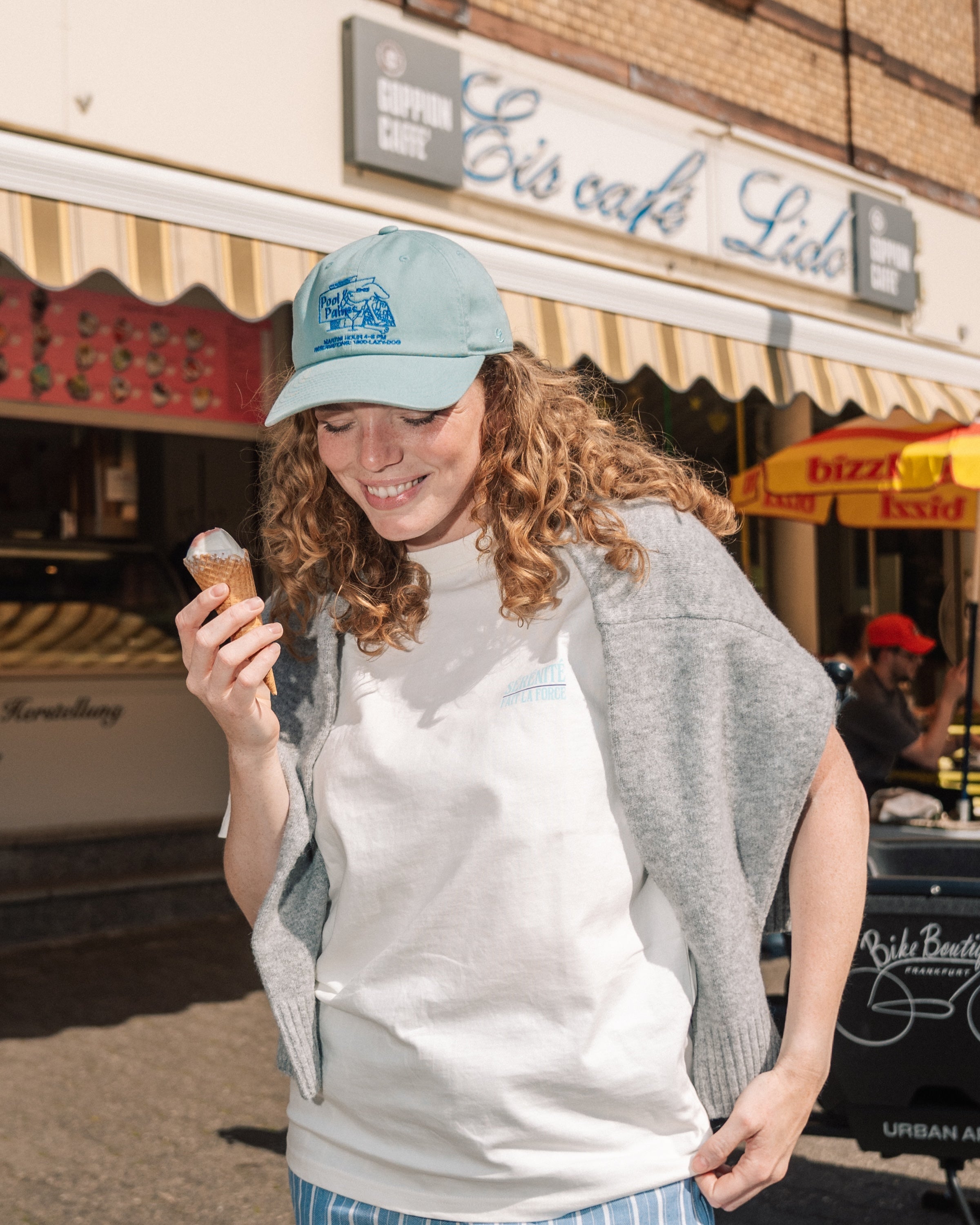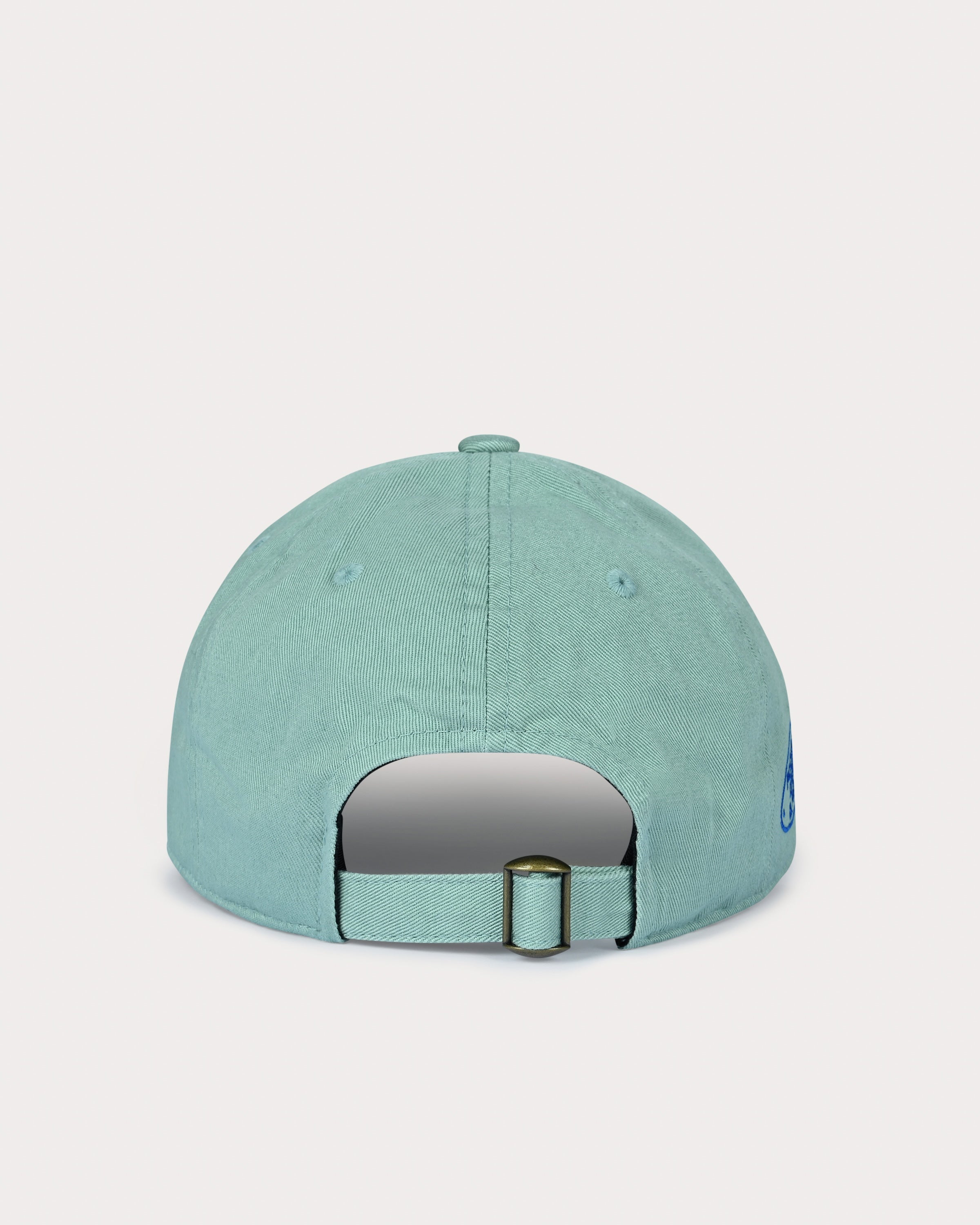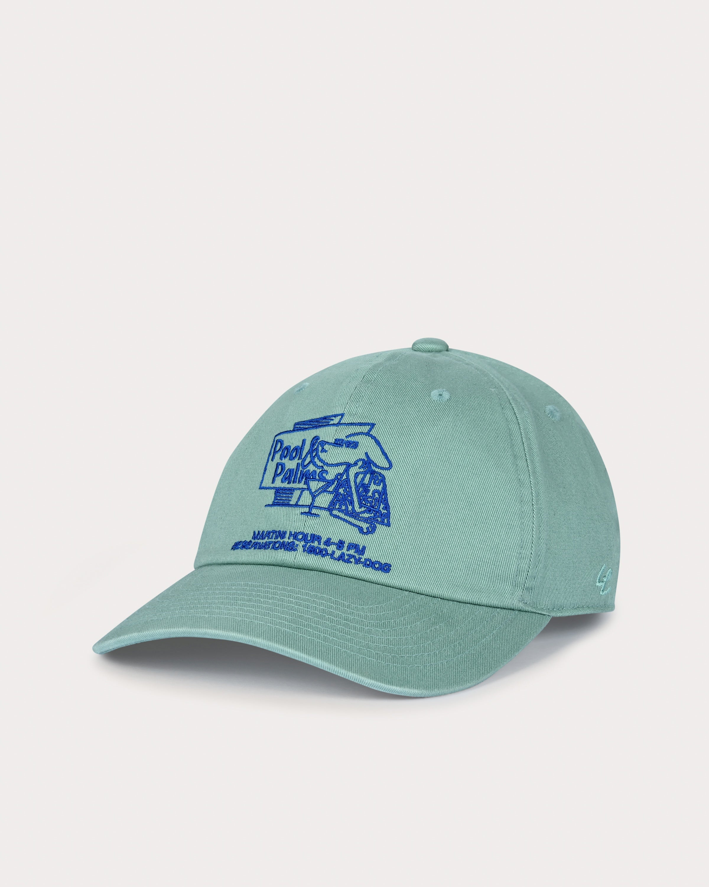 Le devant de cette casquette turquoise-verte arbore une broderie détaillée représentant un chien décontracté en chemise hawaïenne, savourant tranquillement un martini. Le badge « Poolside » sur le côté souligne l'ambiance estivale et complète le look vacances.