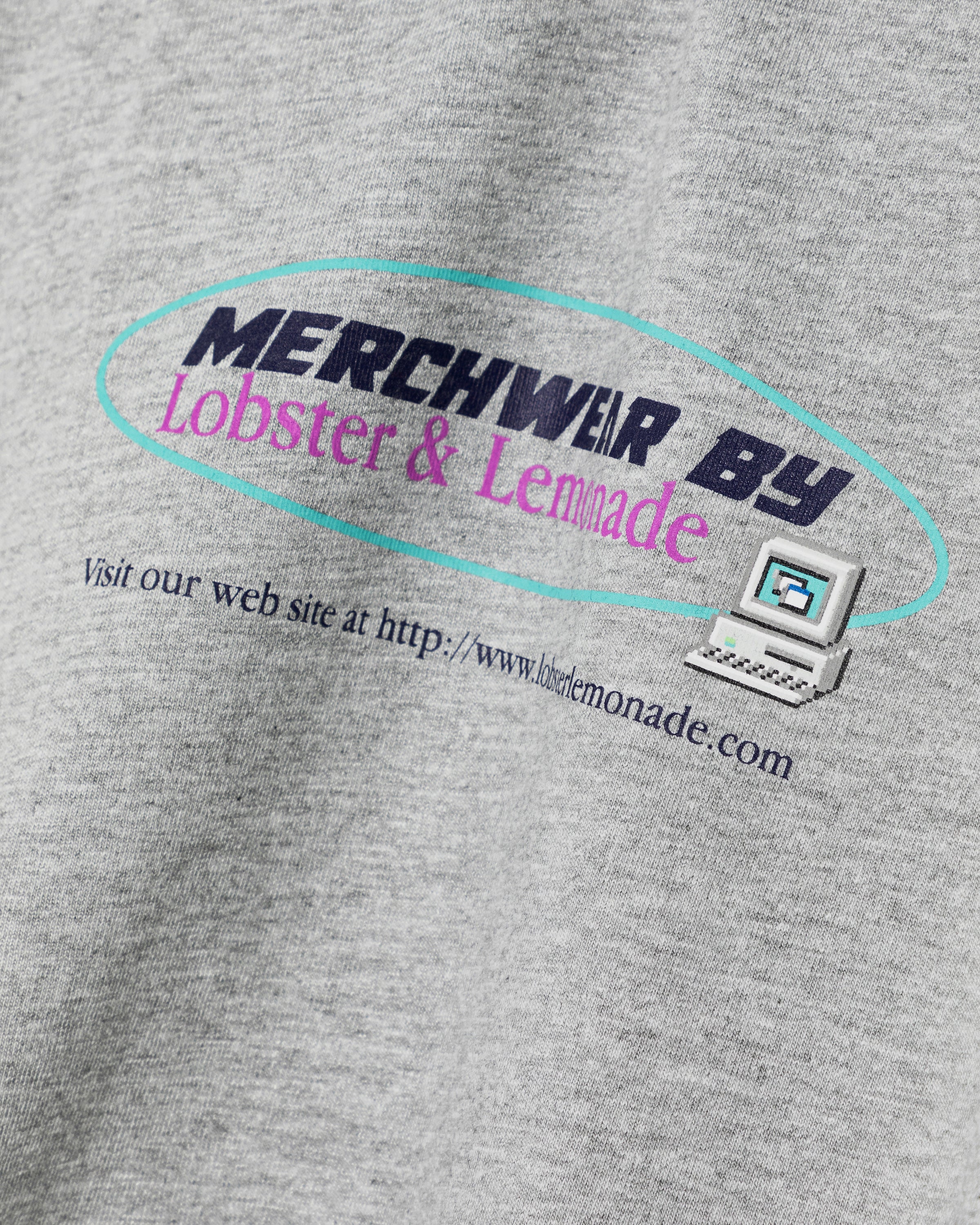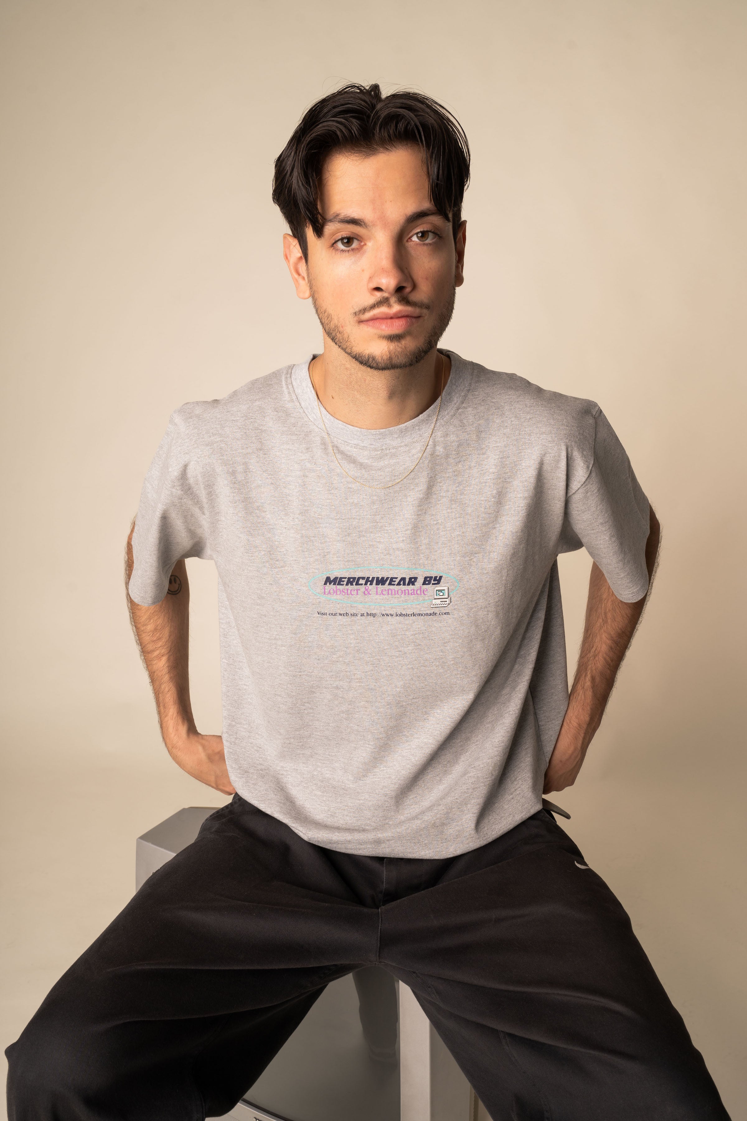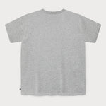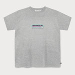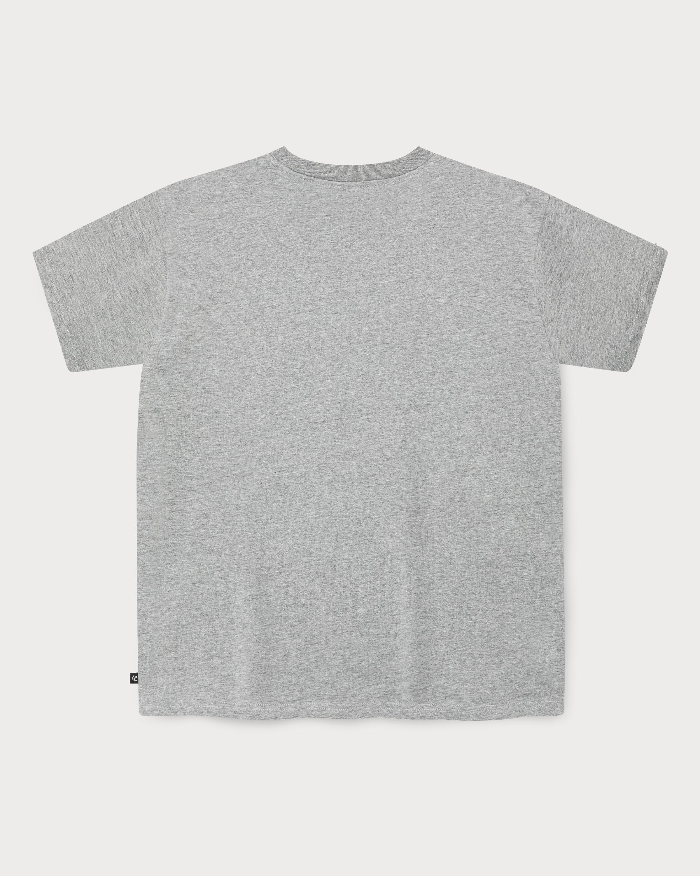 Le t-shirt gris présente un imprimé avant au look rétro rappelant les anciens graphismes informatiques.