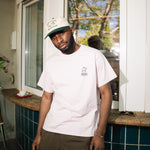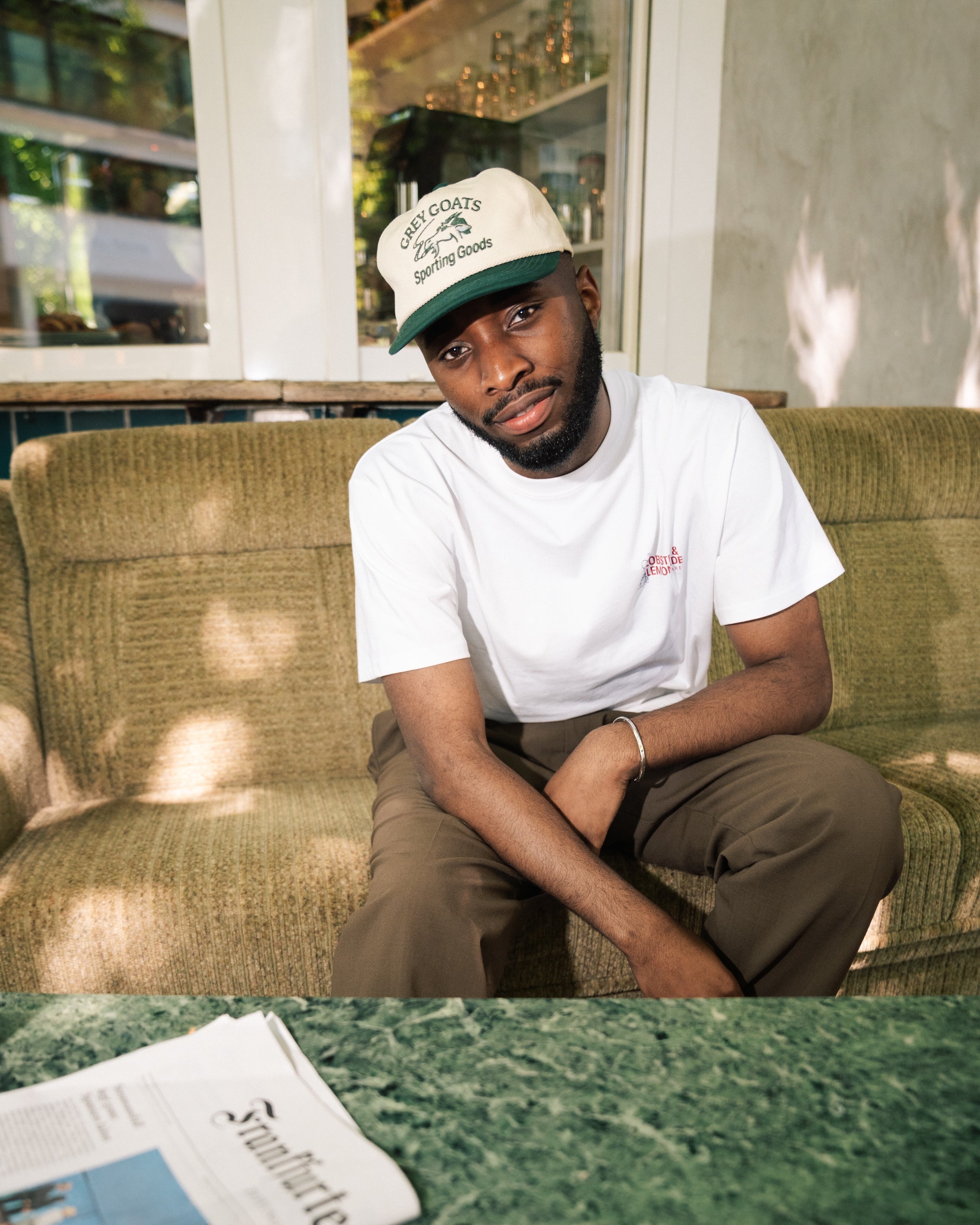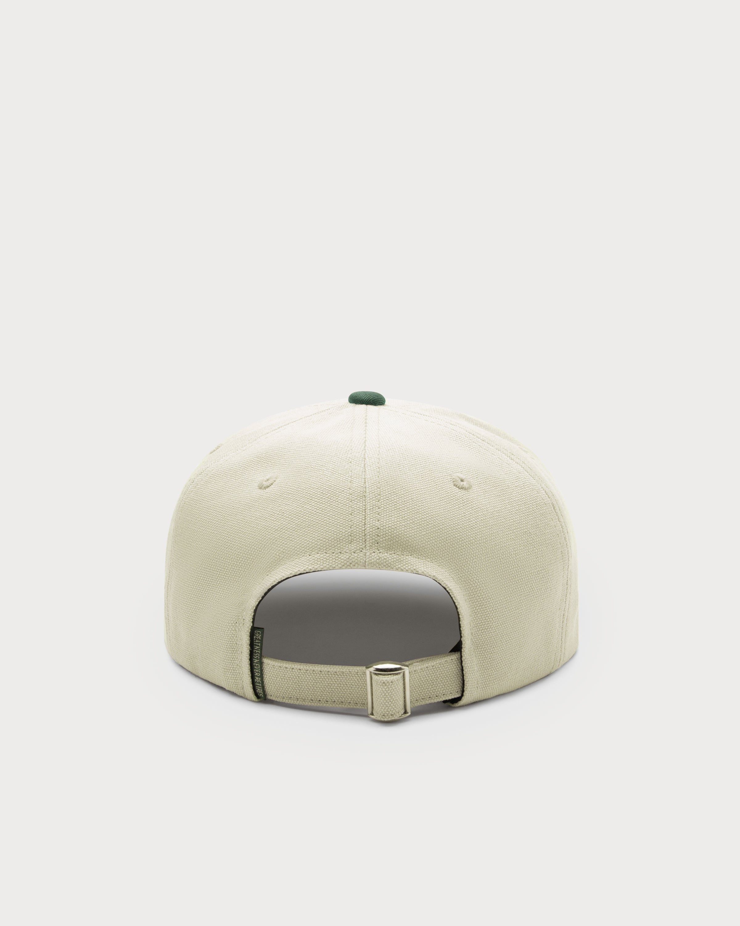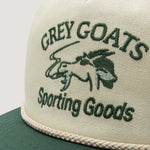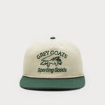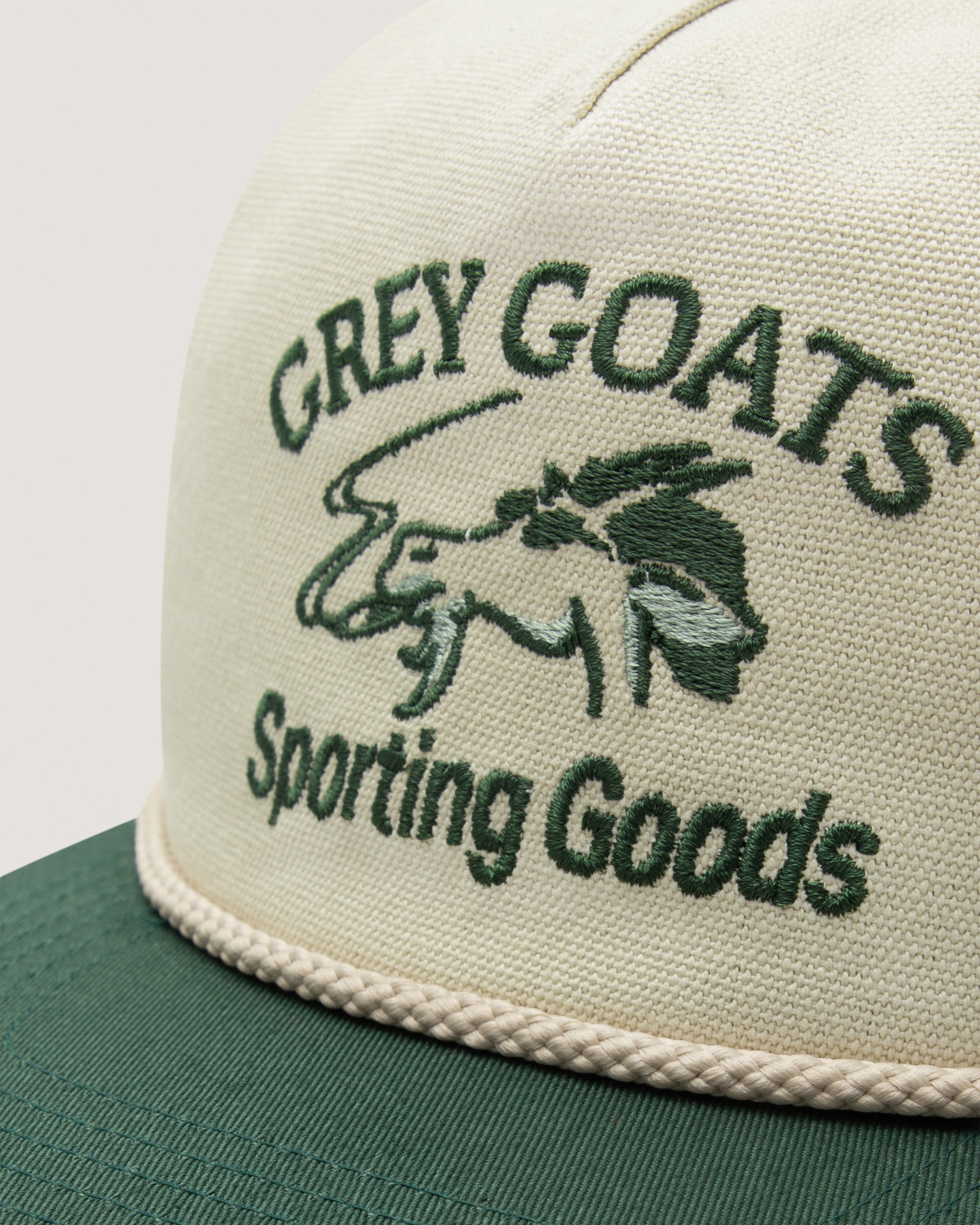 Inspirée des casquettes de golf classiques, cette casquette Merch en toile bicolore arbore un grand profil brodé d'une chèvre fumant un cigare. Le motif est complété par les inscriptions « Grey Goats » et « Sporting Goods ». Le cordon décoratif sur la visière confère à la casquette une touche classique qui complète parfaitement le style golf.