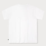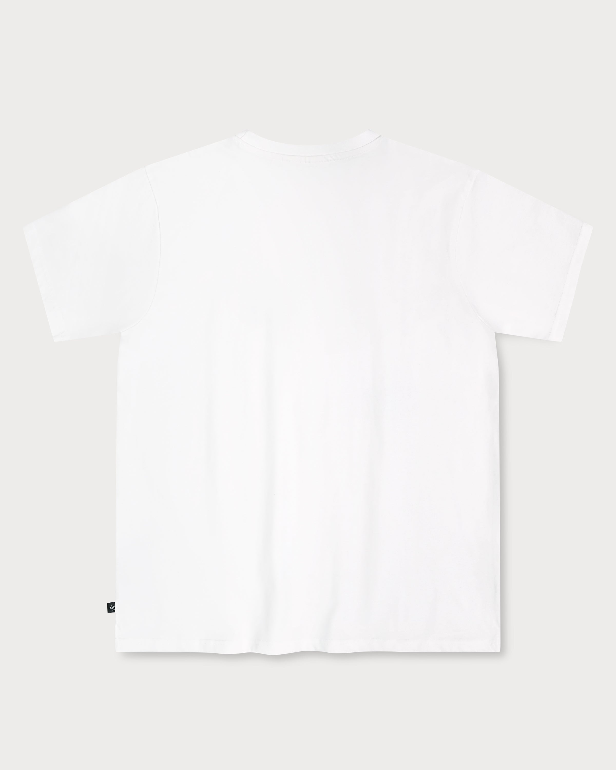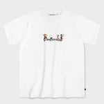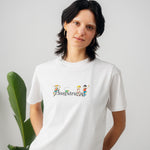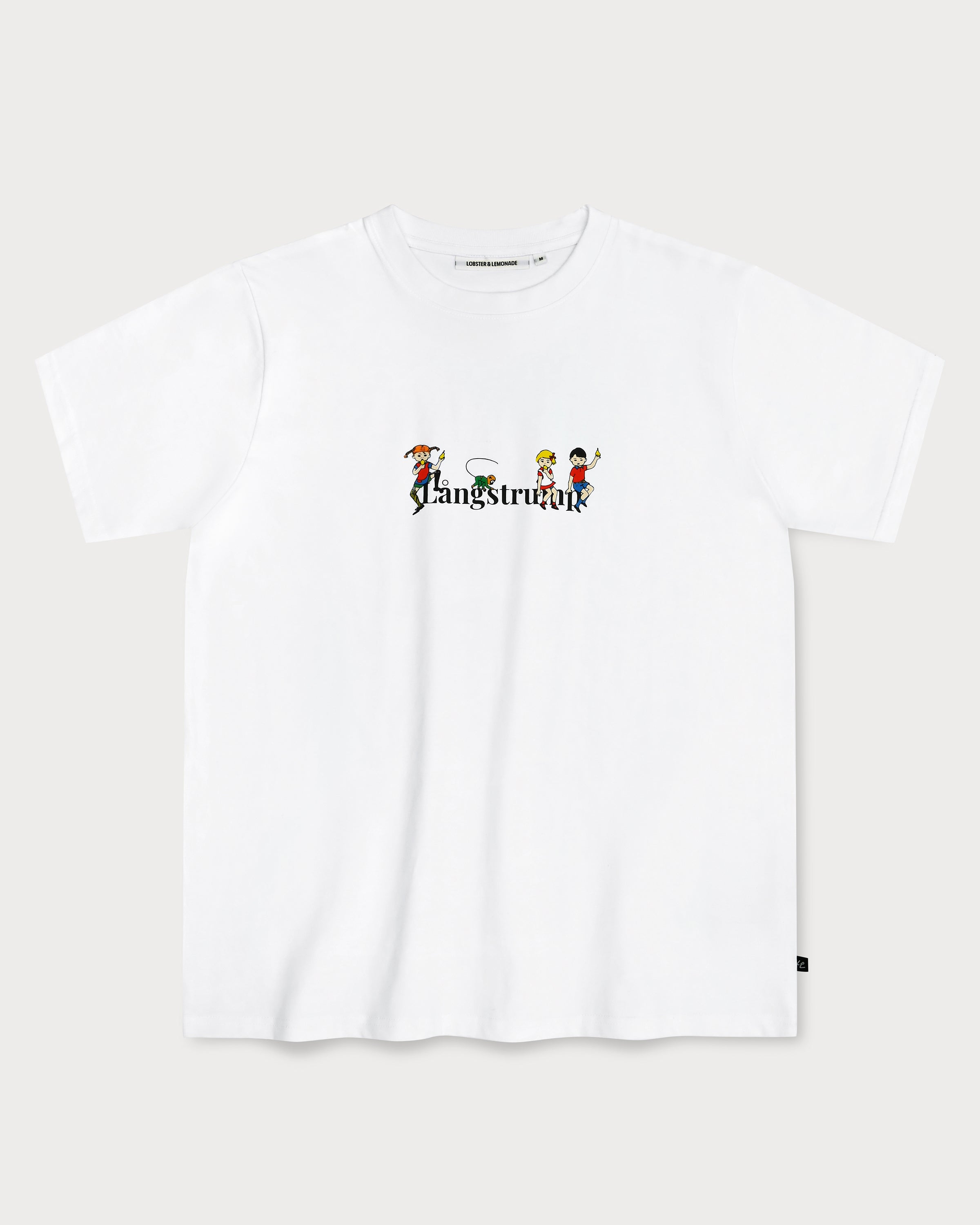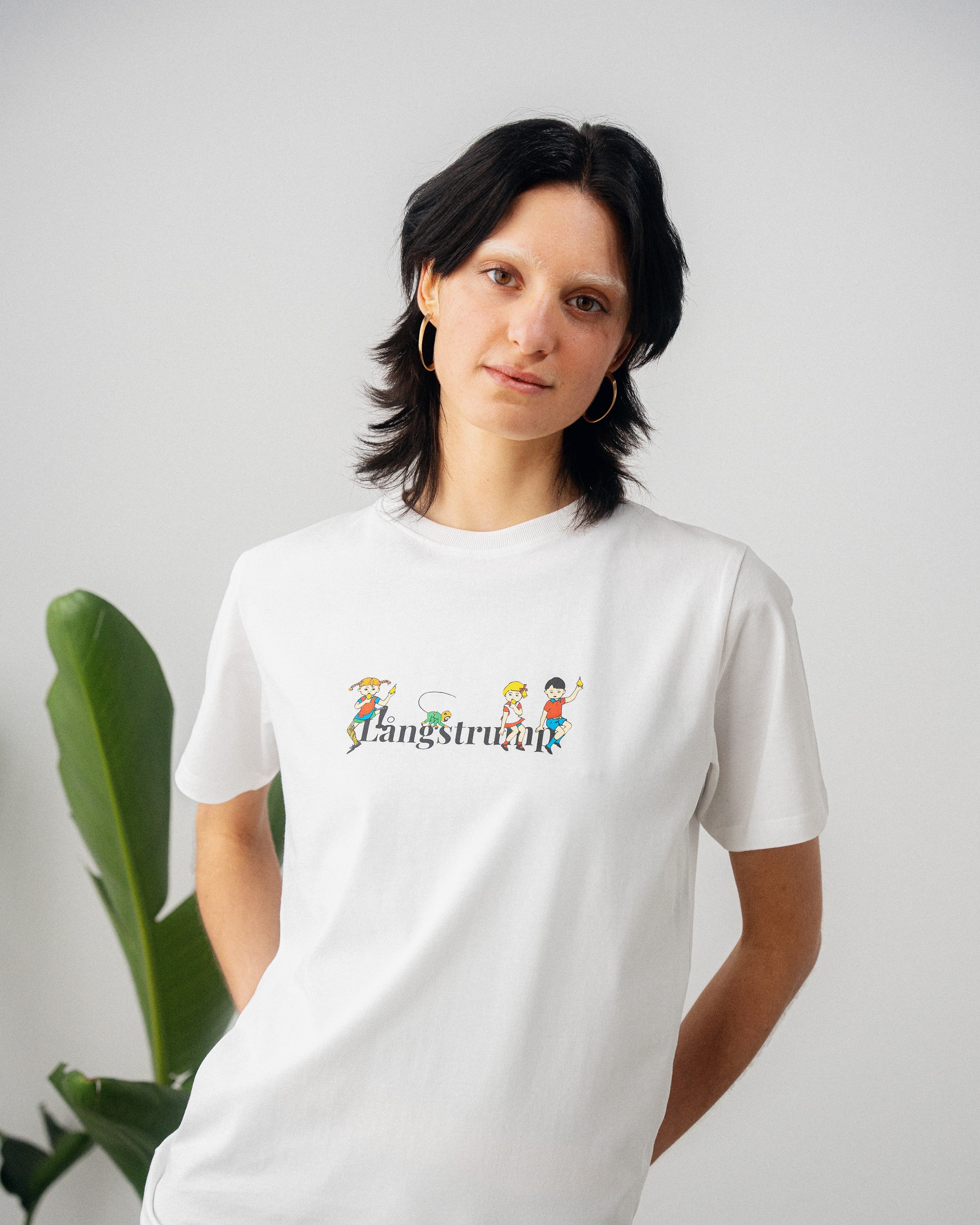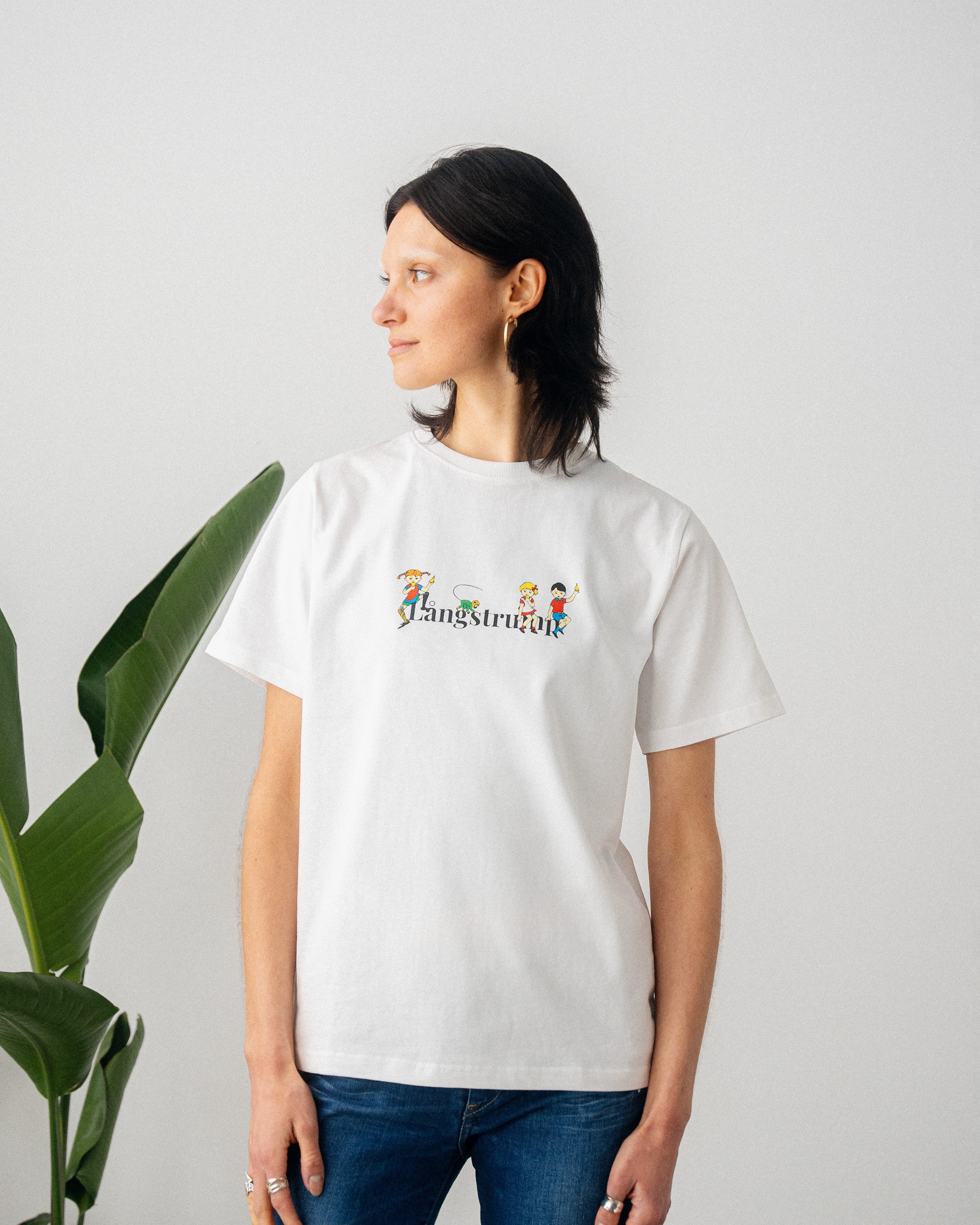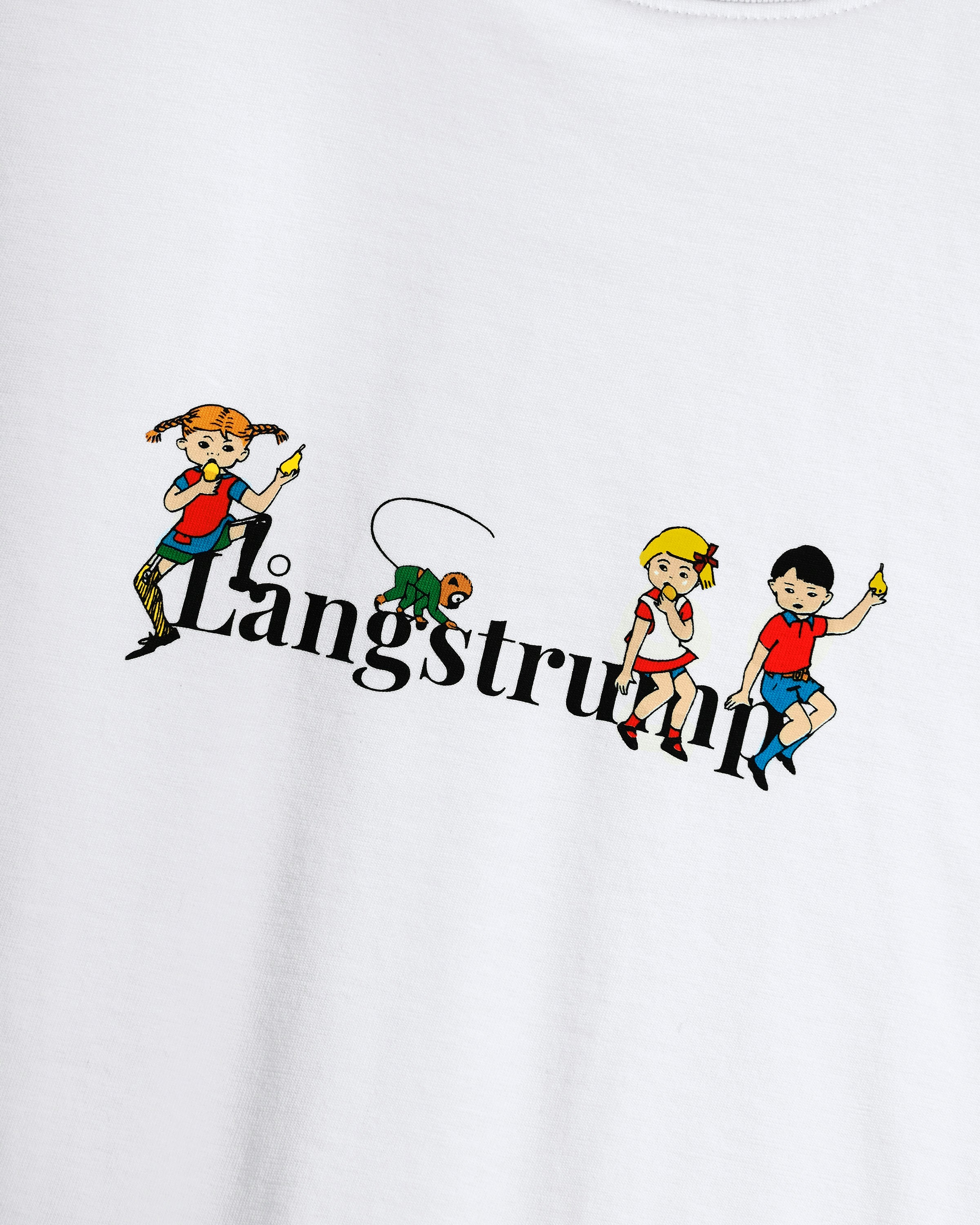 L'imprimé sur le devant du t-shirt blanc montre Pippi et ses amis assis tranquillement sur l'inscription « Långstrump ».