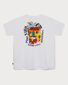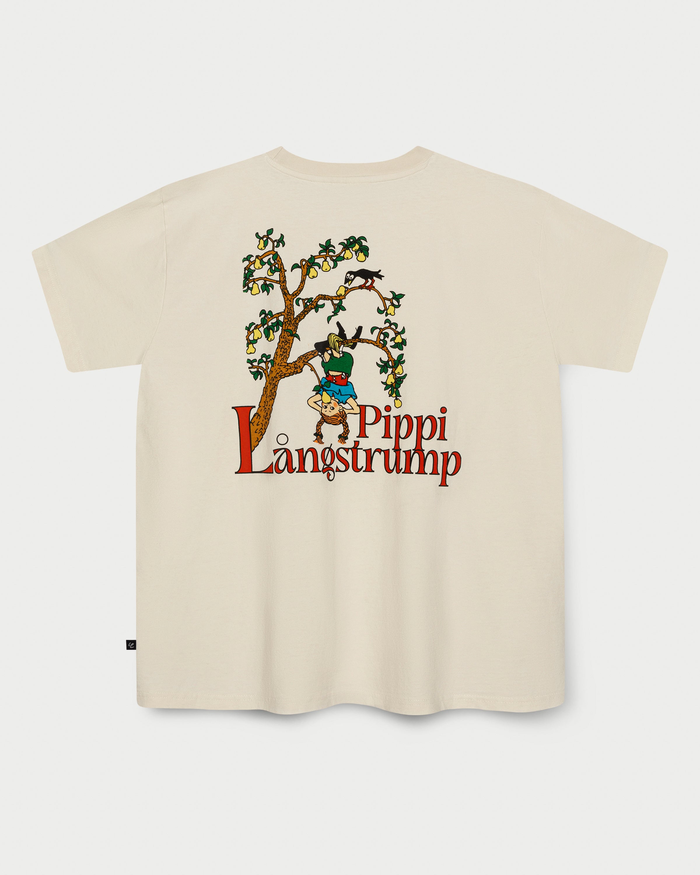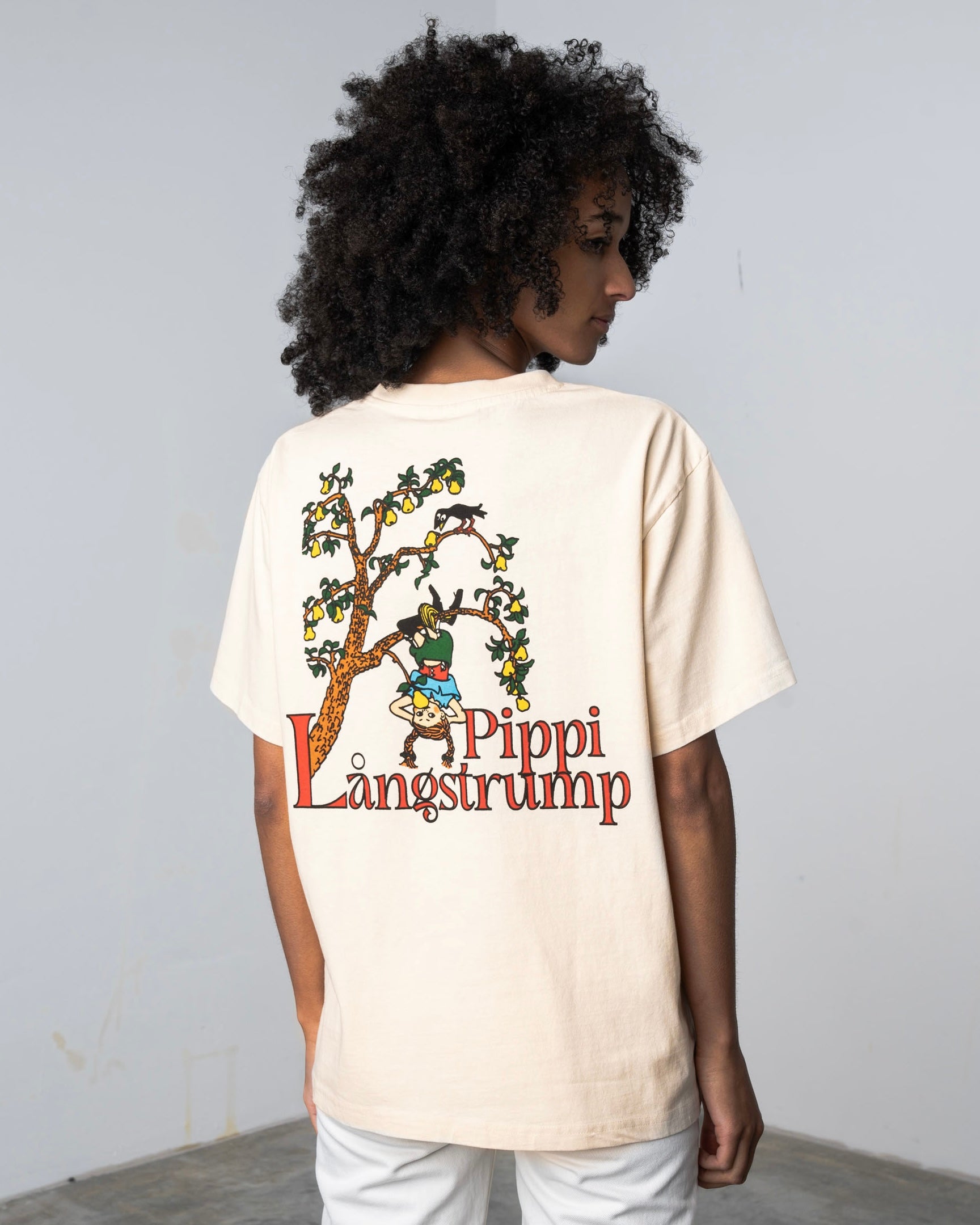 Au dos du t-shirt beige, Fifi Brindacier est suspendue nonchalamment à un citronnier. La broderie sur la poitrine gauche complète le design de cette chemise en coton open-end teint en pièce. Avec la collection Långstrump, nous transposons l'univers coloré de Fifi Brindacier en streetwear moderne. Jasmin mesure 1,75 m et porte une taille XS.