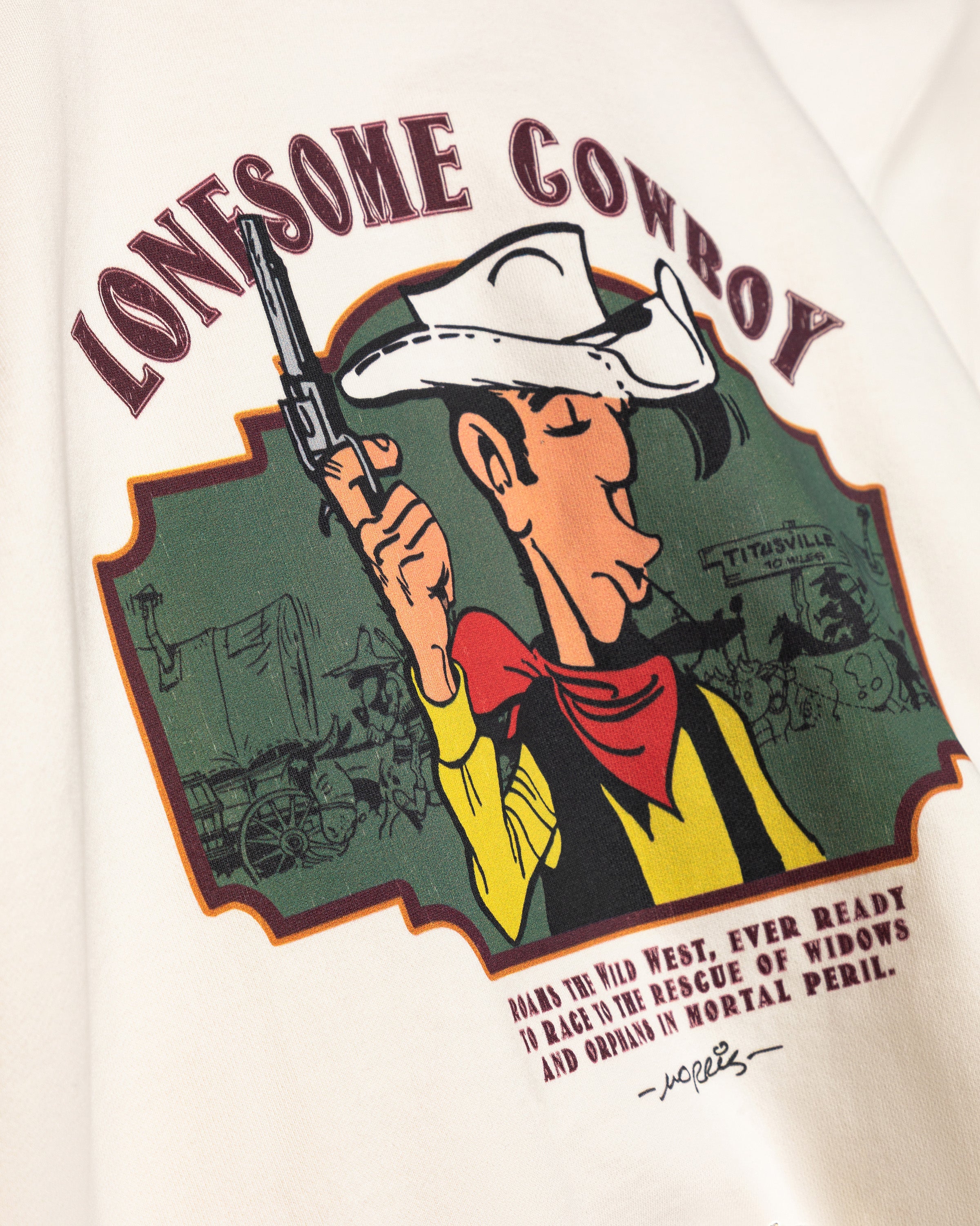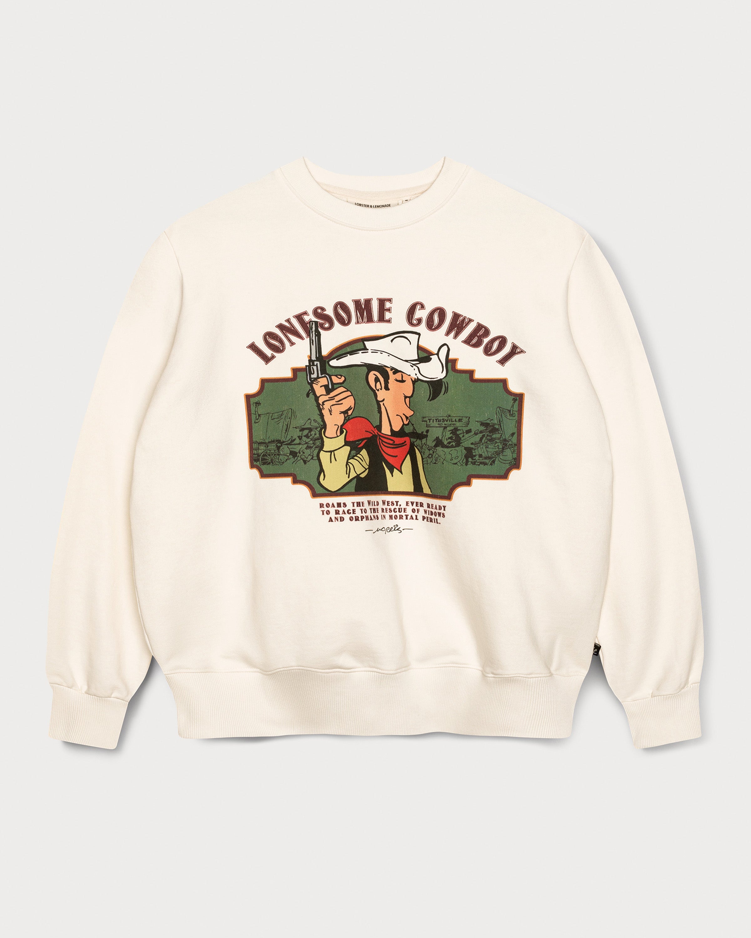 Ce sweat-shirt blanc à la coupe carrée arbore un grand imprimé sur le devant représentant le cow-boy solitaire Lucky Luke. La collection Lucky Luke met bien sûr l'accent sur le cow-boy de bande dessinée le plus célèbre au monde. Des couleurs douces associées à des graphismes expressifs reflètent le style de la série et évoquent l'image du « cow-boy qui dessine plus vite que son ombre ».