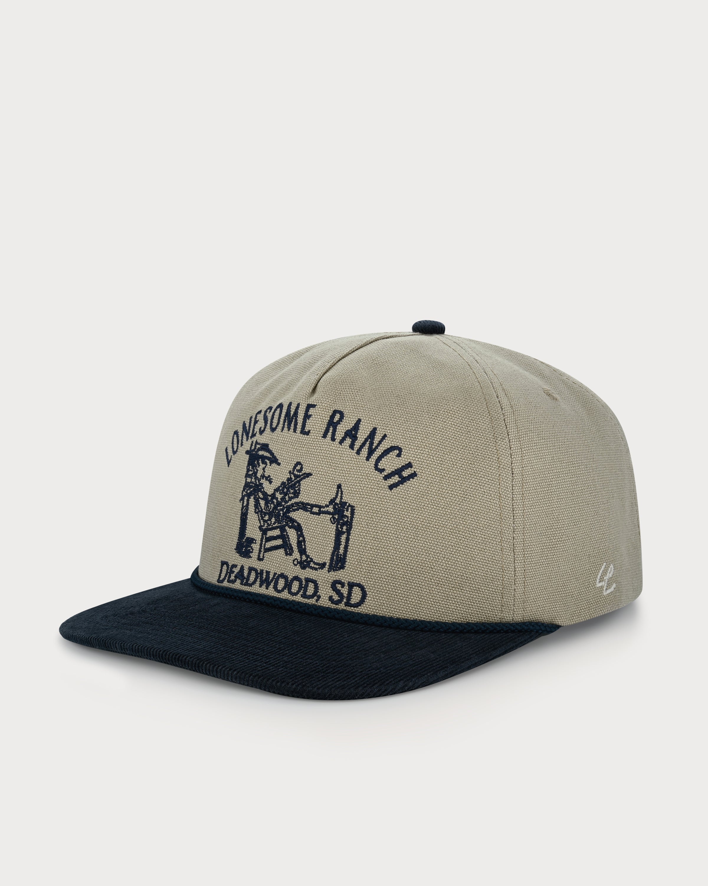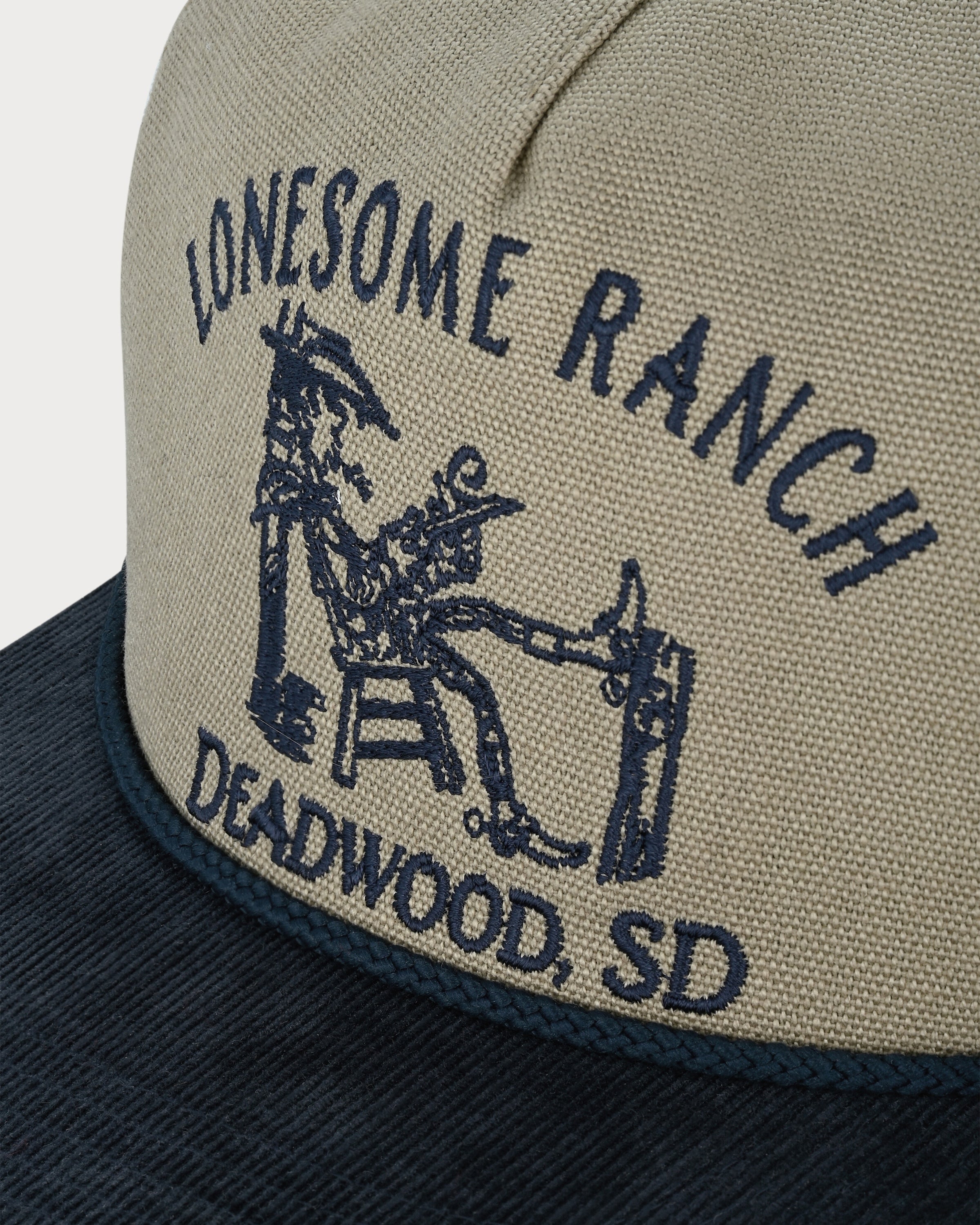 Cette casquette bicolore arbore une broderie décontractée représentant Lucky Luke sculptant du bois au ranch de Deadwood. Le cordon décoratif sur la visière en velours côtelé et la tige en toile complètent le look western.