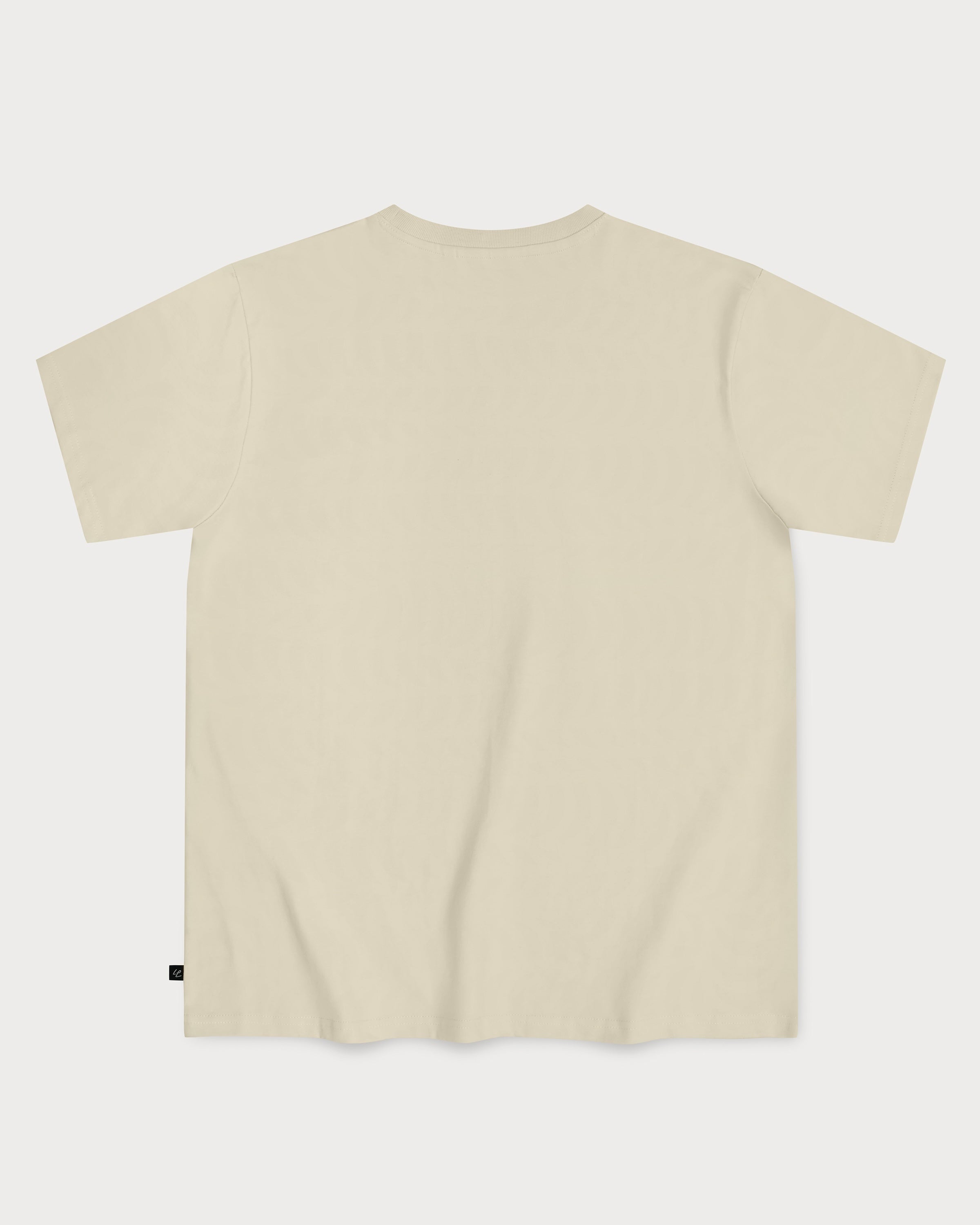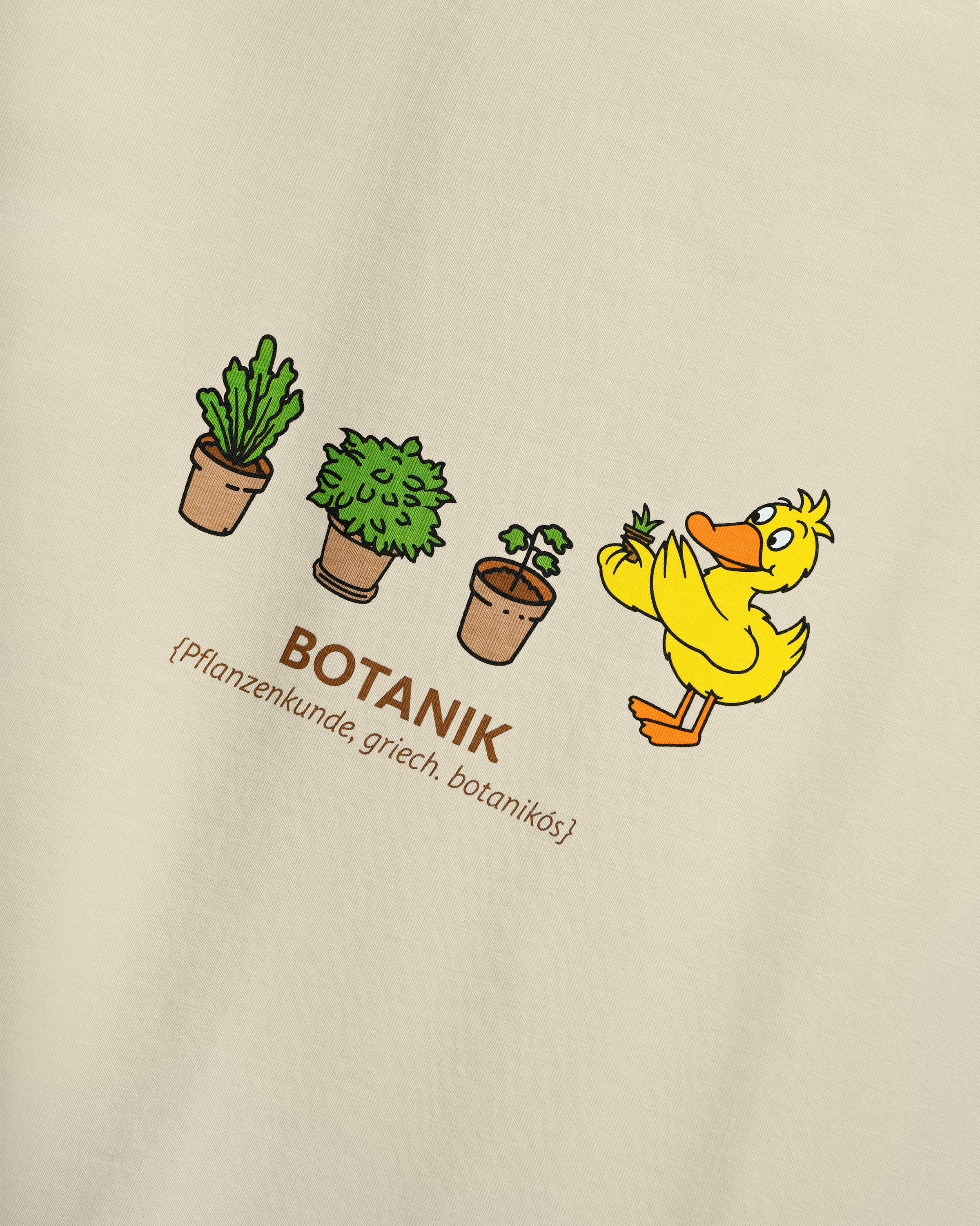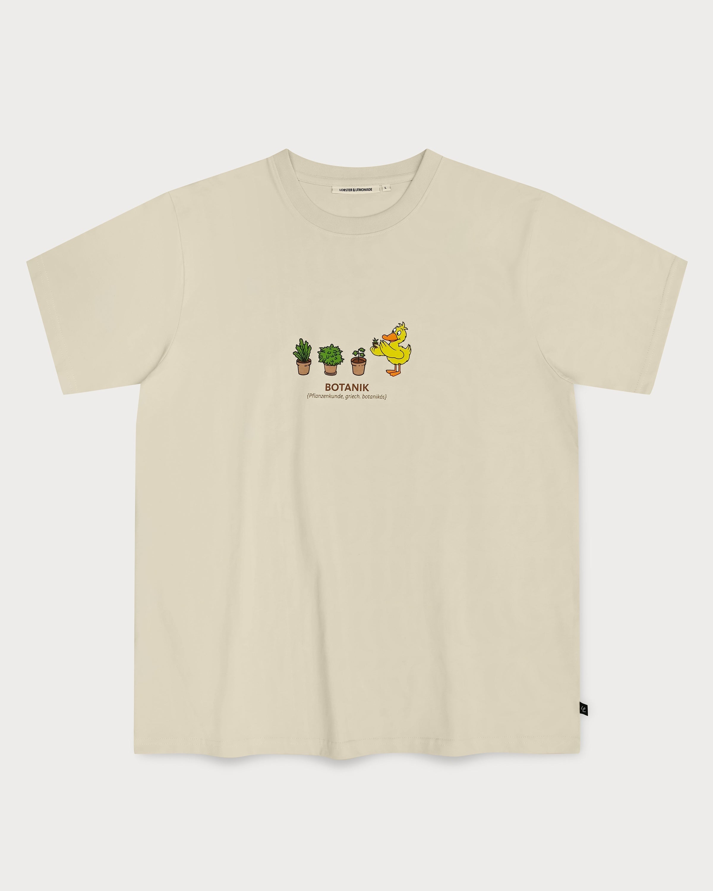 L'imprimé sur le devant du t-shirt beige représente le canard montrant sa main verte. Le discret lettrage « Botanik » complète le style.