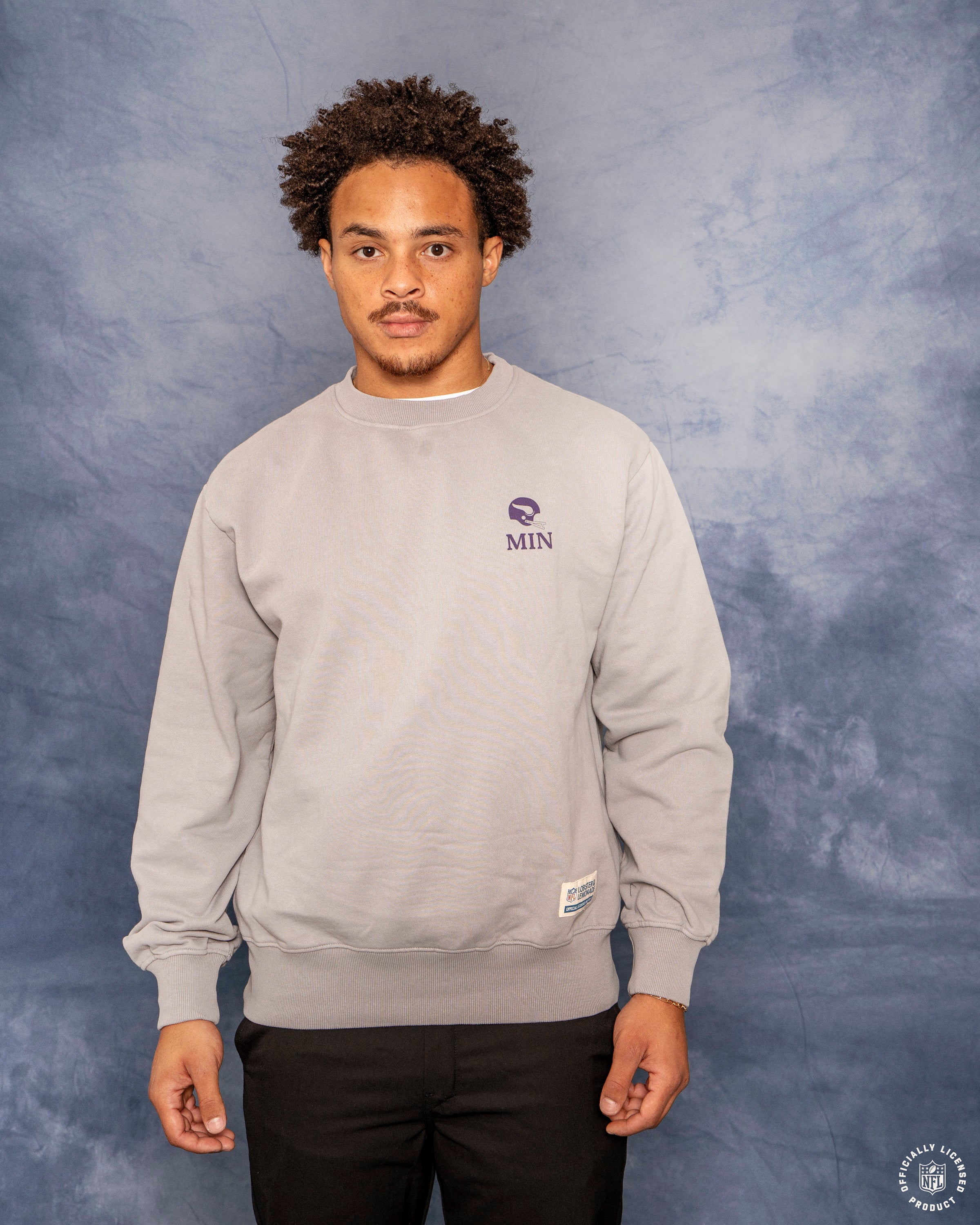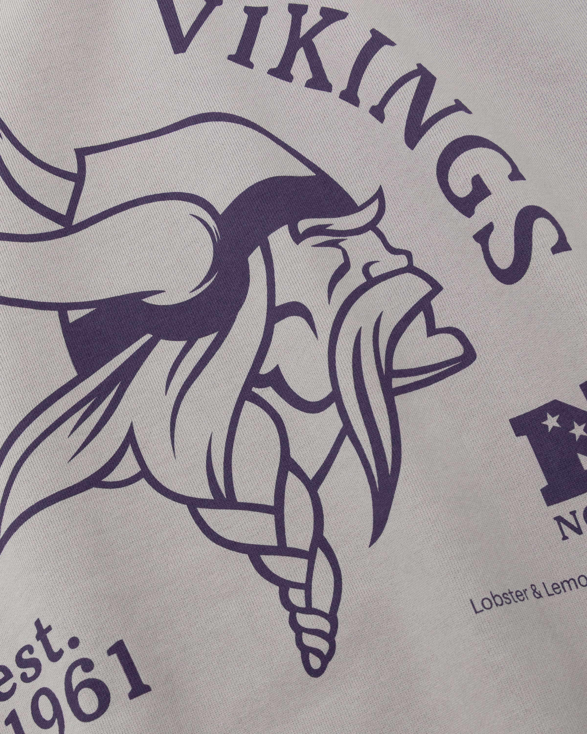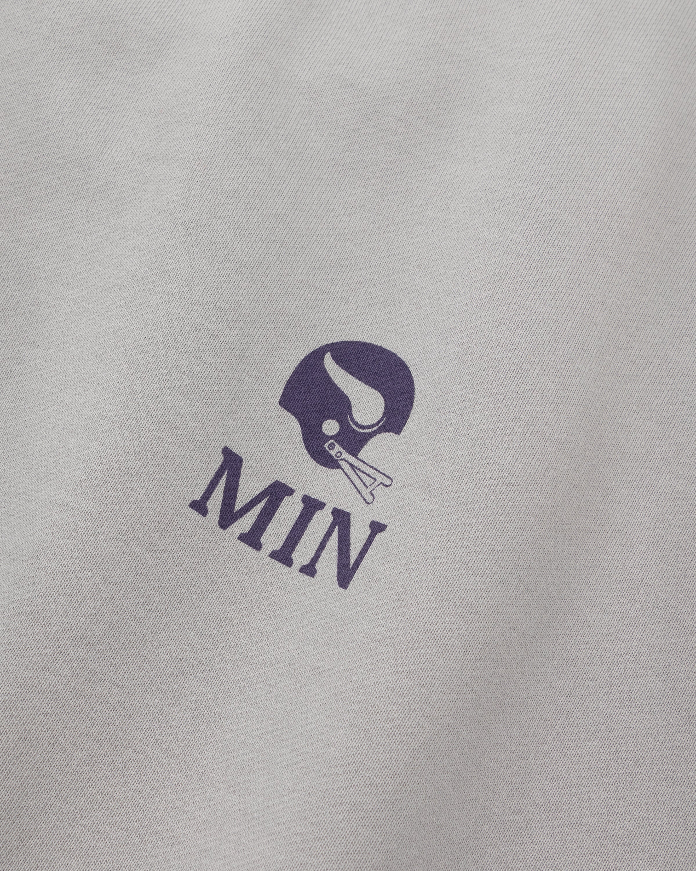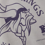 Ce pull gris arbore un grand imprimé des Vikings du Minnesota dans le dos, avec notamment le logo Norseman. Un petit imprimé casque des Vikings classiques sur la poitrine gauche et une étiquette tissée en toile à la taille complètent son look rétro.