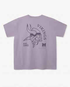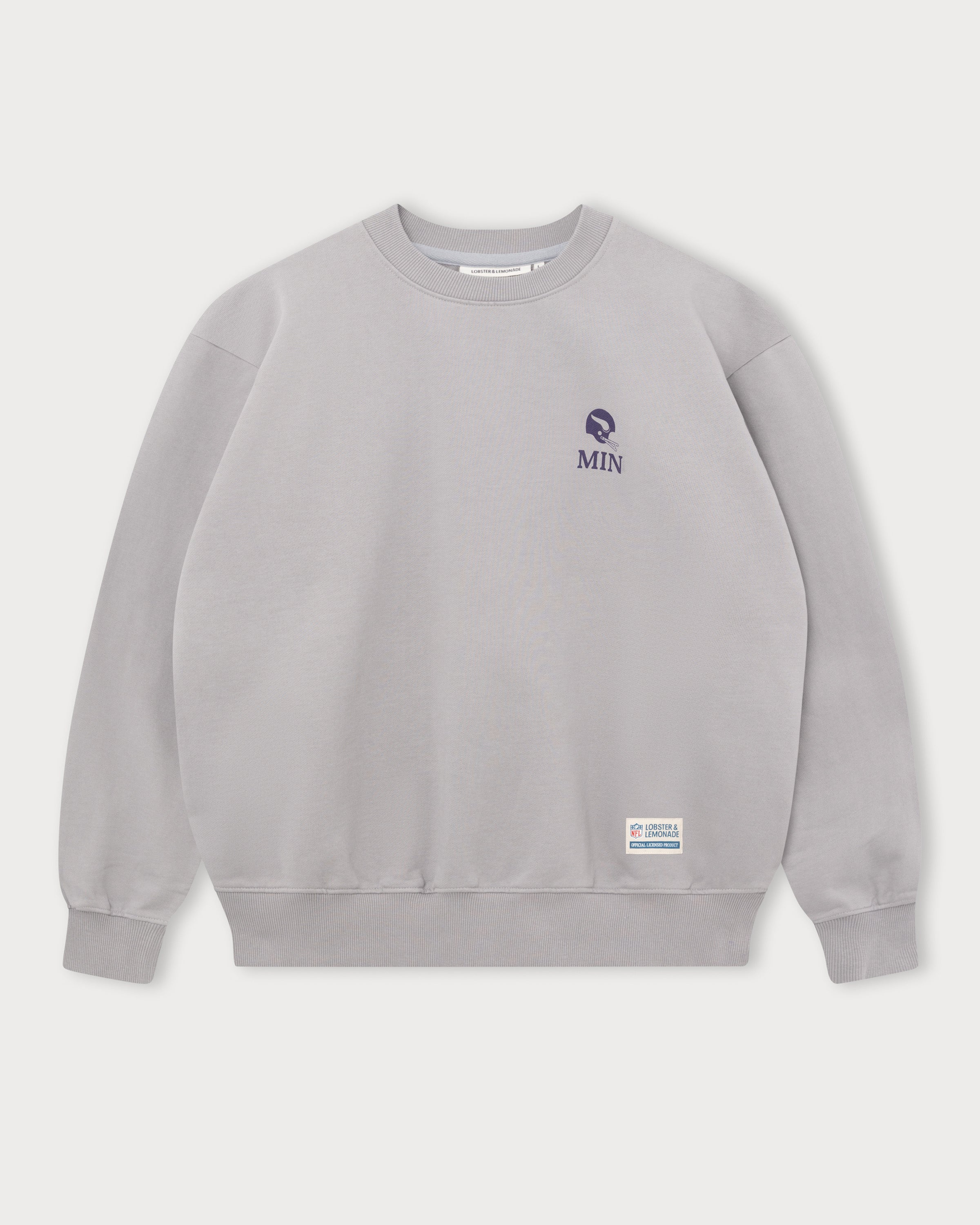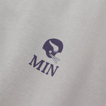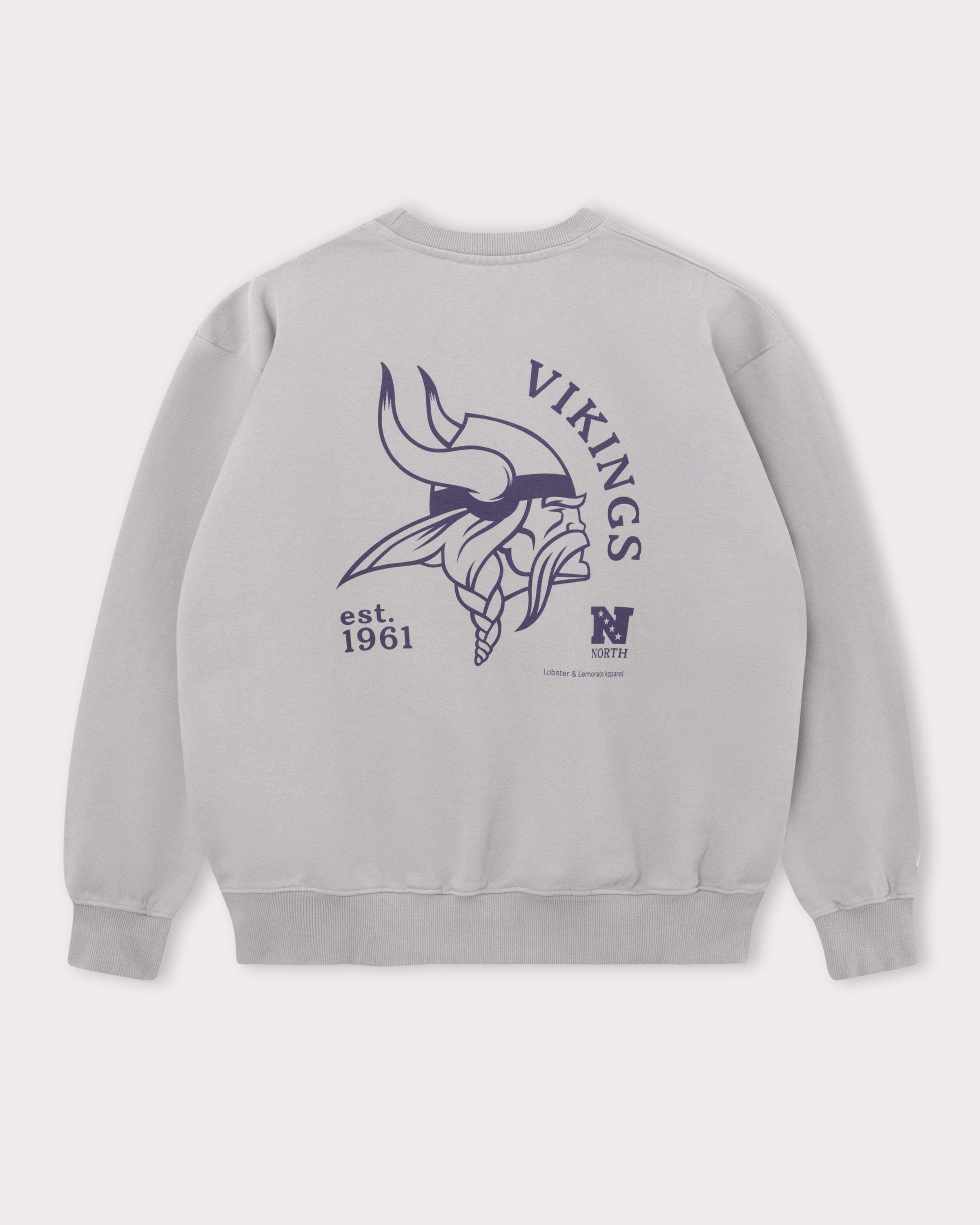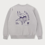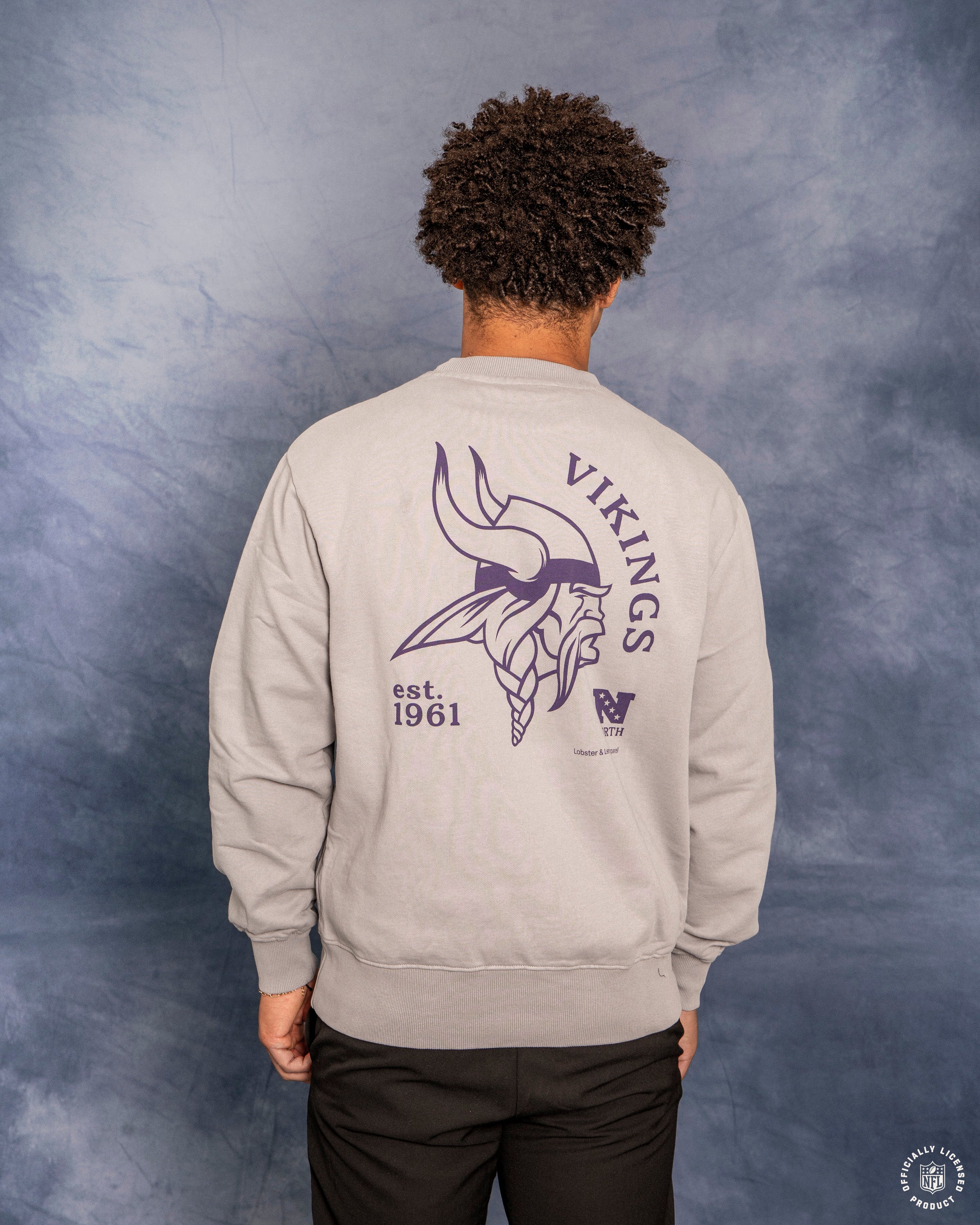 Ce pull gris arbore un grand imprimé des Vikings du Minnesota dans le dos, avec notamment le logo Norseman. Un petit imprimé casque des Vikings classiques sur la poitrine gauche et une étiquette tissée en toile à la taille complètent son look rétro.