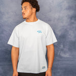 Le t-shirt présente une coupe carrée, un aspect délavé et pèse 240 g/m². Roney mesure 1,77 m et porte une taille L.