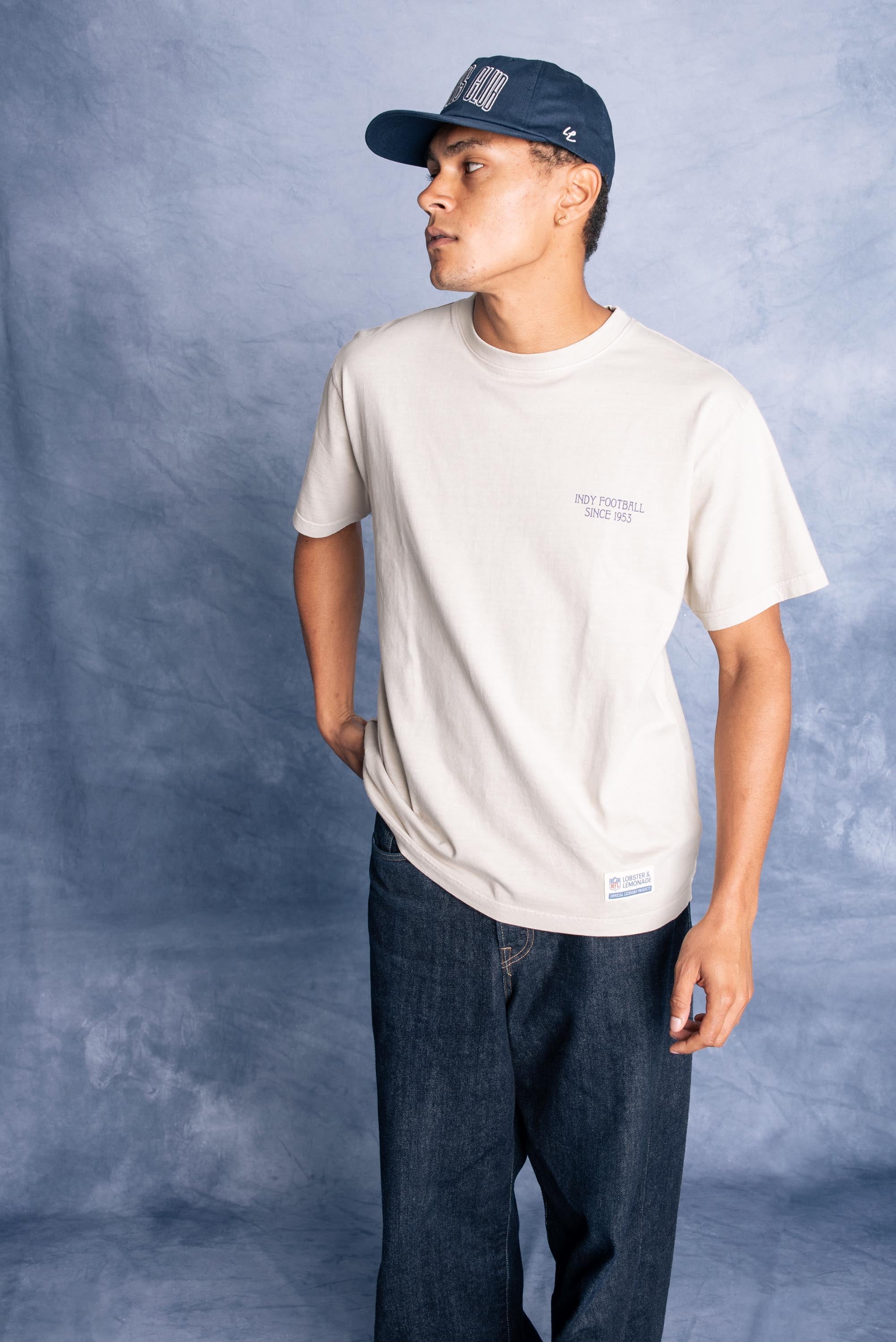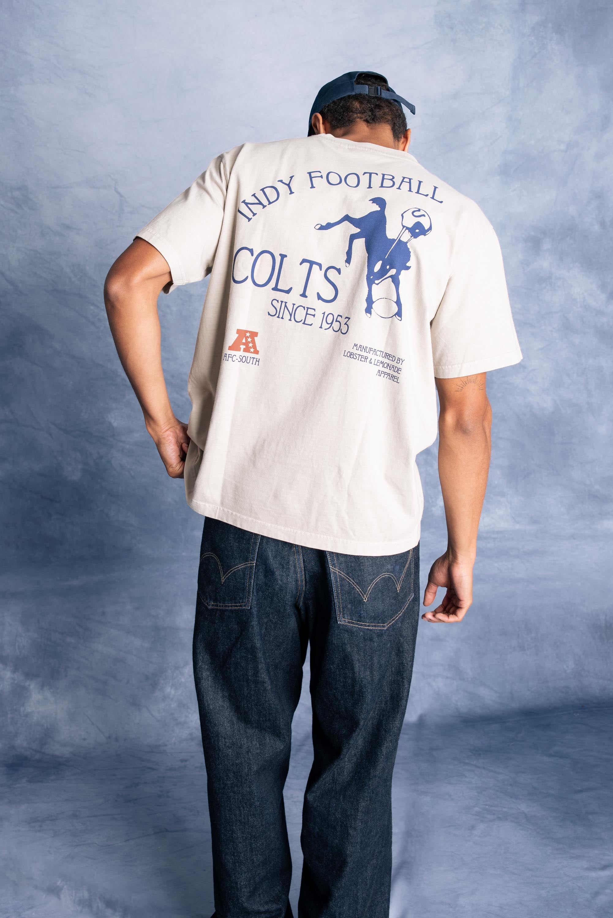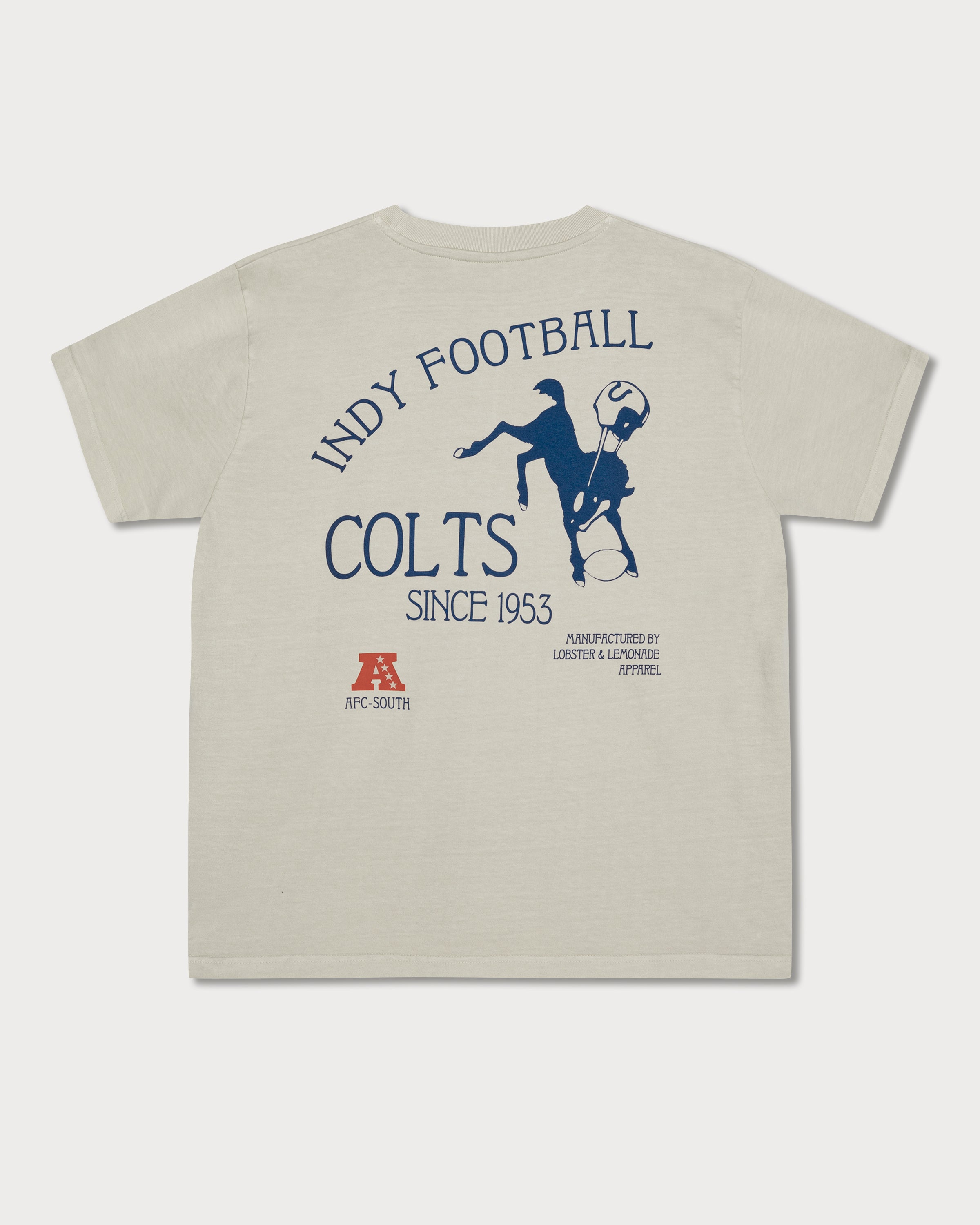 Ce t-shirt beige teint en pièce arbore un logo vintage des Colts avec un cheval cabré dans un généreux imprimé au dos. L'imprimé football américain Indy sur la poitrine gauche et l'étiquette tissée en toile à la taille complètent son look rétro.