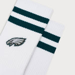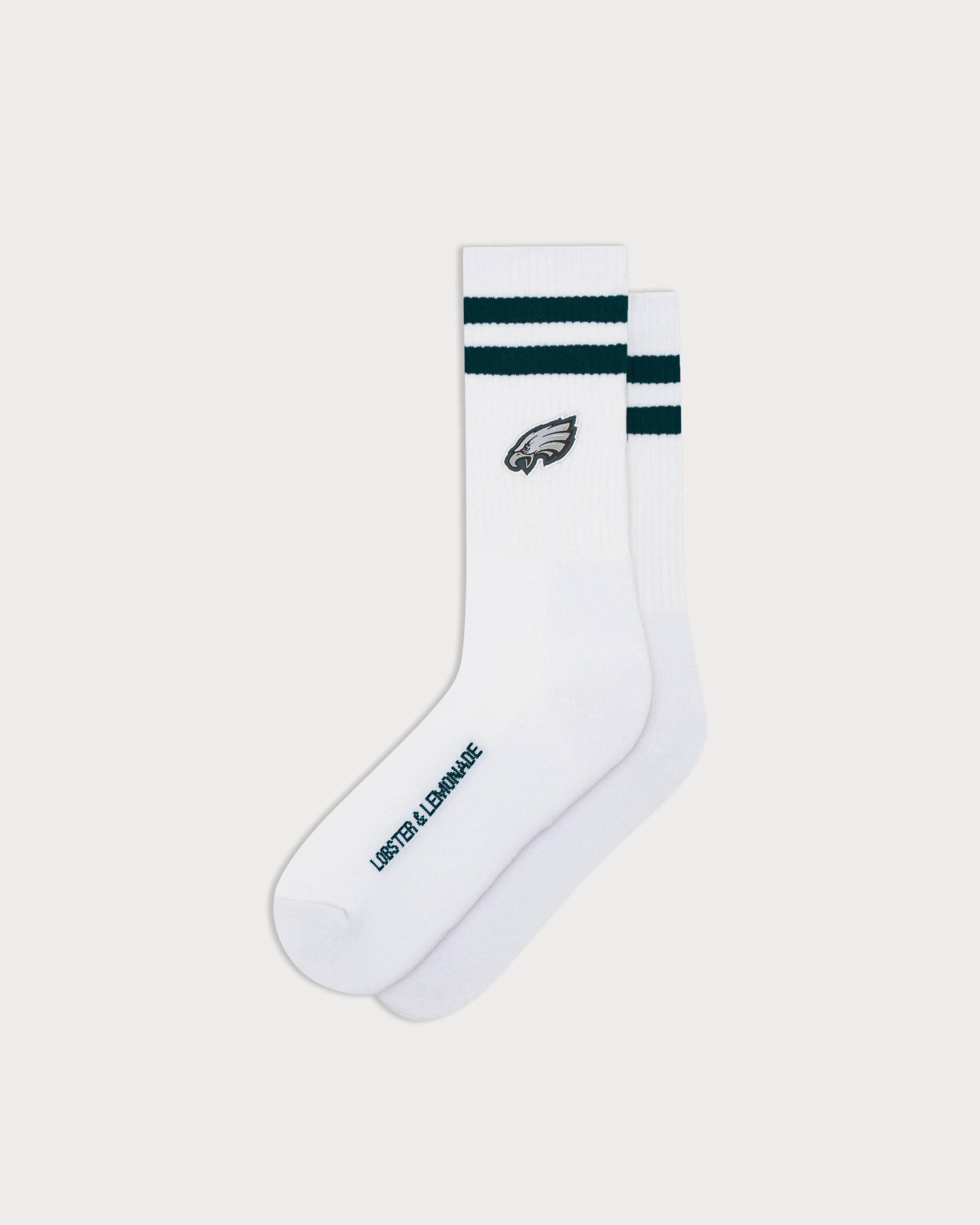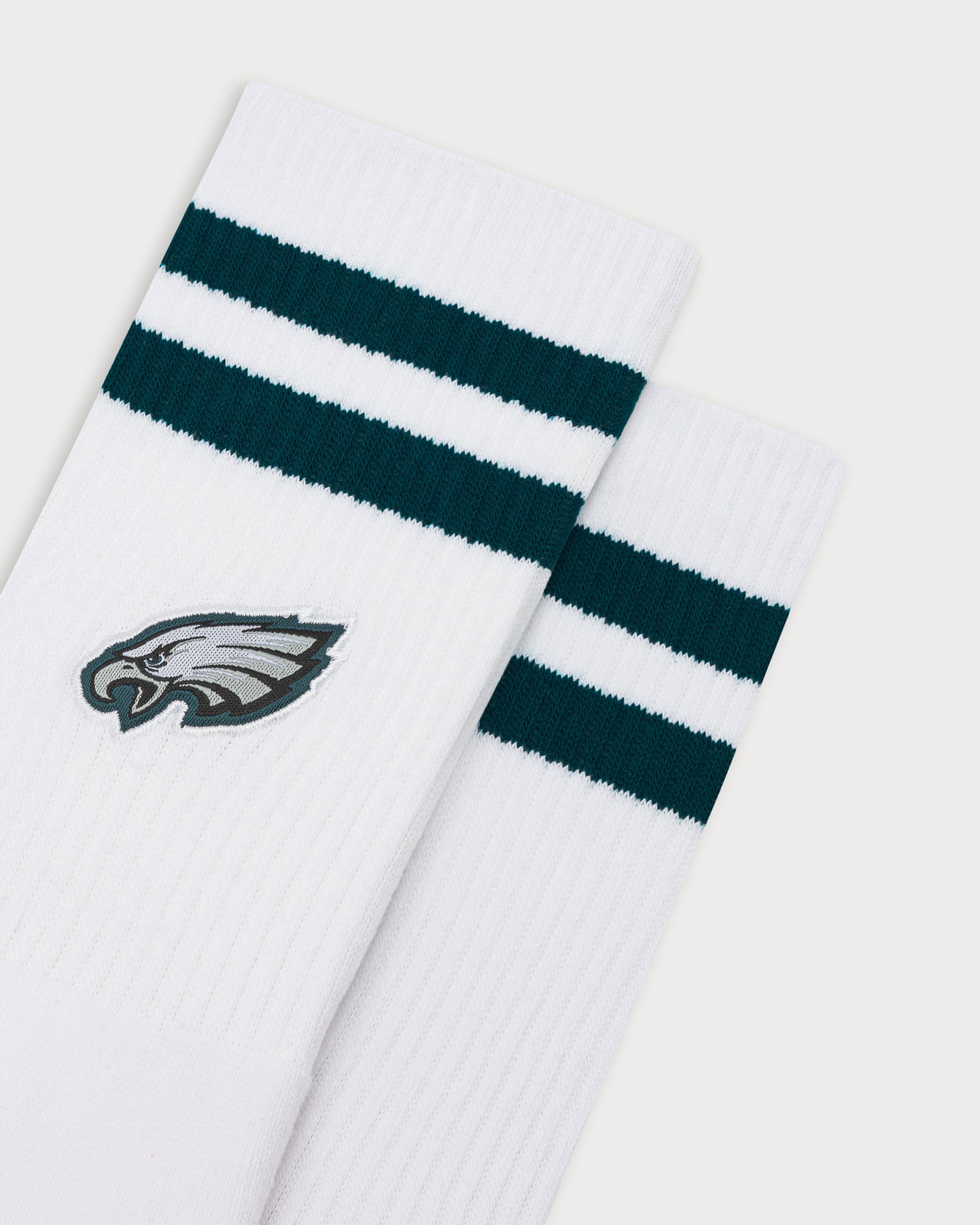 Ces chaussettes de sport blanches arborent des rayures turquoise sous le revers. Le logo des Eagles, une étiquette tissée au-dessus de la cheville, complète leur look sportif.