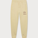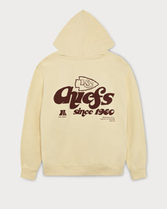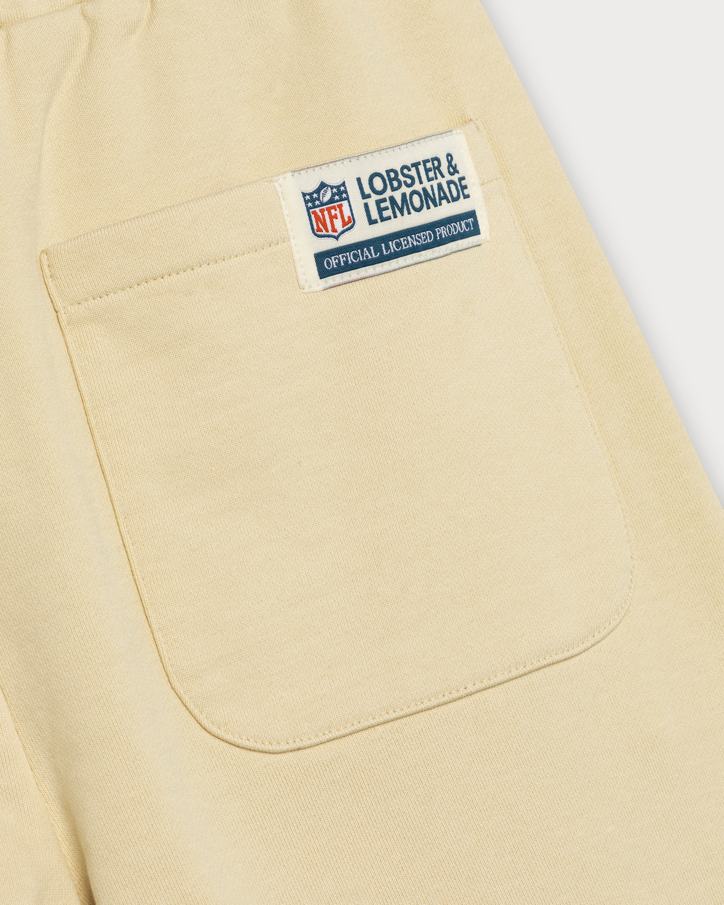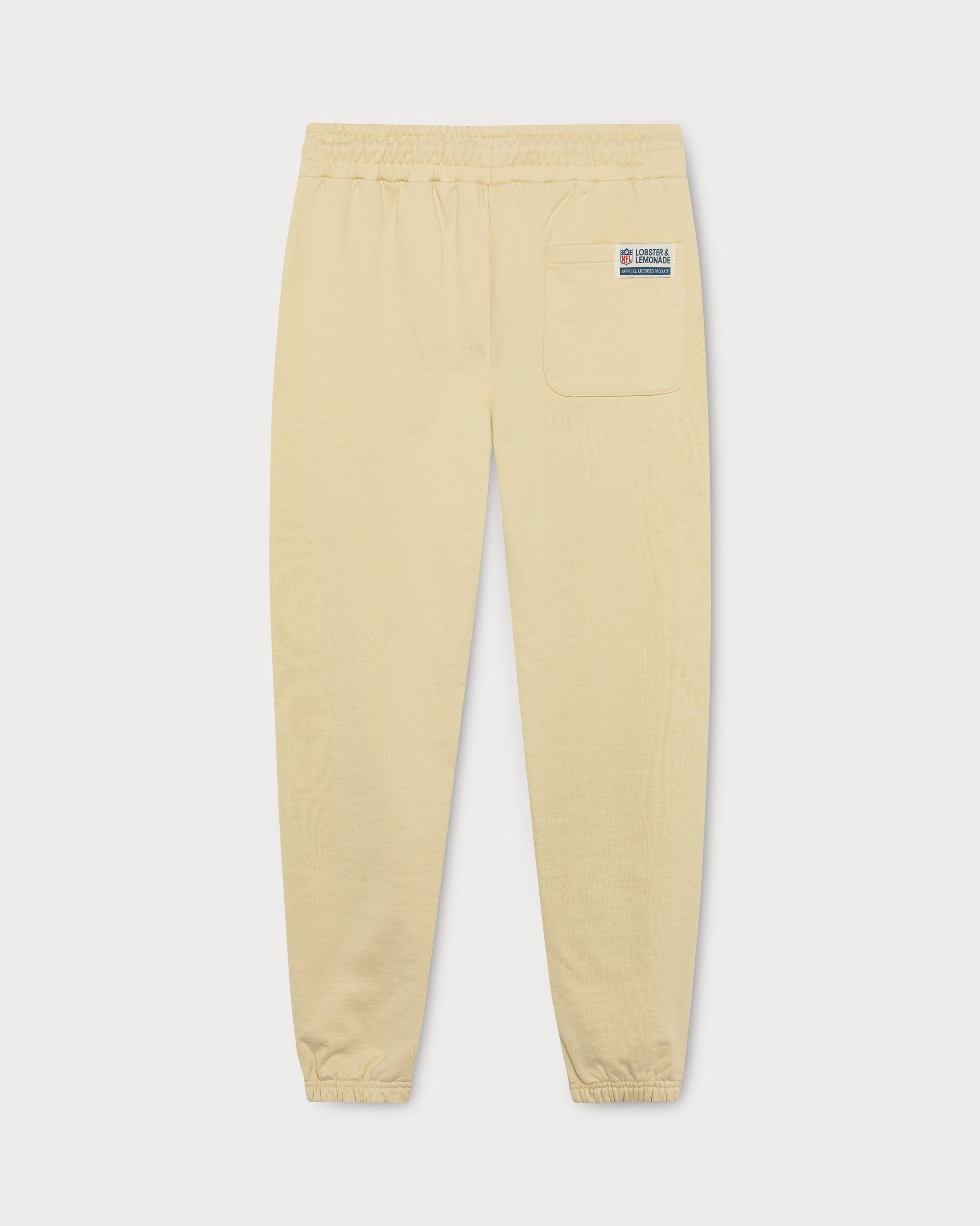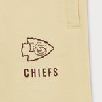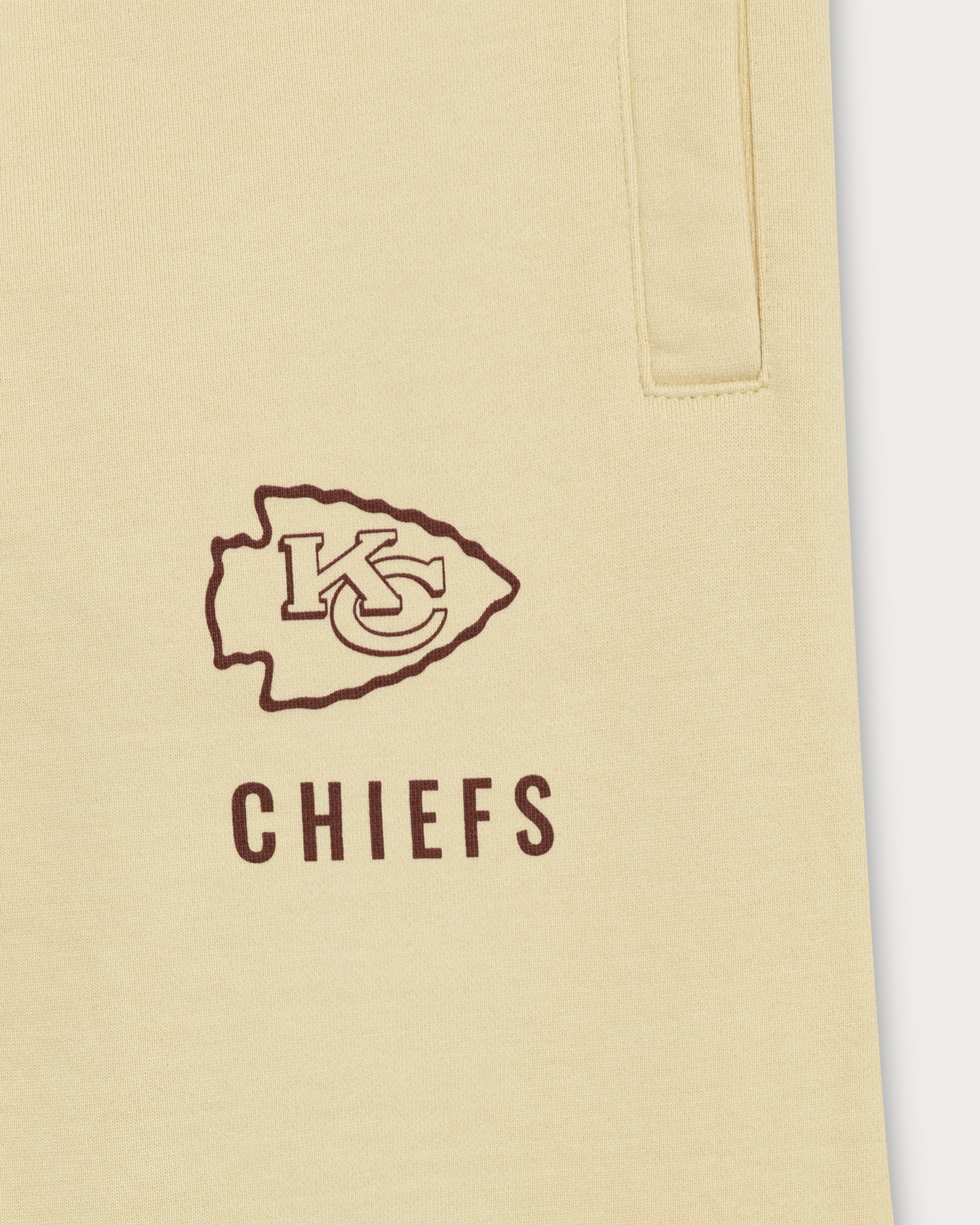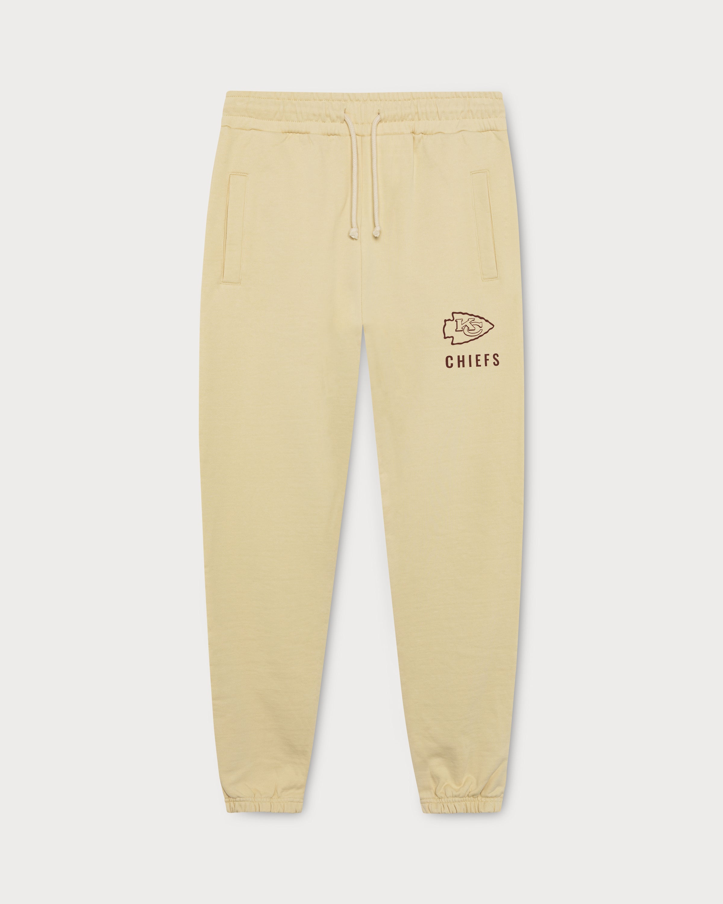 Ce pantalon de survêtement couleur crème arbore le logo minimaliste des Chiefs en bordeaux sur la cuisse gauche. L'étiquette en toile sur la poche arrière droite complète son look rétro.