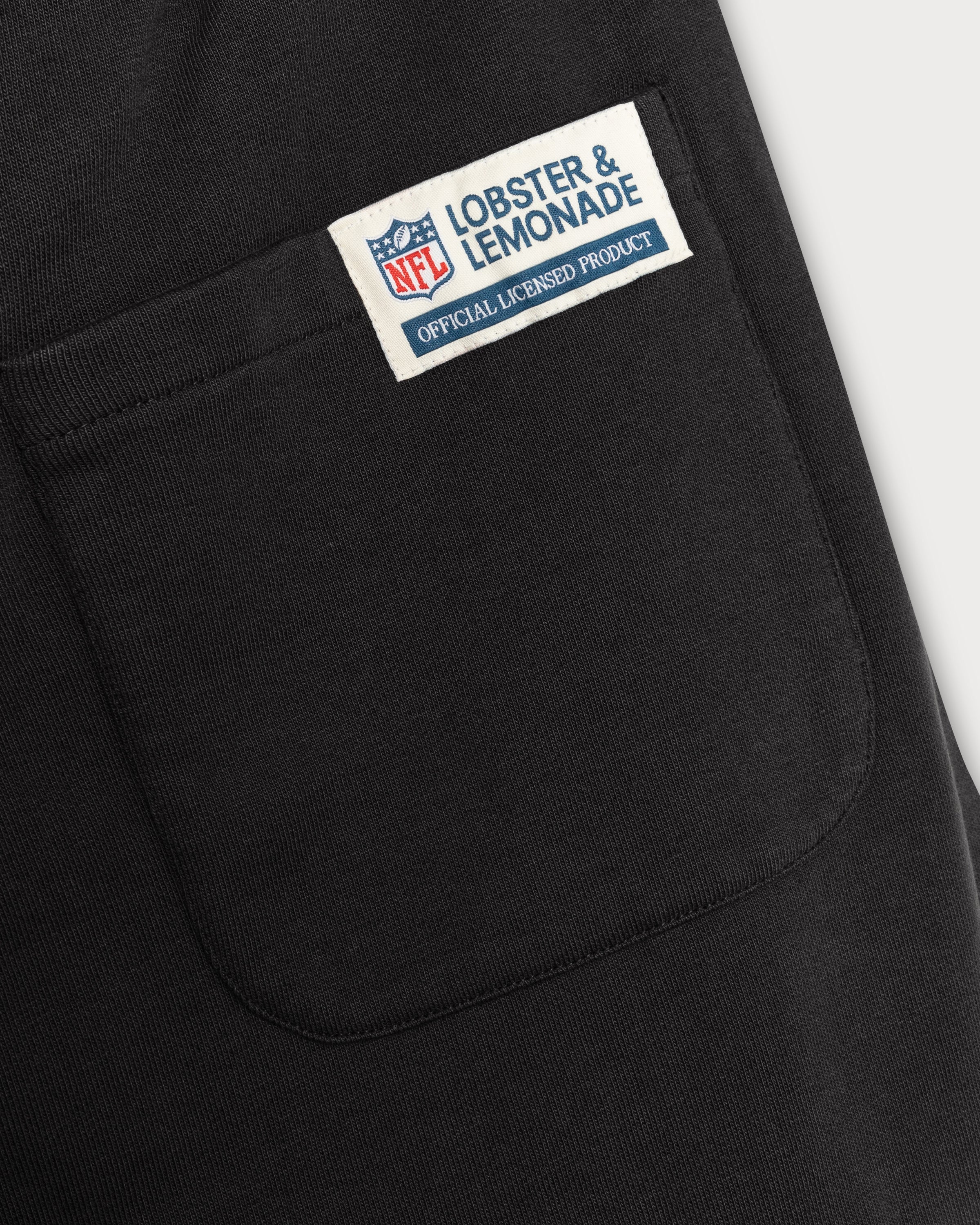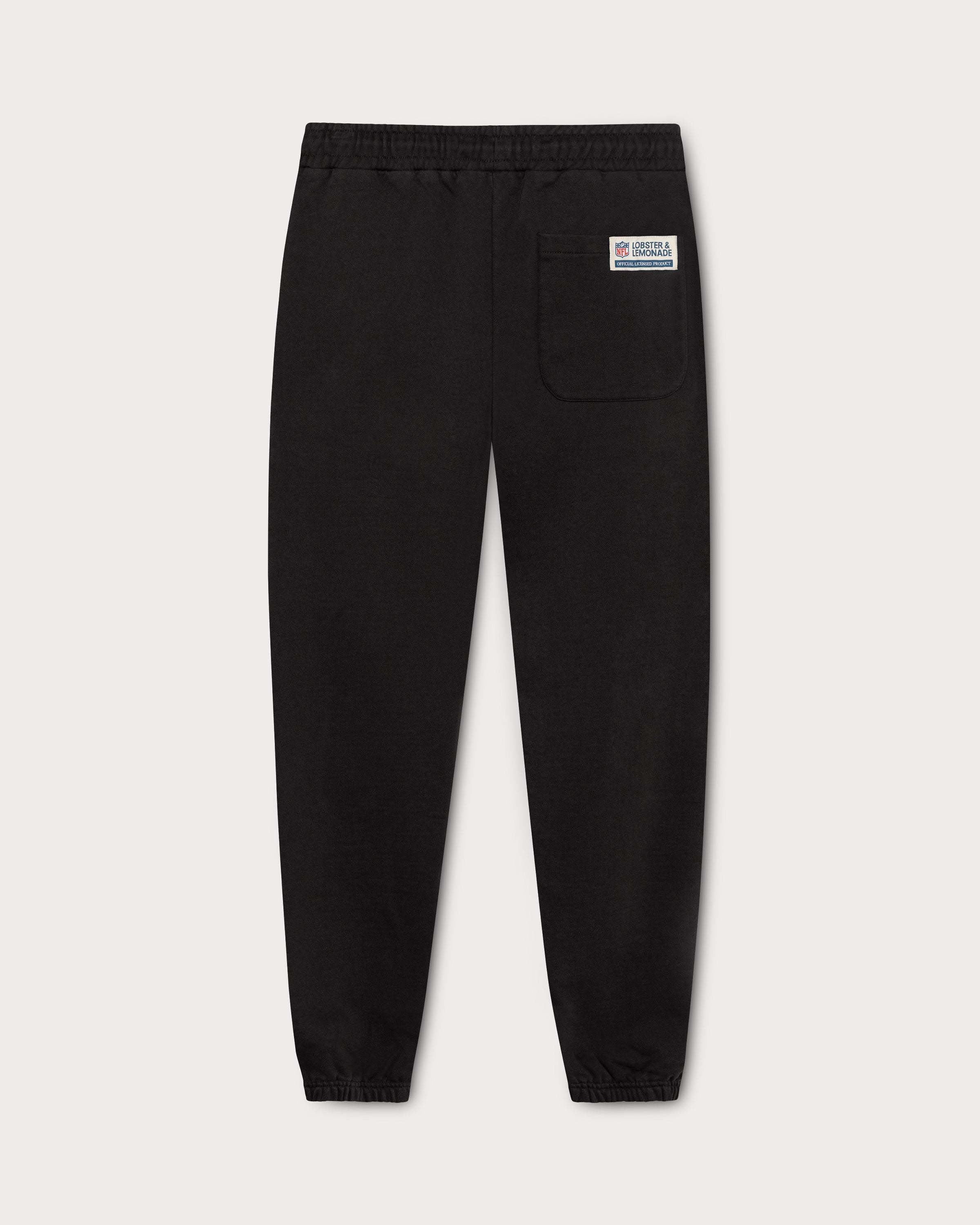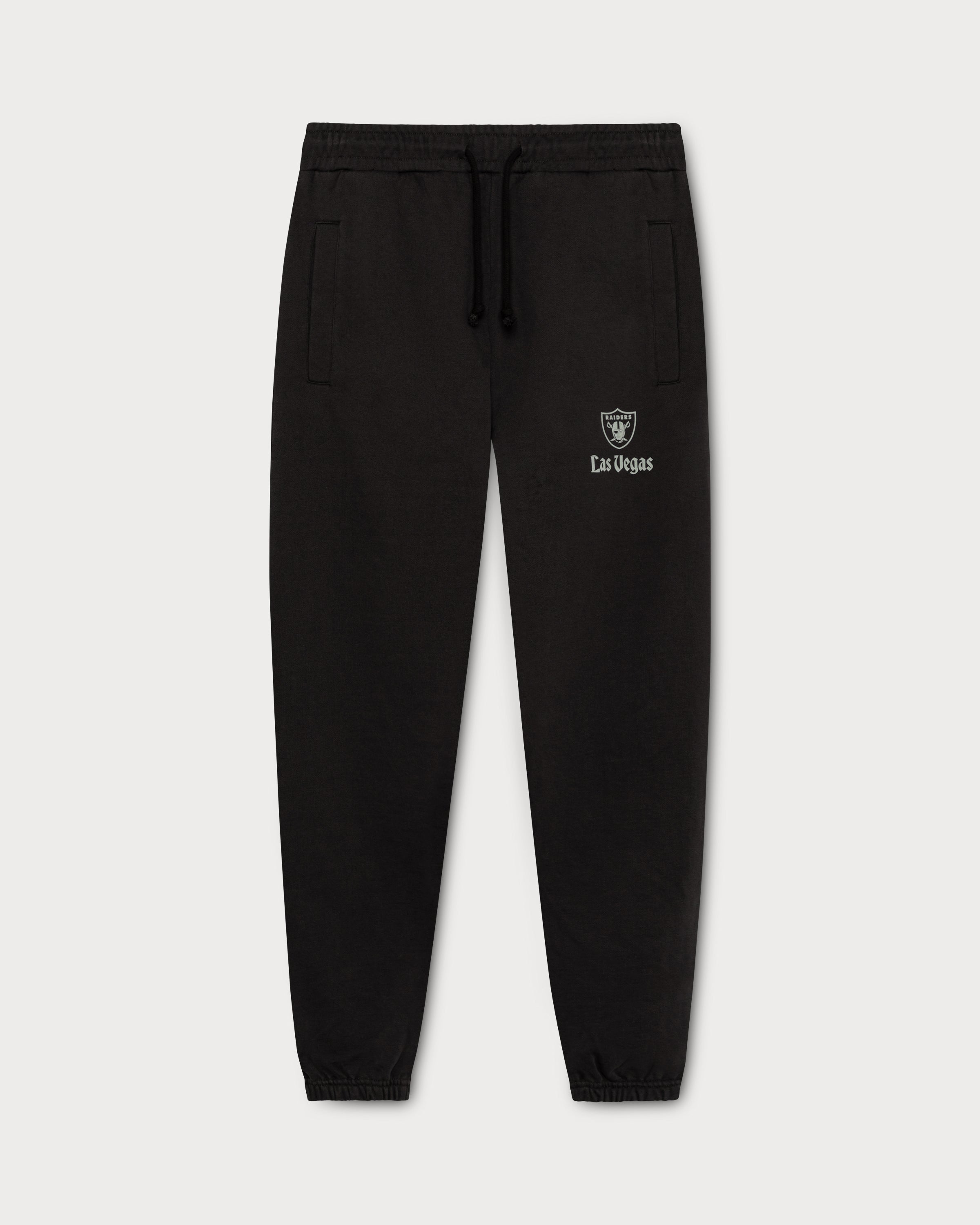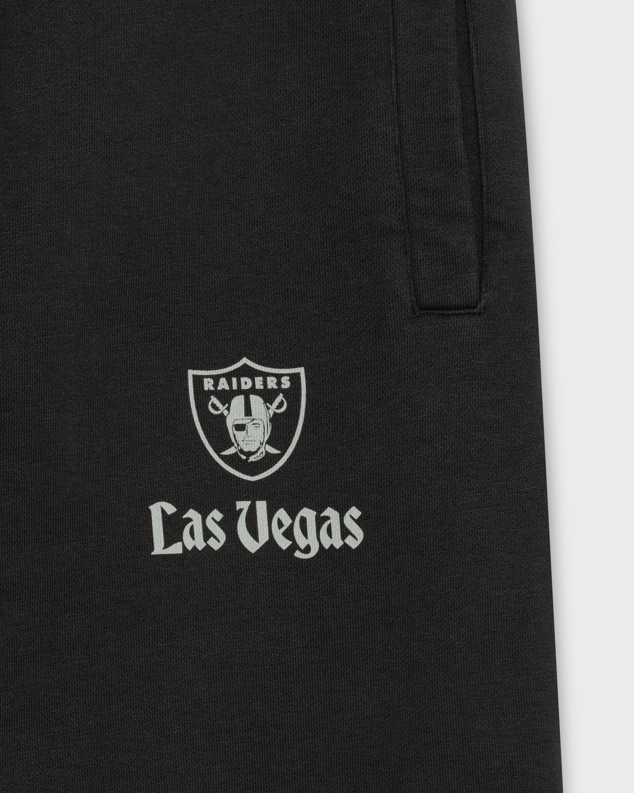 Ce pantalon de survêtement noir arbore le logo emblématique des Raiders en gris sur la cuisse gauche. L'étiquette en toile sur la poche arrière droite complète son look rétro.