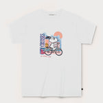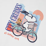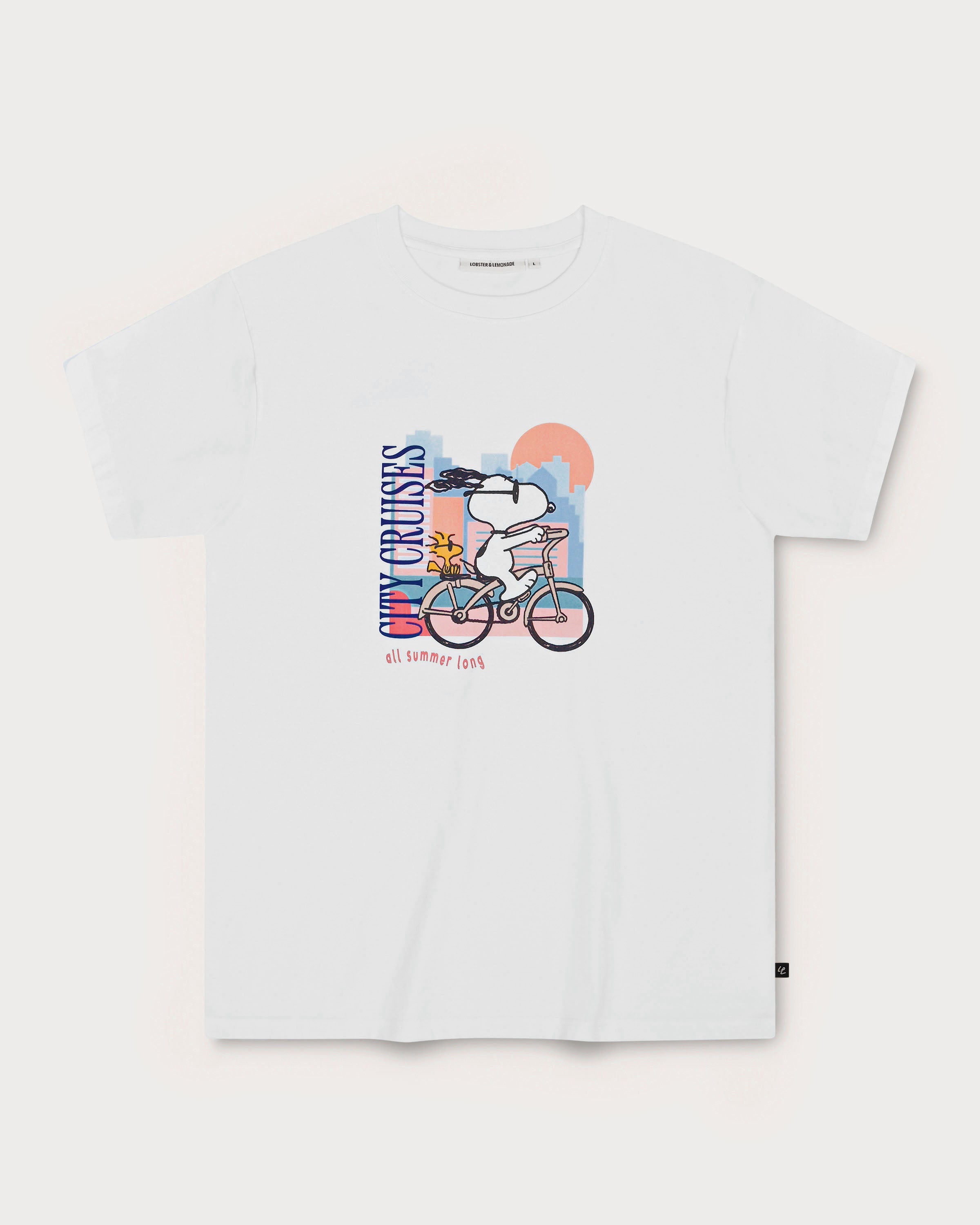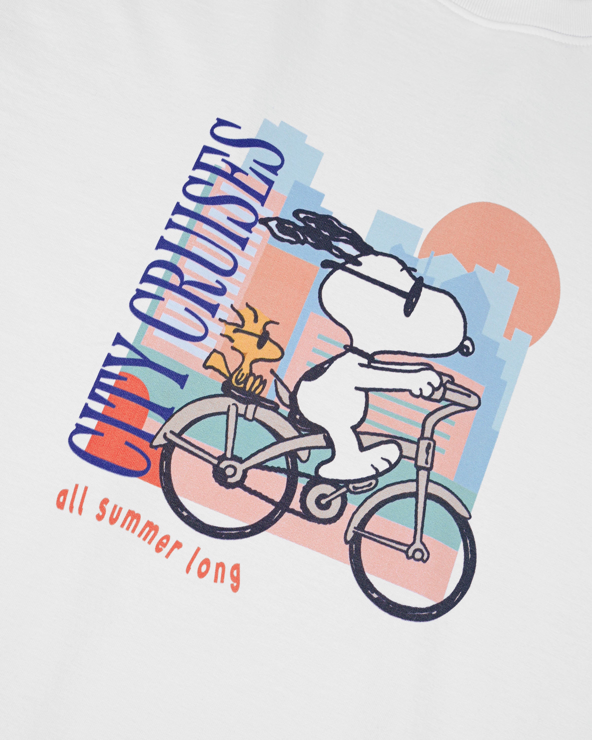 L'imprimé sur le devant du t-shirt blanc représente Snoopy et Woodstock parcourant tranquillement la ville à vélo. L'inscription « City Cruises » apporte une touche supplémentaire.