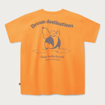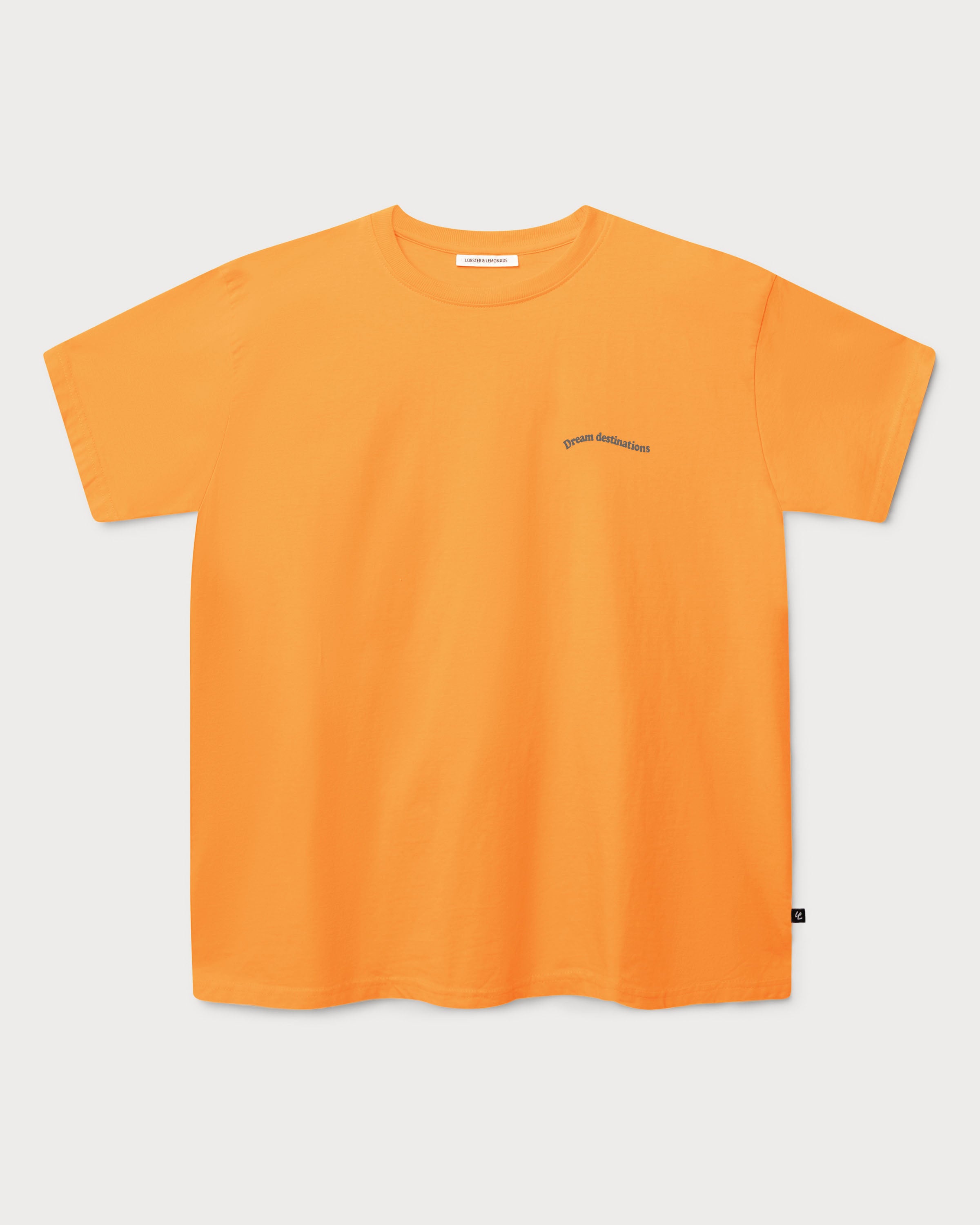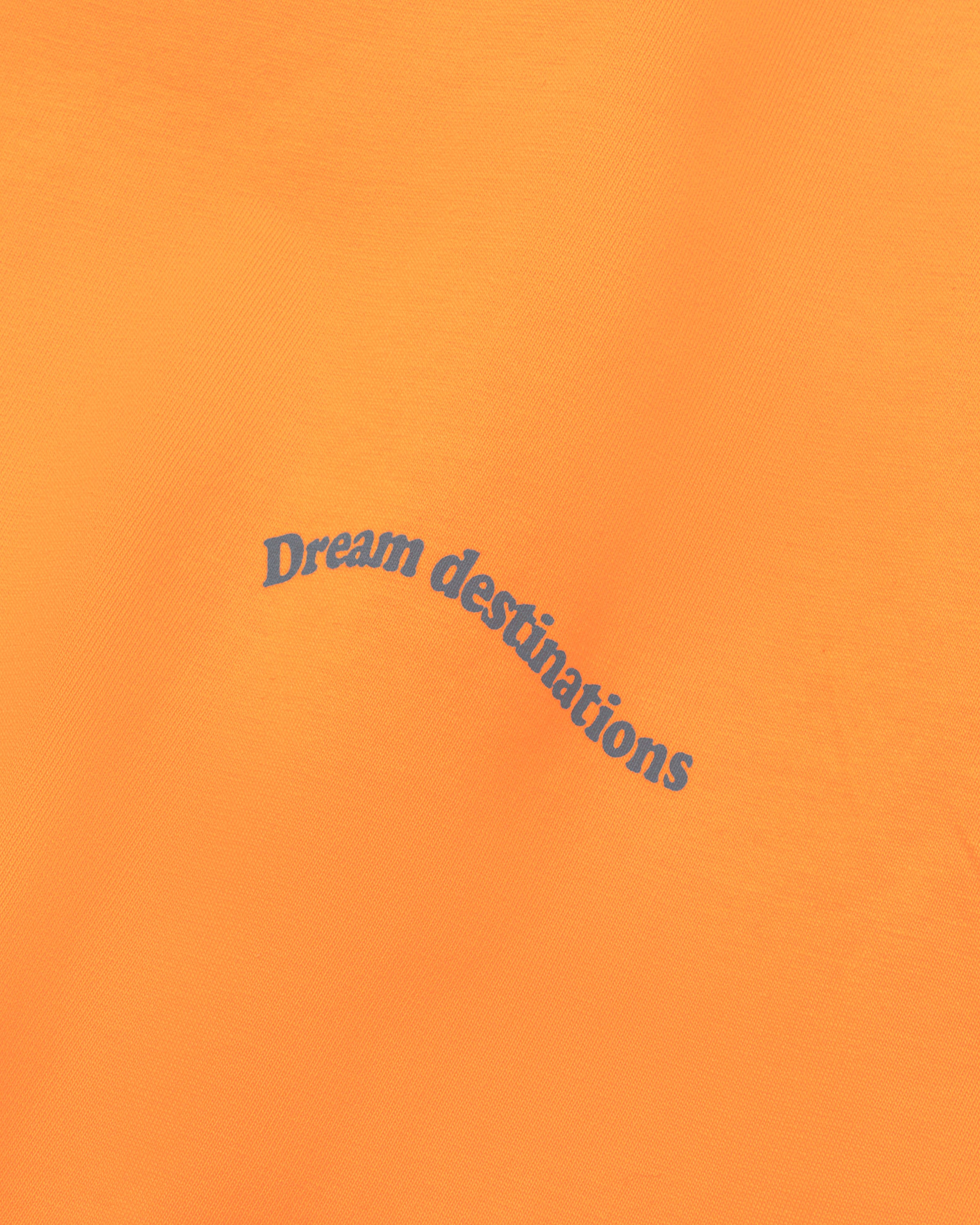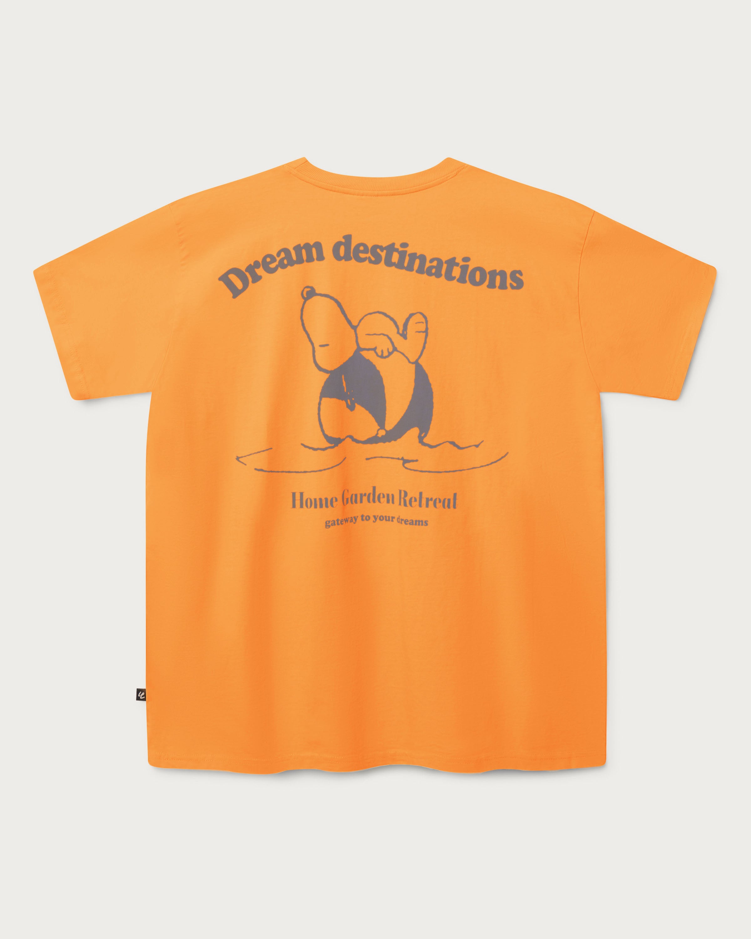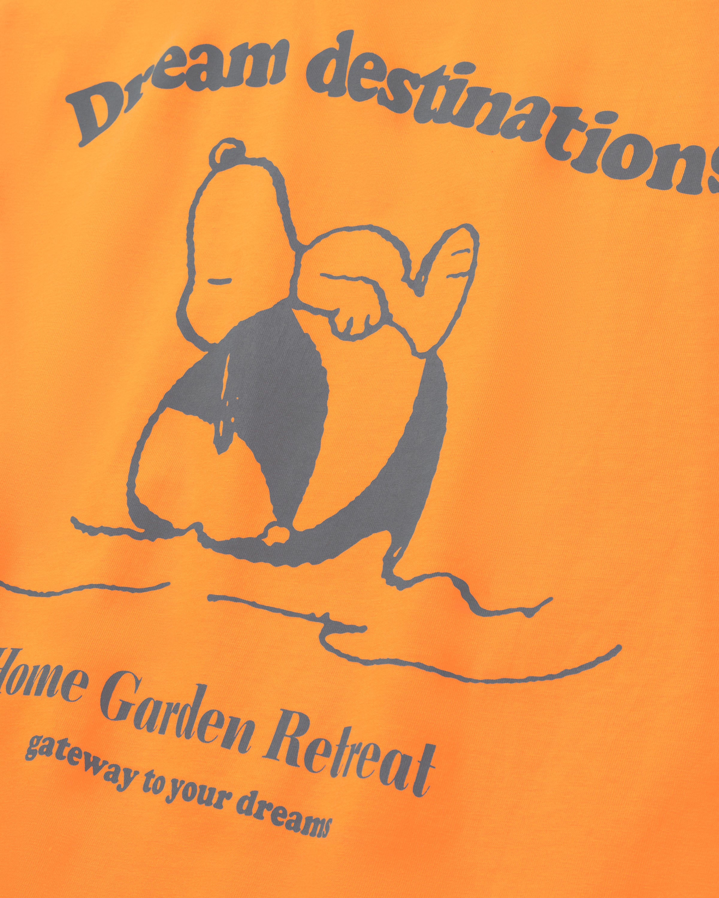 Au dos du t-shirt orange, Snoopy se détend sur les vagues. L'inscription « Dream Destinations » au dos et sur la poitrine gauche complète le design. De plus, le t-shirt est légèrement délavé, ce qui lui confère un look vintage estival.