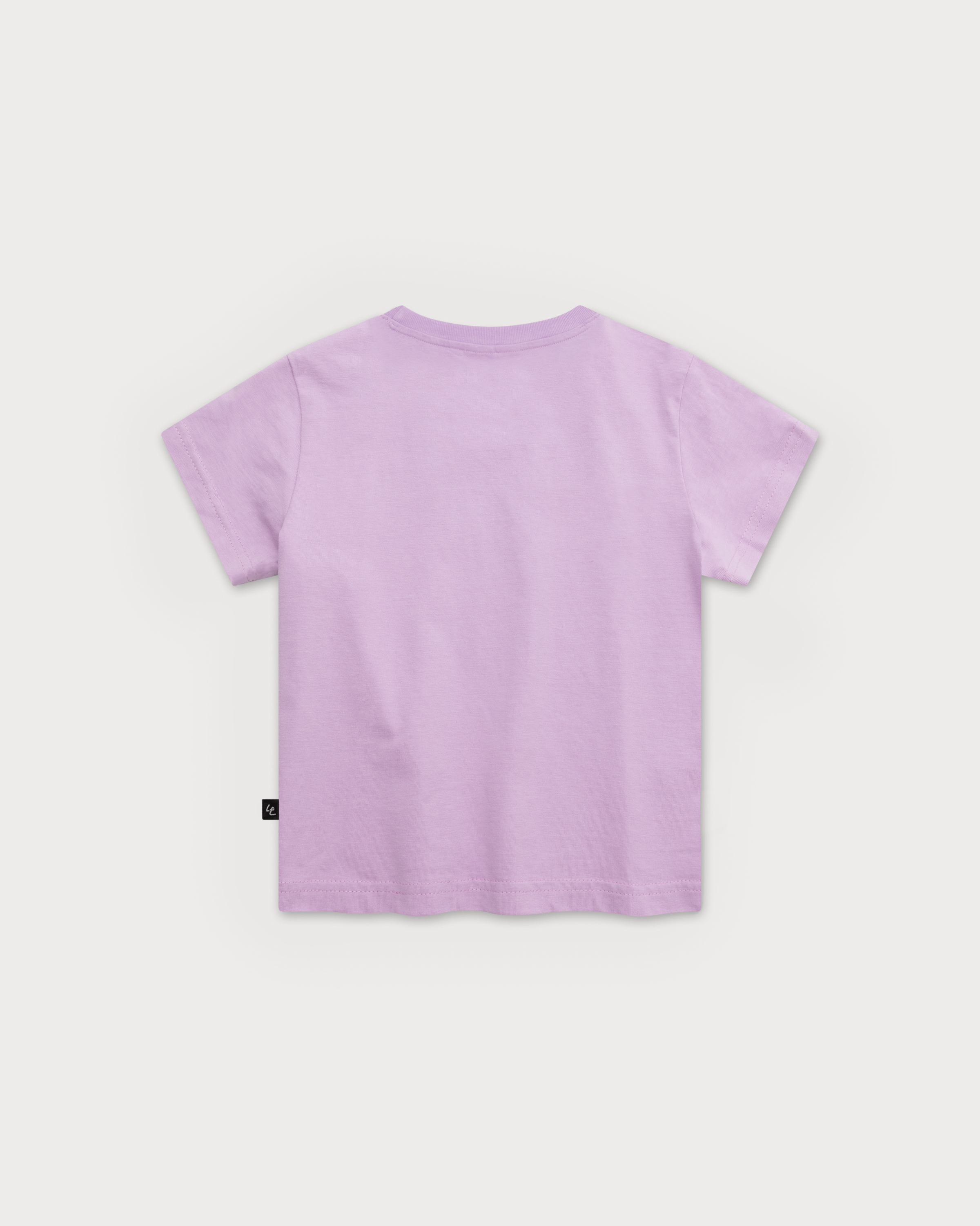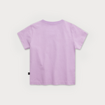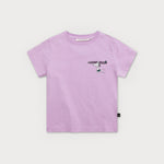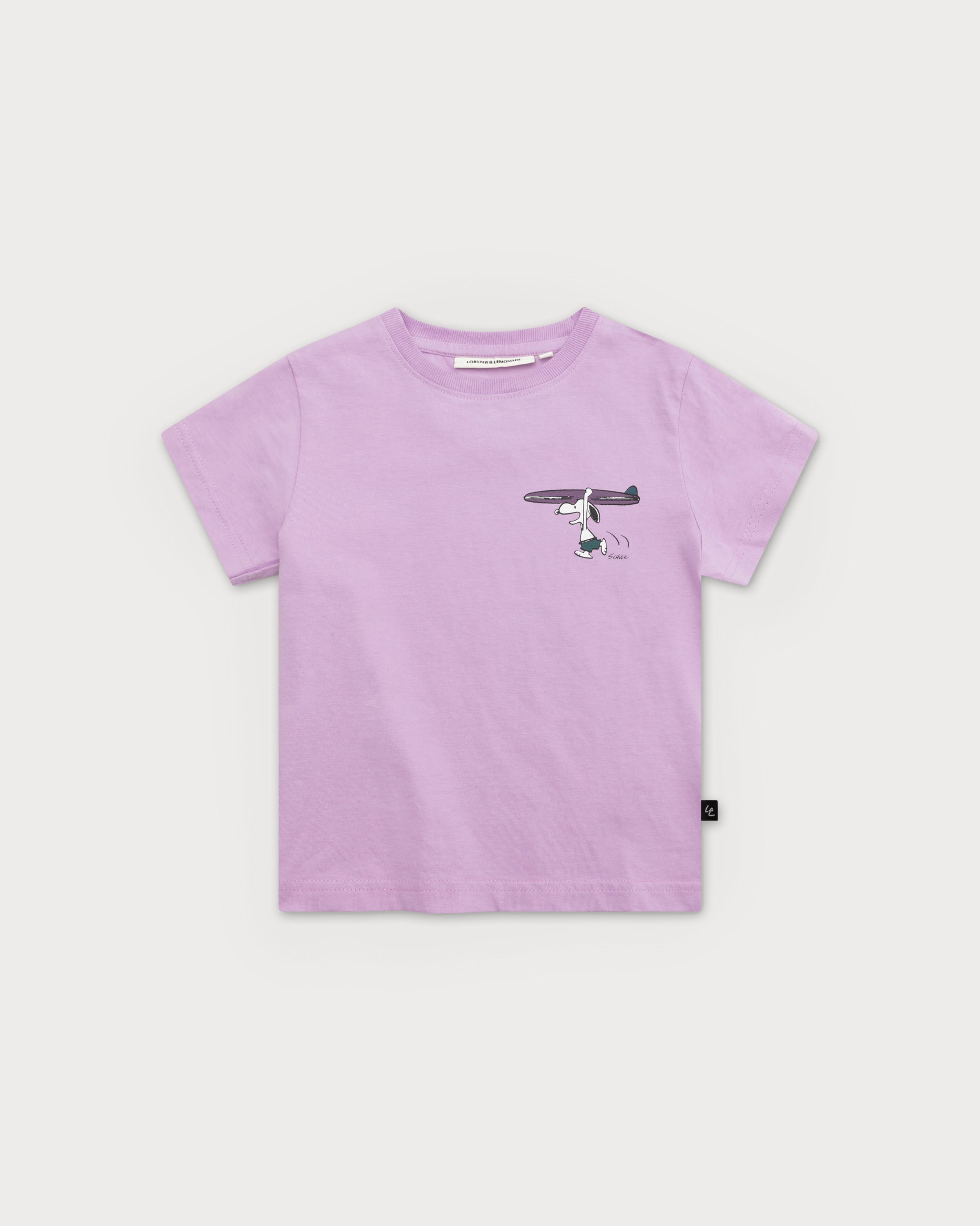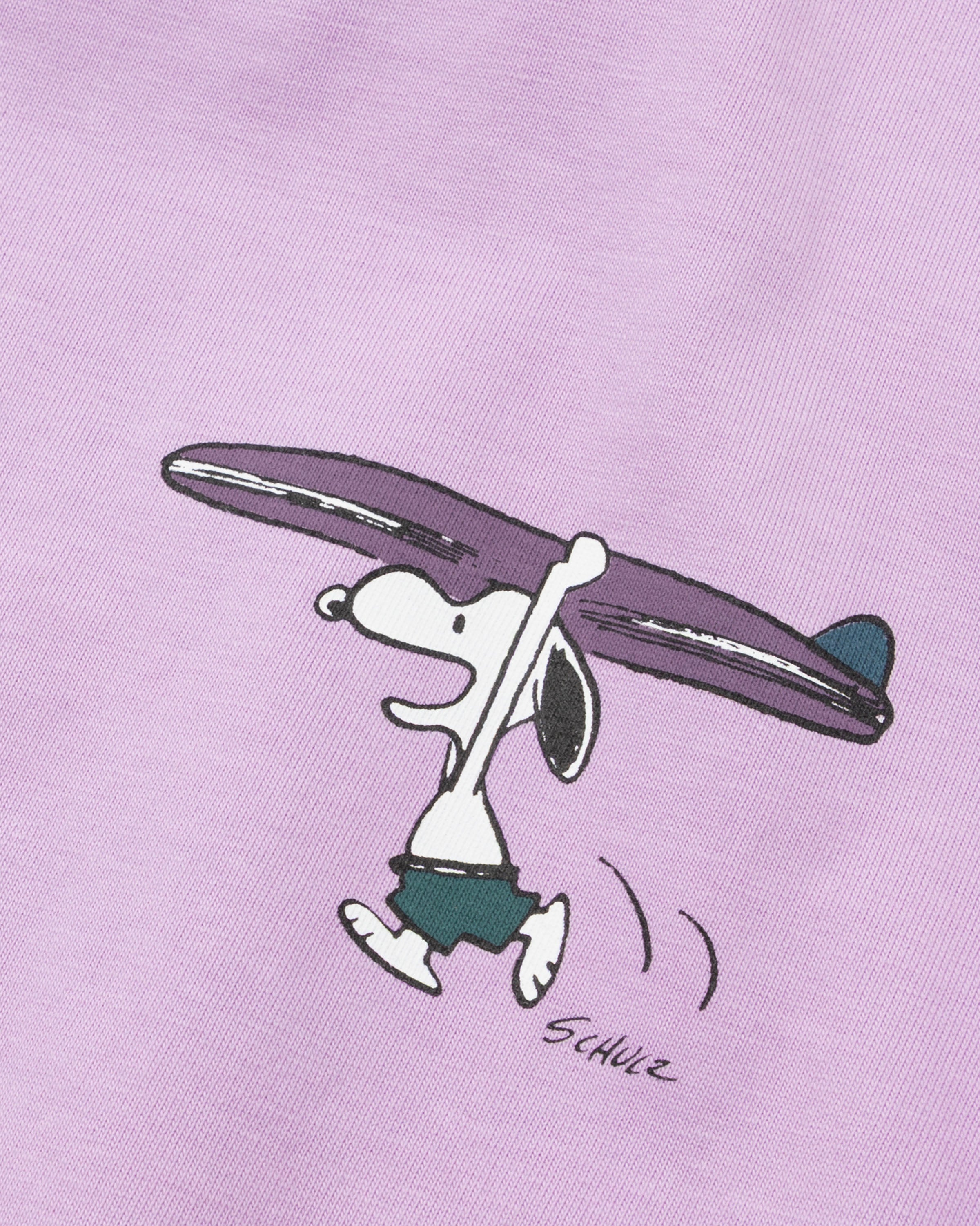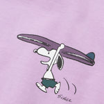 Le devant du t-shirt violet présente un petit imprimé de Snoopy courant avec enthousiasme, tenant une planche de surf au-dessus de sa tête.
