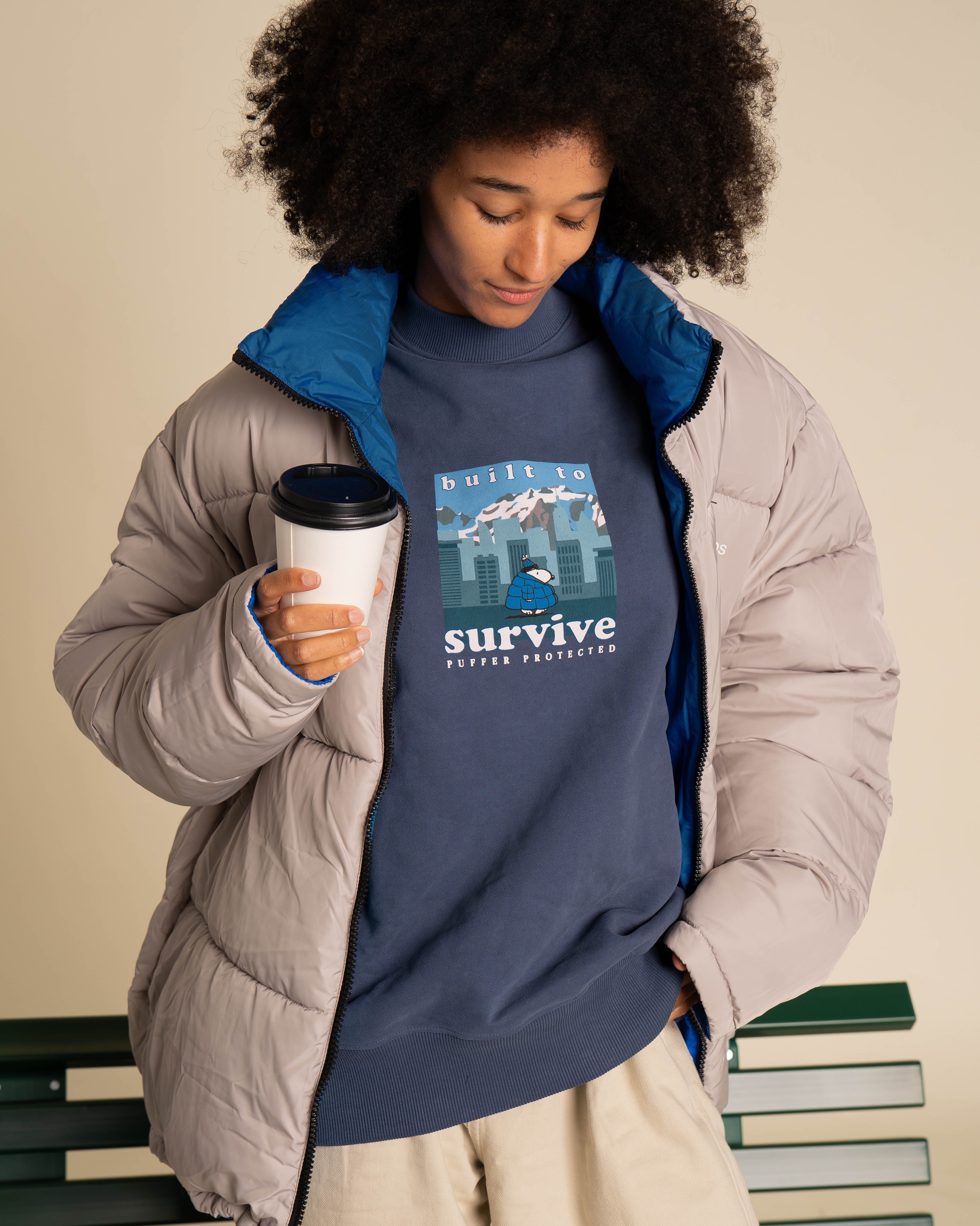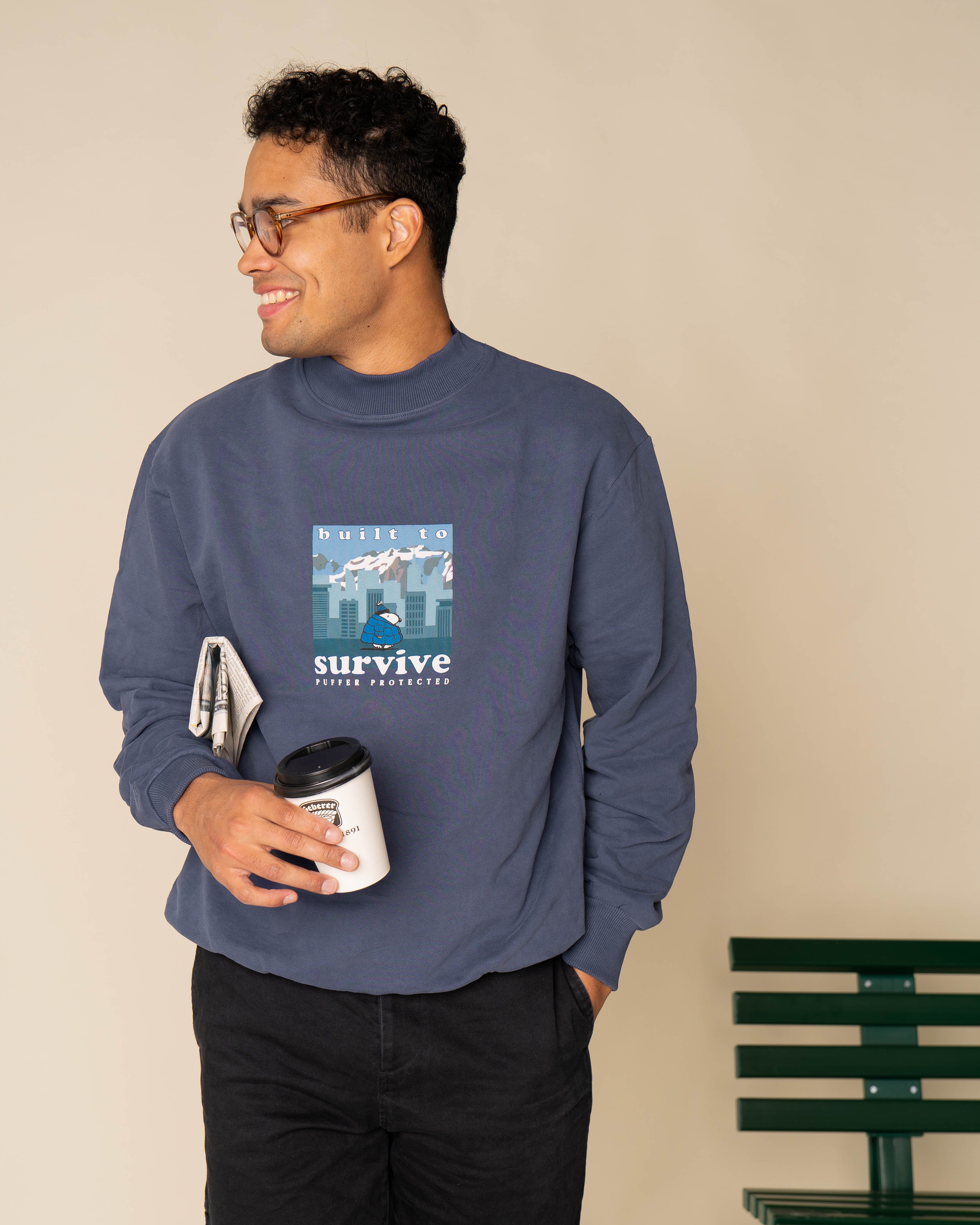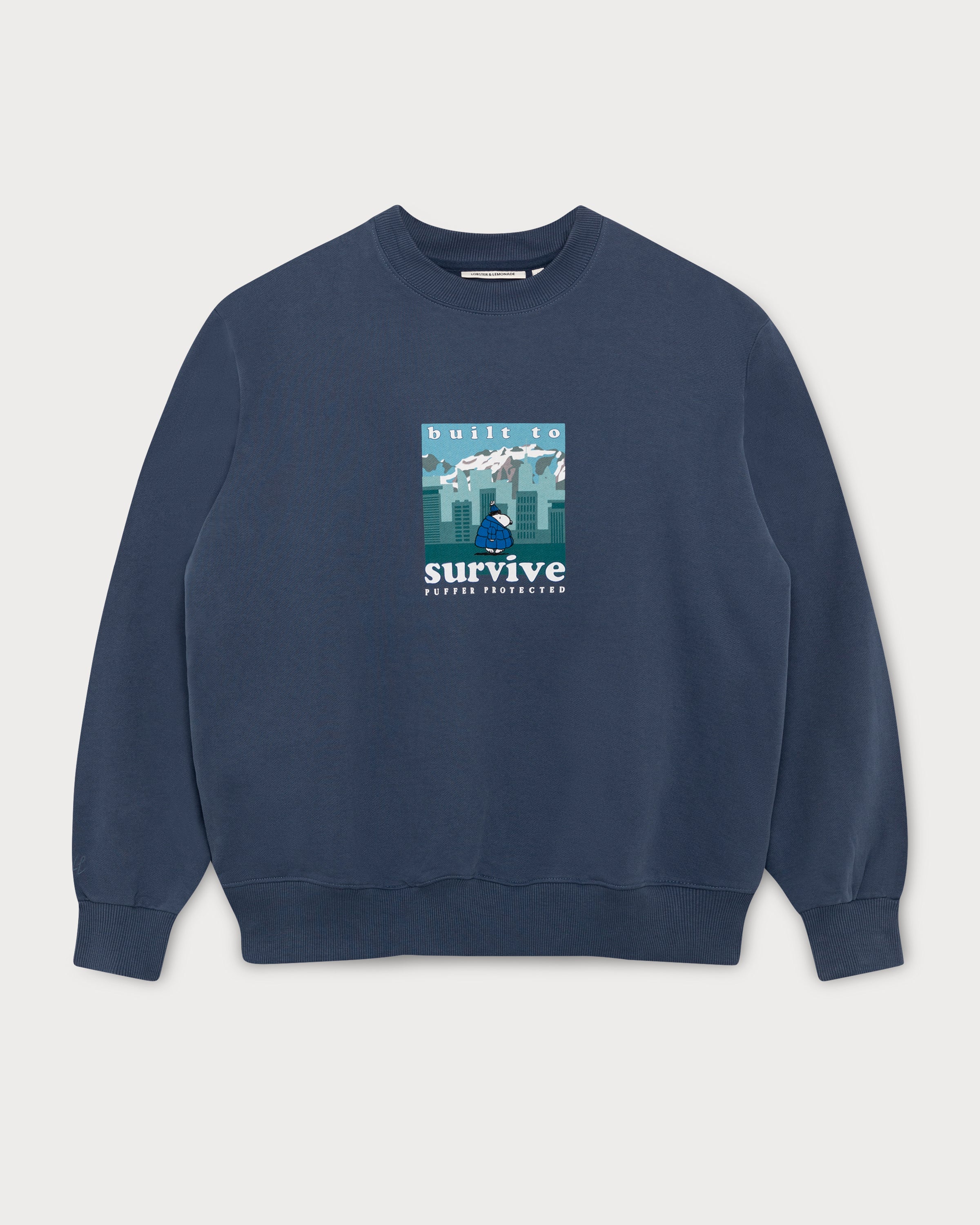 Ce pull bleu marine est parfait pour les journées d'hiver. Sur le devant, Snoopy est bien au chaud dans un environnement froid. Le slogan « Build to Survive » complète le look.