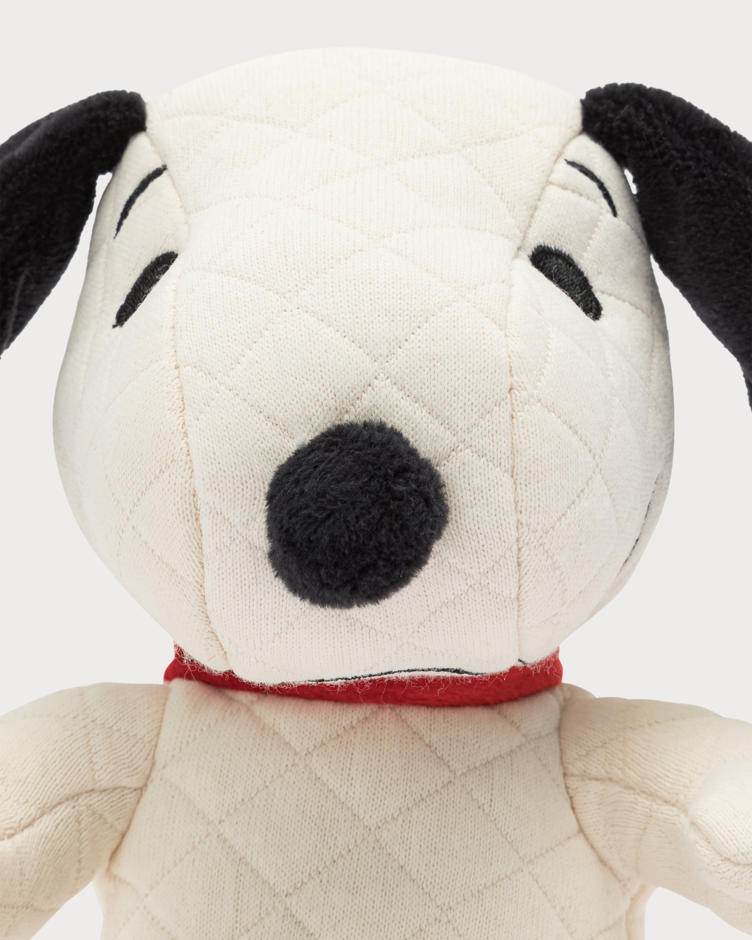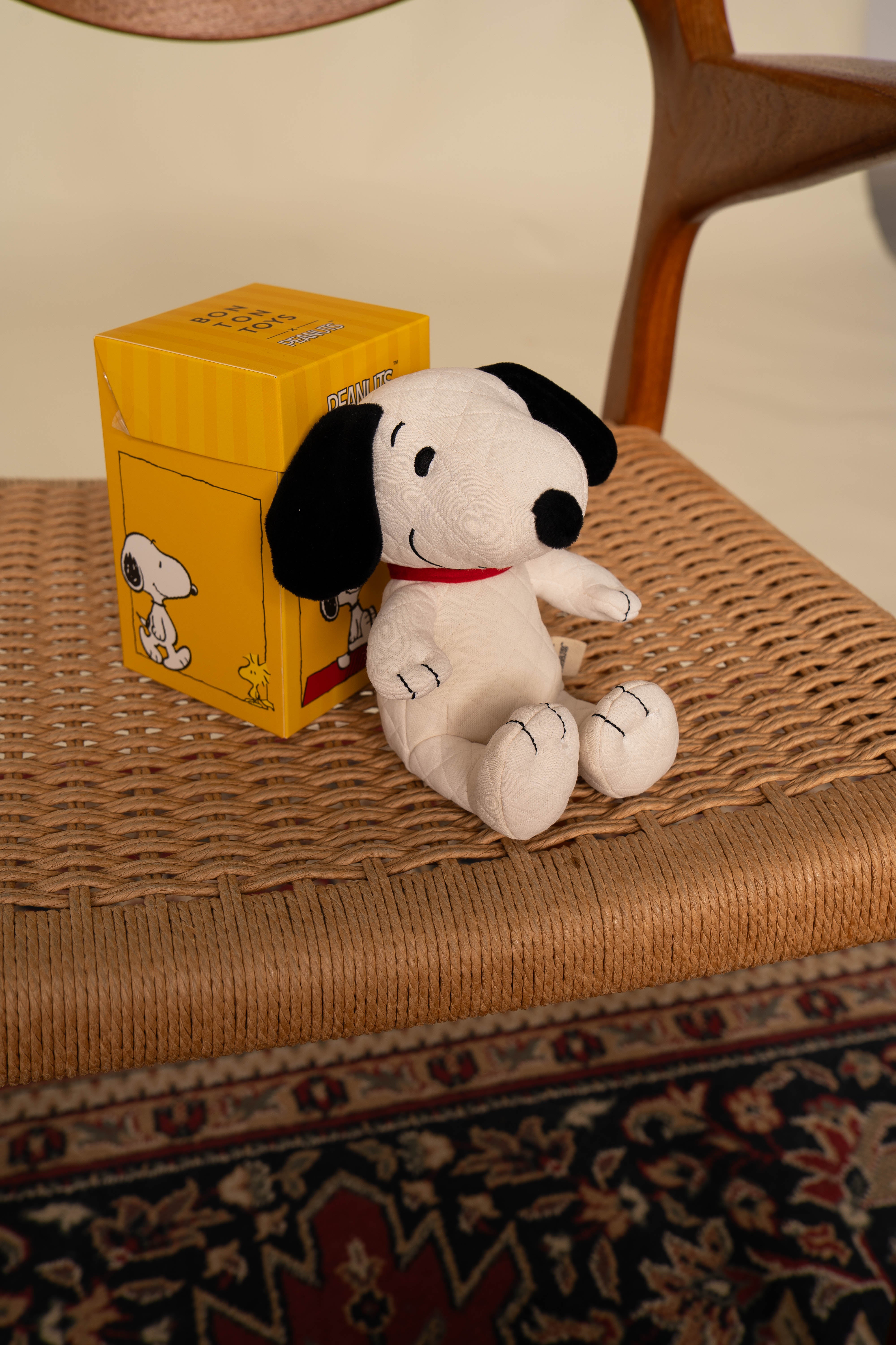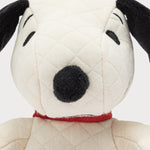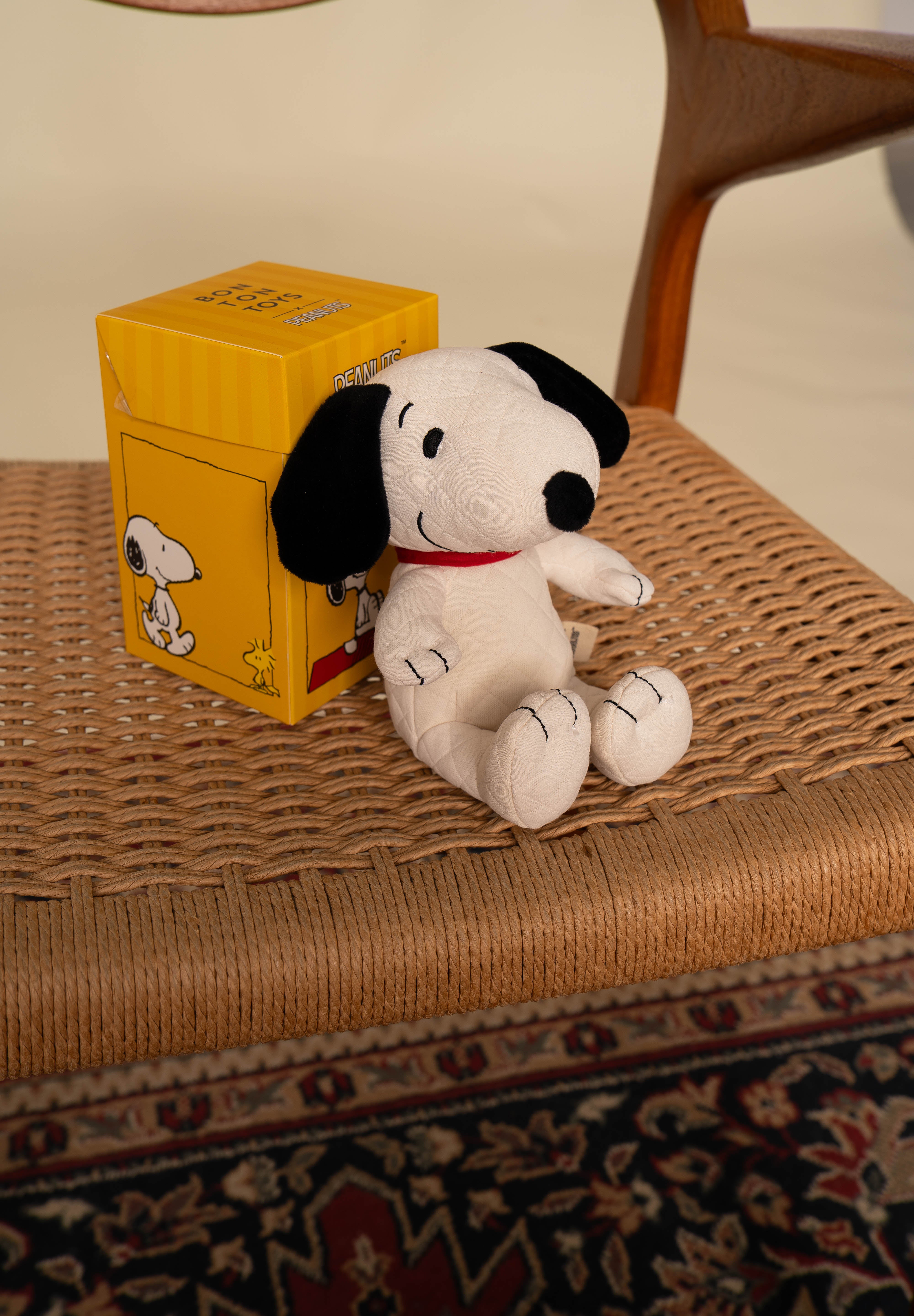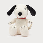 Peluche Snoopy au visage brodé. Assise, elle mesure 15 cm et est livrée dans un coffret cadeau.
