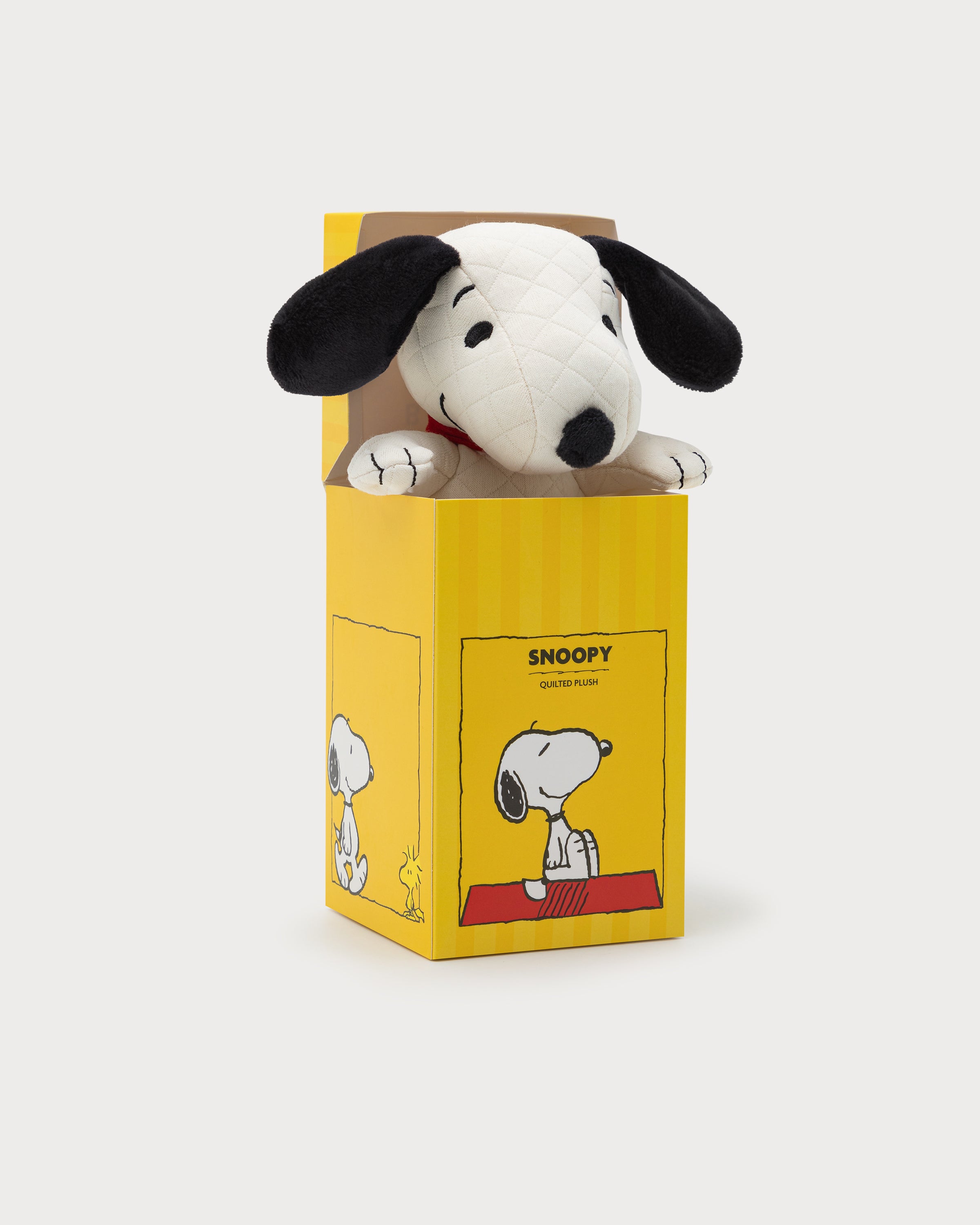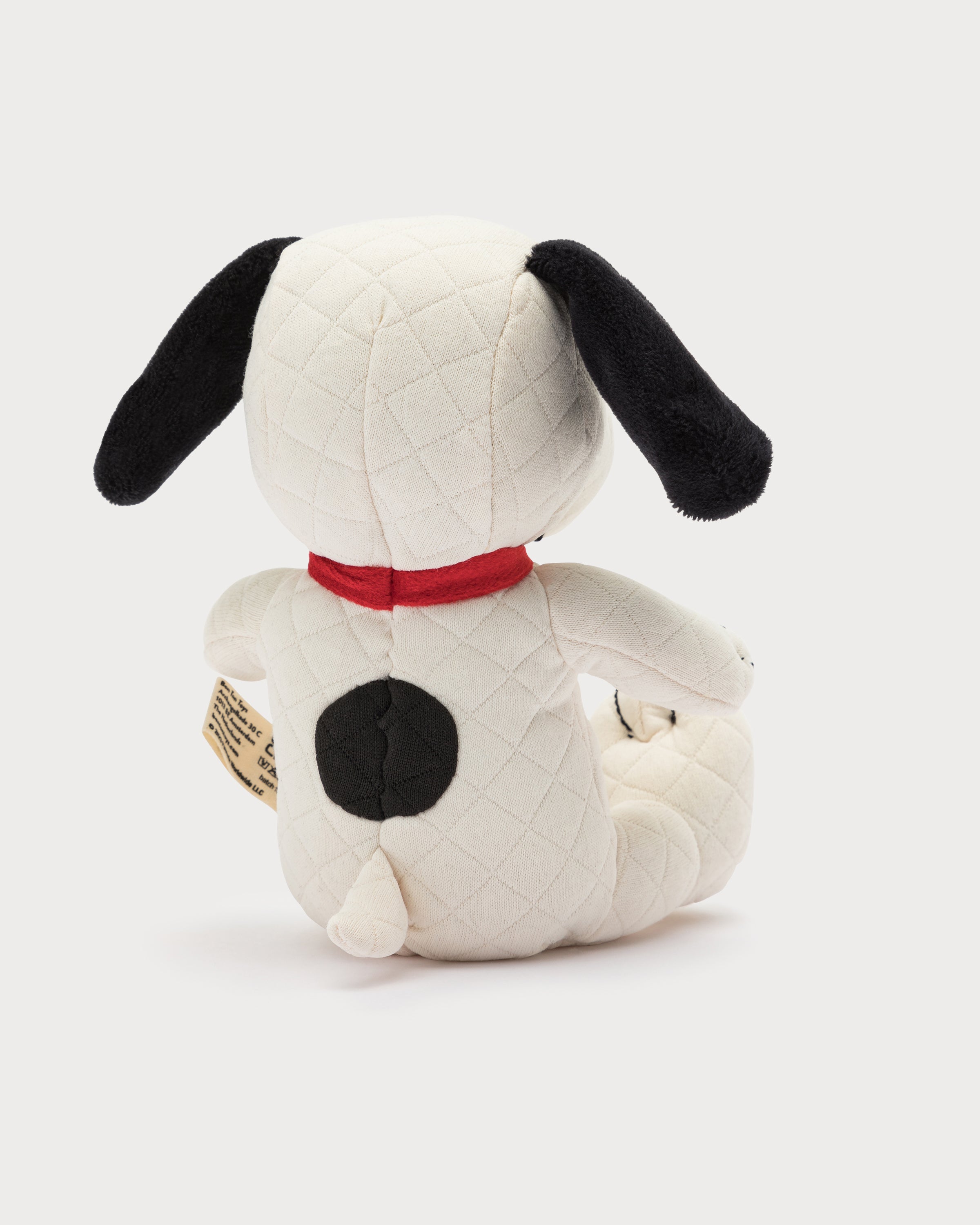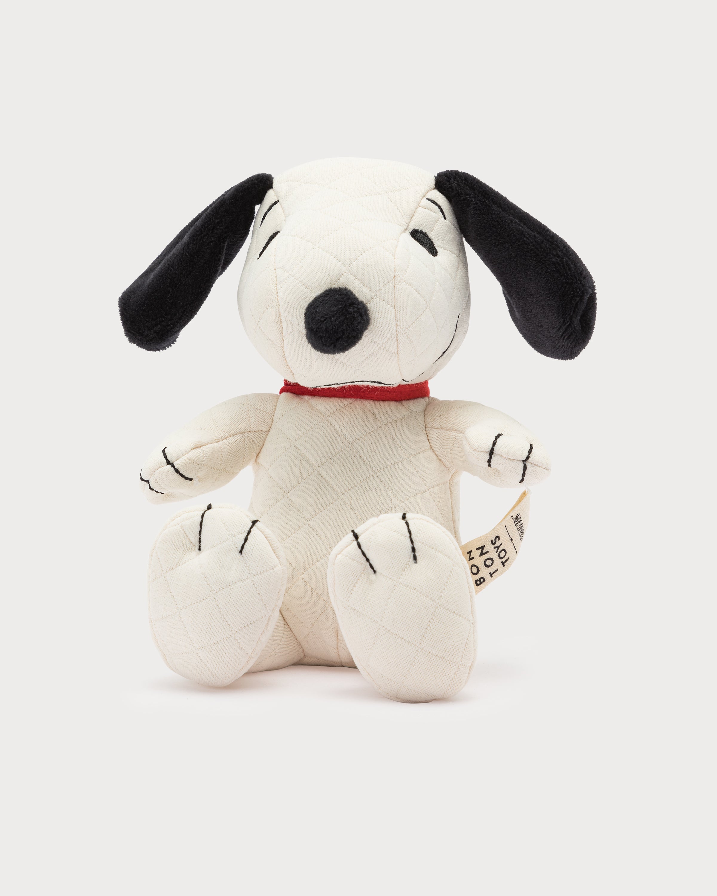 Peluche Snoopy au visage brodé. Assise, elle mesure 15 cm et est livrée dans un coffret cadeau.