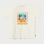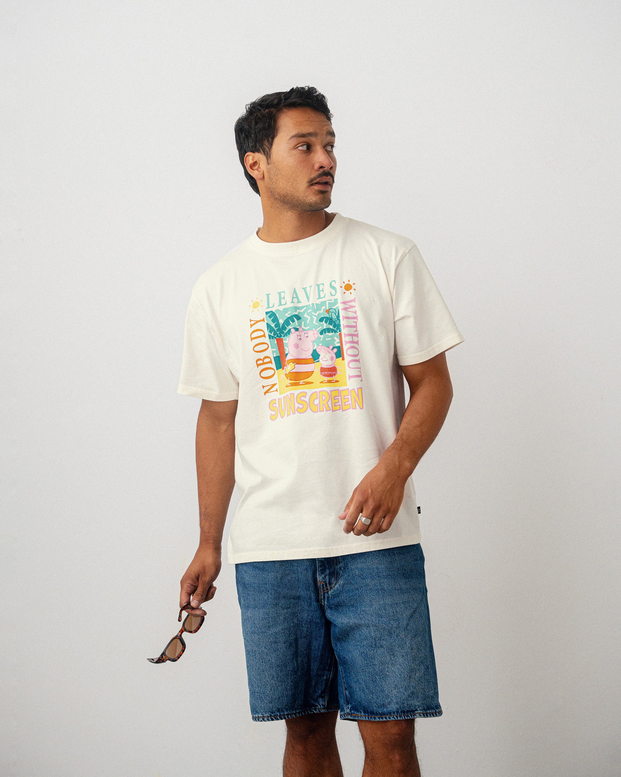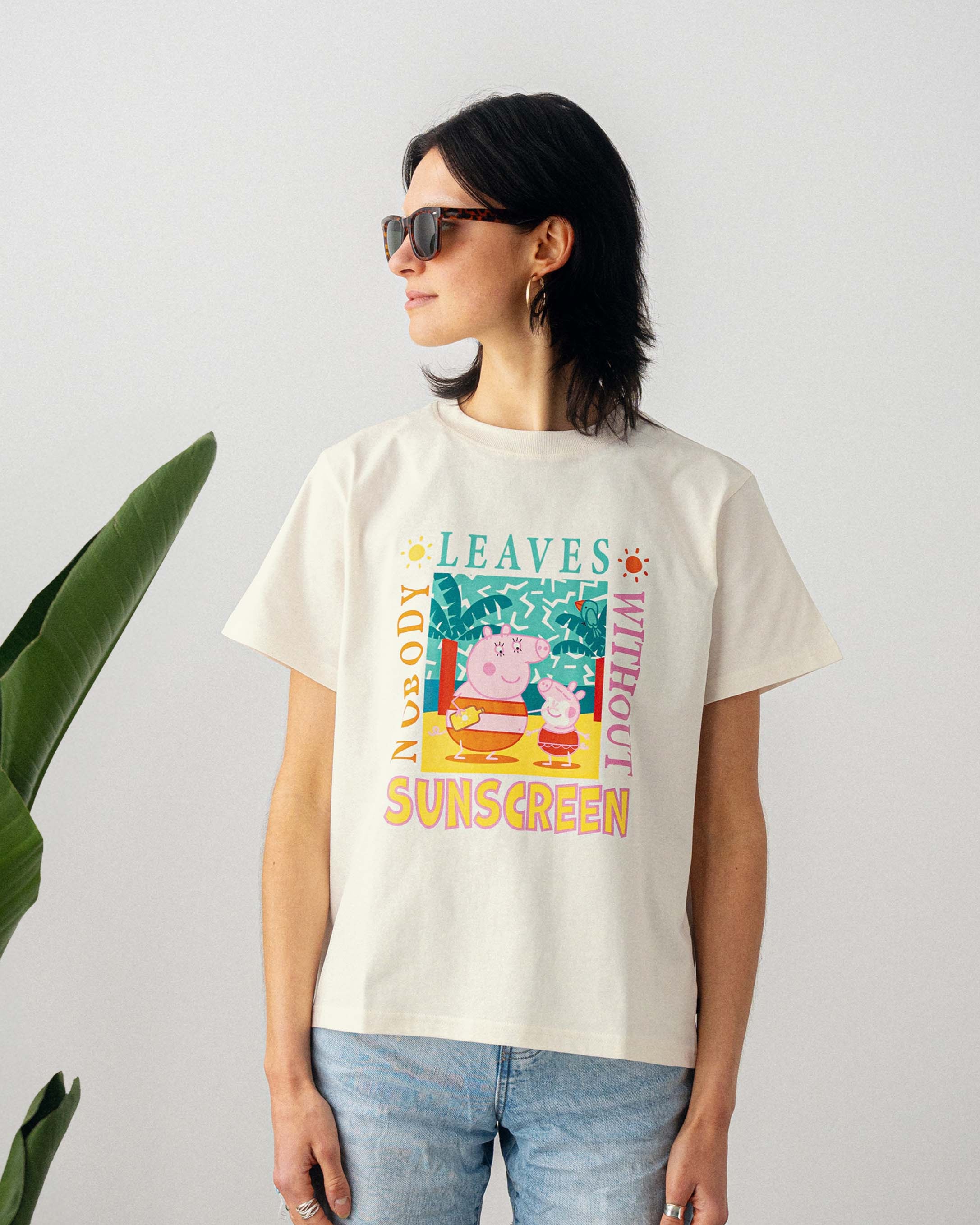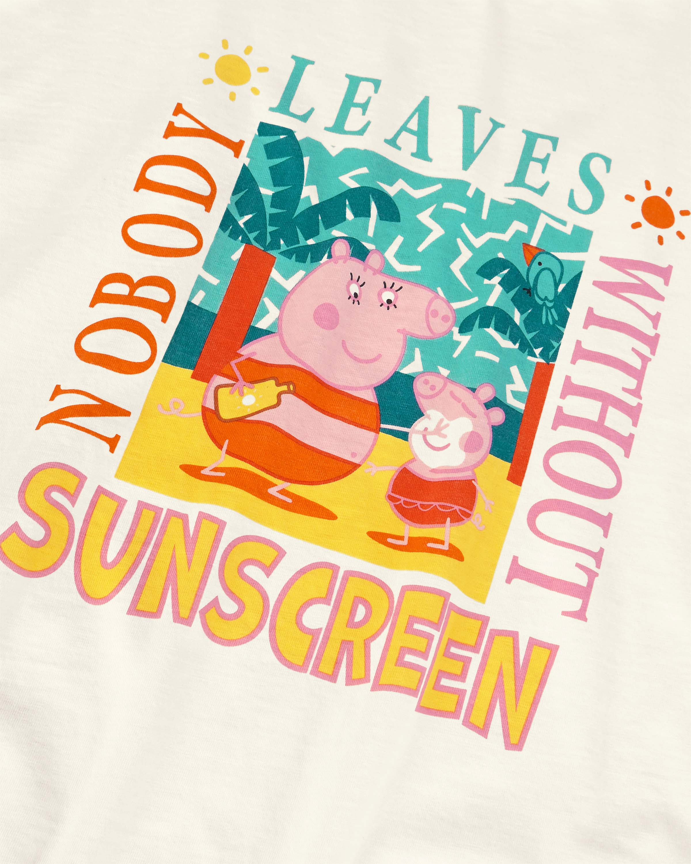 L'imprimé sur le devant représente Maman Pig appliquant de la crème solaire sur Peppa. Le slogan « Personne ne part sans crème solaire » complète le style estival.