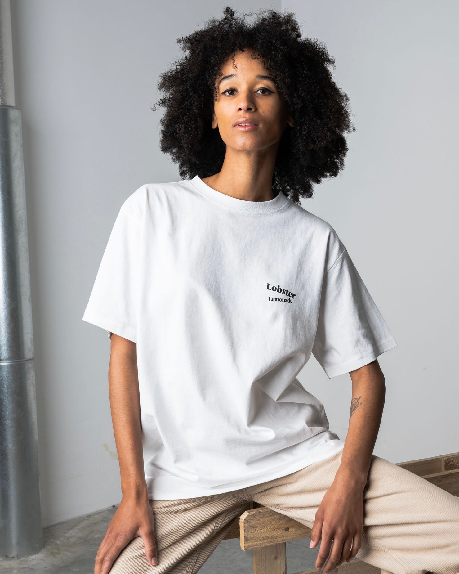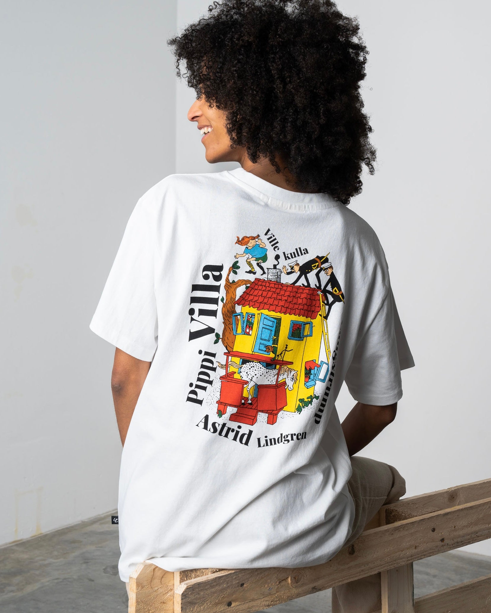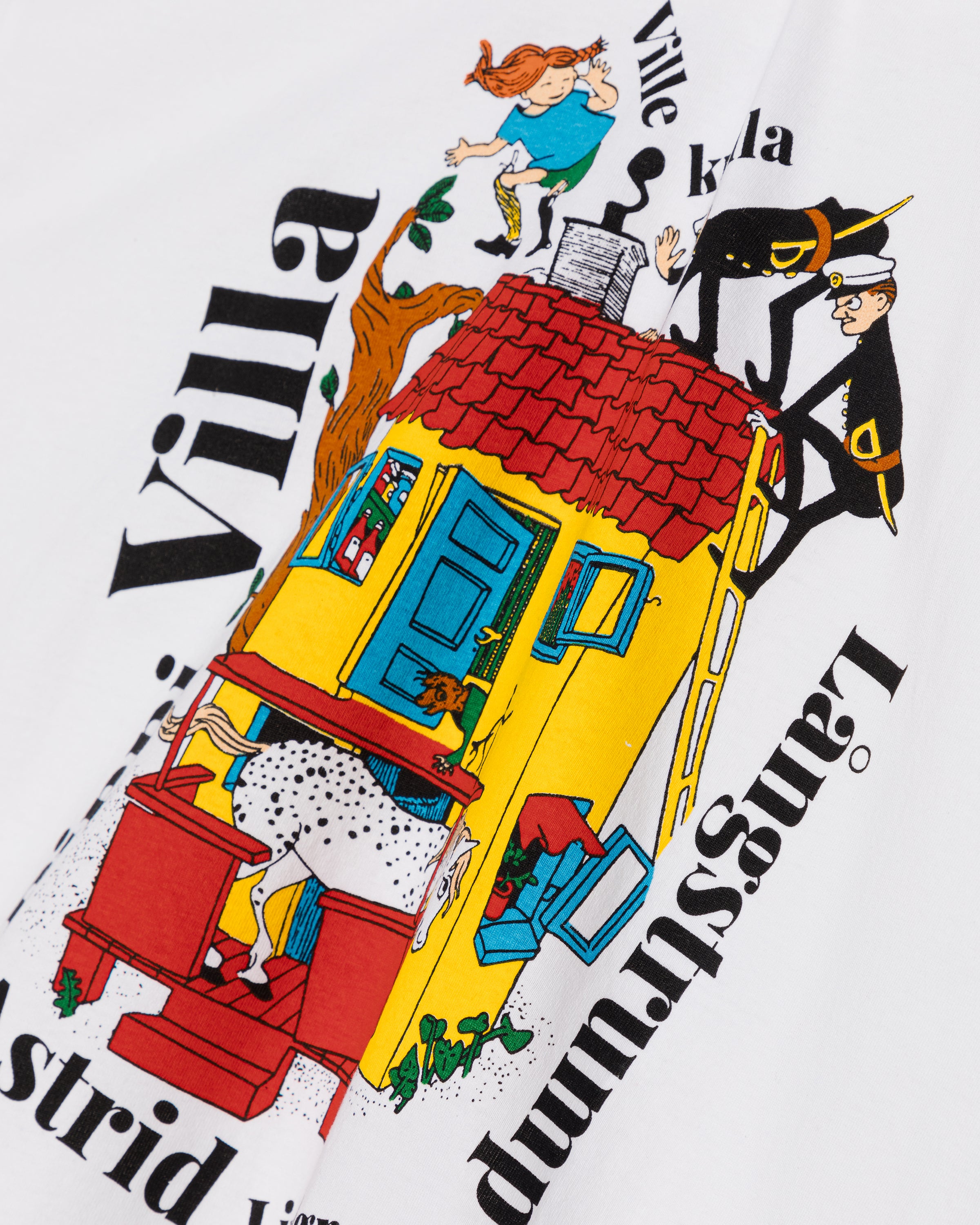 Ce t-shirt blanc en coton open-end met en scène la Villa Villekulla, avec Fifi Brindacier et ses amis, sur un grand imprimé coloré au dos. L'inscription ludique « Lobster Lemonade » sur le devant apporte une touche subtile. Avec la collection Långstrump, nous transposons l'univers coloré de Fifi Brindacier en streetwear moderne. Jasmin mesure 1,75 m et porte une taille S.