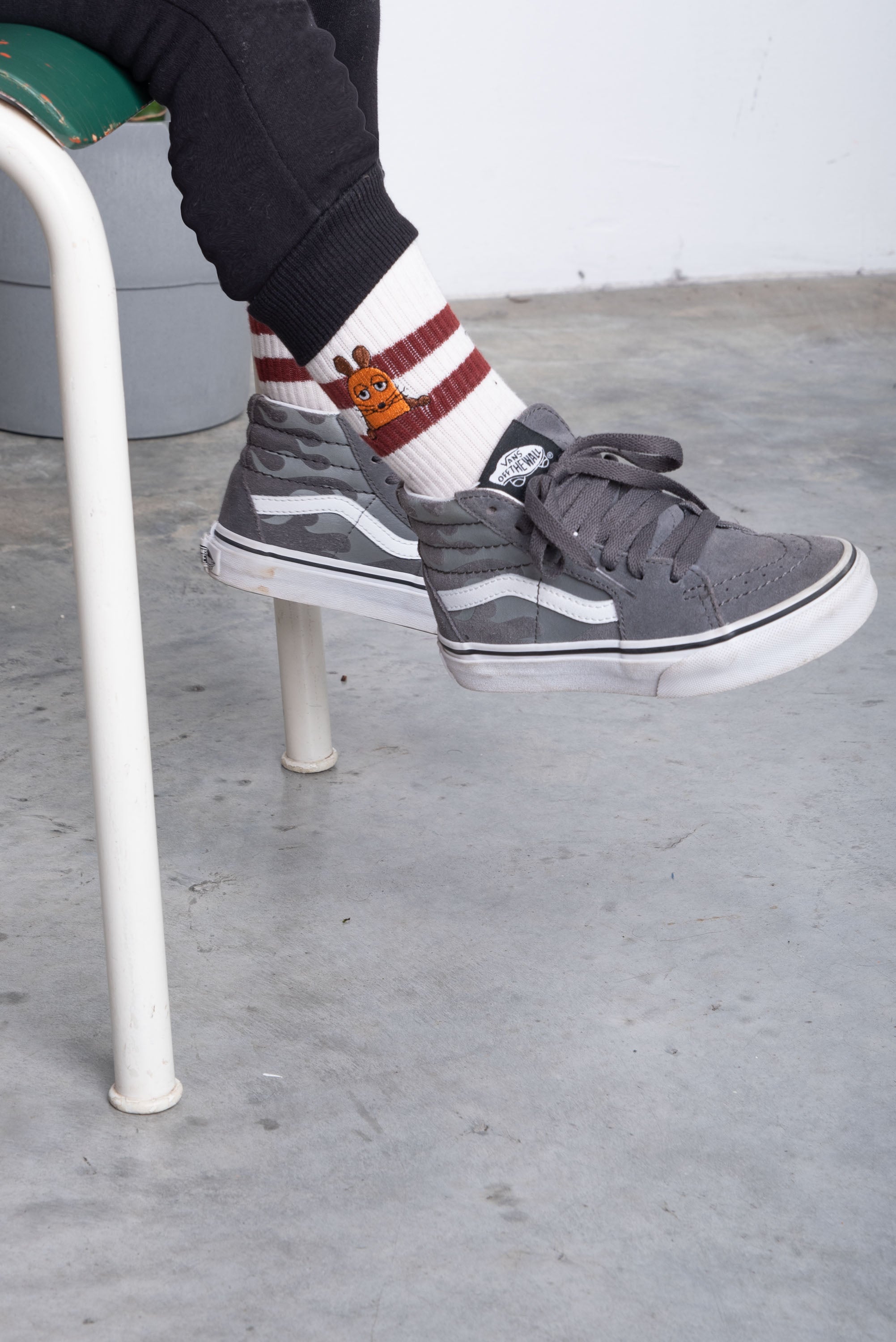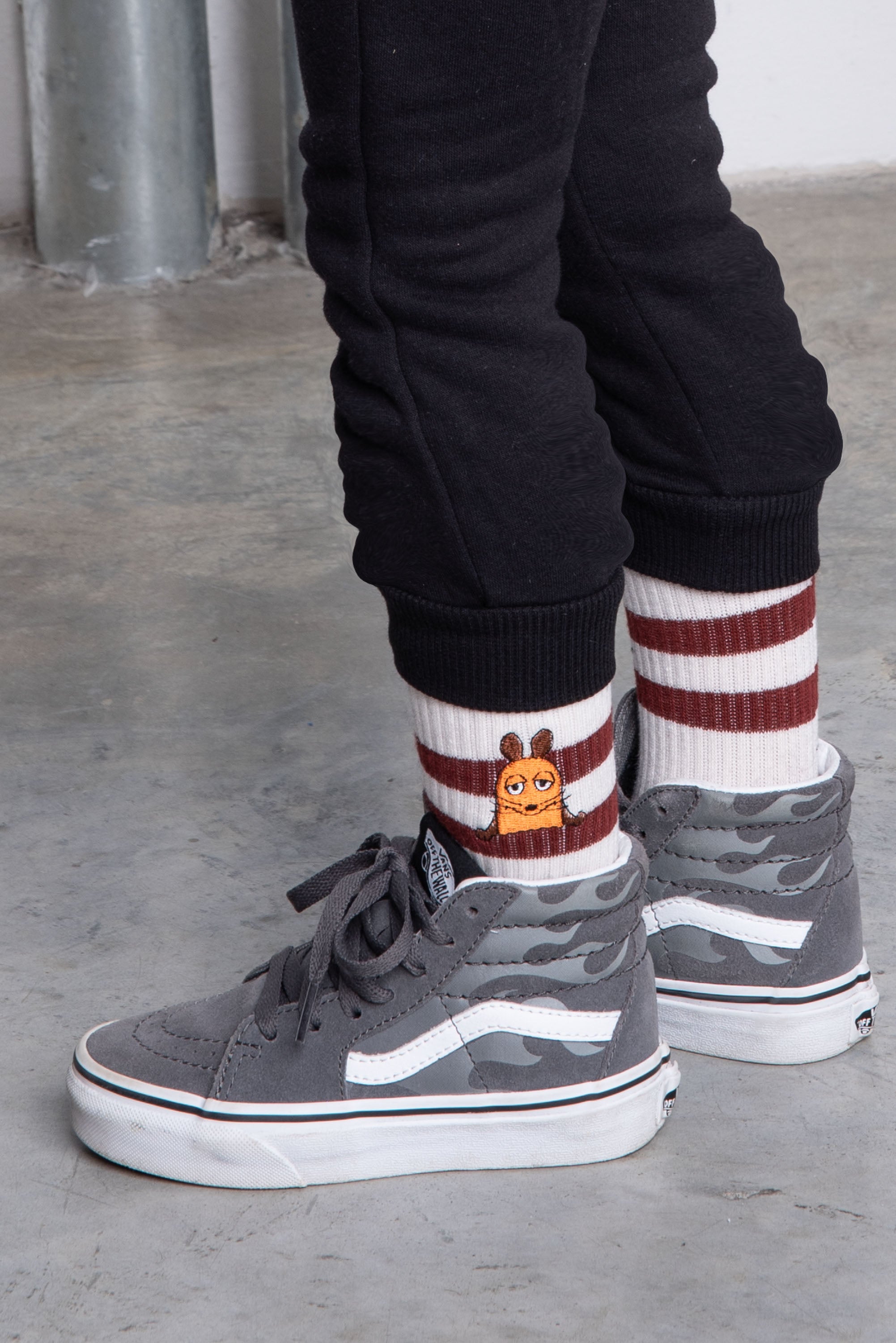 Ces chaussettes de sport couleur crème arborent un design classique à rayures bordeaux. La souris qui se dessine entre elles les rend particulièrement attrayantes. Dans la collection Souris et ses amis, nous réinterprétons des personnages célèbres des séries cultes « L'Envoyé de la Souris » et « Le Petit Maulwurf » pour un look streetwear moderne.
