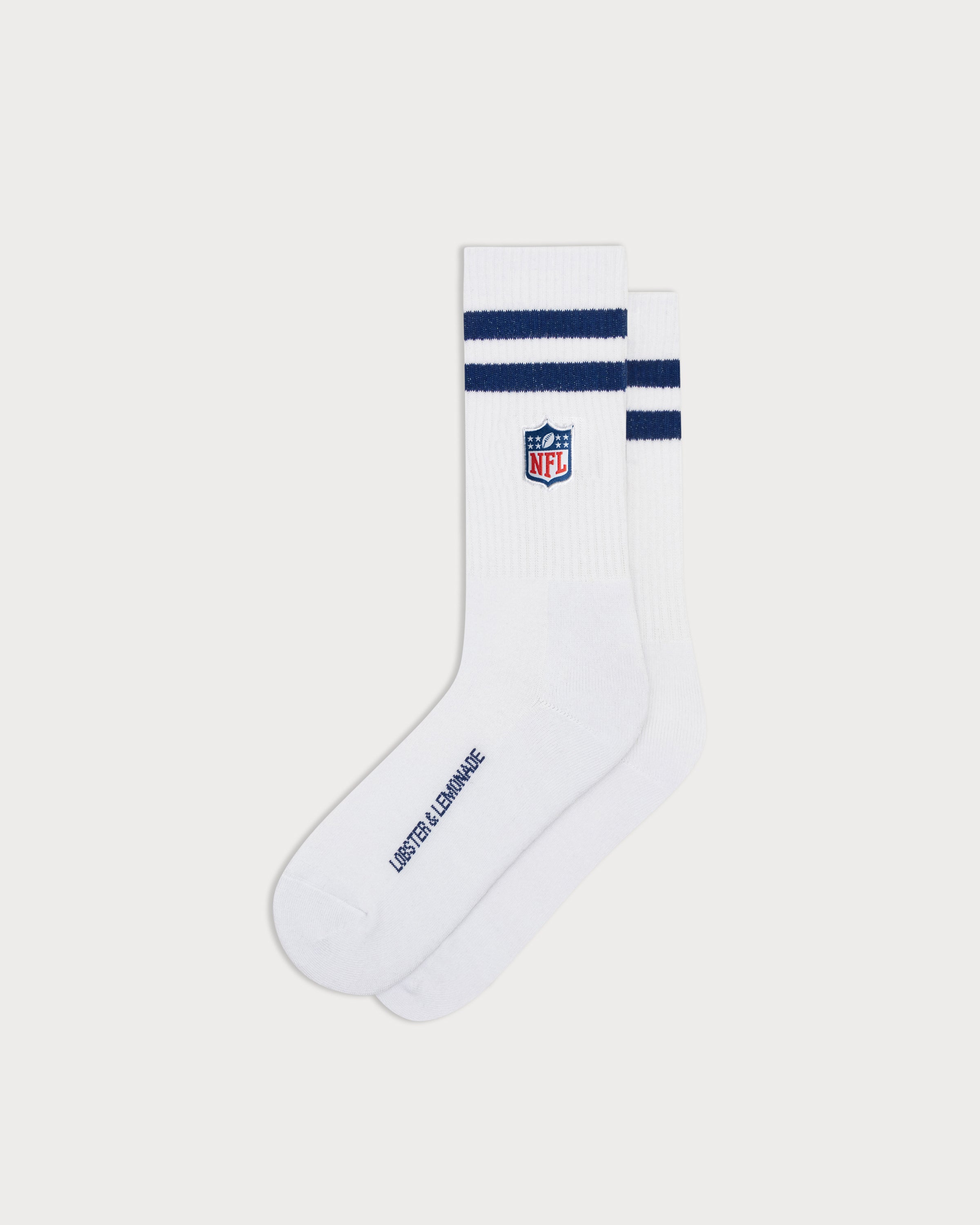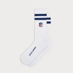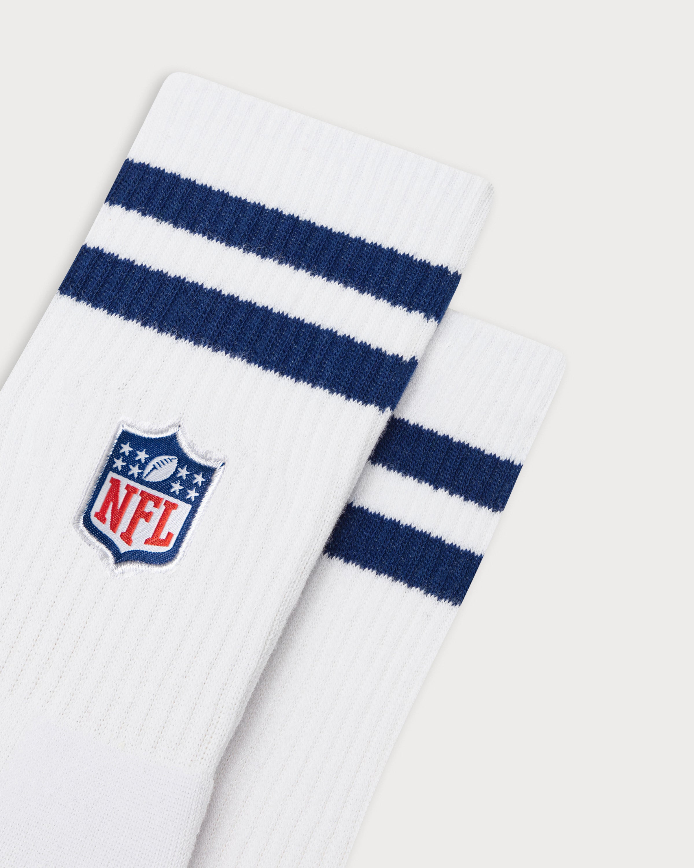 Ces chaussettes de sport blanches arborent des rayures bleu marine sous le revers. Le logo NFL, une étiquette tissée au-dessus de la cheville, complète leur look sportif.