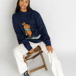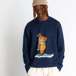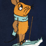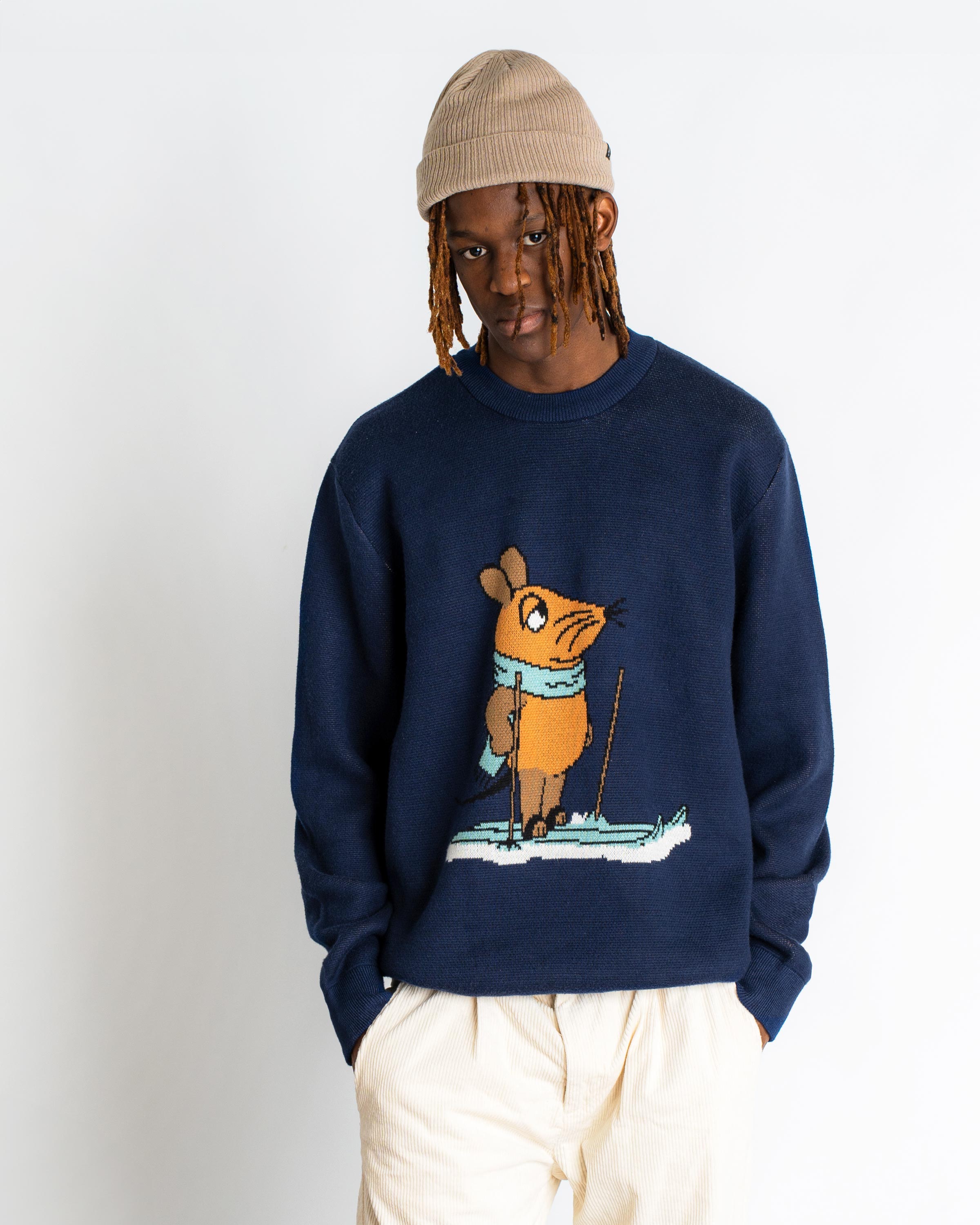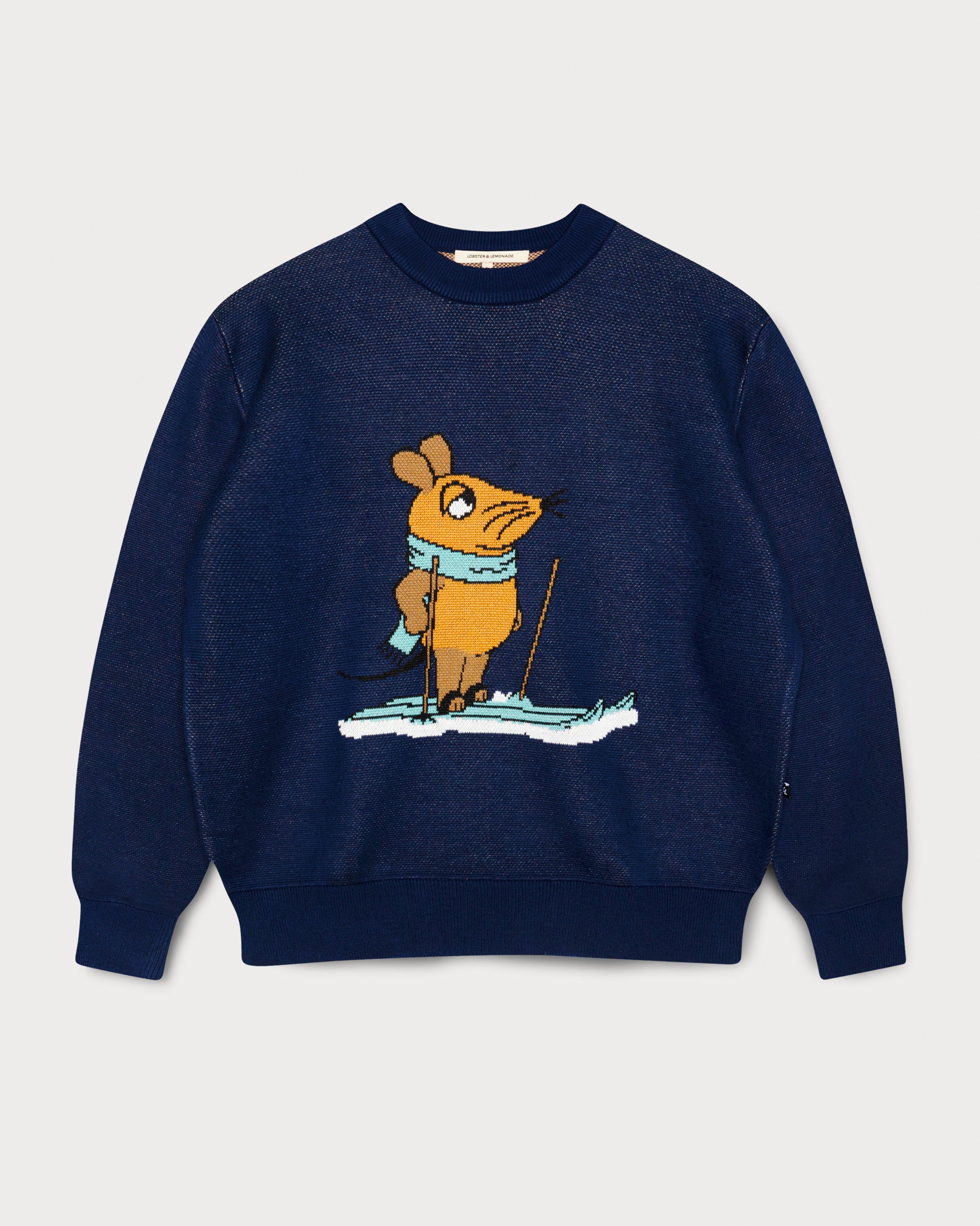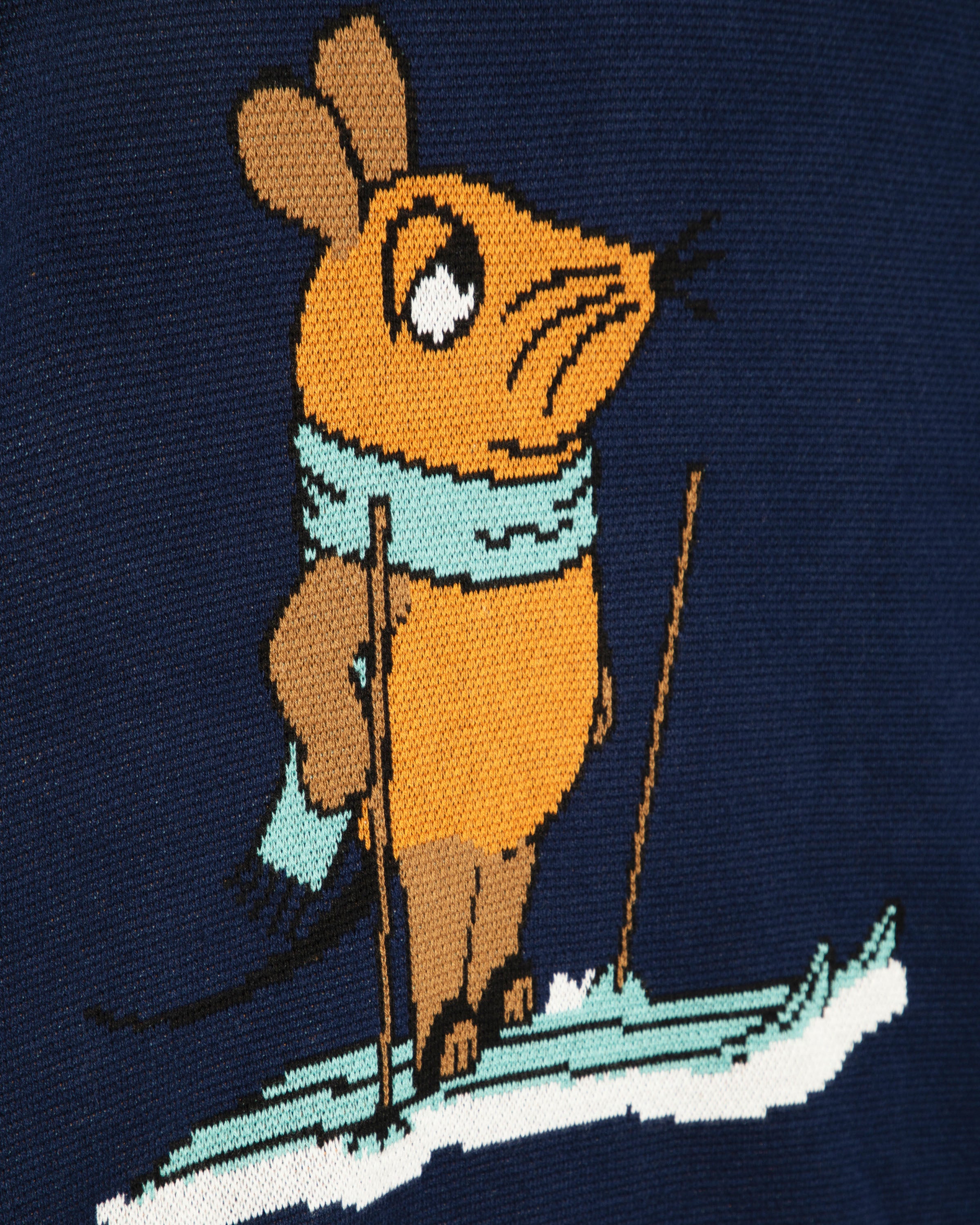 Ce pull en maille bleu foncé à la coupe décontractée arbore un grand motif jacquard représentant « La Souris » sur des skis. Son mélange coton-acrylique épais garde le pull bien au chaud et offre un confort optimal. La collection Souris et ses amis revisite les personnages emblématiques des séries cultes « L'Envoyé de la Souris » et « Le Petit Maulwurf » pour un look streetwear moderne.