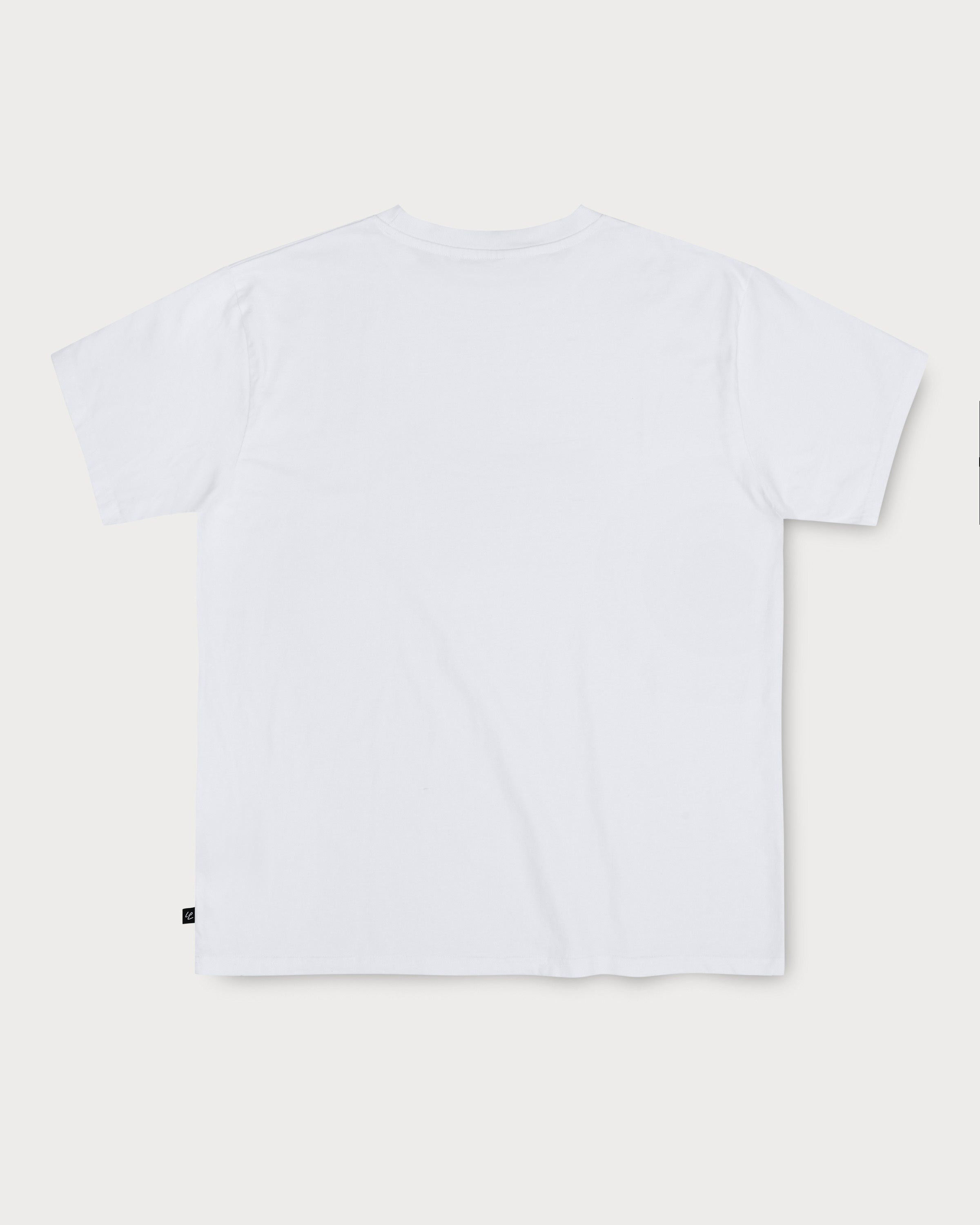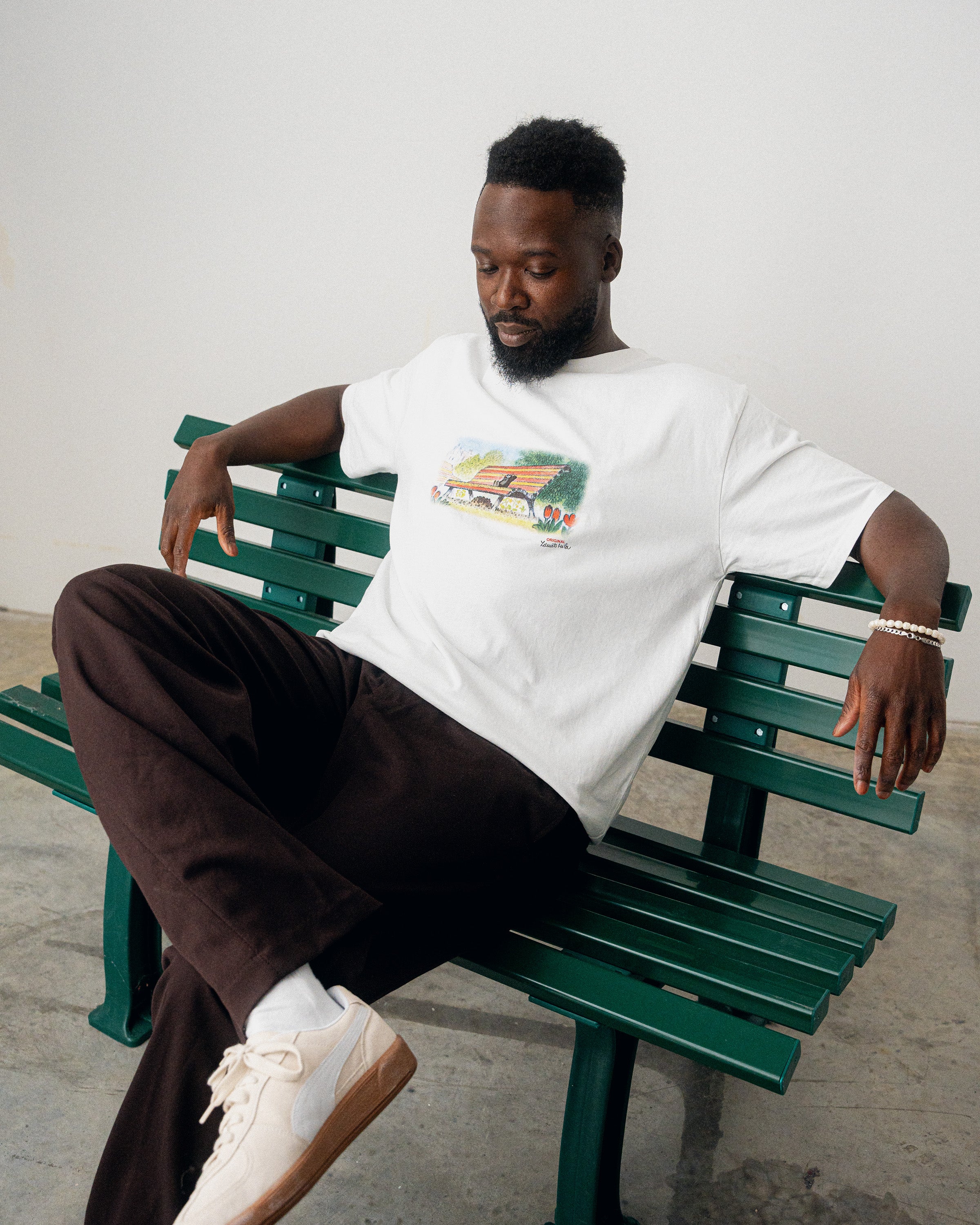 Le t-shirt présente une coupe carrée et pèse 240 g/m². Larry mesure 1,78 m et porte une taille L.