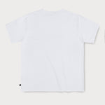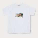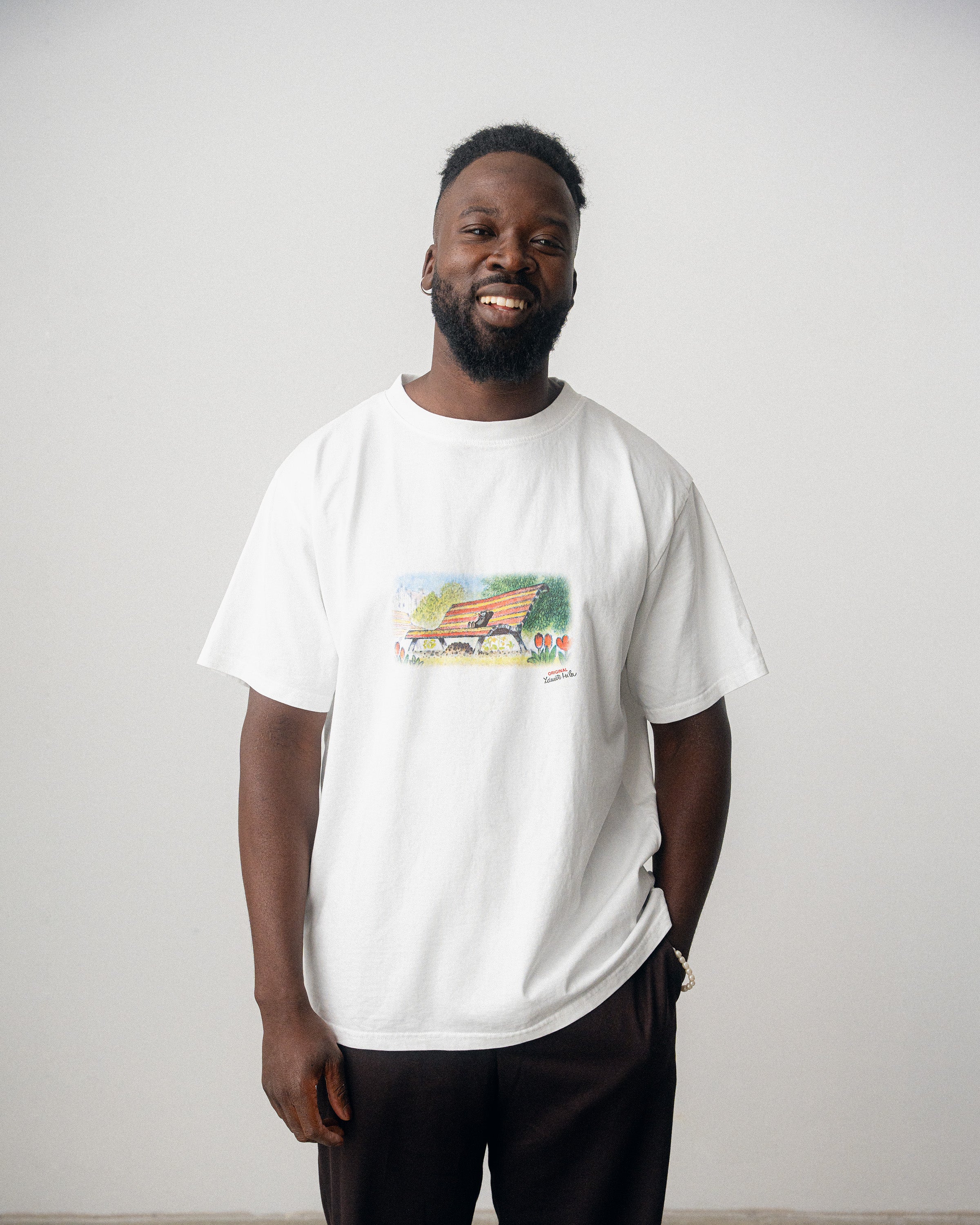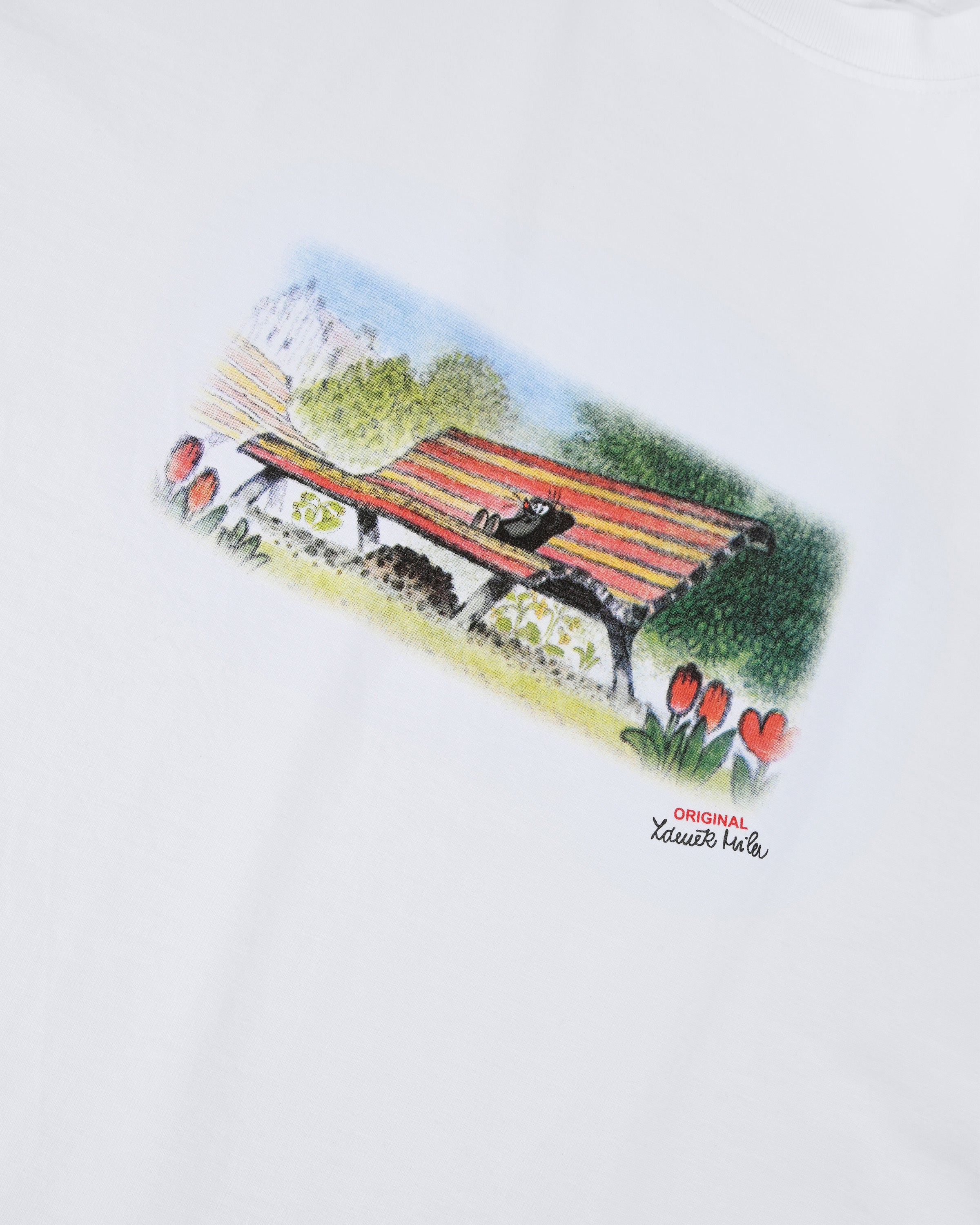 Le devant du T-shirt blanc montre Krtek visiblement détendu sur un banc de parc par une journée ensoleillée.
