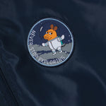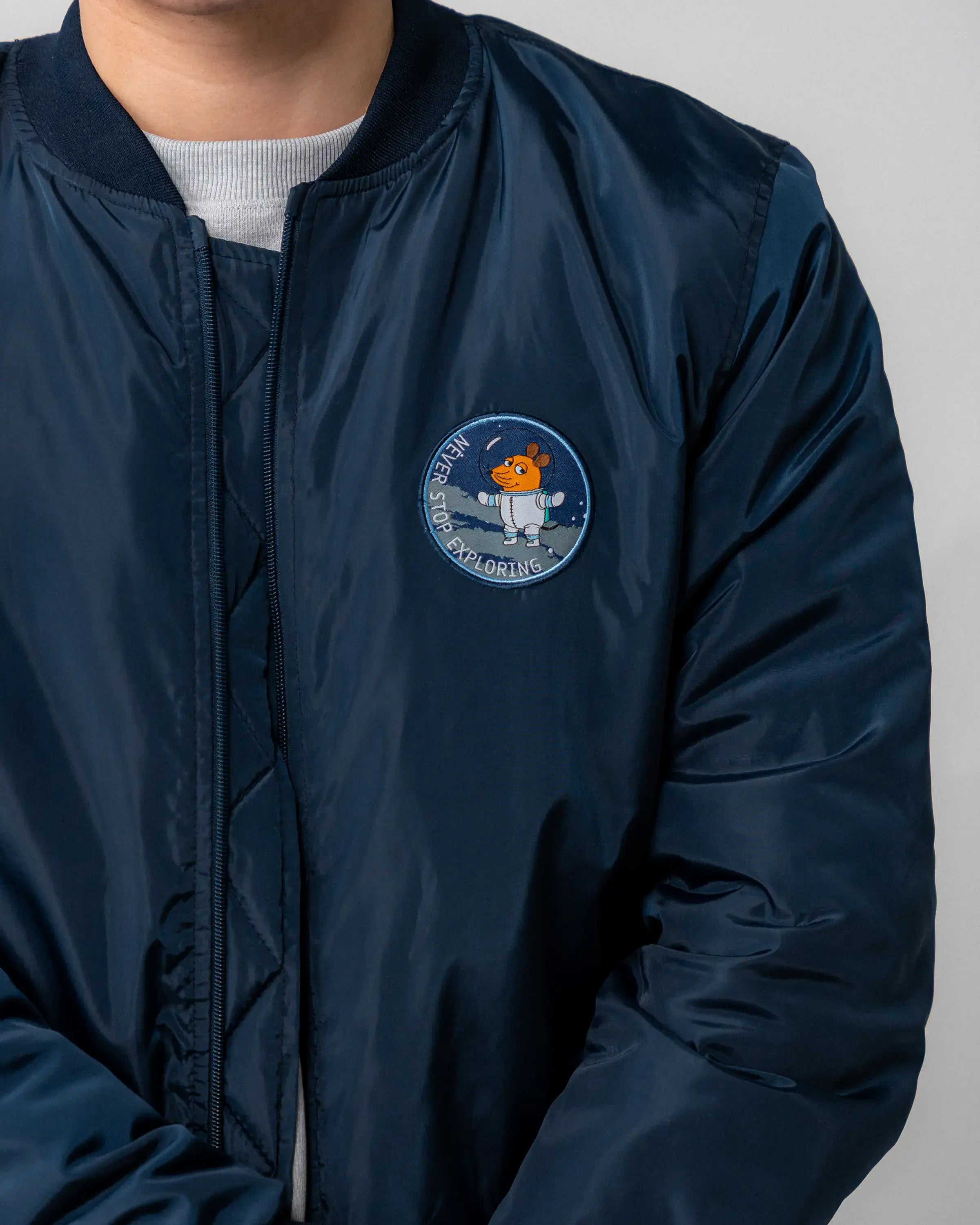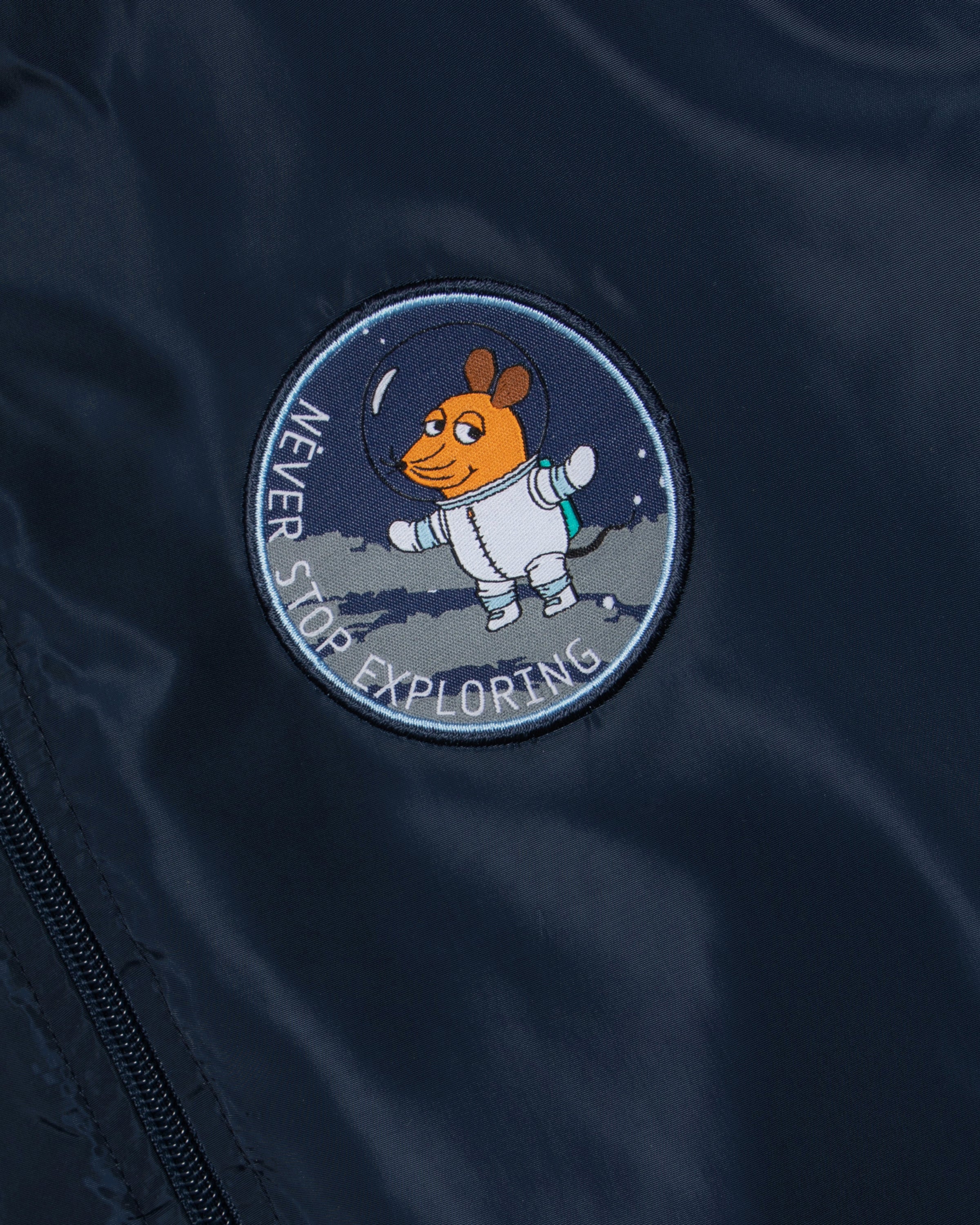 Le badge tissé "Never Stop Exploring" sur la poitrine, représentant la souris en combinaison d'astronaute, est le point fort de la veste bomber bleu marine. Un grand logo ESA imprimé sur la manche droite et un discret patch logo sur la manche gauche confèrent à la veste un look d'astronaute approprié.