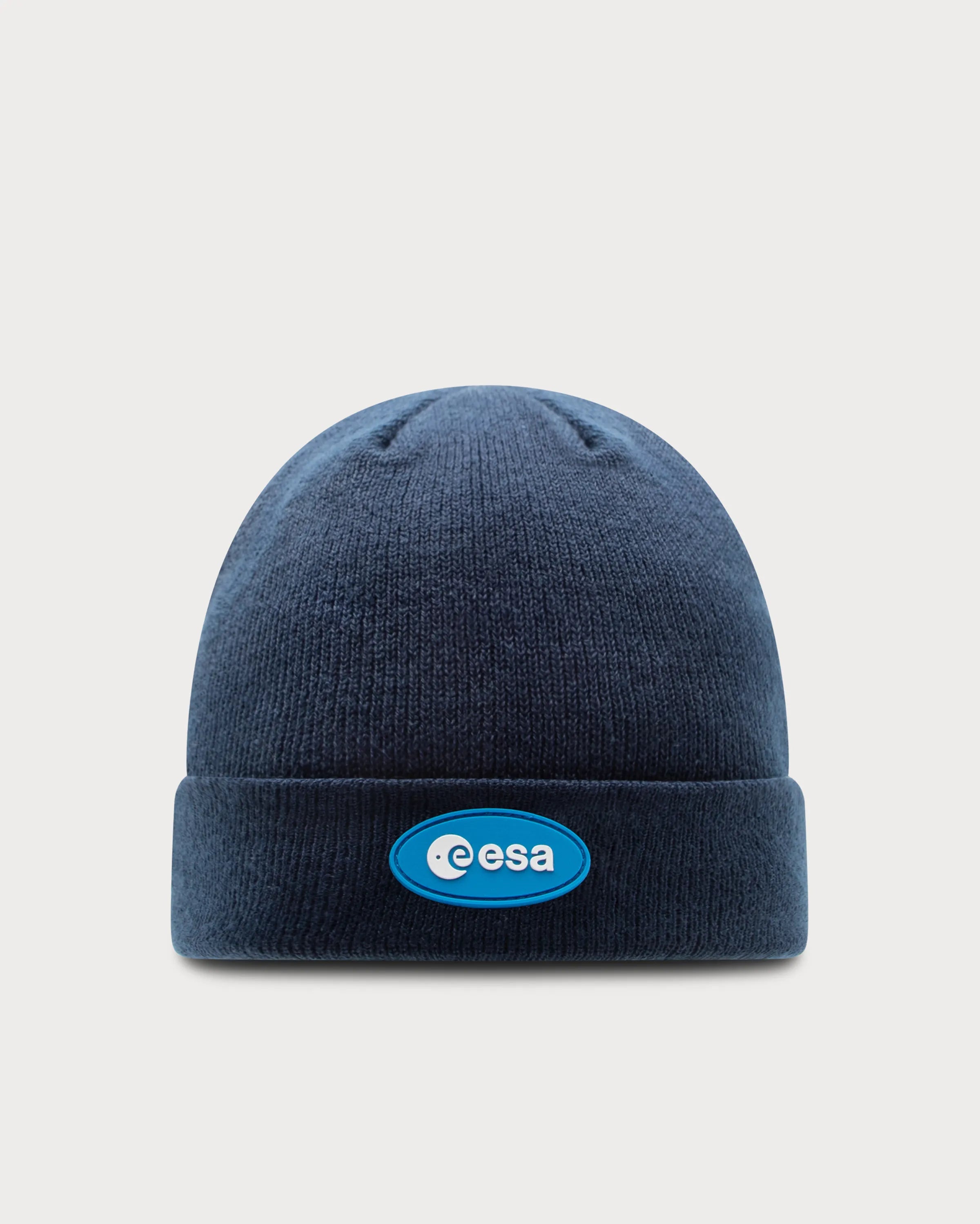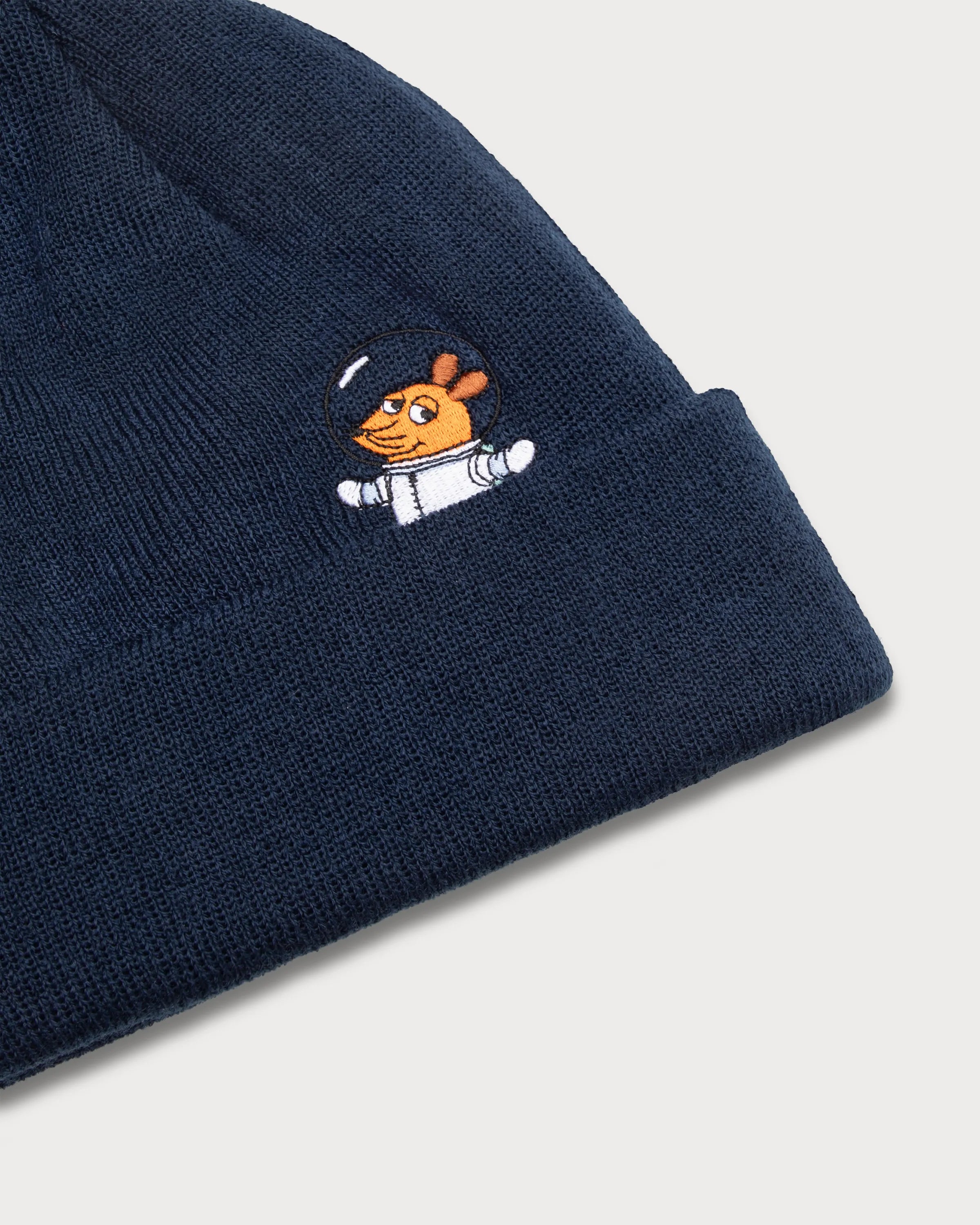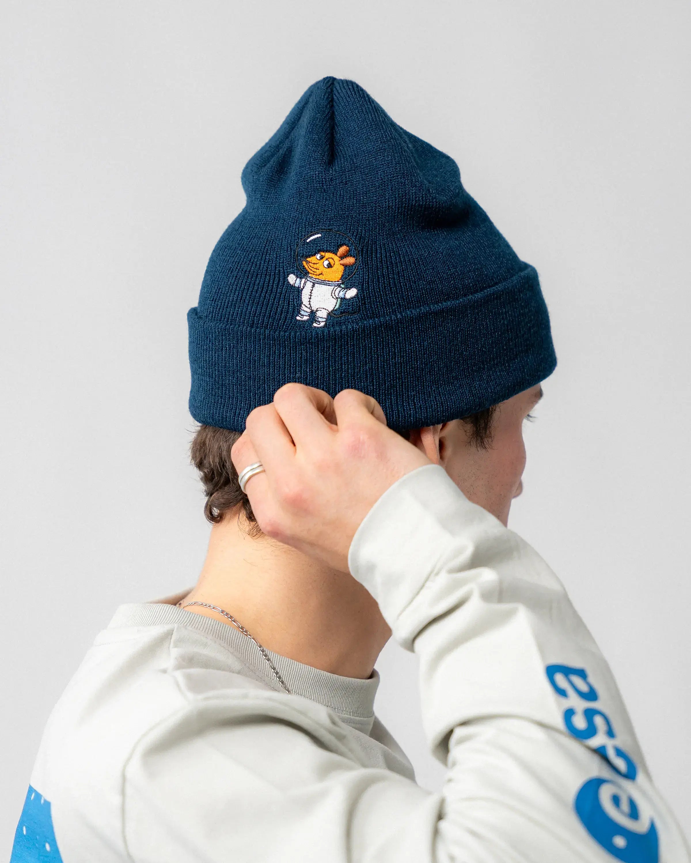 Sur le devant du bonnet bleu marine se trouve un patch en caoutchouc bleu clair avec le logo de l'ESA. Au dos, "La souris" apporte une touche discrète, flottant en apesanteur dans sa combinaison d'astronaute.