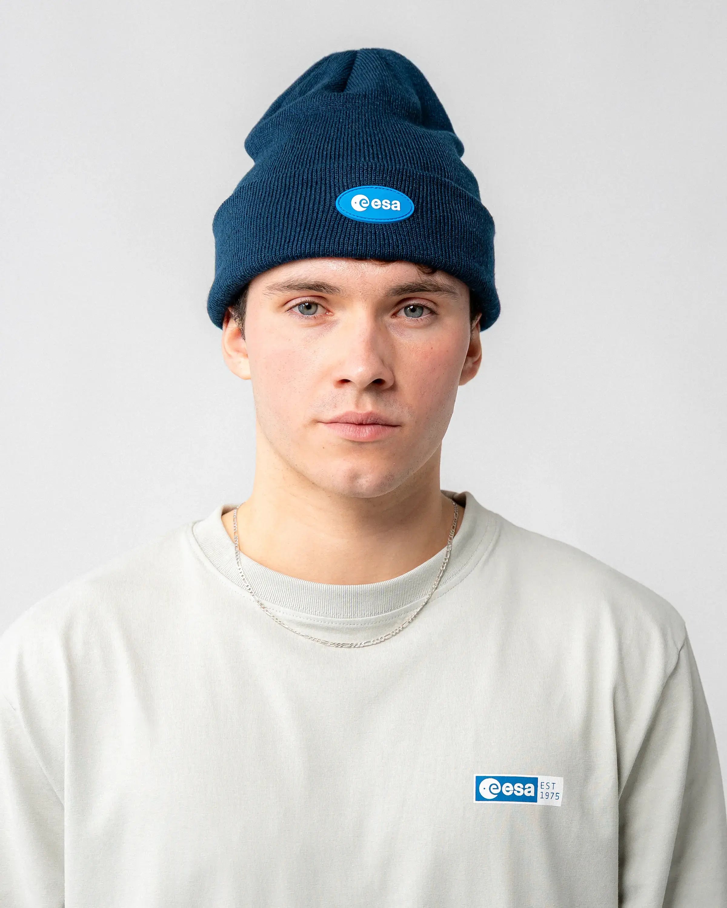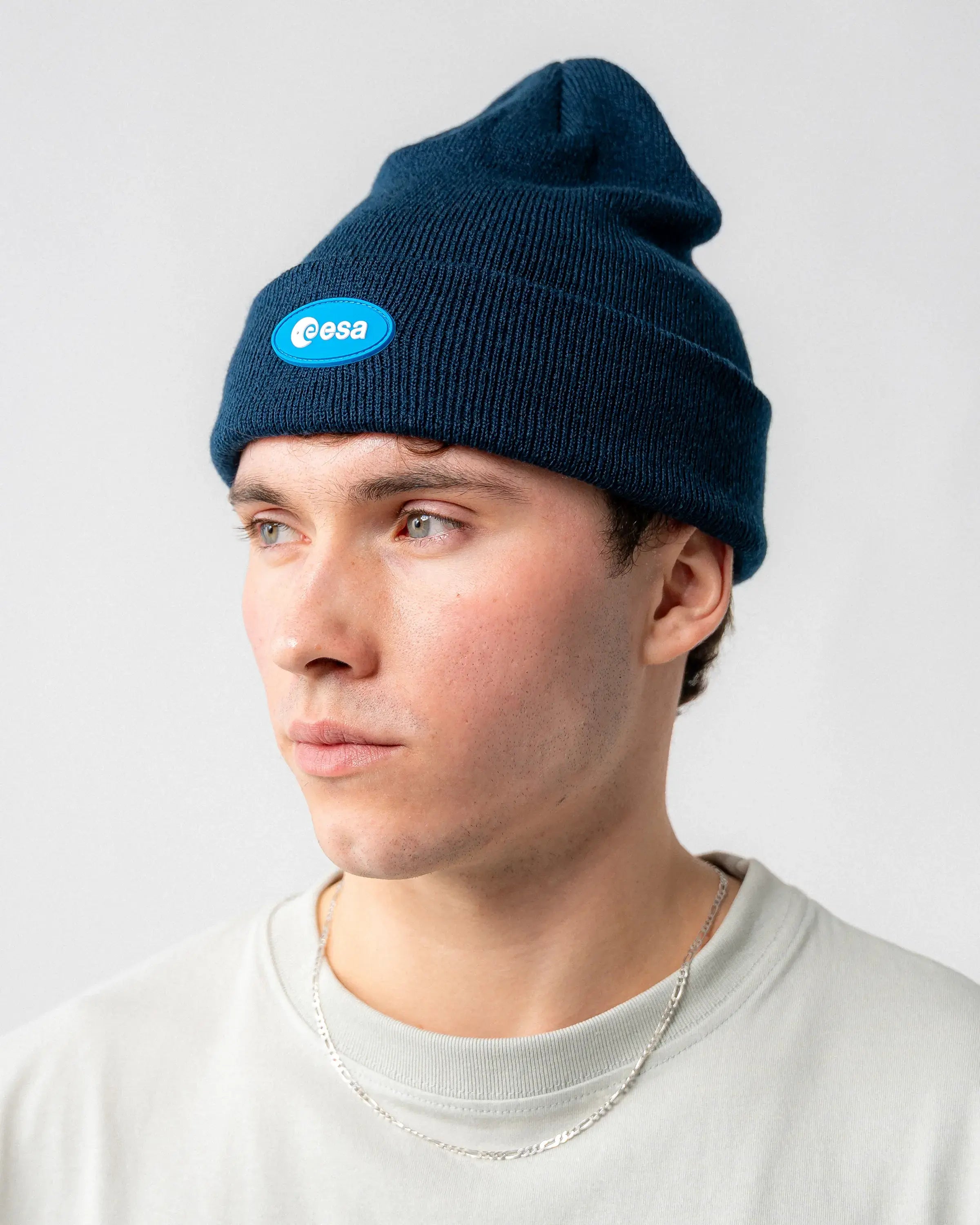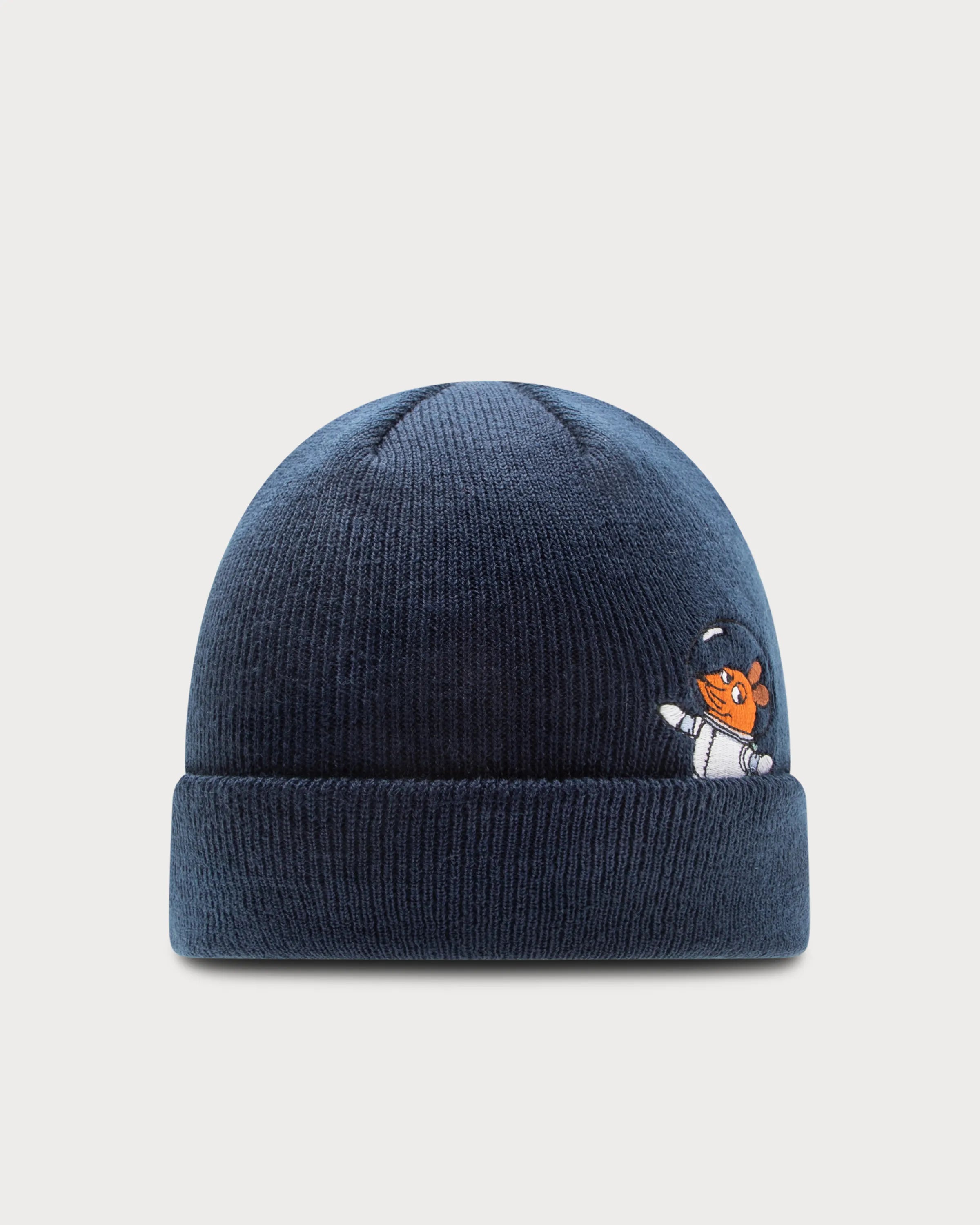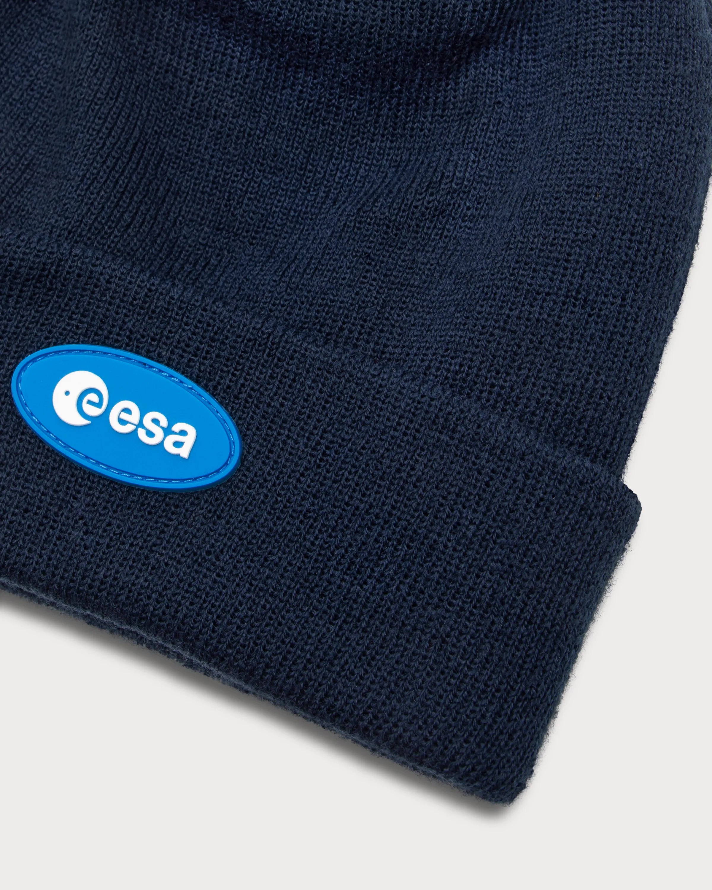 Sur le devant du bonnet bleu marine se trouve un patch en caoutchouc bleu clair avec le logo de l'ESA. Au dos, "La souris" apporte une touche discrète, flottant en apesanteur dans sa combinaison d'astronaute.