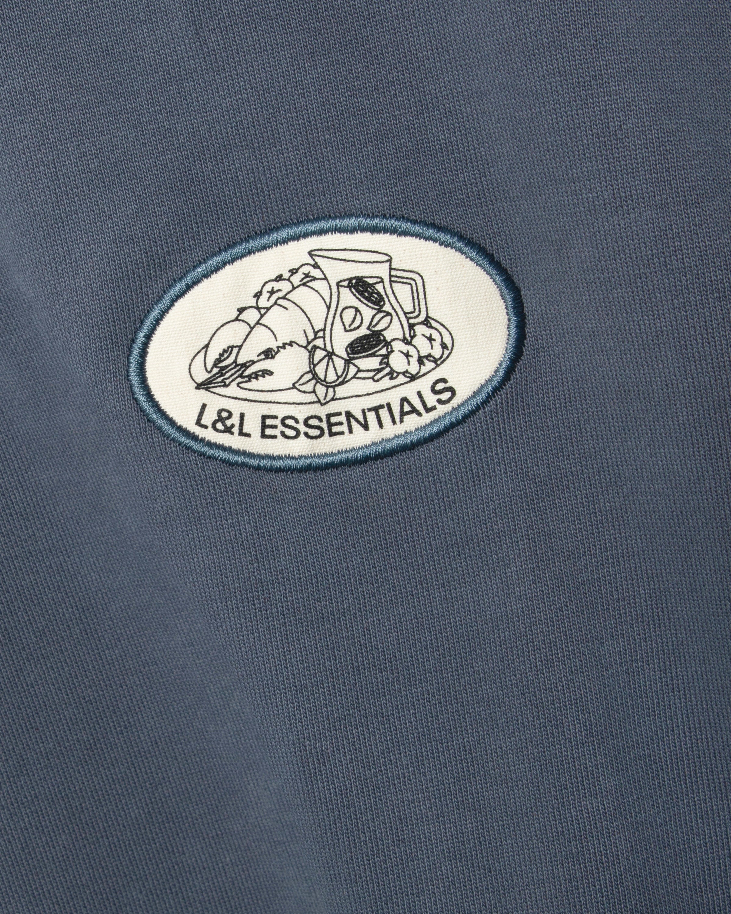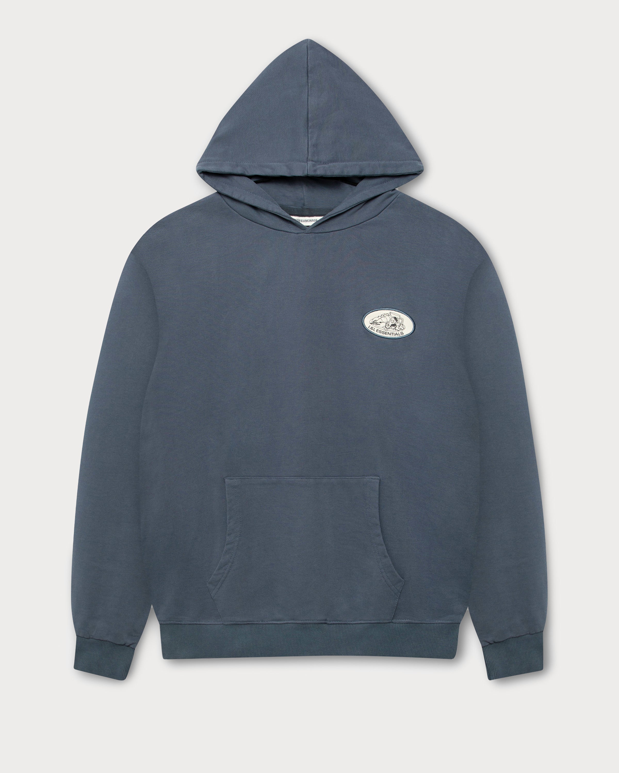 Le côté gauche du sweat-shirt à capuche bleu marine arbore un écusson en toile représentant une nature morte de homard, de limonade et de fleurs de coton. L'inscription « L&L Essentials » complète le motif.