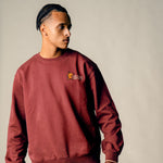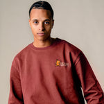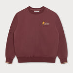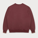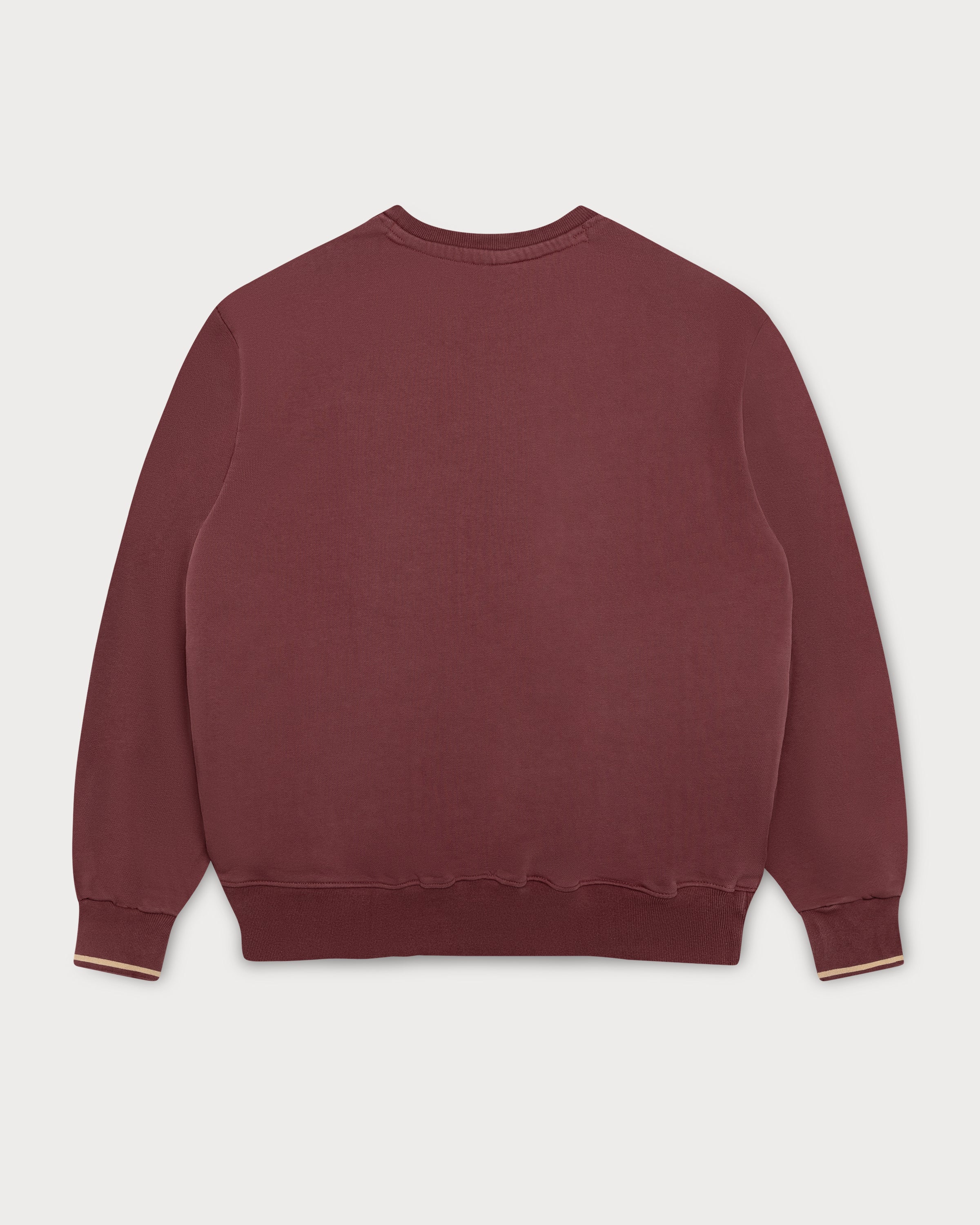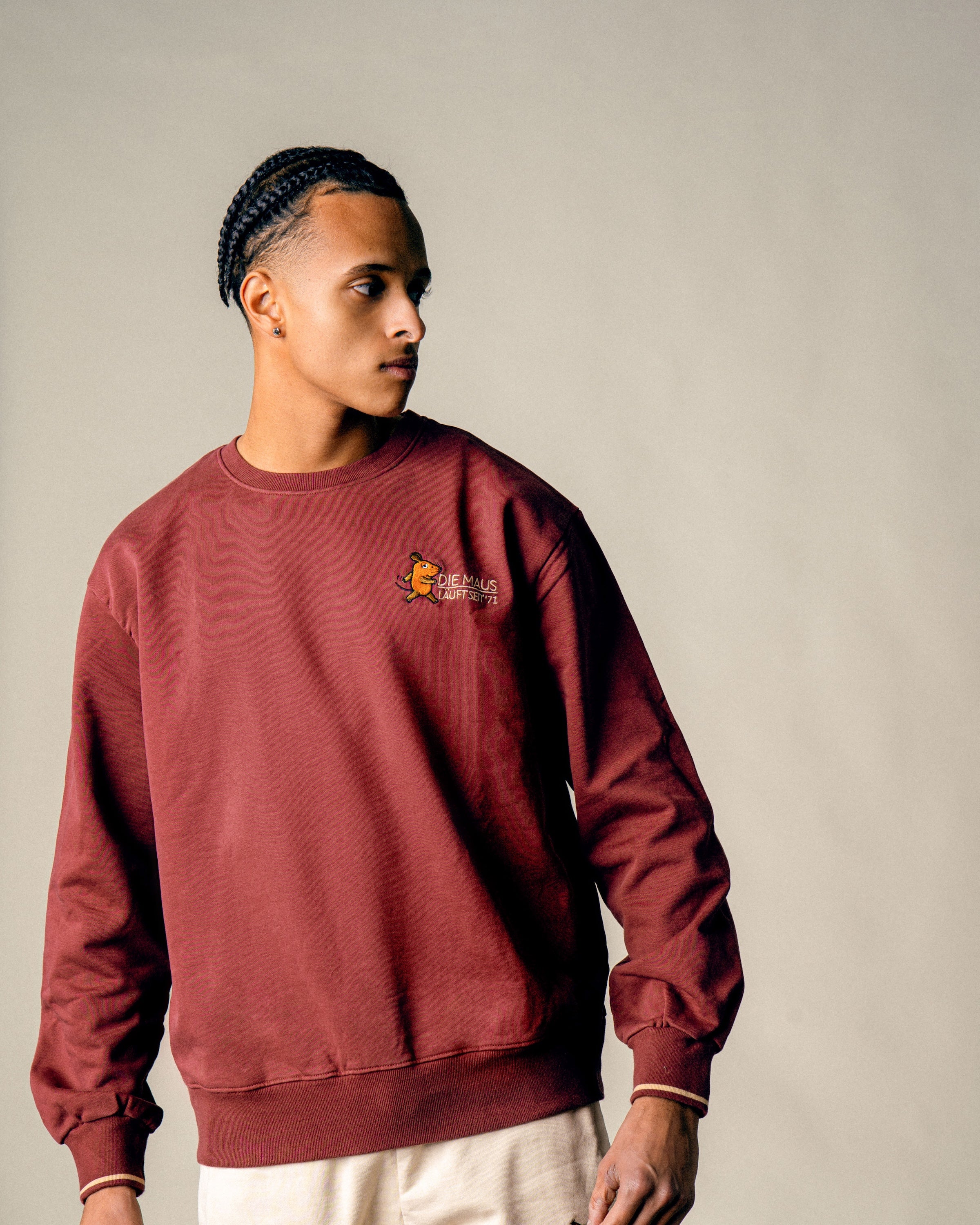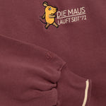 Le devant de ce pull rouge vin délavé arbore une souris qui court et l'inscription « Die Maus läuft seit '71 » (La souris court depuis 1971) en fine broderie. Les rayures beiges aux poignets complètent habilement le look.