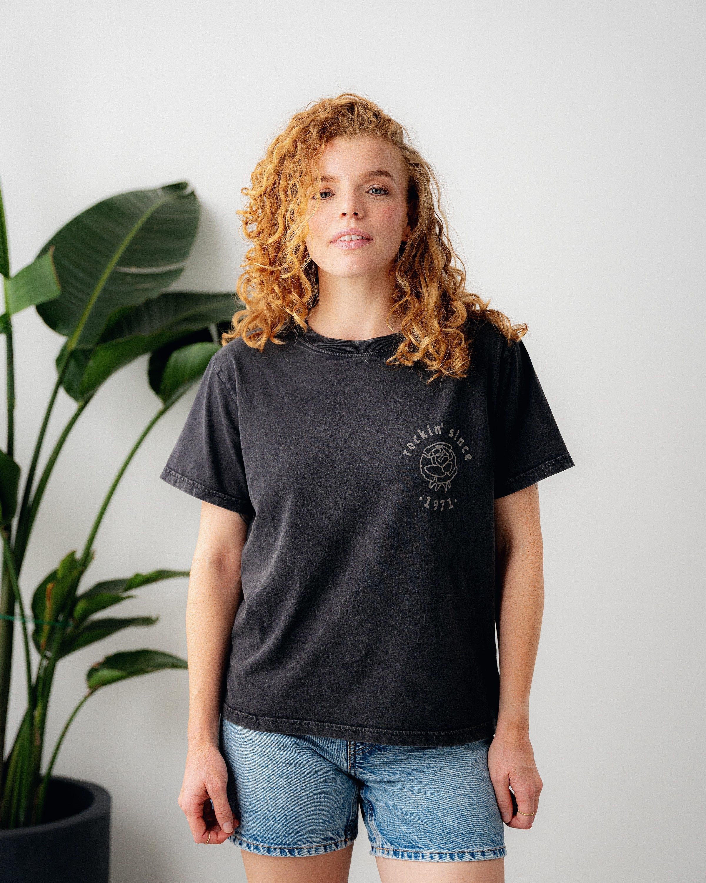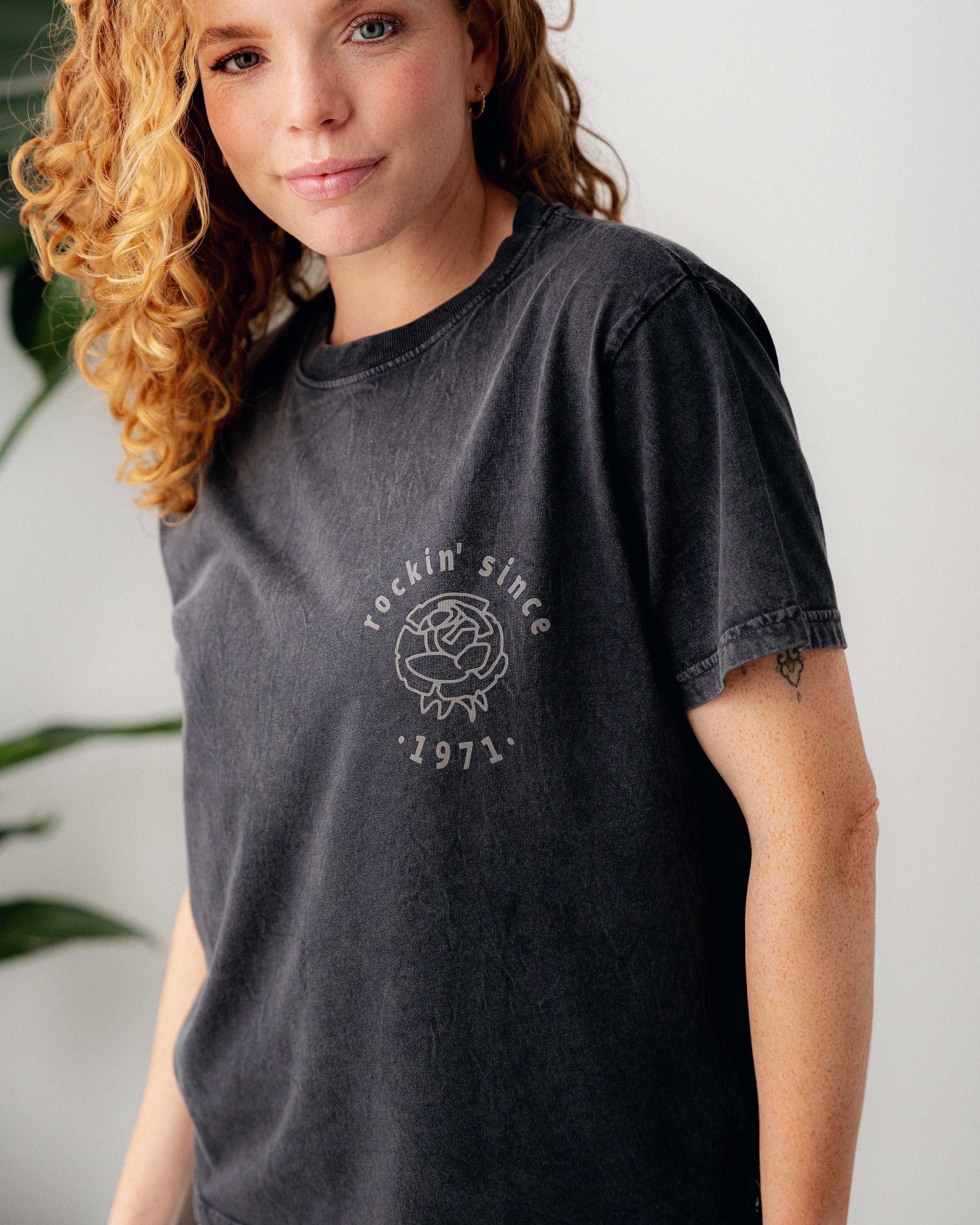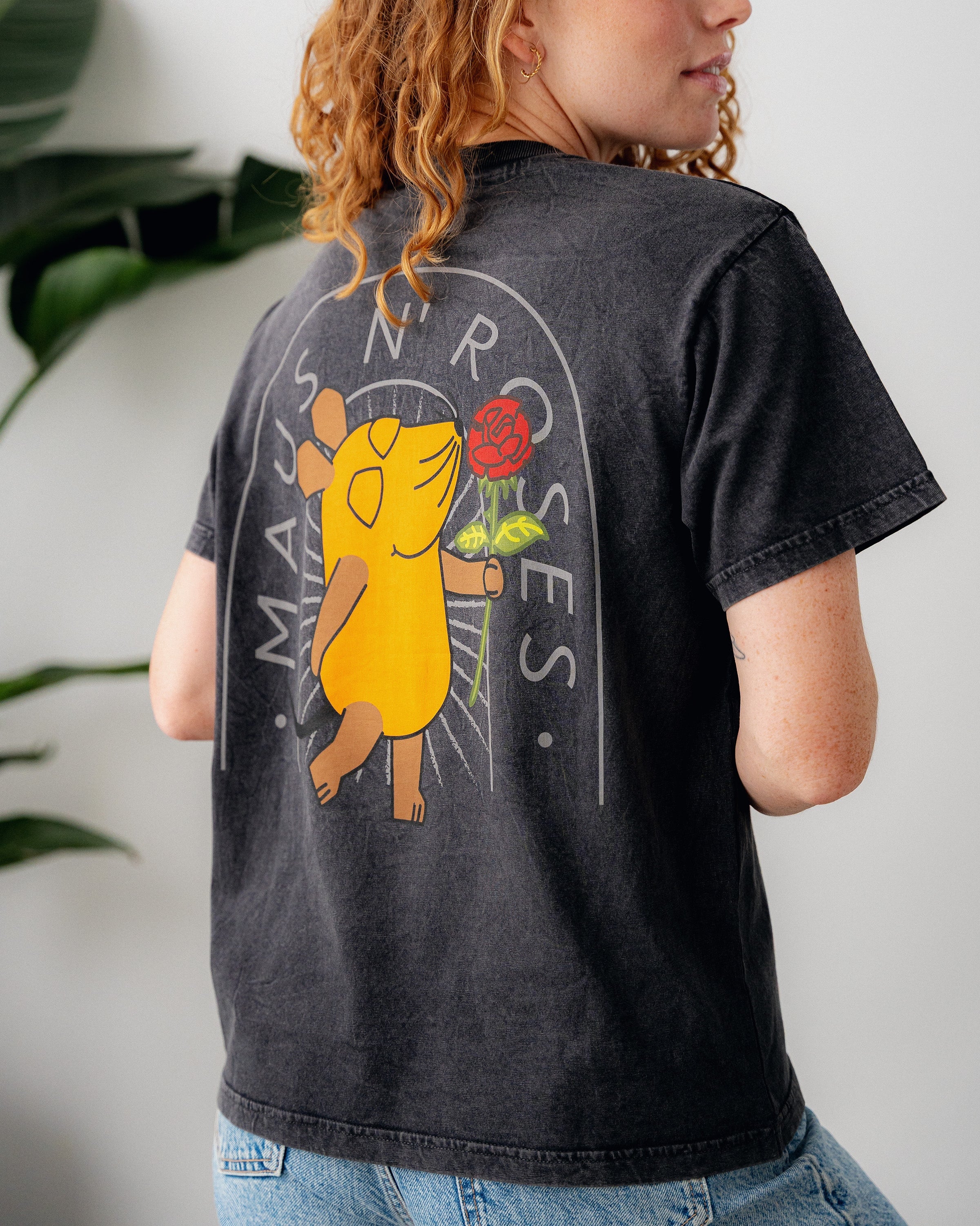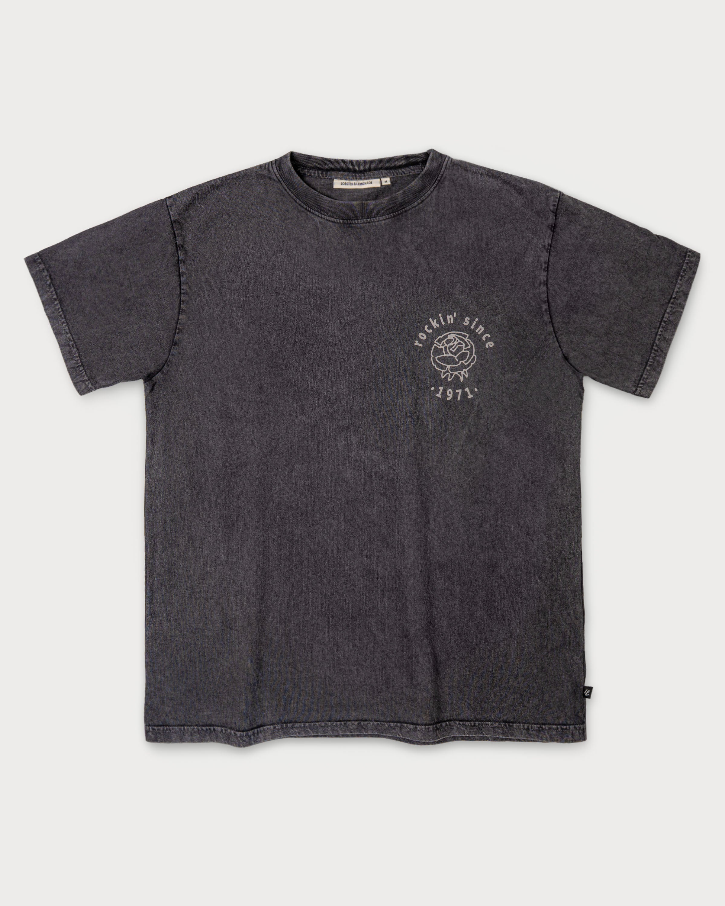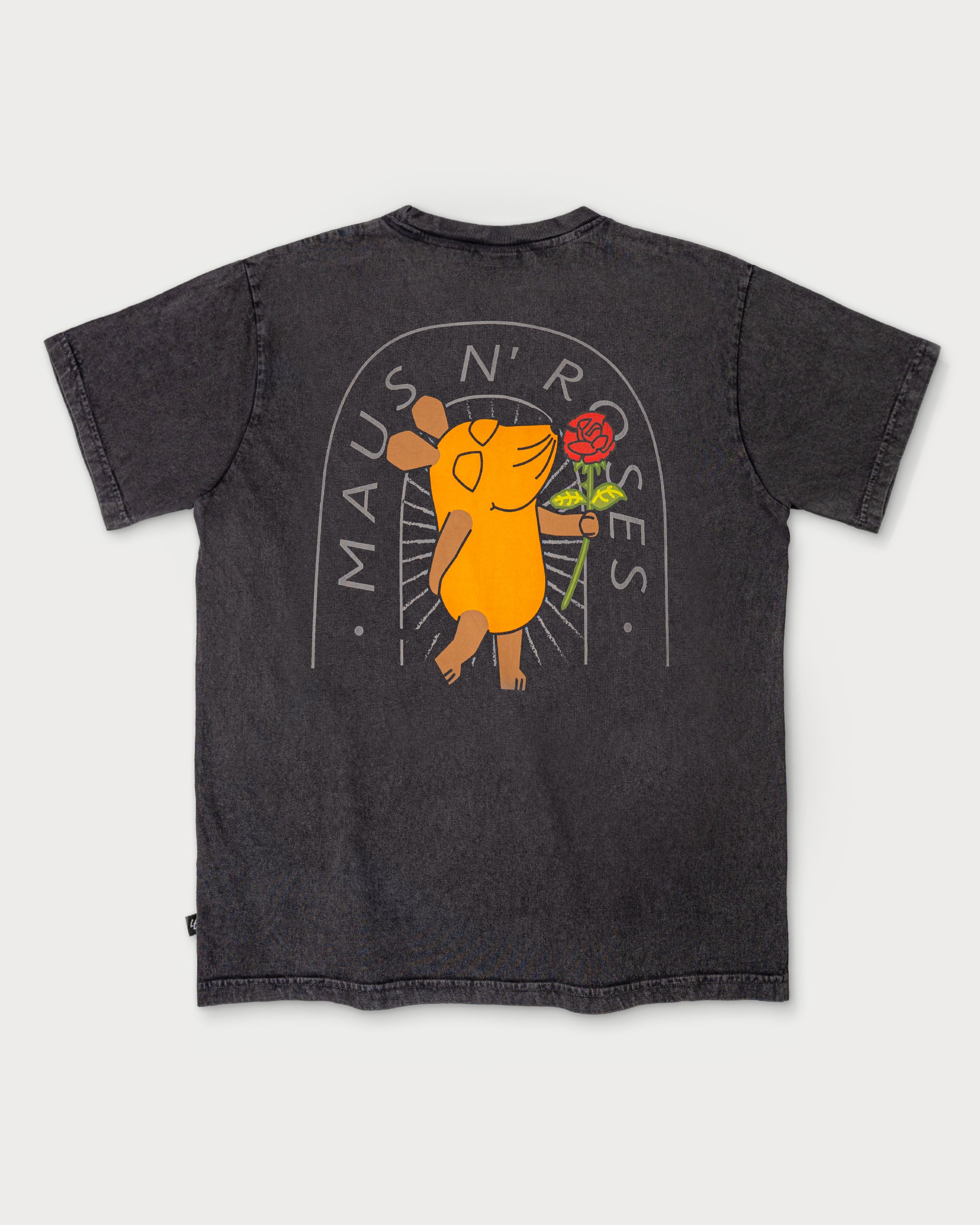L'imprimé au dos de ce t-shirt noir représente la souris tenant une rose parfumée. Le logo « Maus N' Roses » complète le style. Sur le devant, l'inscription « rockin' since 1971 » apporte une touche subtile. De plus, le délavage à l'acide imite l'aspect et le toucher des t-shirts de groupes vintage des années 80.