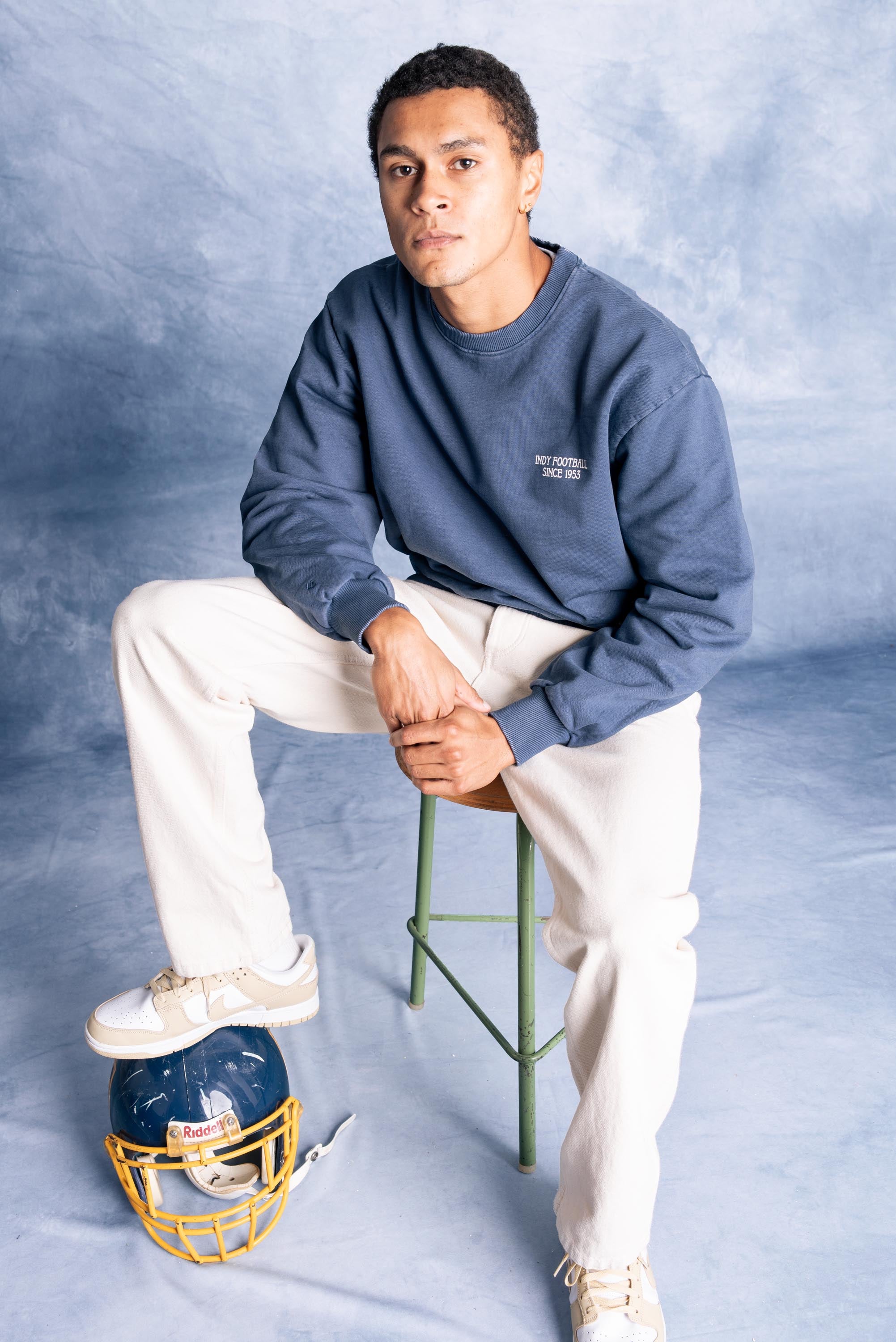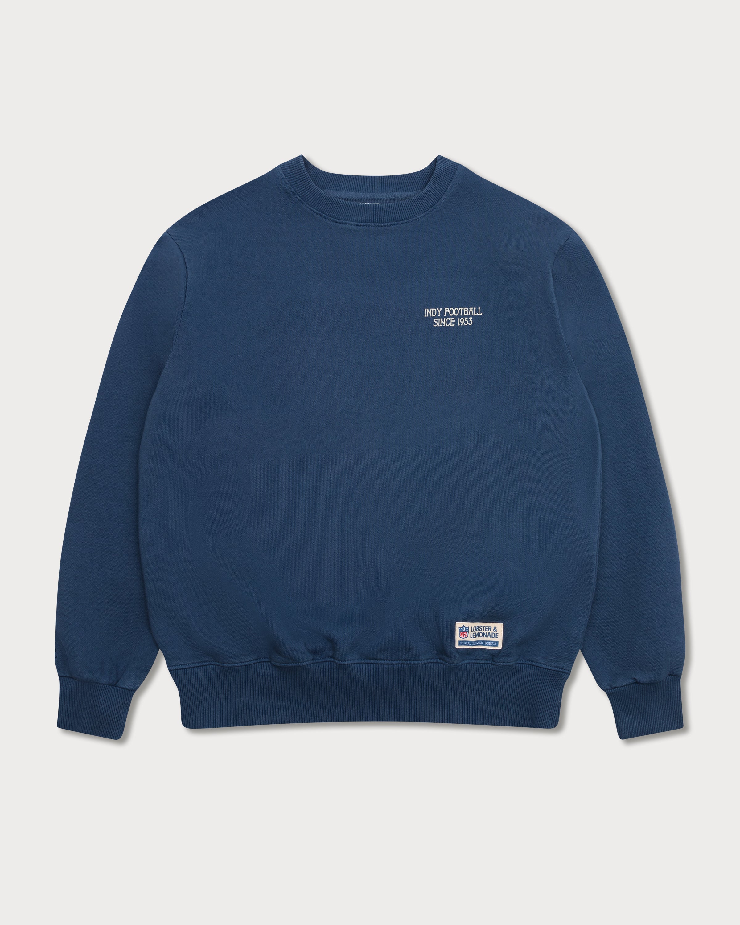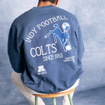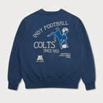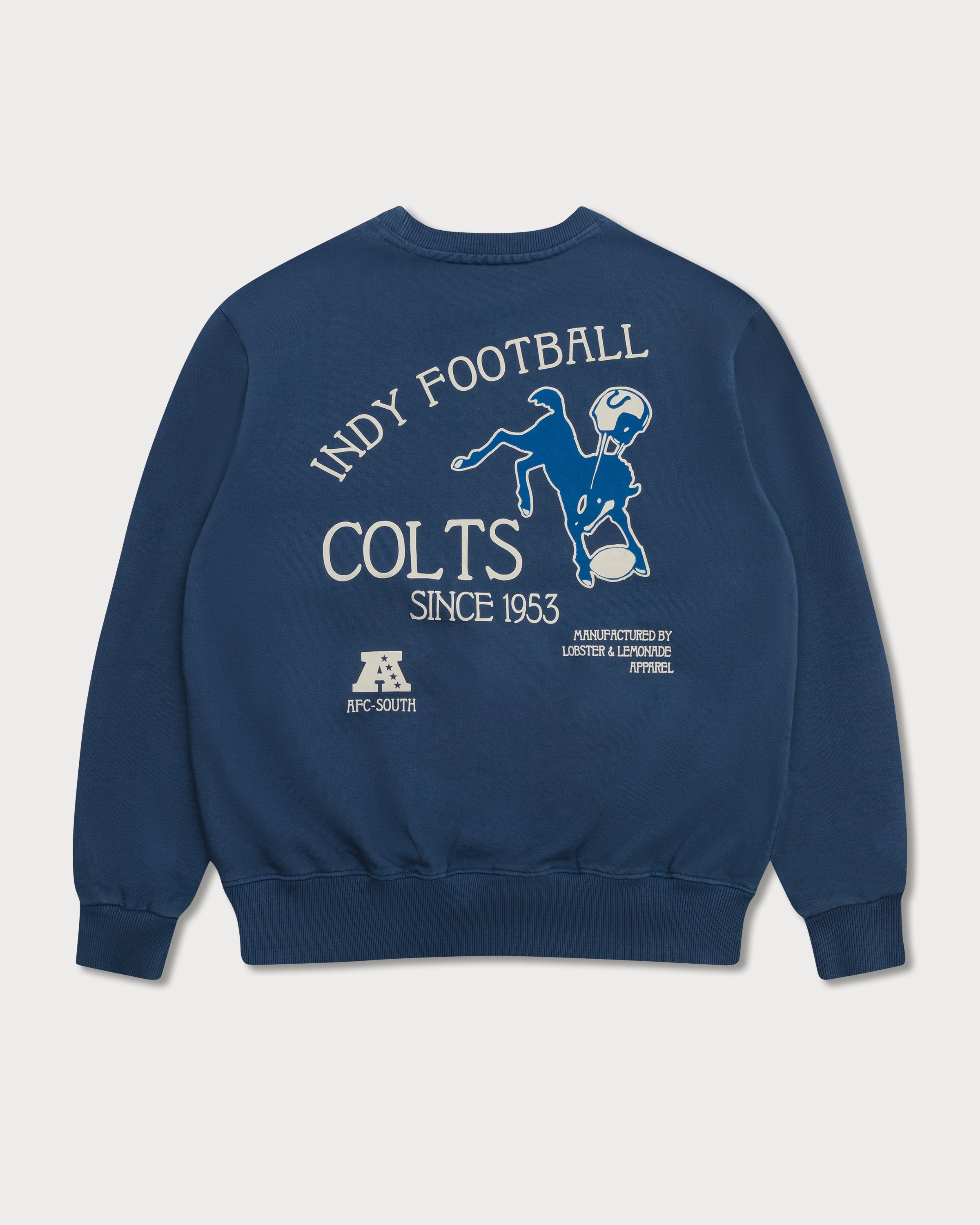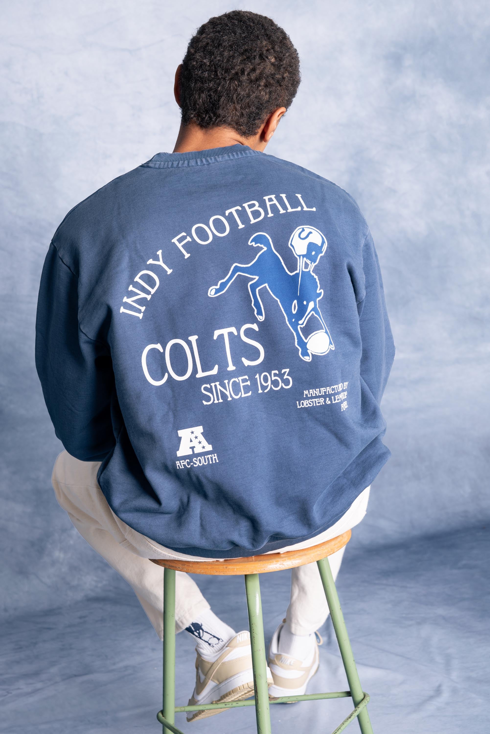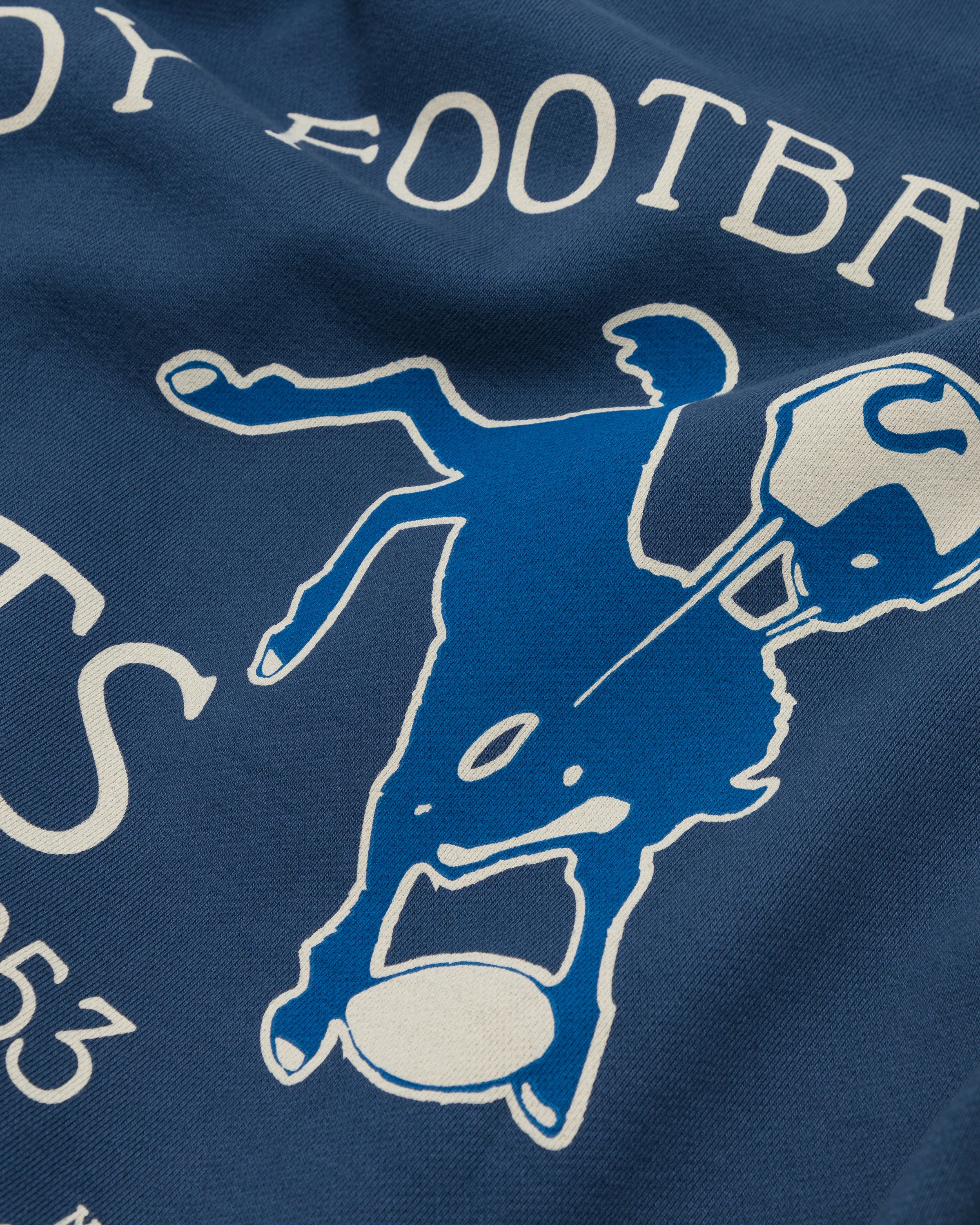 Ce sweat-shirt bleu foncé teint en pièce arbore le logo vintage des Colts avec un cheval cabré dans un généreux imprimé au dos. L'imprimé football américain Indy sur la poitrine gauche et l'étiquette tissée en toile à la taille complètent son look rétro.