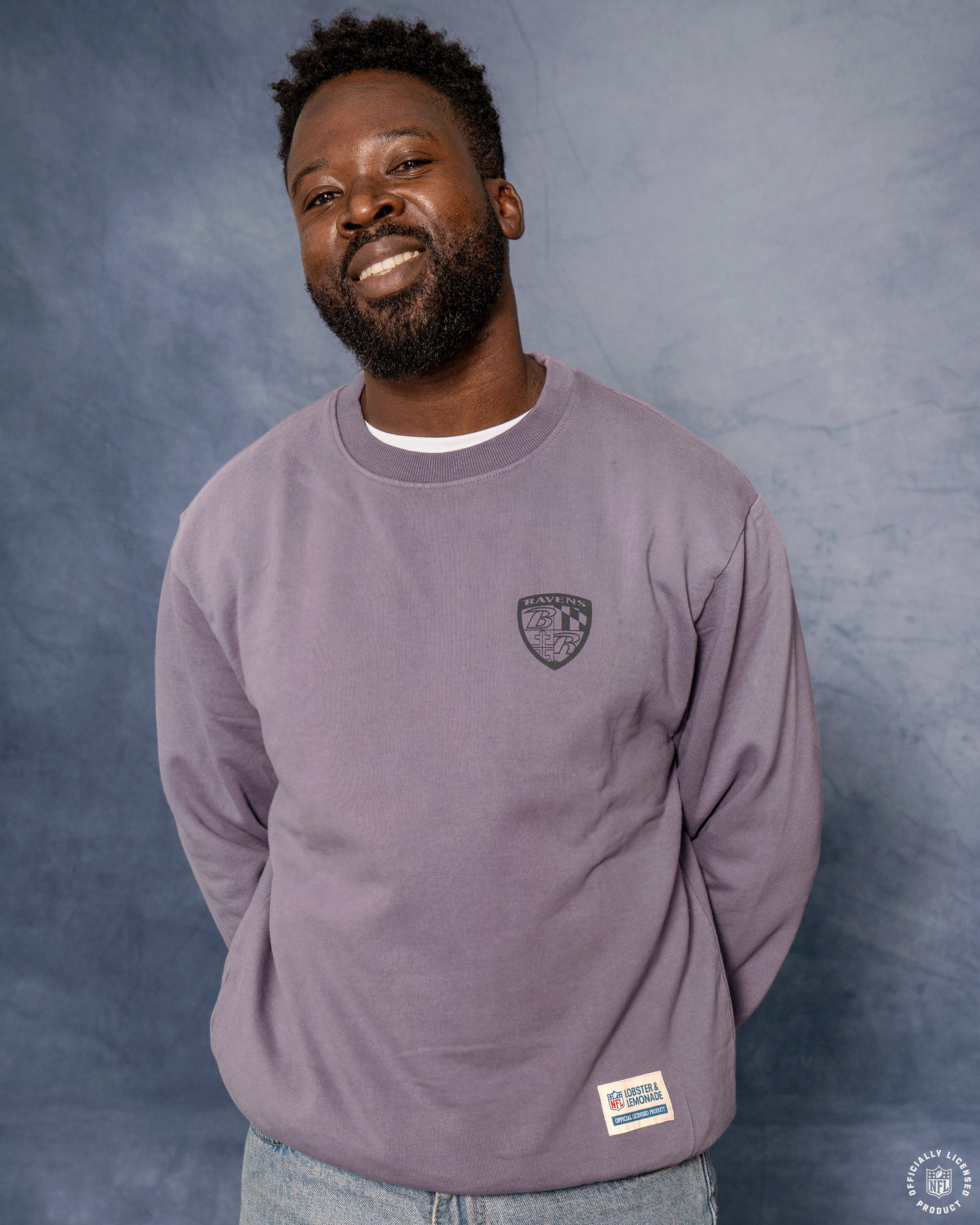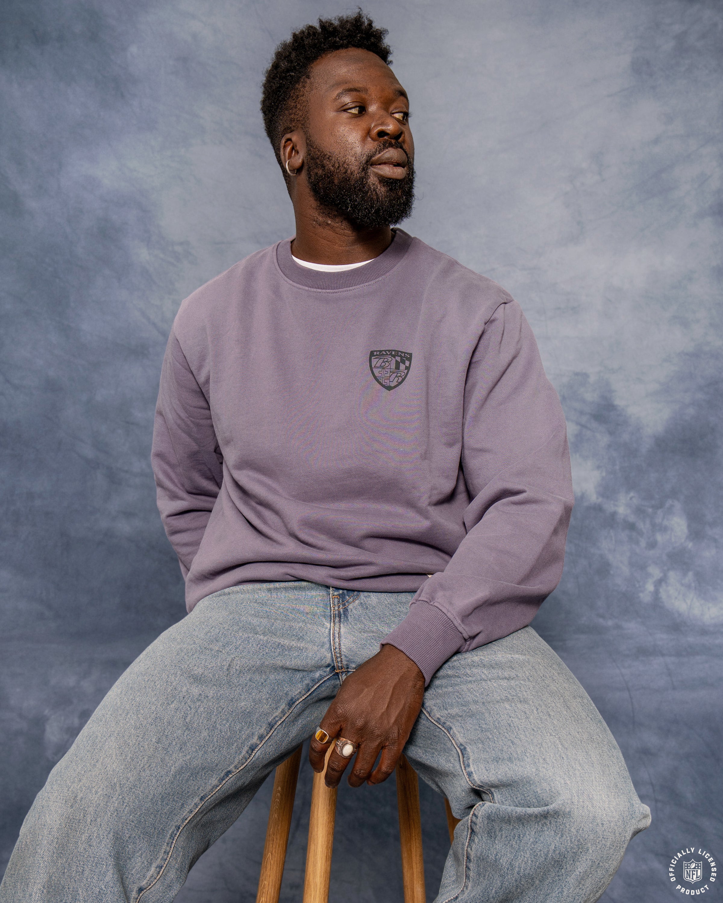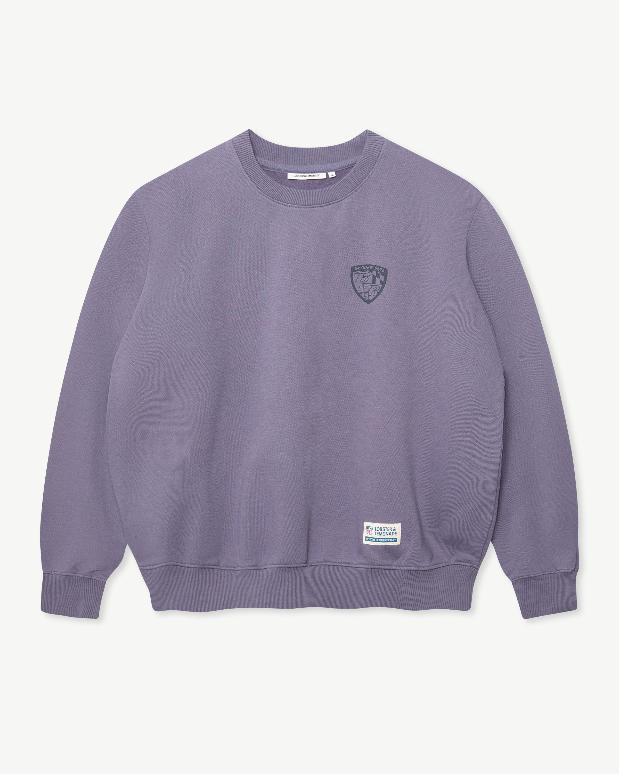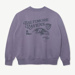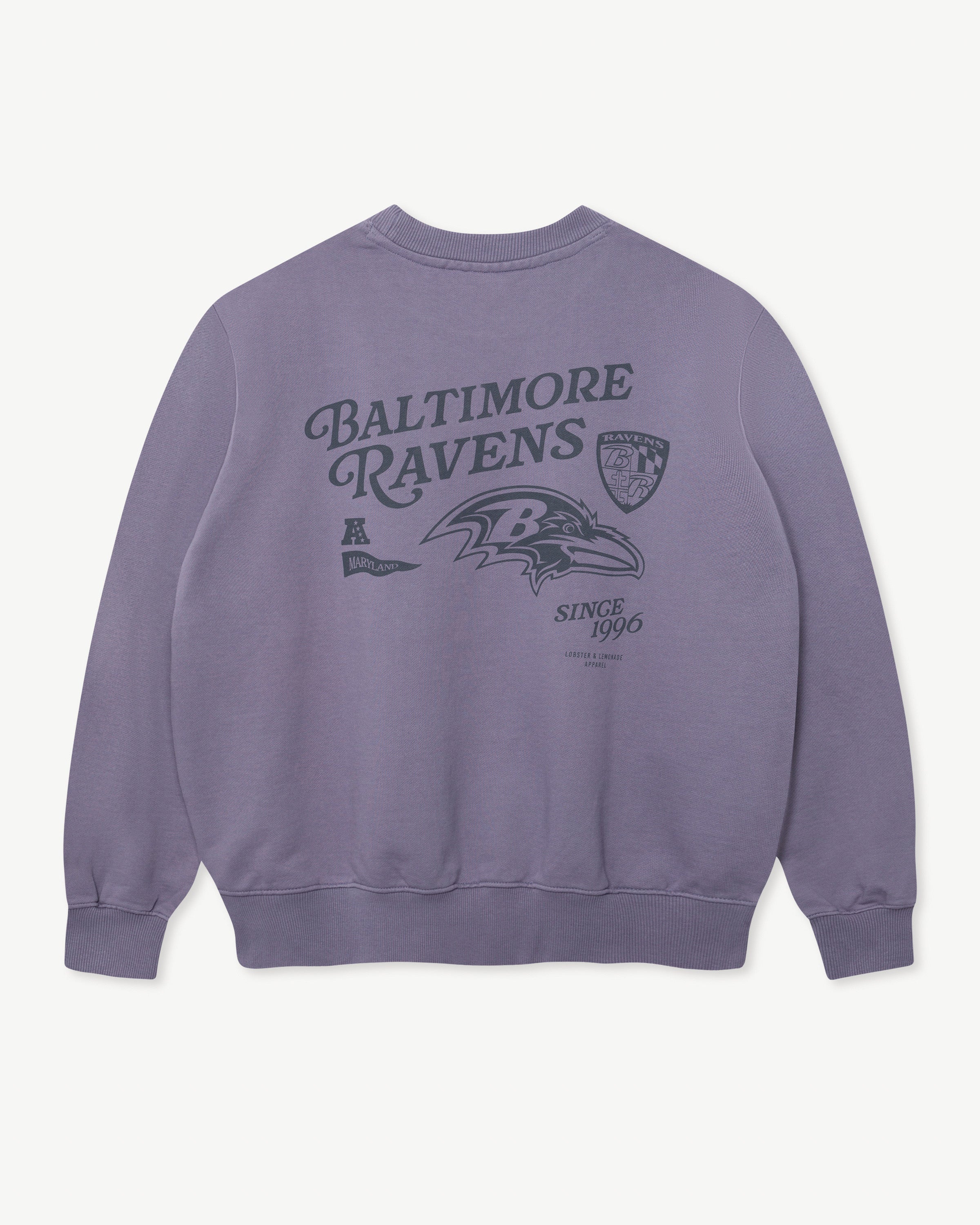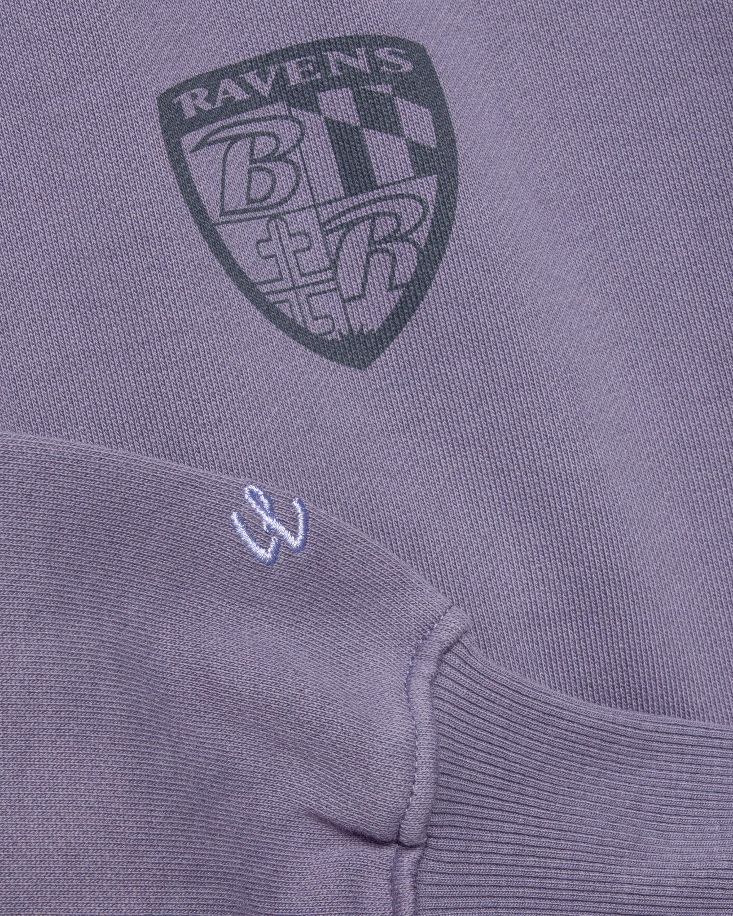 Ce pull violet arbore un grand imprimé des Ravens de Baltimore dans le dos, avec le logo des Ravens. Le logo des Ravens, imprimé en petit sur la poitrine gauche, et l'étiquette tissée en toile à la taille complètent son look rétro.