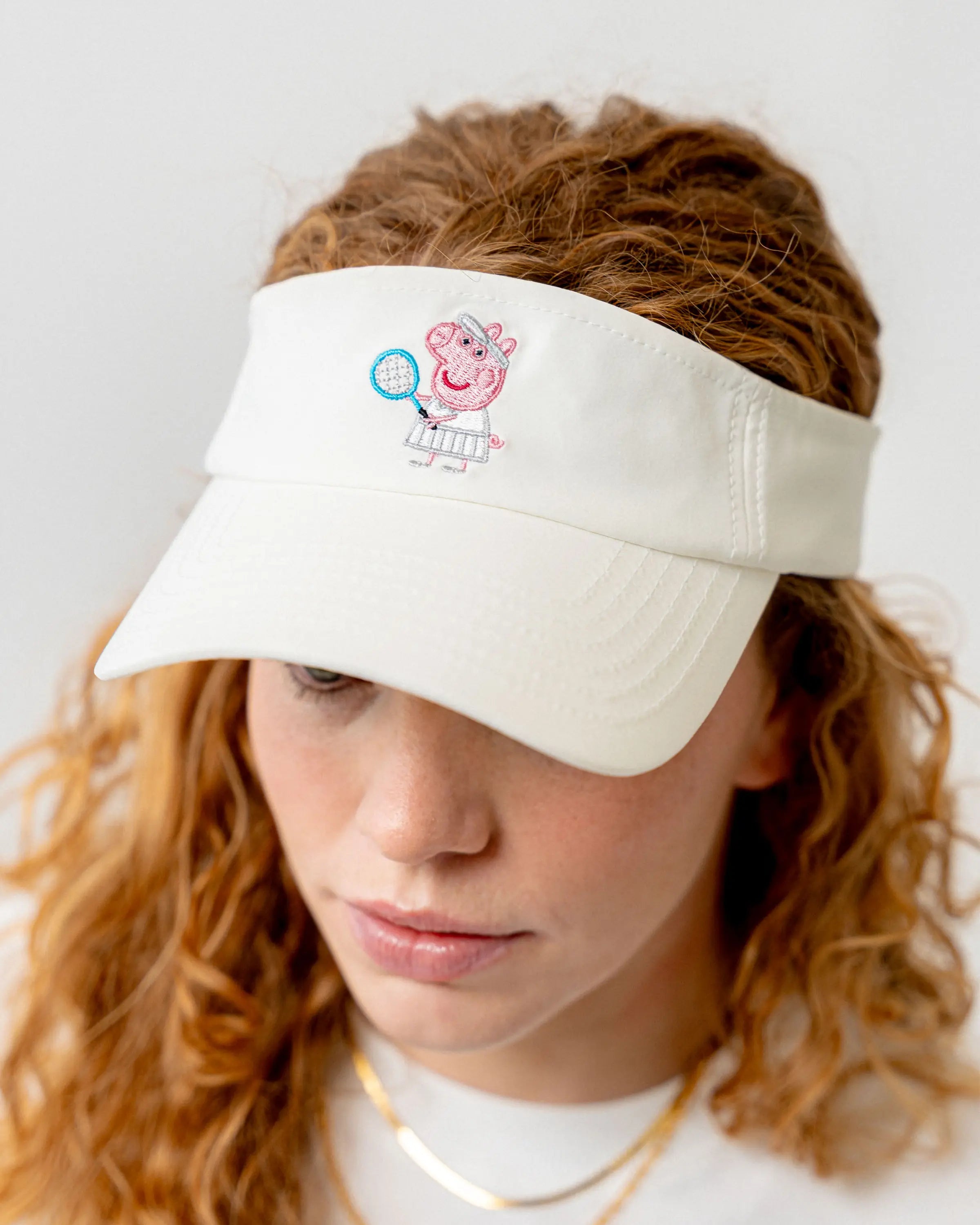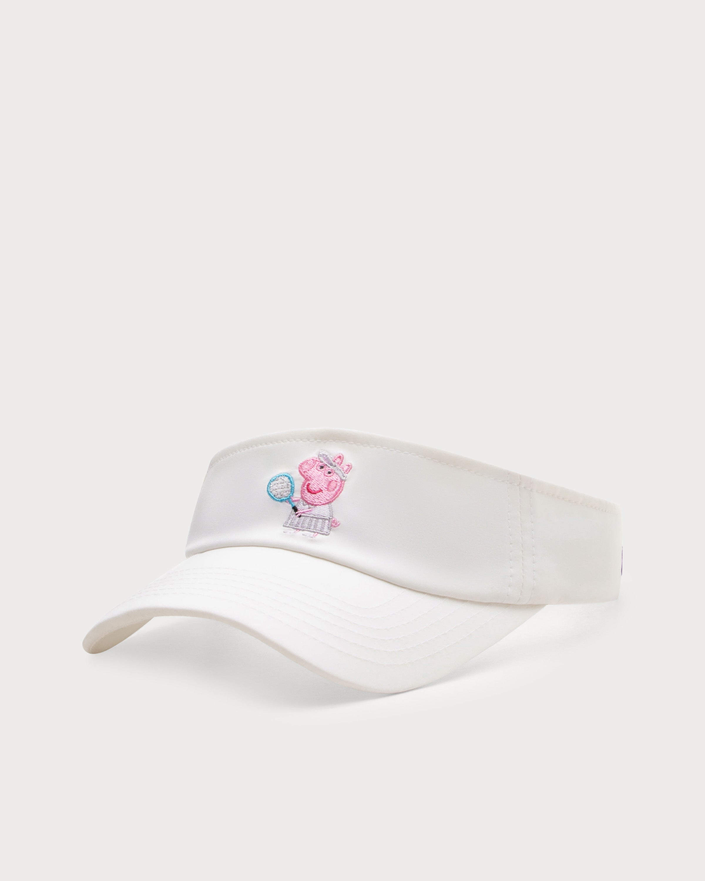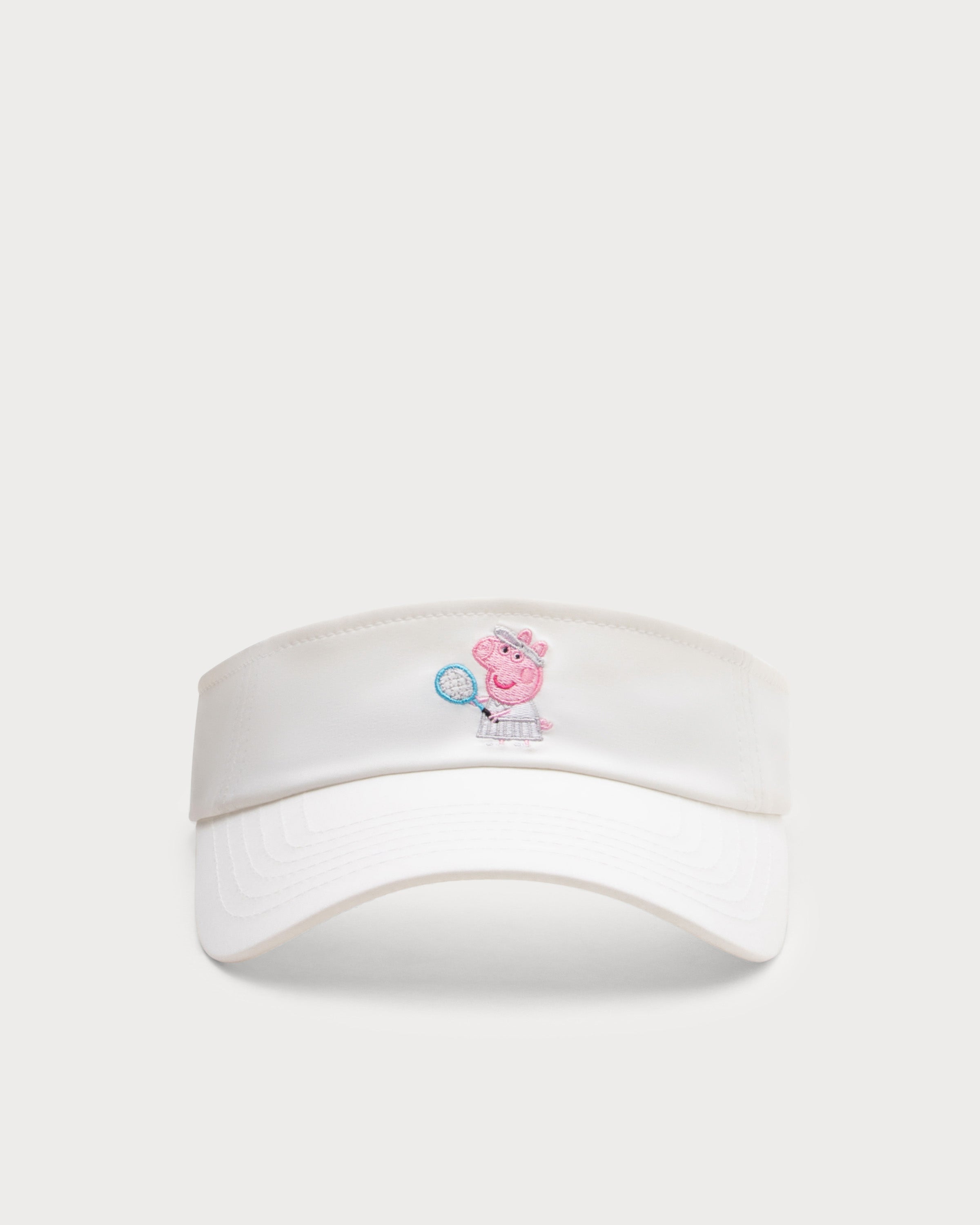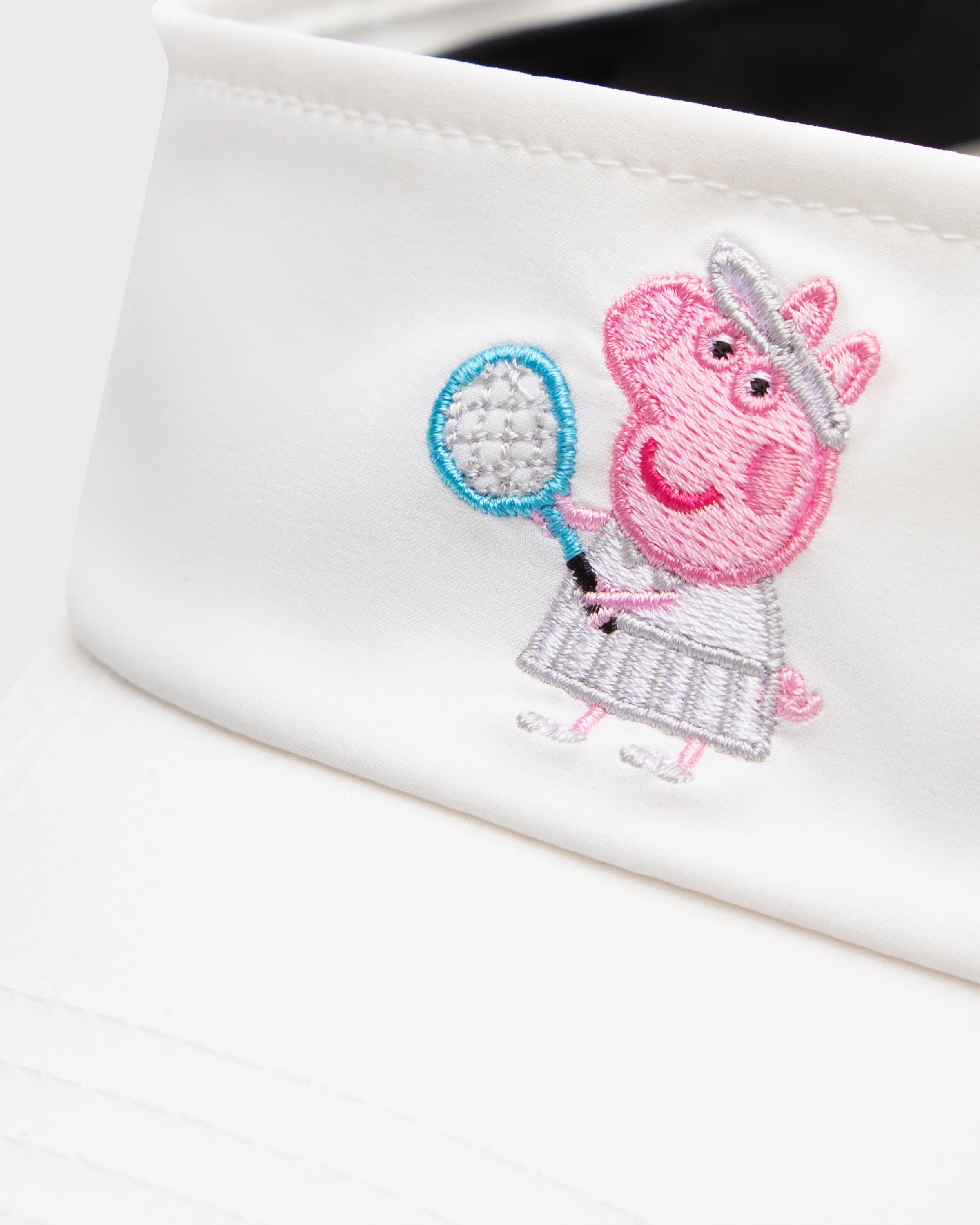 Peppa Pig en tenue de tennis orne l'avant de cette visière blanche en broderie de haute qualité. L'inscription latérale "Love All" et la petite balle de tennis complètent le look rétro sportif et font de la visière le compagnon idéal pour les journées ensoleillées sur le court.