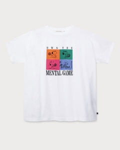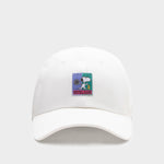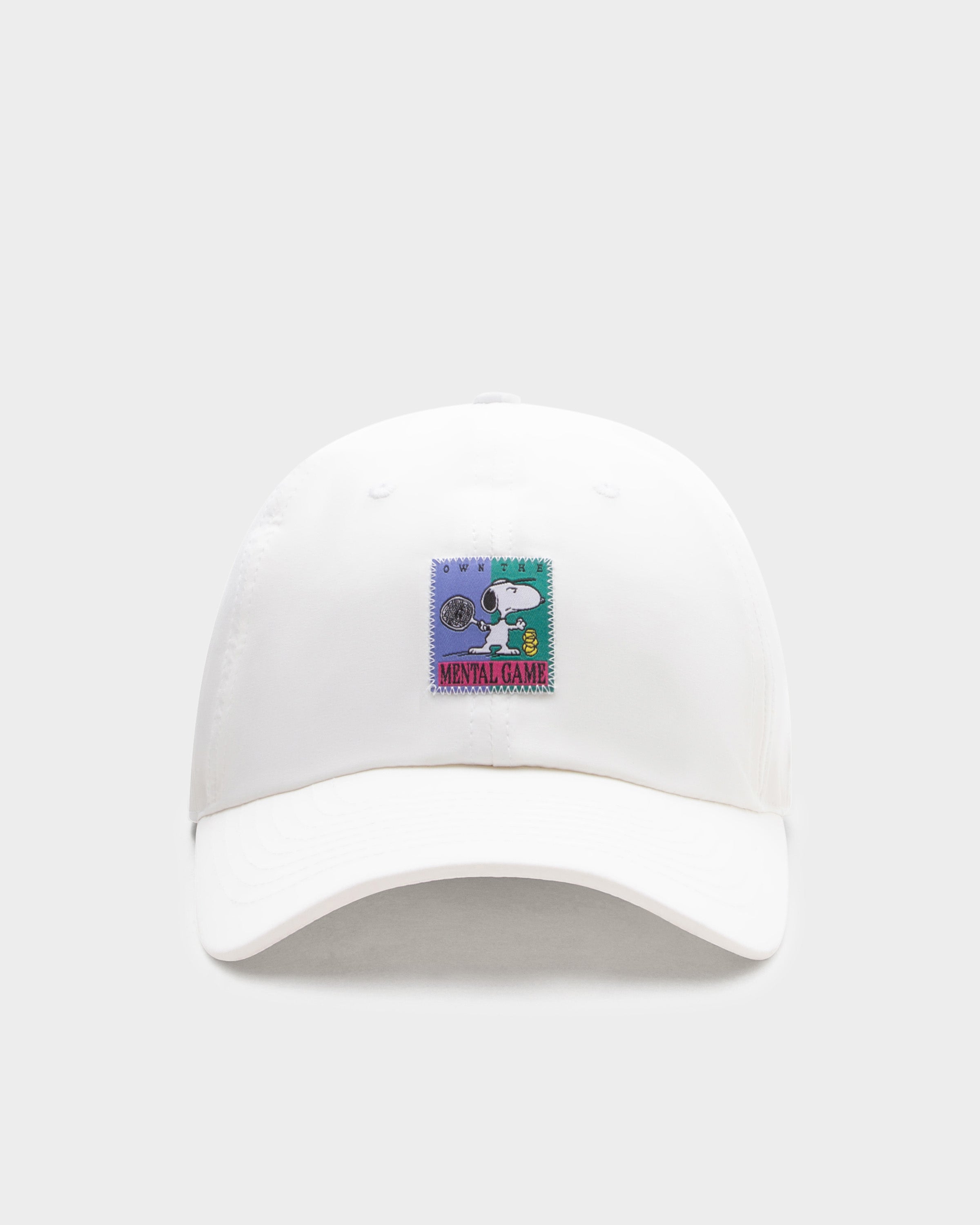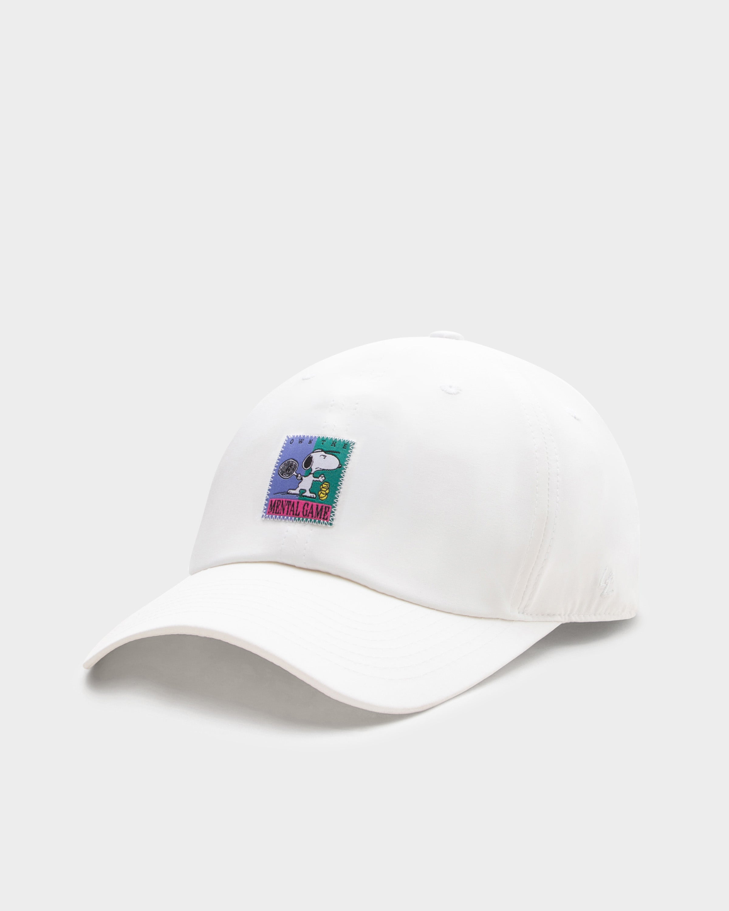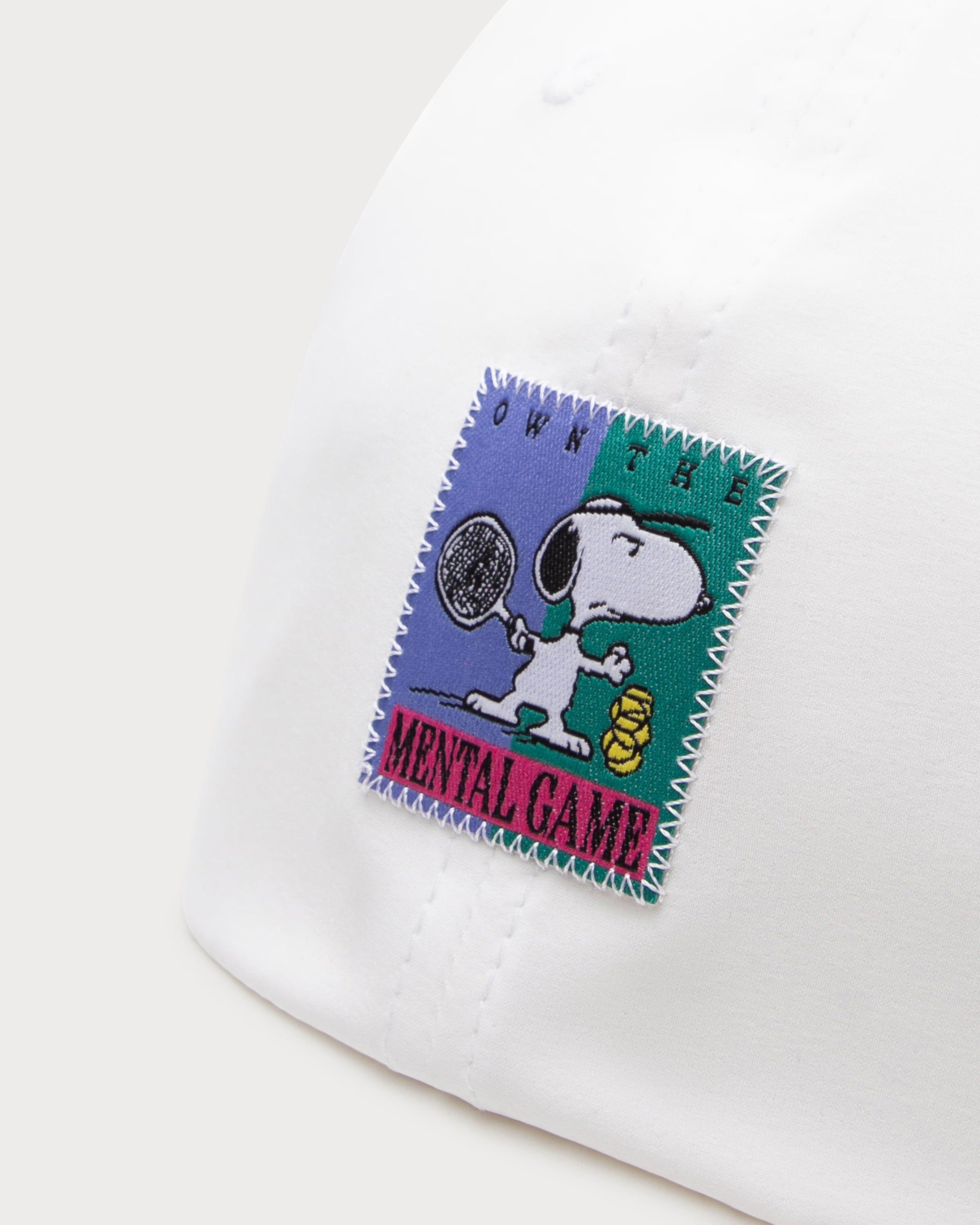 Snoopy, très concentré en jouant au tennis, orne l'avant de cette casquette de tennis blanche en tant qu'étiquette tissée de haute qualité. L'inscription saisissante « OWN THE MENTAL GAME » et les empiècements contrastés confèrent à la casquette un look rétro sportif.
