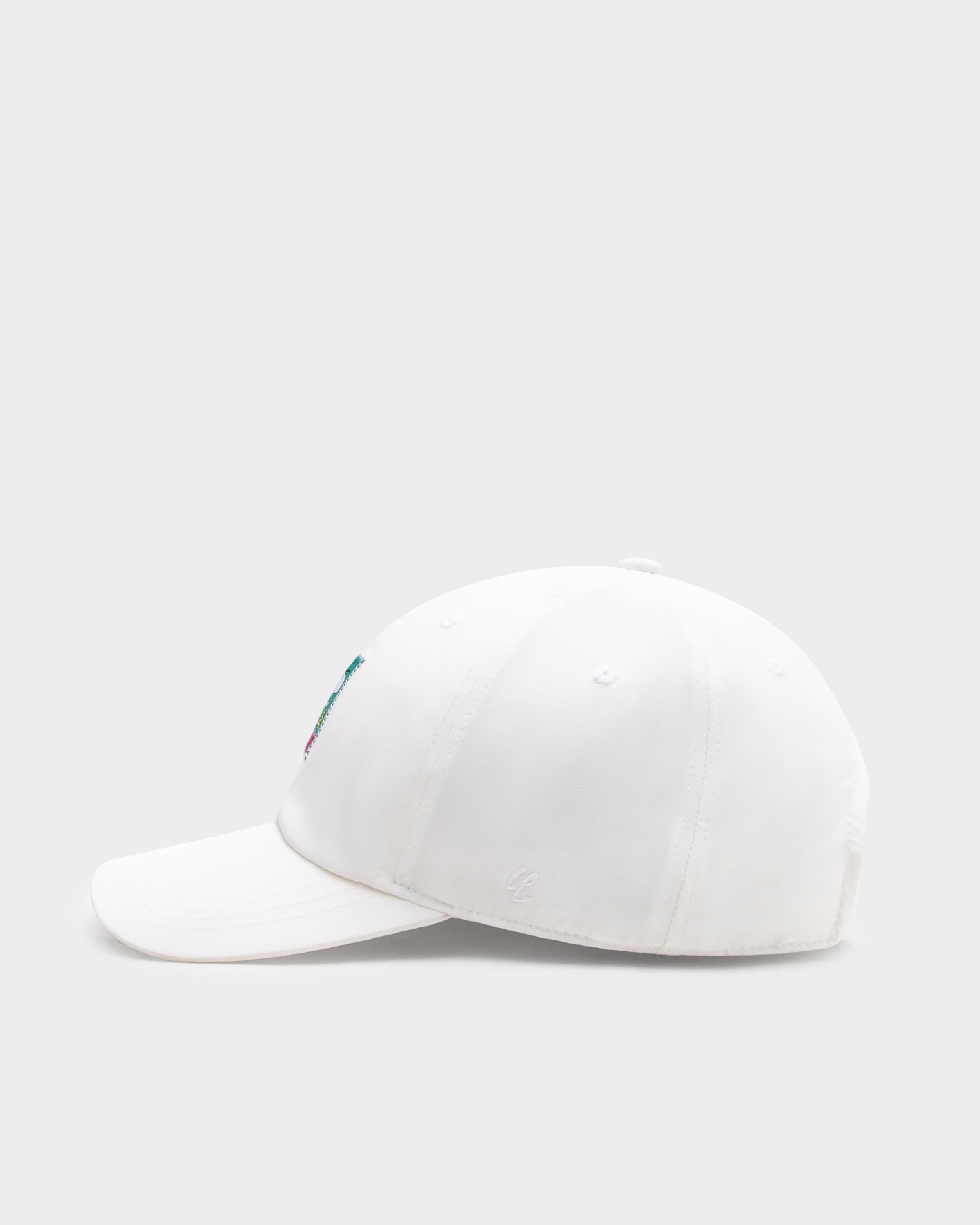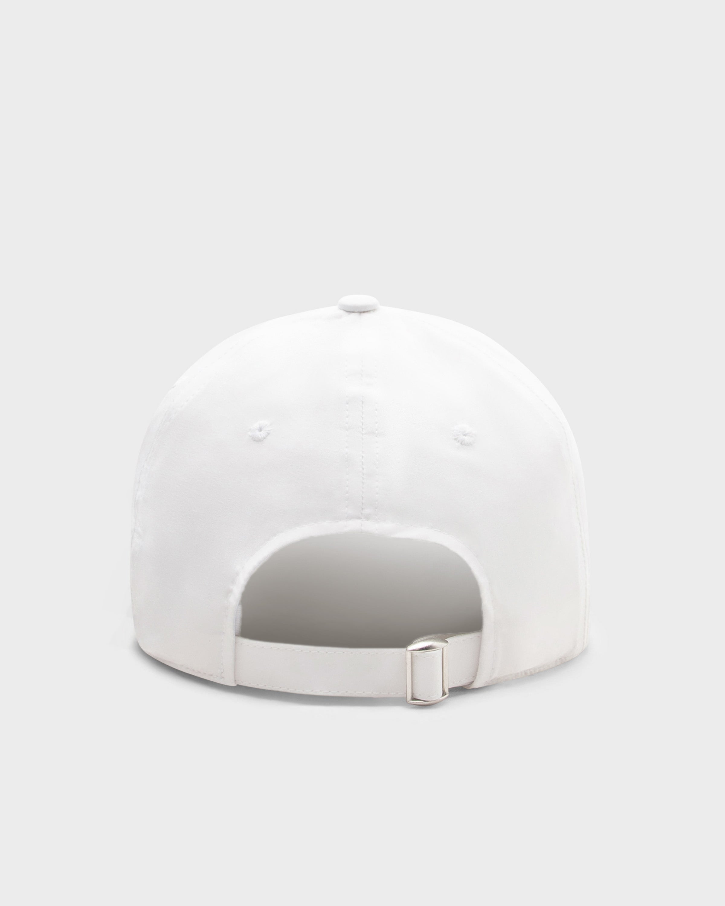 La casquette a une coupe plate, est fabriquée à partir d'un mélange de polyester fin et possède une fermeture à boucle métallique.