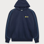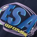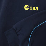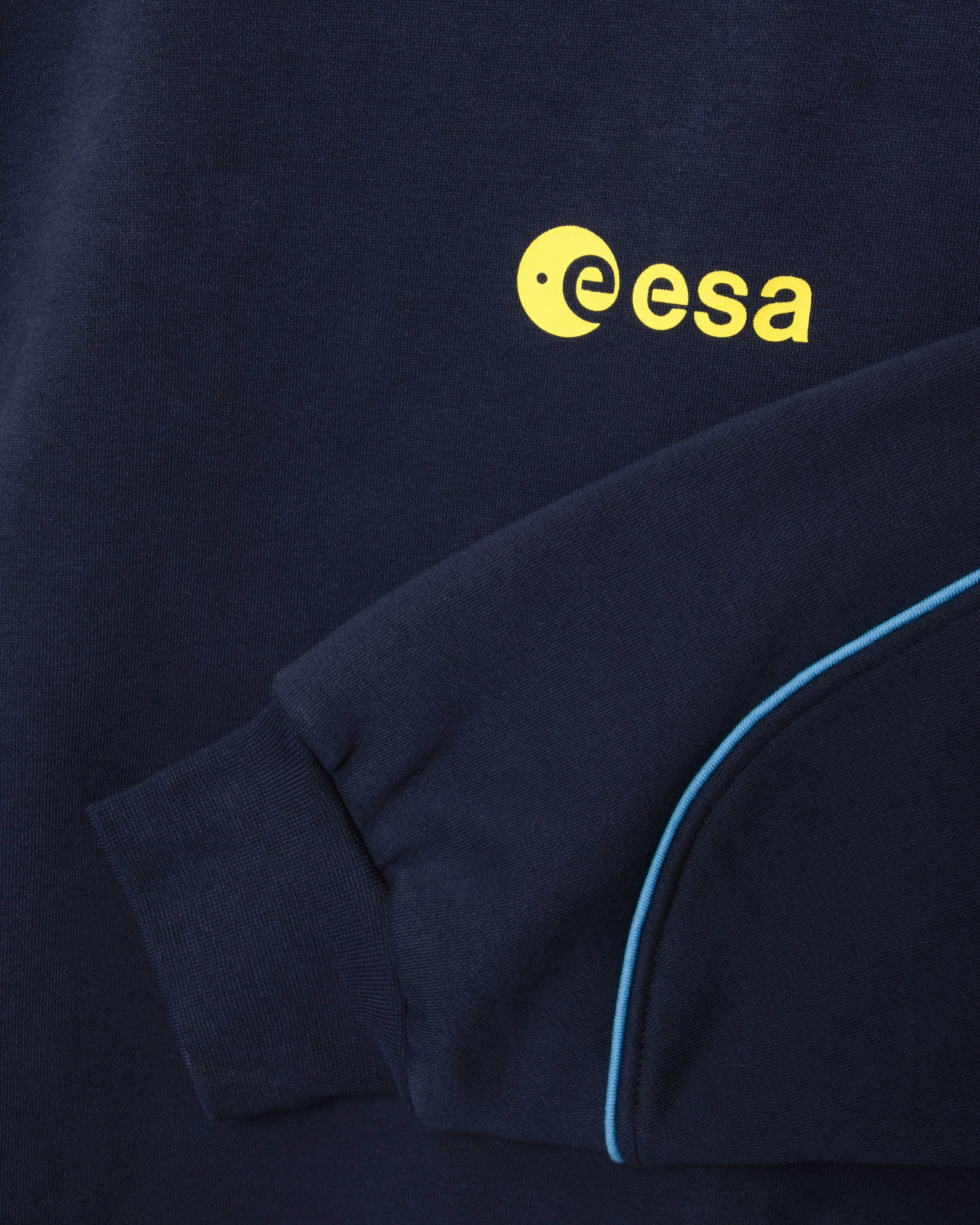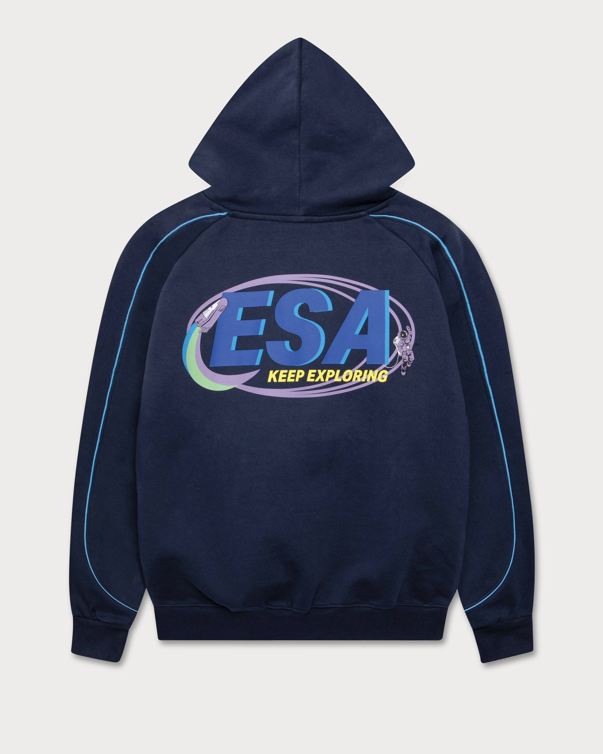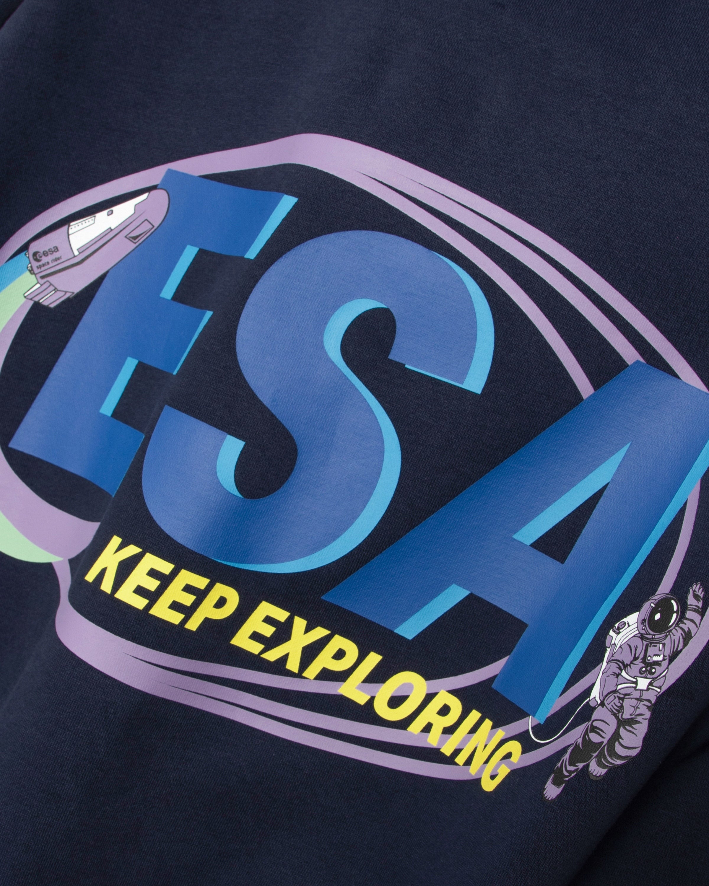 Der navy-farbener Hoodie präsentiert einen großflächigen Backprint, der den Schriftzug "ESA KEEP EXPLORING" zusammen mit einer Rakete und einem Astronauten zeigt. Auf der linken Brust ergänzt das kleine ESA Logo das Motiv. Die Prints in Kombination mit den hellblauen Streifen an den Ärmeln sorgen für einen charakteristischen Y2K-Retro-Look.