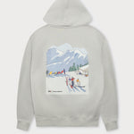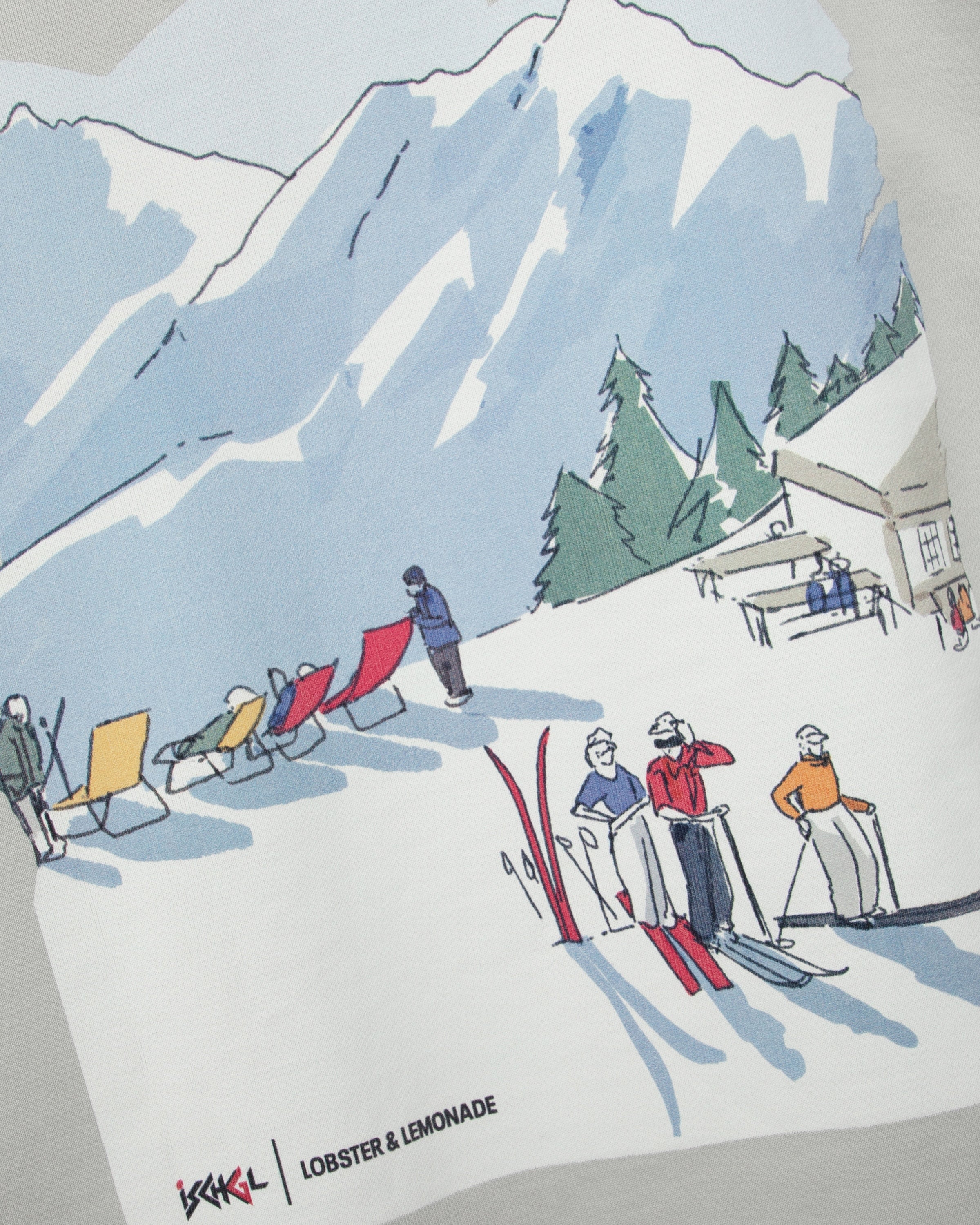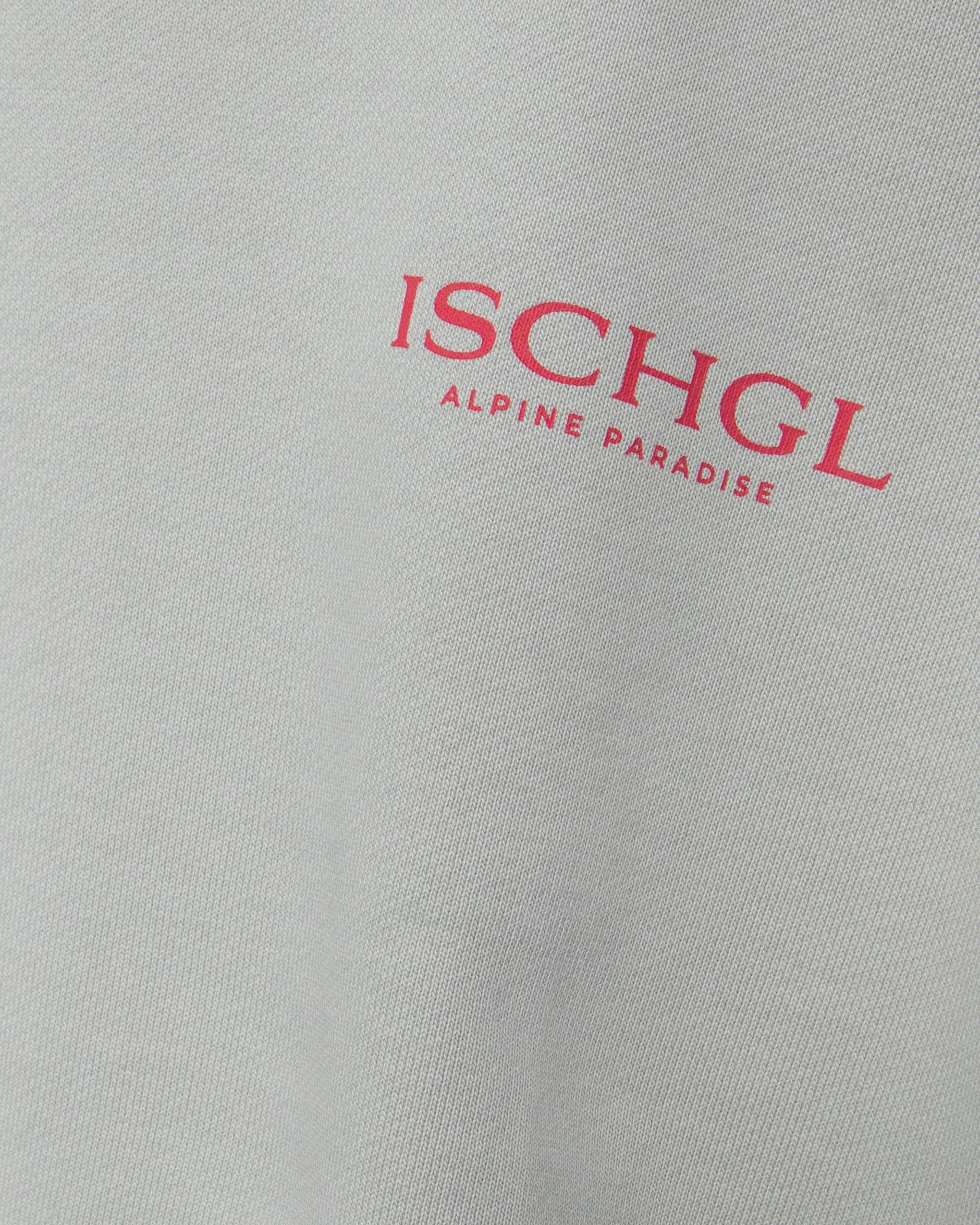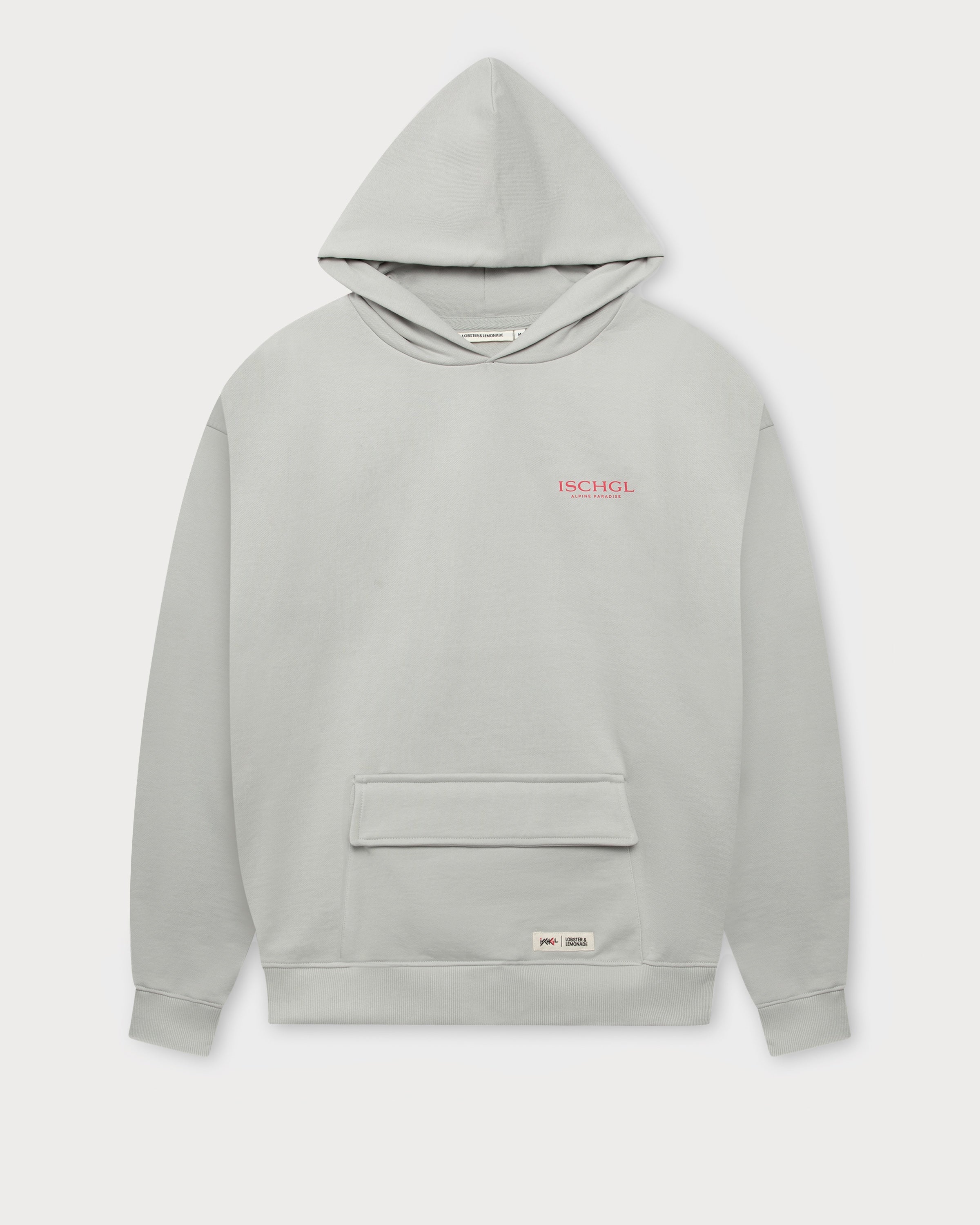 Der grau-melierte Hoodie zeigt eine großflächige retro angehauchte Illustration einer typischen Ischgl- Skifahren- Szenerie als Back Print. Abgerundet wird das Design durch einen kleinen „Ischgl Alpine Paradise“ Print auf der Brust. Die Kängurutasche mit Klettverschluss ist ideal für kleinere Snacks.