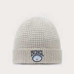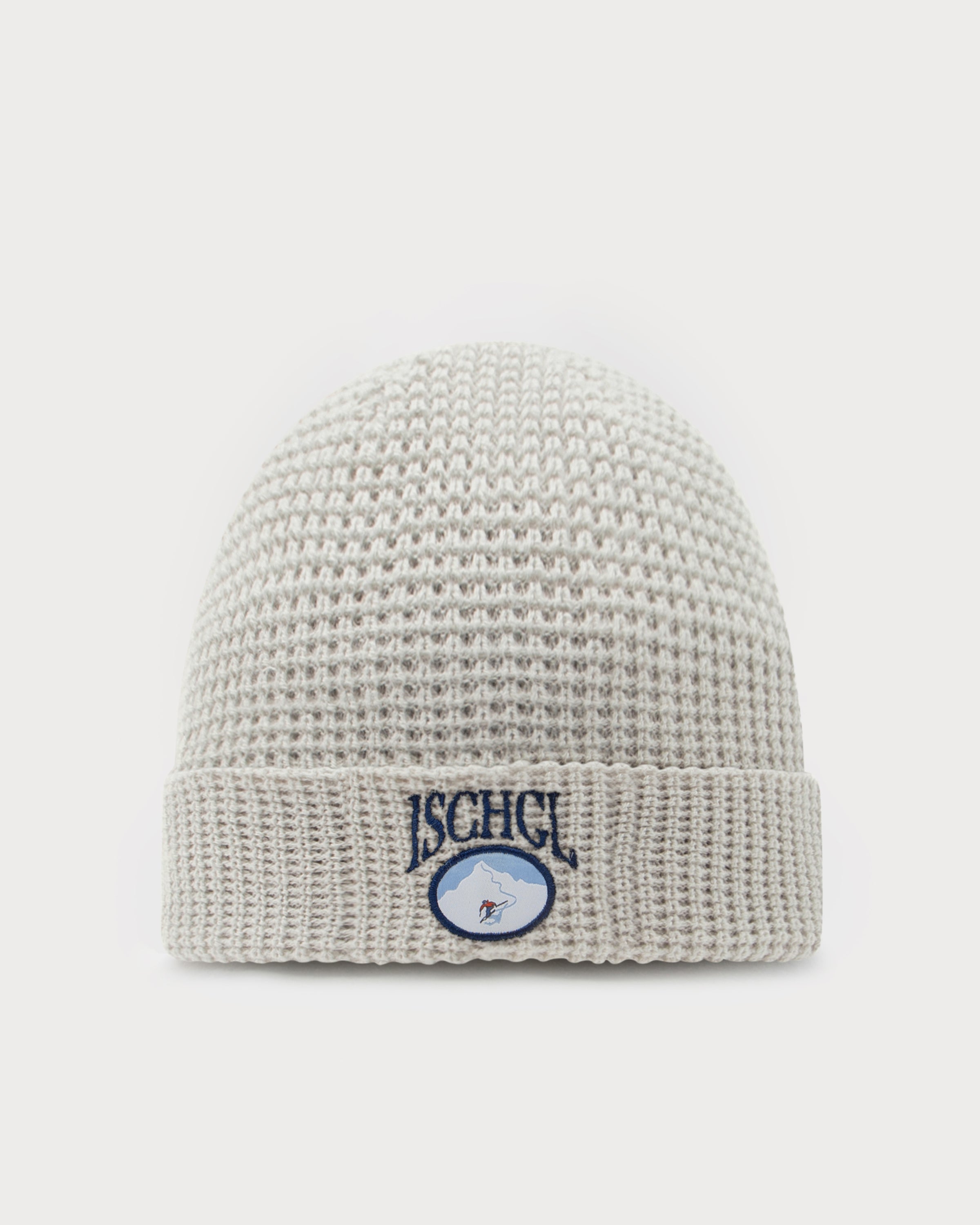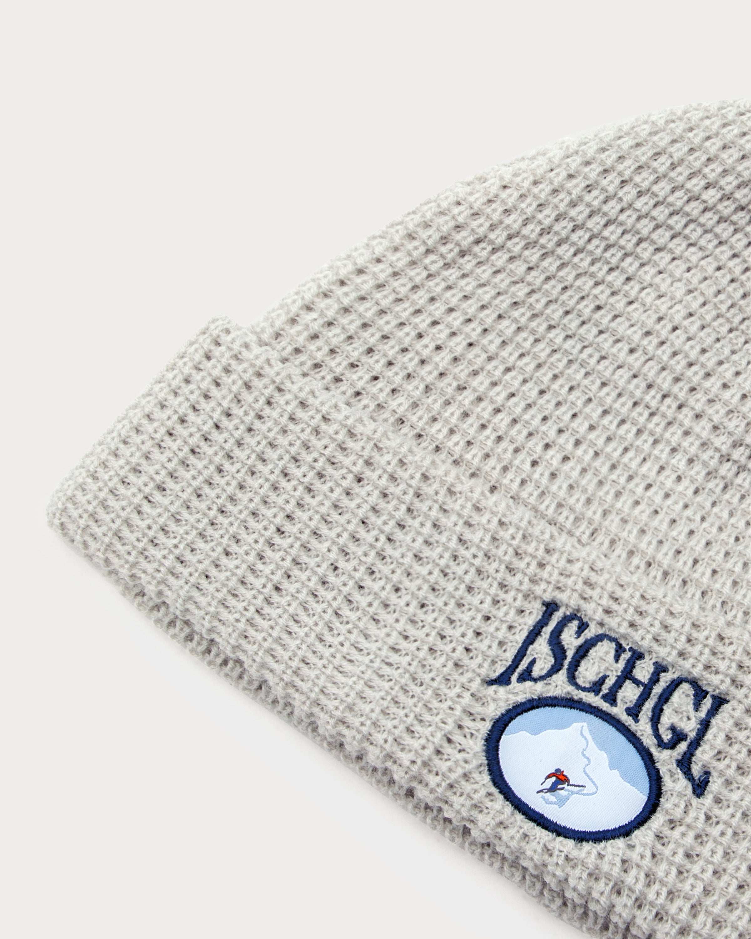 Der graue Beanie mit Waffelstruktur hat einen „Ischgl“ Stick mitsamt Skifahrer Batch auf der Front