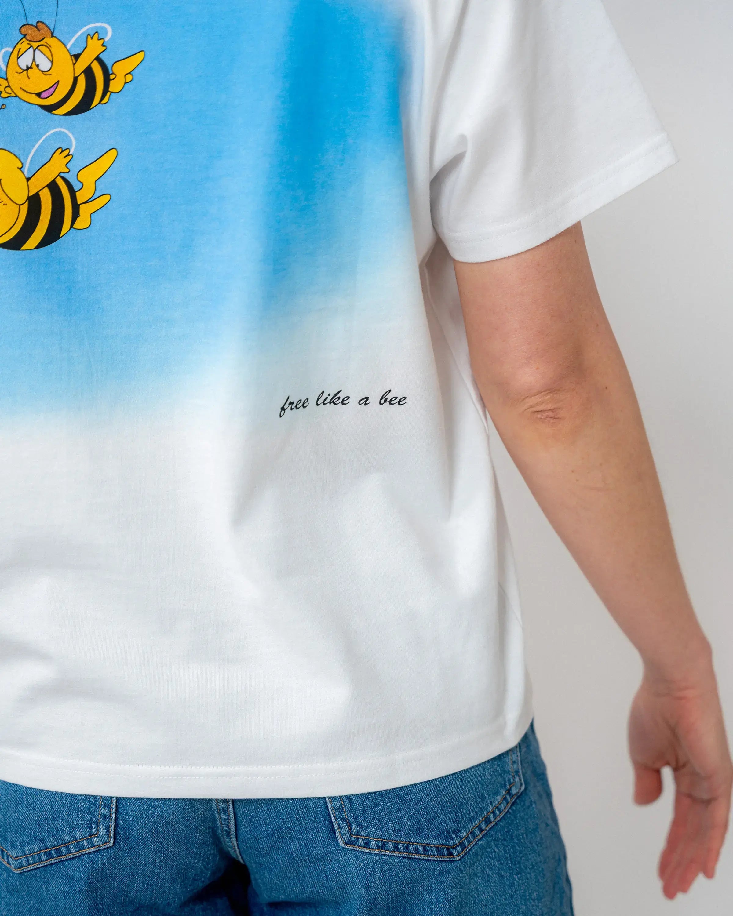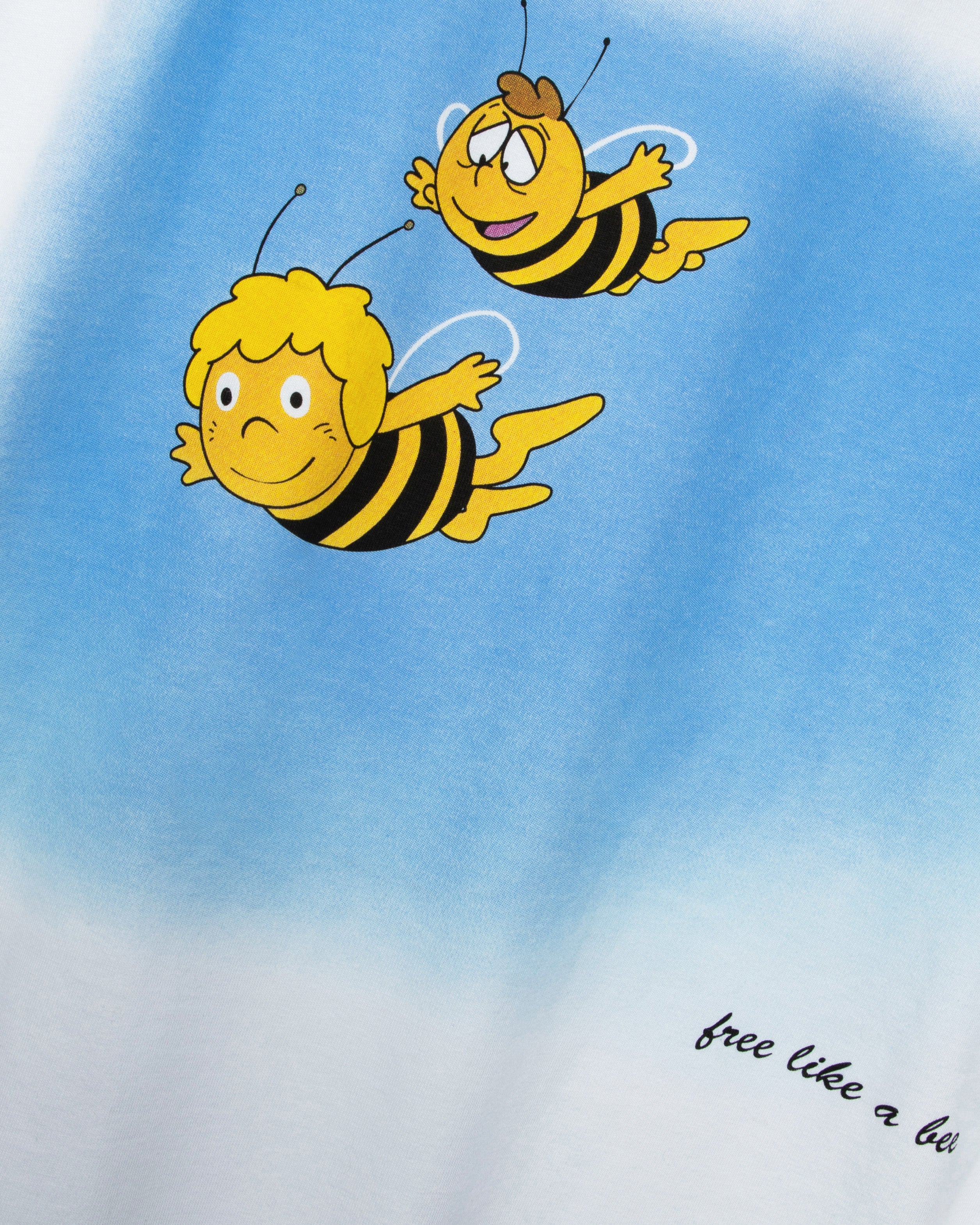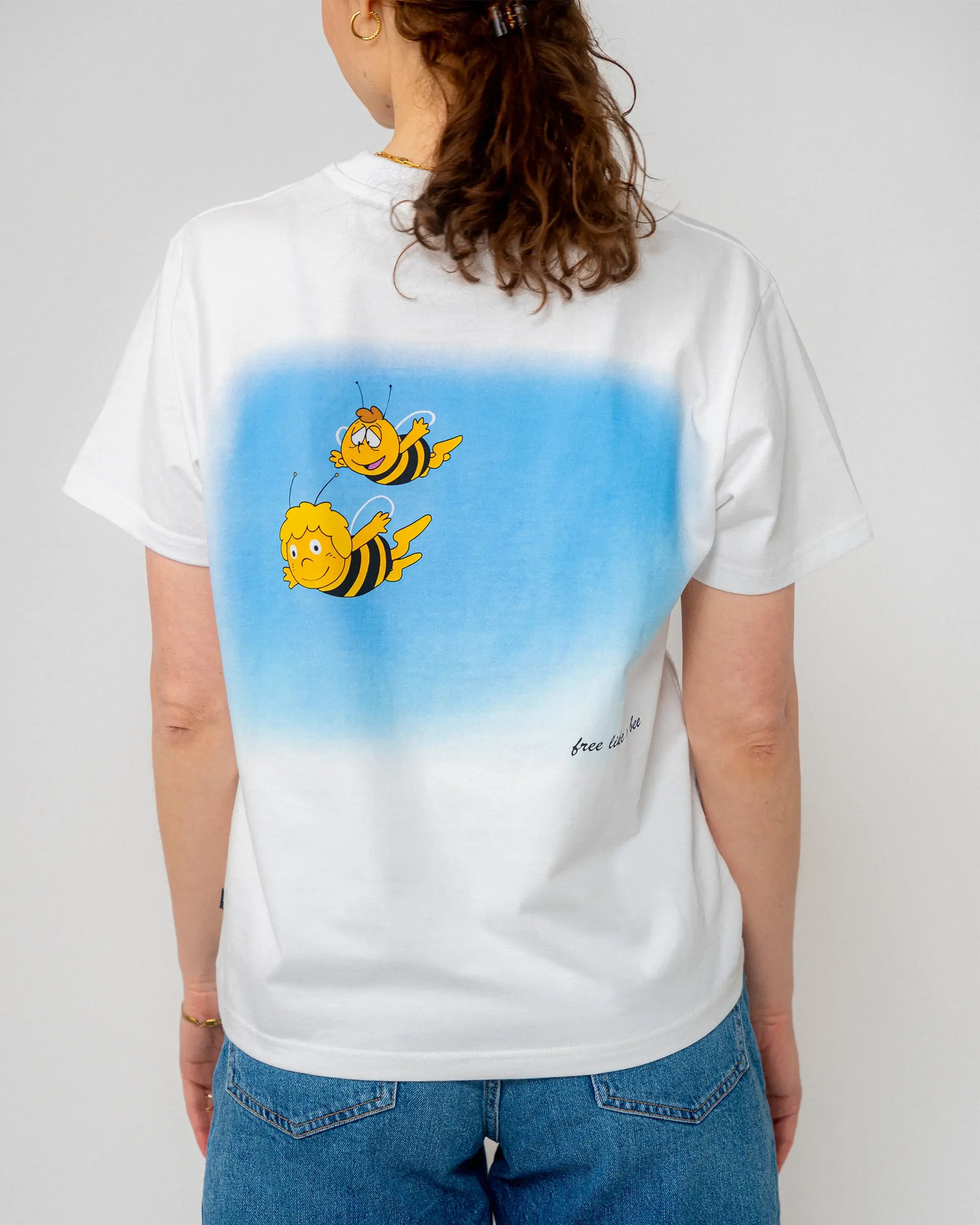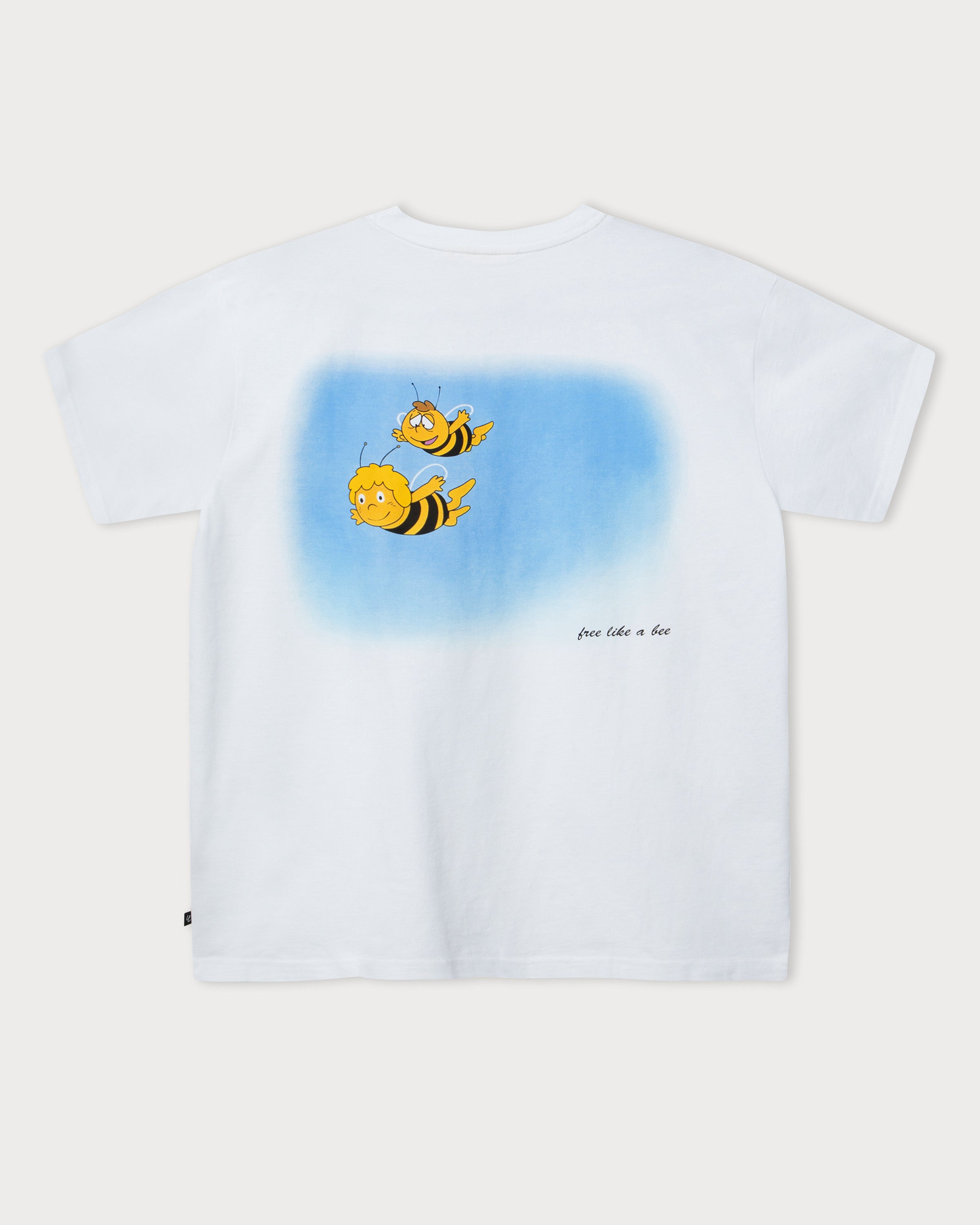 Das weiße T-Shirt präsentiert Maja und Willi in einem großflächigen Backprint im Cartoonlook, wie sie gemeinsam durch die Lüfte fliegen. Der filigrane Schriftzug „free like a bee“ unterhalb des Motivs vollendet das sommerliche Design auf der Rückseite.