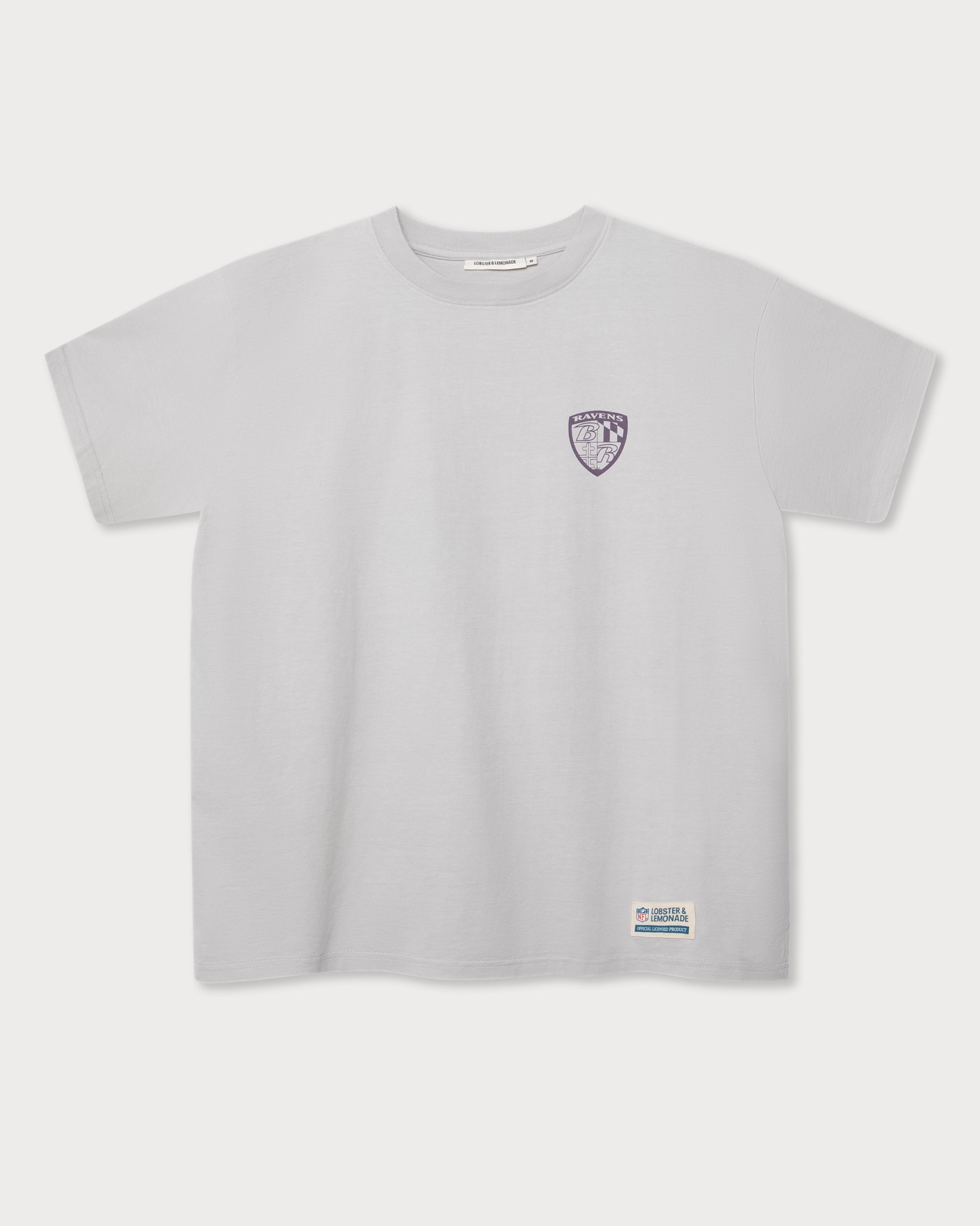 Das graue T-Shirt zeigt einen großflächigen Baltimore Ravens Backprint inklusive Ravens Logo. Das Ravens Shield Logo als kleiner Print auf der linken Brust und das Canvas-Weblabel auf Taillenhöhe machen den Retro-Look komplett.