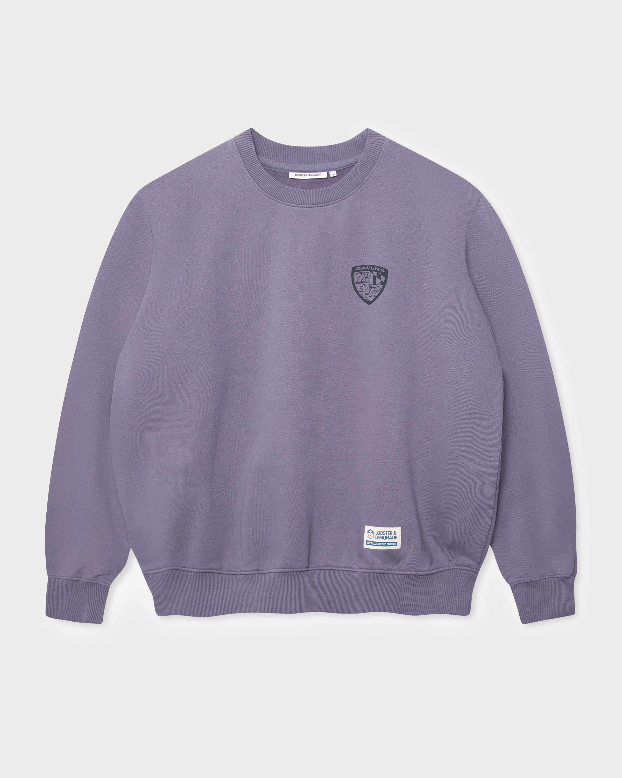 Der lilafarbene Sweater zeigt einen großflächigen Baltimore Ravens Backprint inklusive Ravens Logo. Das Ravens Shield Logo als kleiner Print auf der linken Brust und das Canvas-Weblabel auf Taillenhöhe machen den Retro-Look komplett.